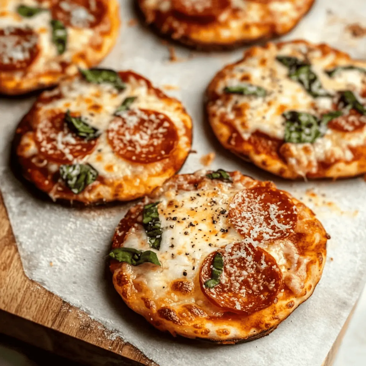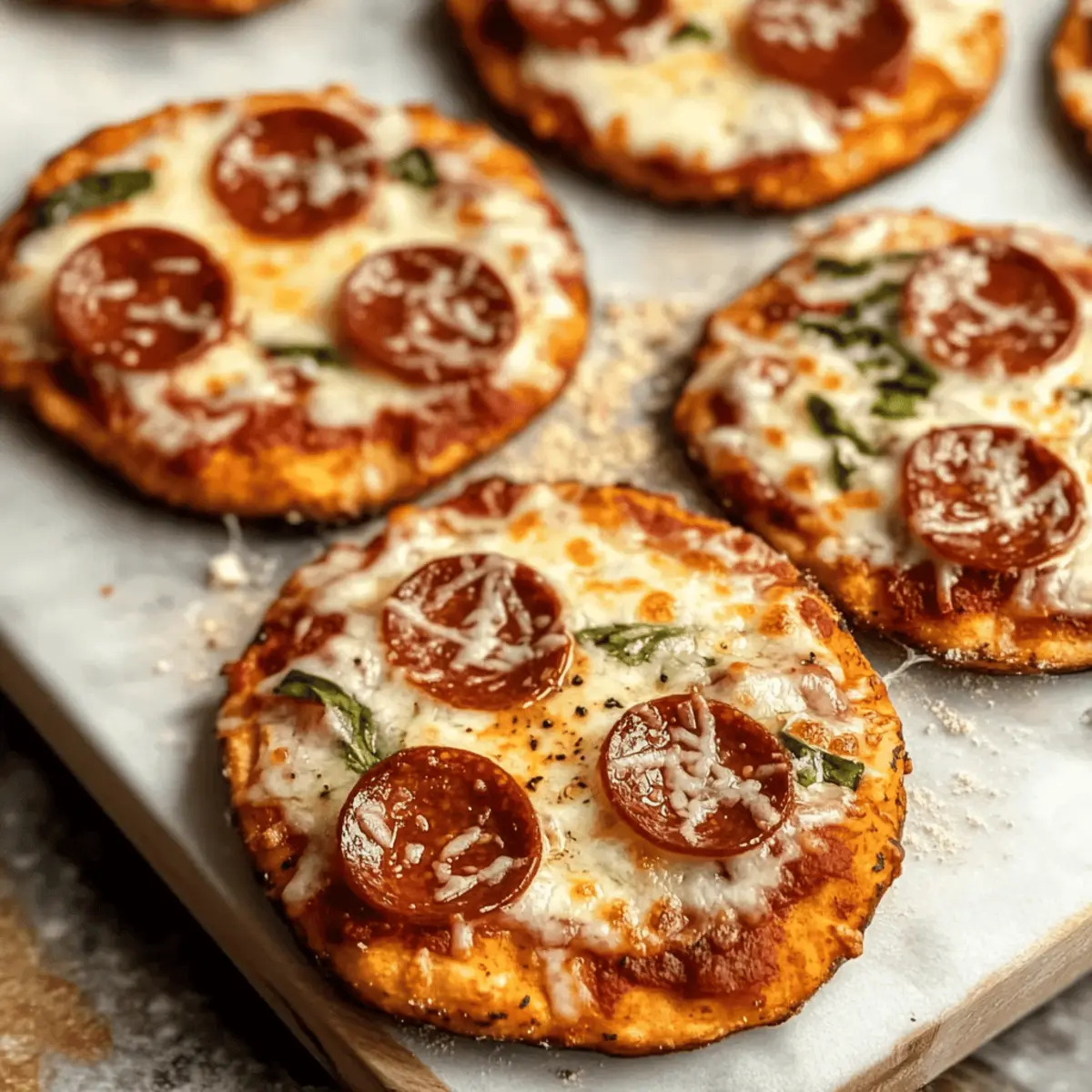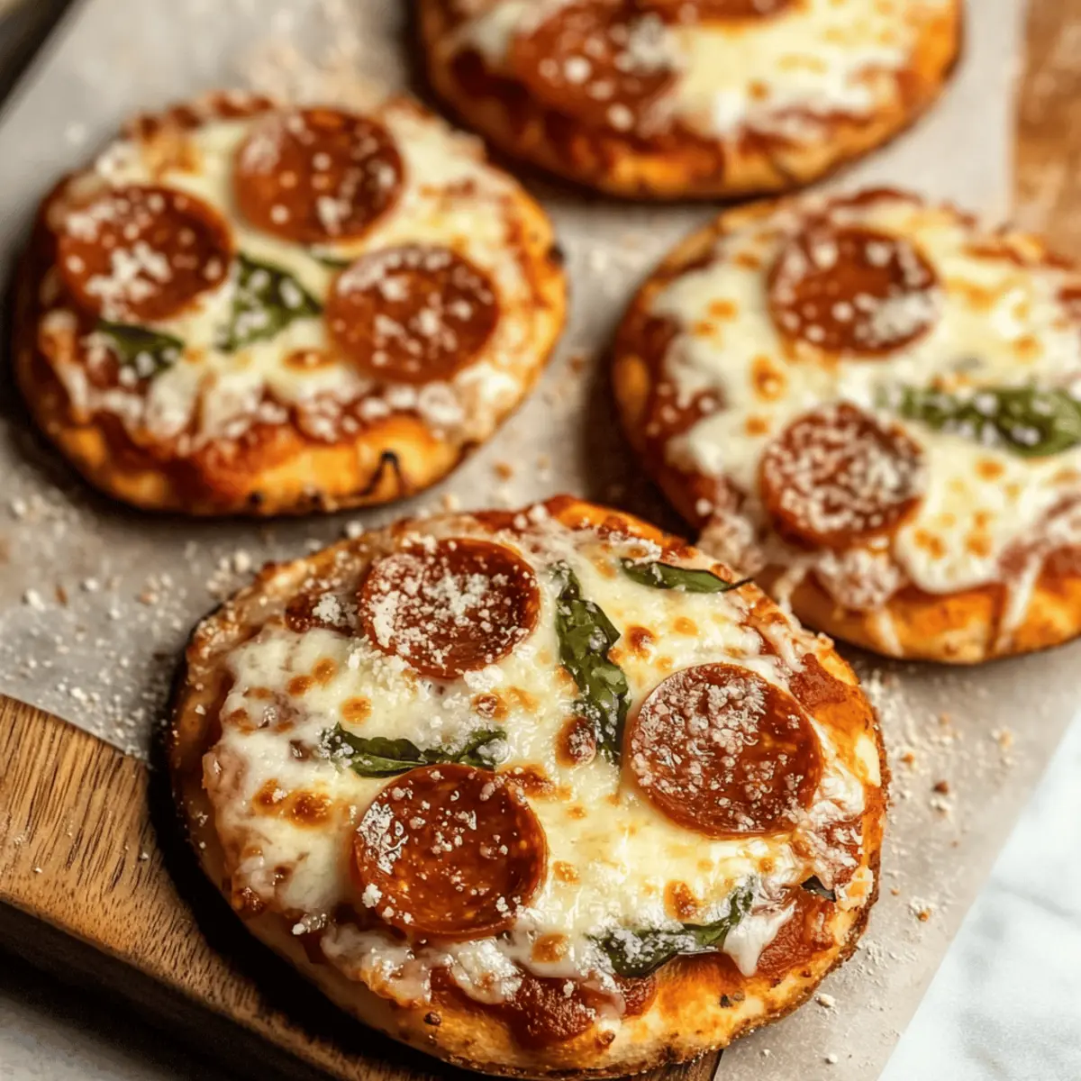 The aroma of bubbling cheese and savory toppings wafting through the kitchen is an instant pick-me-up. Let’s welcome pizza night with my easy 4-Ingredient Mini Pizzas! With just a few simple ingredients like refrigerated biscuit dough and pizza sauce, you can create a customizable dish that everyone will love—perfect for those bustling weeknights when time is tight. These mini delights come together in just 20 minutes, offering a swift escape from the fast food routine while still delivering homemade comfort. Plus, they’re not only fun to make but also allow for endless topping possibilities, from classic pepperoni to colorful veggies. Are you ready to transform your kitchen into a mini pizzeria? Let’s dive into this delicious adventure! Why Try These 4-Ingredient Mini Pizzas? Quick and Easy: In just 20 minutes, you can whip up a platter of these delicious mini pizzas, perfect for those busy weeknights. Customizable Toppings: Whether you love classic pepperoni or fresh veggies, each pizza can be tailored to your taste, ensuring everyone at the table is happy. Minimal Cleanup: Using refrigerated biscuit dough means there’s no mess with traditional pizza-making, allowing you more time to enjoy your meal rather than clean up. Crowd-Pleasing Fun: Ideal for family nights or casual gatherings, these mini masterpieces are a hit with both kids and adults alike. Don’t miss out on trying Mini Tropical Pavlovas for dessert to complement your homemade pizzas! 4-Ingredient Mini Pizzas Ingredients Get ready to make the best mini pizzas with just four ingredients! For the Dough Refrigerated Biscuit Dough – This convenient base makes pizza-making quick and easy, perfect for those busy nights. For the Sauce Pizza Sauce – Adds the necessary flavor and moisture; feel free to use any marinara on hand for a quick option. For the Cheese Shredded Mozzarella Cheese – This gooey favorite gives your mini pizzas that beloved melt; swap with provolone or cheddar for a twist. For Toppings Toppings (e.g., Pepperoni) – Personalize each pizza with your favorite toppings, from meats to colorful veggies or herbs; explore new combinations to keep pizza night exciting! These delicious 4-Ingredient Mini Pizzas are a great addition to your meal rotation! Step‑by‑Step Instructions for 4-Ingredient Mini Pizzas Step 1: Preheat Your Oven Begin your pizza-making adventure by preheating your oven to 400°F (200°C). This ensures your mini pizzas will bake evenly and achieve that perfect golden-brown crust. While the oven is heating, gather all your ingredients and a baking sheet, as you’ll want everything ready to go! Step 2: Prepare the Dough On a lightly floured surface, take each piece of refrigerated biscuit dough and roll it out into a flat, round shape, about ¼ inch thick. Aim for a circular form so that your 4-Ingredient Mini Pizzas bake uniformly. Expect the dough to become more manageable with gentle pressure, creating a perfect base for your toppings. Step 3: Arrange the Dough on Baking Sheets Lightly dust two baking sheets with cornmeal, which will prevent sticking and add a delightful crunch. Place each rolled-out dough round on the sheets, spacing them about 1 inch apart to allow for bubbling and expansion during baking. Take a moment to appreciate your little pizza canvases before adding the sauce! Step 4: Spread the Sauce Now it’s time to unleash the flavor! Spoon 1-2 tablespoons of pizza sauce onto each dough round, using the back of the spoon to spread it evenly. Leave a small border around the edges to create a crust. The sauce will keep your mini pizzas moist and add a burst of flavor—just the right touch for these 4-Ingredient Mini Pizzas. Step 5: Add the Cheese Sprinkle a generous handful of shredded mozzarella cheese over the sauce on each mini pizza. You want to see that gooey layer of cheese peeking through—this is what makes your pizzas truly delicious! Feel free to mix in other cheeses like cheddar or provolone for added yumminess. Step 6: Top with Your Favorites Personalize each pizza by adding your choice of toppings, such as pepperoni, bell peppers, or olives. Arrange them artfully so they enhance the flavor without overcrowding your pizzas. Your creativity here will make every bite unique and satisfying, ensuring the whole family enjoys their own delightful mini masterpiece. Step 7: Bake to Perfection Slide the baking sheets into your preheated oven and bake for 15-18 minutes, or until the crust is golden and the cheese is bubbling. Keep an eye on them as they bake, and if you prefer an extra crispy top, broil them for an additional 1-2 minutes—just until the cheese is beautifully browned. Step 8: Garnish and Serve Once out of the oven, sprinkle some grated Parmesan cheese over the top of each mini pizza for an added layer of flavor. Let them cool for a minute before serving warm. These tasty 4-Ingredient Mini Pizzas are perfect for sharing, so gather your family around and enjoy this scrumptious meal straight from your kitchen! How to Store and Freeze 4-Ingredient Mini Pizzas Fridge: Store any leftover mini pizzas in an airtight container for up to 2 days. Reheat in the oven for crispiness or in the microwave for a quick fix. Freezer: Freeze unbaked mini pizzas individually on a baking sheet for 1-2 hours, then transfer them to a freezer bag. They can be stored for up to 2 months. Reheating: For best results, reheat baked mini pizzas in the oven at 350°F for about 10 minutes, or until heated through. This keeps the crust crispy and the cheese melty. Make Ahead Options These Easy 4-Ingredient Mini Pizzas are perfect for meal prep enthusiasts! You can prepare the biscuit dough and toppings up to 24 hours in advance, keeping them fresh in the refrigerator. To do so, roll out the dough and store the rounds on a baking sheet lined with parchment paper, covered tightly with plastic wrap to prevent drying. For the toppings, chop and mix your favorite ingredients, storing 