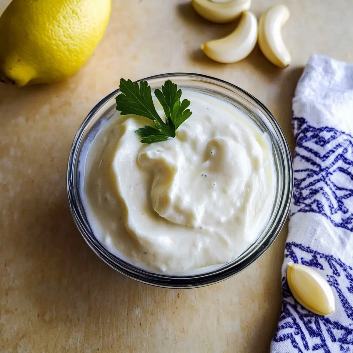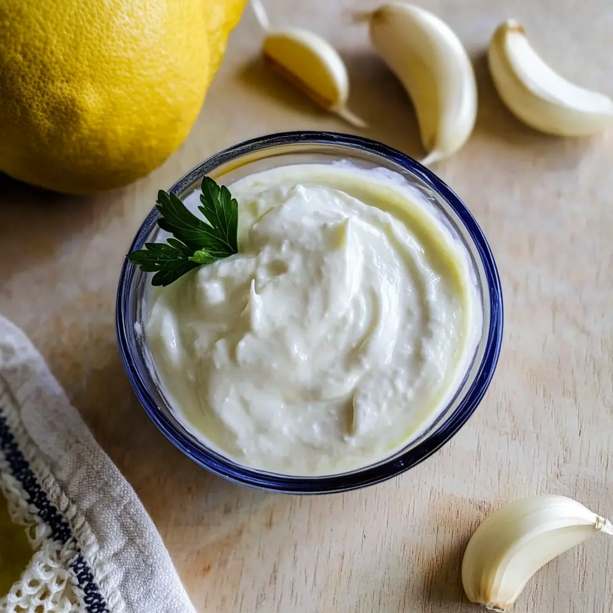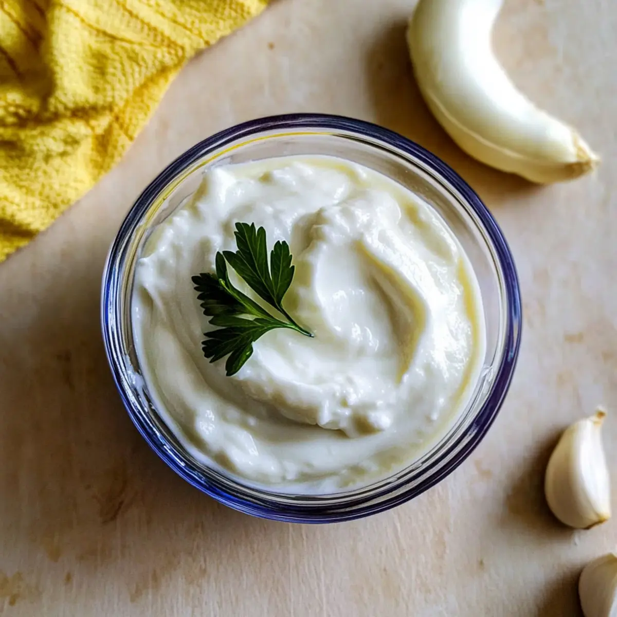 As the smell of garlic wafts through my kitchen, I can’t help but smile, knowing I’m just minutes away from making a delicious 5-Minute Fluffy Toum. This easy garlic sauce, which is both egg-free and vegetarian, showcases just how simple it can be to elevate your meals without a food processor. Imagine diving into its thick, airy texture as a perfect companion for grilled meats, shawarma, or even as a dipping sauce for fresh veggies. Not only is this recipe a quick win on busy weeknights, but it also opens the door for endless culinary creativity. What flavors will you explore with your homemade toum? Why is This Garlic Sauce a Must-Try? Simplicity: This 5-Minute Fluffy Toum requires no food processor, making it accessible to anyone, from busy home cooks to culinary enthusiasts. Bold Flavor: With fresh garlic and lemon, it packs a powerful punch that enhances a variety of dishes. Versatile Use: Perfect with grilled meats or as a unique dip for veggies and fries, this garlic sauce complements any meal. Crowd-Pleaser: Its creamy, fluffy texture will impress dining guests and keep them coming back for more! Make-Ahead Friendly: Easily store in an airtight container for up to 2-3 months, ensuring you always have this delicious sauce on hand. For more amazing flavor options, you might also enjoy my Spiced Pumpkin Pancakes or explore variations on this recipe to match your taste! 5-Minute Fluffy Toum Ingredients For the Sauce Garlic Cloves – Fresh garlic is key for that bold flavor; consider using pre-peeled for quick prep. Lemon Juice – Freshly squeezed lemon juice brightens the sauce; it’s essential for balancing the richness. Salt – A little salt enhances flavor; make sure to measure accurately for the best results. Neutral Vegetable Oil (Avocado oil) – This acts as the emulsifier, giving the toum its signature thick and creamy texture; avoid olive oil, as it can alter the taste. Feel ready to whip up this delicious 5-Minute Fluffy Toum? With these simple ingredients, you’ll create a garlic sauce that’s perfect for dipping and drizzling! Step‑by‑Step Instructions for 5-Minute Fluffy Toum Step 1: Prepare the Garlic Start by peeling your garlic cloves. If you’re using unpeeled garlic, slice the cloves in half lengthwise and remove any green sprouts found inside to avoid bitterness. Aim for about 6 cloves for a bold flavor. You’ll want the garlic finely prepped, as this ensures a smooth and creamy texture in your 5-Minute Fluffy Toum. Step 2: Blend the Base In a tall jar that accommodates the immersion blender, combine the fresh garlic, freshly squeezed lemon juice, and salt. Blend the mixture for approximately 20 to 30 seconds until it forms a smooth paste with some froth on top. This step is crucial, as it establishes the base flavor of your garlic sauce before adding the oil. Step 3: Emulsify the Mixture Now, while keeping the immersion blender submerged in the jar, gently pour in the neutral vegetable oil over the garlic paste. Blend continuously for 3 to 5 minutes, slowly pulsing the blender up and down. As you blend, watch the mixture transform into a thick, fluffy consistency—a sign the 5-Minute Fluffy Toum is coming together beautifully. Step 4: Final Adjustments Once the toum has reached a thick, airy texture, taste it to see if you need to adjust the seasoning. If desired, you can add a touch more salt or lemon juice for enhanced flavor. This final adjustment allows you to cater the garlic sauce to your personal preference, ensuring it’s just right for your dishes. Step 5: Store for Later Transfer the completed 5-Minute Fluffy Toum into an airtight container. Store it in the refrigerator, where it can last up to 2-3 months. Its bold flavors and creamy texture will be ready for you to enjoy anytime, whether as a dipping sauce or as an accompaniment to grilled meats and veggies. How to Store and Freeze 5-Minute Fluffy Toum Airtight Container: Store your freshly made 5-Minute Fluffy Toum in an airtight container to maintain its creamy texture and bold flavor for longer. Refrigeration: The toum will stay fresh in the refrigerator for up to 2-3 months. Always check for any changes in smell or texture before using. Freezing: For longer storage, you can freeze the toum. Use ice cube trays to freeze small portions, then transfer them to a freezer-safe bag. This way, you can thaw just what you need! Reheating: When ready to use, simply thaw in the refrigerator overnight. If needed, use a whisk to restore its fluffy texture before serving. Make Ahead Options These 5-Minute Fluffy Toum options are perfect for busy home cooks looking to save time during the week! You can prepare the garlic and lemon juice mixture up to 24 hours in advance; simply combine the peeled garlic cloves, lemon juice, and salt, then refrigerate in an airtight container. As the flavors marry, you’ll enhance the overall taste! When you’re ready to finish the toum, just blend the mixture with the neutral vegetable oil as directed. This way, you can enjoy a creamy, delicious garlic sauce without any last-minute fuss—perfect for meals that need to impress! What to Serve with 5-Minute Fluffy Toum? Dive into a world of flavors as you explore delicious pairings that elevate this creamy garlic sauce to new heights. Grilled Chicken: The smoky char of grilled chicken pairs beautifully with the bright, bold garlic notes of the toum, creating a satisfying experience. Roasted Vegetables: Earthy roasted veggies, like carrots and zucchini, provide the perfect dip into this creamy delight, enhancing both flavor and texture. Falafel Wraps: Add a generous smear of toum to your falafel wraps for an exotic twist that contrasts beautifully with the crispy texture. Pita Chips: Crunchy, savory pita chips make for an irresistible pairing, inviting you to scoop and savor each luscious bite of garlic sauce. French Fries: Crispy, salty fries simply beg for the creamy toum, transforming them into a gourmet indulge