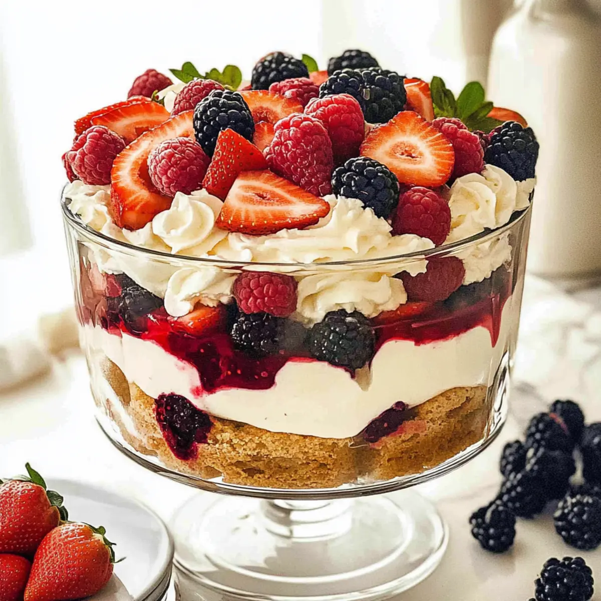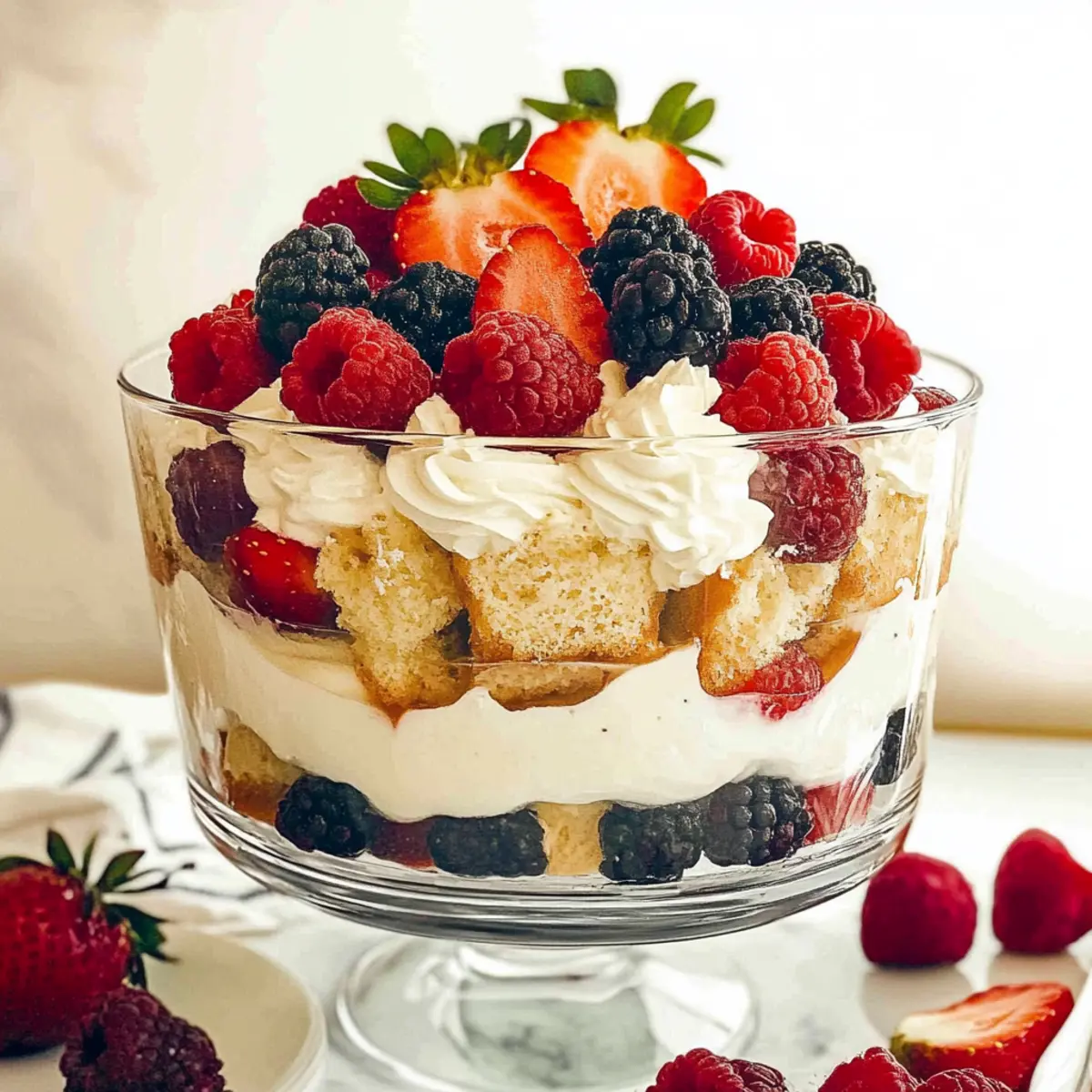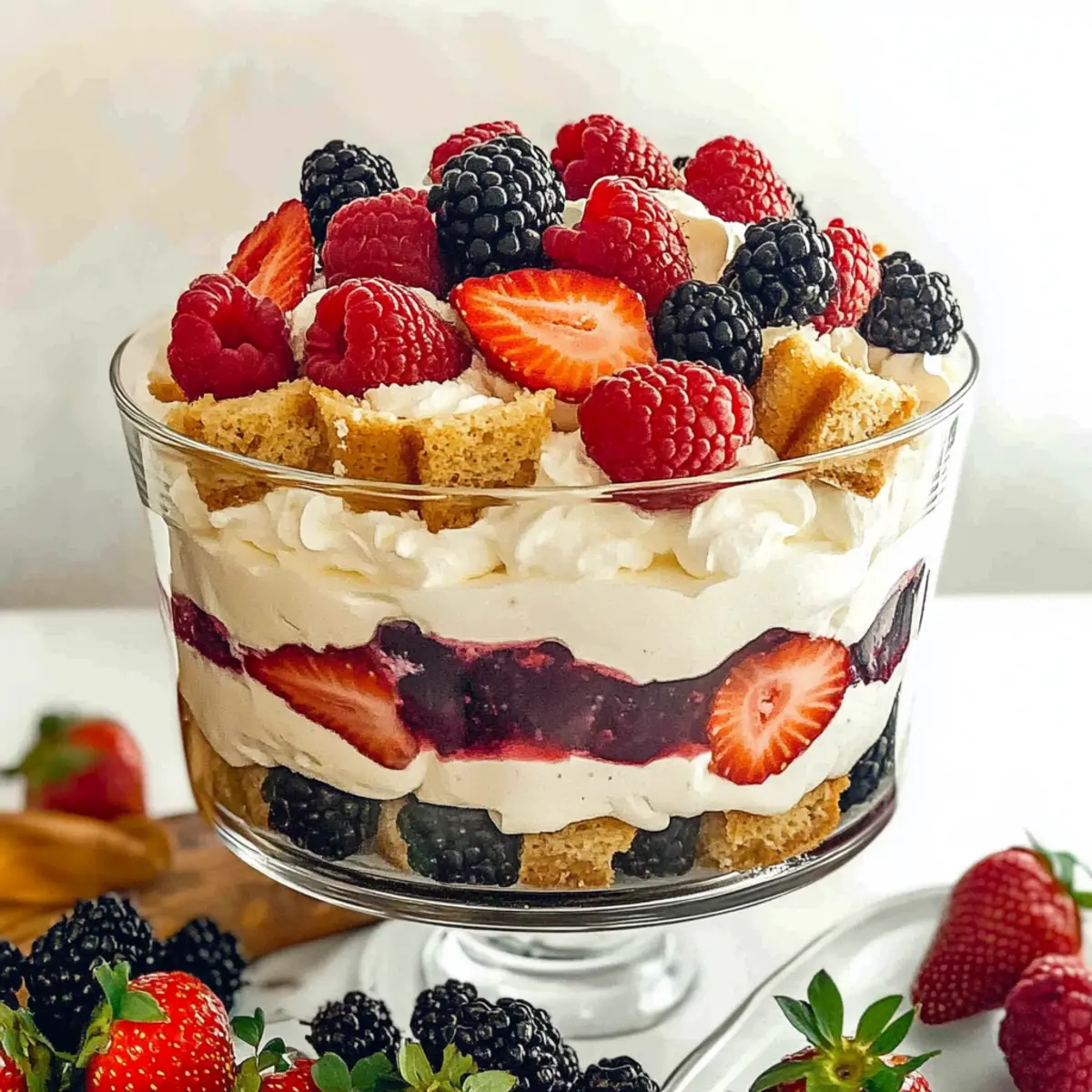 As I stood in my kitchen, the scent of strawberries and cream wafting through the air, I couldn’t help but think of the perfect spring dessert: the Angel Food Berry Trifle. This no-bake delight combines the light, airy texture of angel food cake with velvety vanilla custard and a vibrant mix of juicy berries, making it an ideal centerpiece for Easter brunch or any sunny gathering. Not only is it a breeze to prepare—perfect for those busy weekends—but it also serves as a guilt-free indulgence that’s both gluten-free and refreshingly light. Whether you’re hosting friends or simply treating yourself, this trifle is sure to impress. Ready to whip up a dessert that’s as beautiful as it is delicious? Let’s dive in! Why is this trifle a must-try? Irresistible freshness: Each layer of fluffy angel food cake, creamy custard, and vibrant berries sings springtime. No-bake ease: Perfect for those who want a delicious dessert without the oven fuss! Versatile ingredients: Switch up the berries or pudding flavors to match your preferences, making it a unique delight every time. Crowd-pleasing treat: This dessert is a surefire hit at gatherings—everyone will adore its lightness and refreshing taste. Make-ahead magic: Prepare the trifle a day before, allowing the flavors to meld beautifully. If you love light desserts, check out my Blueberry Buttermilk Pancake Casserole for another easy treat! Angel Food Berry Trifle Ingredients • For the Creamy Base Instant Sugar-Free Vanilla Pudding – Provides a creamy, stable base for the trifle; feel free to use any flavor for a fun twist. 1½ cups Milk – To mix with the pudding for a thicker texture; use slightly less than the package suggests for best results. 1 cup Vanilla Yogurt – Adds tanginess while keeping the dessert light and refreshing. 6 oz Cream Cheese – Offers a rich, smooth creaminess; ensure it’s at room temperature to avoid clumps. ½ cup Sour Cream – Enhances creaminess and tang; can be substituted with Greek yogurt for a healthier option. 12 oz Whipped Cream – Lightens the creamy mixture; you can use Cool Whip or homemade for a fresh flavor. • For the Trifle Layers 1 Angel Food Cake – The base layer cut into cubes; both store-bought or homemade options work great. • For the Berry Medley 2 cups Strawberries (chopped) – Sweet and juicy, make sure to use fresh for optimal flavor. 2 cups Raspberries – Adds color and a slight tartness that beautifully balances the sweetness. 2 cups Blackberries – Complements sweetness and provides a delightful textural contrast in the trifle. Indulge in the delightful lightness of this Angel Food Berry Trifle that is sure to be a hit at your next gathering! Step‑by‑Step Instructions for Angel Food Berry Trifle Step 1: Prepare Pudding Mixture In a medium bowl, whisk together the instant sugar-free vanilla pudding with 1½ cups of milk until it thickens, which should take about 2 minutes. You’ll know it’s ready when the mixture has a smooth and creamy texture. Set the pudding aside to allow it to firm up while you prepare the creamy filling. Step 2: Create Filling In a large mixing bowl, combine the room-temperature cream cheese, vanilla yogurt, and sour cream. Beat with a hand mixer on medium speed until smooth and creamy, about 2-3 minutes. Gently fold in the pudding mixture and half of the whipped cream until everything is well incorporated, creating a light and airy filling for your Angel Food Berry Trifle. Step 3: Layer Trifle Grab a trifle bowl or a clear glass dessert dish to showcase your creation. Start by layering ⅓ of the angel food cake cubes evenly at the bottom, followed by ⅓ of the creamy filling. Next, add half of the remaining whipped cream on top and sprinkle ⅓ of the vibrant berries, creating a colorful and delicious first layer. Step 4: Repeat Layers Continue the layering process by adding another ⅓ of the angel food cake cubes, then another layer of ⅓ of the creamy filling. Follow that with the remaining whipped cream and another ⅓ of the berries. Stack the layers carefully, showcasing the beautiful textures and colors of your Angel Food Berry Trifle. Step 5: Chill Once assembled, cover the trifle with plastic wrap and refrigerate for at least 1 hour or up to a few hours before serving. Chilling allows the flavors to meld beautifully and helps the layers set, making for an even more enjoyable experience when you dig into this delightful dessert. What to Serve with Angel Food Berry Trifle Looking to create the perfect spread around this light and fruity dessert? Creamy Mashed Potatoes: Their smooth texture contrasts beautifully with the airy trifle, adding a comforting heartiness to your meal. Grilled Lemon Herb Chicken: The zesty flavors of grilled chicken enhance the sweetness of the trifle, creating a delightful balance on your palate. Seasonal Garden Salad: A fresh mix of greens and vibrant veggies adds color and crunch, making this a refreshing accompaniment to the rich dessert. Savory Cheese Platter: Incorporate a variety of cheeses for a sophisticated pairing; the creamy richness brings depth that complements the trifle’s sweetness. Sparkling Lemonade: A bubbly, citrusy drink that echoes the freshness of the dessert, ensuring that every sip is uplifting and joyful. Chocolate Dipped Strawberries: These indulgent treats provide a delicious contrast to the trifle’s lightness, satisfying any sweet tooth while maintaining a festive feel. Vanilla Ice Cream: A scoop of creamy vanilla ice cream alongside the trifle enhances the overall dessert experience with added richness. Peach Iced Tea: A refreshing beverage that pairs well with both sweet and savory dishes, offering a delightful sip that enhances your dining experience. Angel Food Berry Trifle Variations Feel free to personalize your Angel Food Berry Trifle with these delightful twists that will enhance both flavor and texture! Seasonal Berries: Mix and match your favorite berries