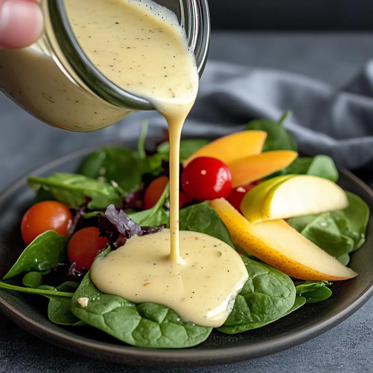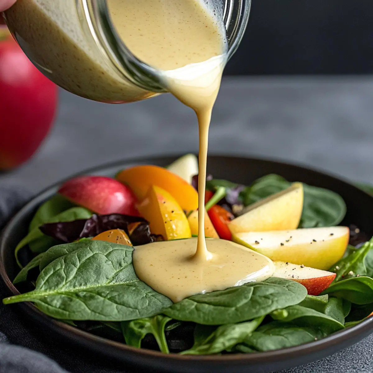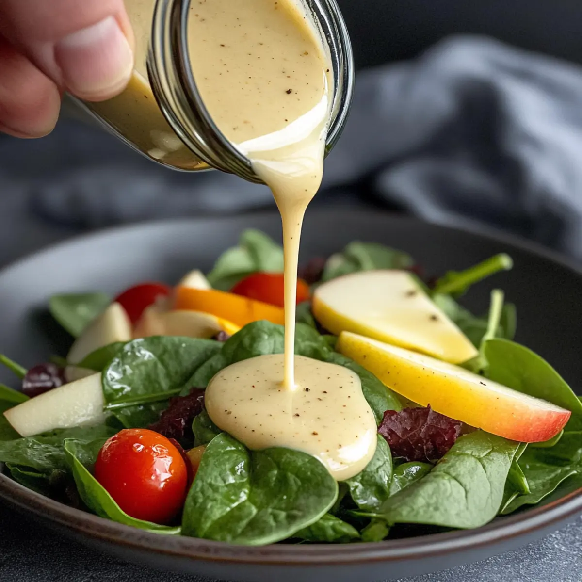 “Can you believe something so delicious can take just five minutes to whip up?” That was the thought that struck me as I perfected my Apple Cider Dressing Recipe. This creamy dressing artfully balances the tang of apple cider vinegar with honey’s gentle sweetness and the smooth richness of Greek yogurt. It’s the kind of dressing that transforms everyday salads into stunning masterpieces, making them not only healthier but also genuinely enjoyable. What I love most is how versatile it is—perfect for drizzling over fresh greens or as a delightful dip for crisp veggies. If you’re tired of supermarket dressings loaded with additives, this homemade version is your solution. Plus, it’s gluten-free and makes use of simple ingredients you probably already have in your kitchen. So, are you ready to elevate your salads without a fuss? Let’s dive into this quick and easy recipe! Why Choose This Apple Cider Dressing? Quick & Easy: Ready in just five minutes, this dressing is a game-changer for busy cooks looking to enhance their meals. Creamy & Flavorful: The perfect blend of apple cider vinegar, honey, and Greek yogurt creates a delightful balance that elevates any salad. Versatile Use: Not just for salads, it also serves as a fantastic dip for fresh veggies or even a drizzle over grilled meats. Healthy Alternative: Skip the store-bought options filled with preservatives; this homemade dressing is made with wholesome ingredients and is gluten-free! Substitution-Friendly: Feel free to mix it up by experimenting with maple syrup or different oils, making it adaptable to your pantry staples. With tantalizing flavors waiting to transform your dishes, the Apple Cider Dressing Recipe is a must-try for every homemade meal aficionado! Apple Cider Dressing Ingredients For the Dressing • Olive Oil – Provides richness and body; substituting with avocado oil gives a unique flavor twist. • Apple Cider Vinegar – Adds tanginess and a punch of acidity; lemon juice is a great alternative for a zestier taste. • Honey – Balances the acidity with sweetness; consider using maple syrup or agave nectar for different sweetness levels. • Greek Yogurt – Creates a creamy texture; sour cream or mayonnaise can be used for a varied flavor. • Mayonnaise – Enhances creaminess; omit or replace with more yogurt for a lighter take. • Dijon Mustard – Acts as an emulsifier while contributing depth; mustard powder can work as a substitute. • Minced Garlic – Infuses savory notes; feel free to leave it out for a milder flavor. • Poppy Seeds – Optional garnish that adds a nice crunch and visual appeal; skip if you prefer. • Salt and Pepper – Essential for seasoning; adjust to your taste. This Apple Cider Dressing Recipe is easy to make and perfect for adding a burst of flavor to your salads! Step‑by‑Step Instructions for Apple Cider Dressing Recipe Step 1: Combine the Base Ingredients In a mason jar or medium bowl, start your Apple Cider Dressing Recipe by adding ⅓ cup of olive oil, 3 tablespoons of apple cider vinegar, and 2 tablespoons each of honey and Greek yogurt. Follow up with 1 tablespoon of mayonnaise and 1 tablespoon of Dijon mustard. This blend forms the creamy and tangy base, yielding a flavor explosion in every spoonful. Step 2: Add the Flavor Enhancements Next, incorporate ½ teaspoon of minced garlic into your mix for a savory kick. If desired, sprinkle in some optional poppy seeds for extra texture. Using a fork or small whisk, stir everything together in the bowl until the blend showcases a uniform consistency, which should take about 30 seconds of vigorous mixing. Step 3: Season the Dressing Season your dressing by adding ½ teaspoon of salt and ¼ teaspoon of black pepper. The salt will balance the sweetness of the honey while enhancing the tang from the vinegar. Continue whisking or shaking the jar vigorously until the mixture is creamy and homogenous, which should take another 30 seconds to achieve the perfect texture for your Apple Cider Dressing. Step 4: Taste and Adjust Now it’s time for a taste test! Dip a spoon into the dressing and assess the flavor profile. If you desire a more pronounced flavor, adjust the salt and pepper to your liking, whisking again to combine any additions. Remember, the key to a great Apple Cider Dressing Recipe is balancing those flavors just right. Step 5: Store for Best Flavor To preserve your dressing, transfer it into an airtight container and store it in the refrigerator. For optimal flavor and freshness, let it chill for at least 30 minutes before serving. This resting period allows the flavors to meld beautifully, ensuring a tasty accompaniment for your salads or veggies. When ready to serve, give it a good shake to recombine. Apple Cider Dressing Variations Feel free to get creative and personalize this dressing just the way you like it! Dairy-Free: Substitute Greek yogurt with ripe avocado to create a creamy, vegan-friendly version that’s just as delicious. Citrus Twist: Swap apple cider vinegar for fresh lemon juice or orange juice, adding a bright, zesty flavor that elevates dishes. Herb Infusion: Toss in fresh herbs like dill or basil for an aromatic twist that complements the tanginess of the dressing beautifully. Sweetness Balance: Use maple syrup or agave nectar instead of honey for a vegan-friendly sweetness that works well with the dressing’s flavor. Balsamic Variation: Experiment with balsamic vinegar in place of apple cider vinegar for a richer, sweeter profile, ideal for autumn salads. Spicy Kick: Add a pinch of cayenne pepper or red pepper flakes to incorporate a hint of heat, making it a robust option for those who enjoy spice. Mustard Upgrade: Try whole grain mustard for a grainy texture, enhancing the visual appeal and adding depth to the flavor profile. Extra Creamy: For an ultra-creamy dressing, increase the amount of Greek yogurt or mayonnaise, which makes it perfect for dipping veggies. Looking fo