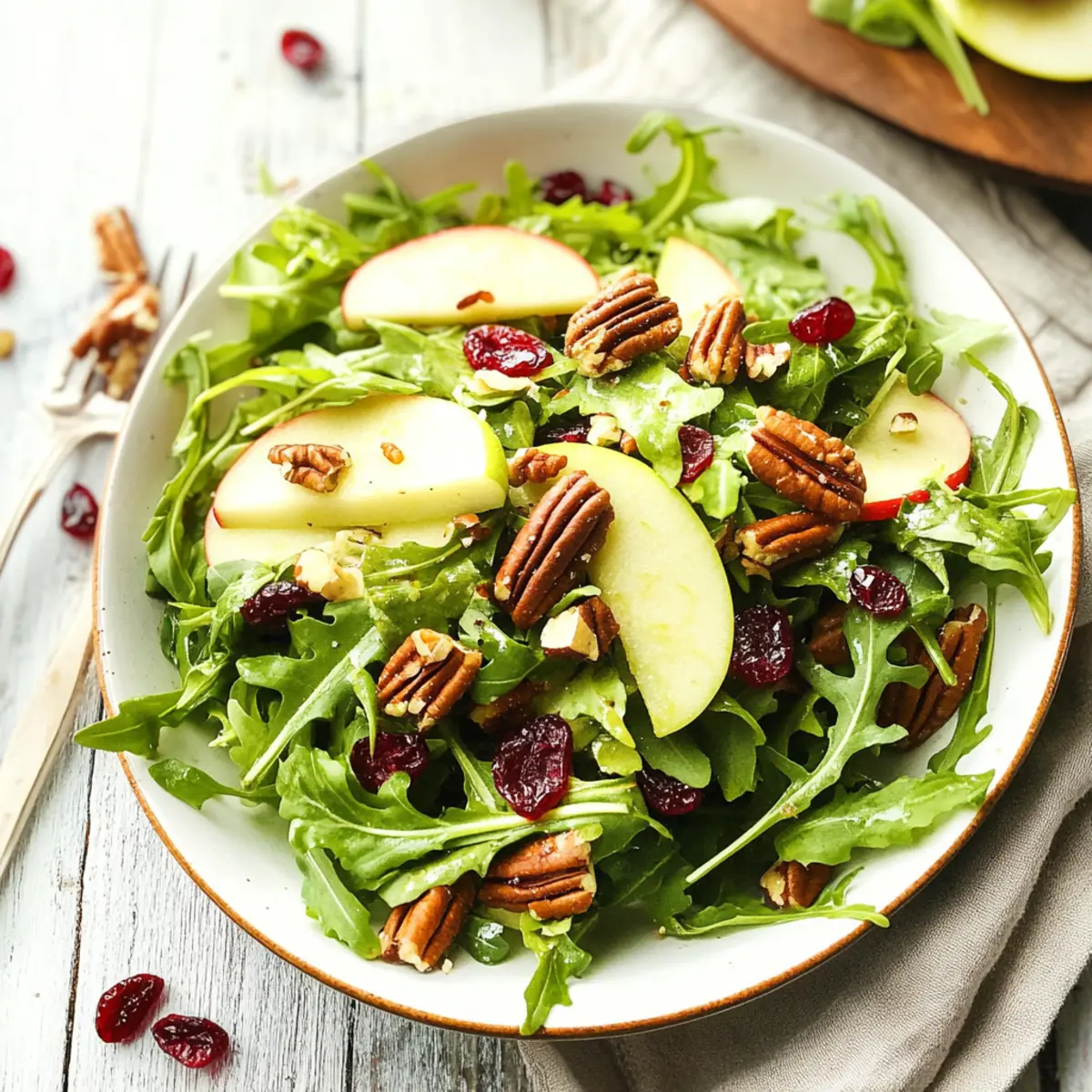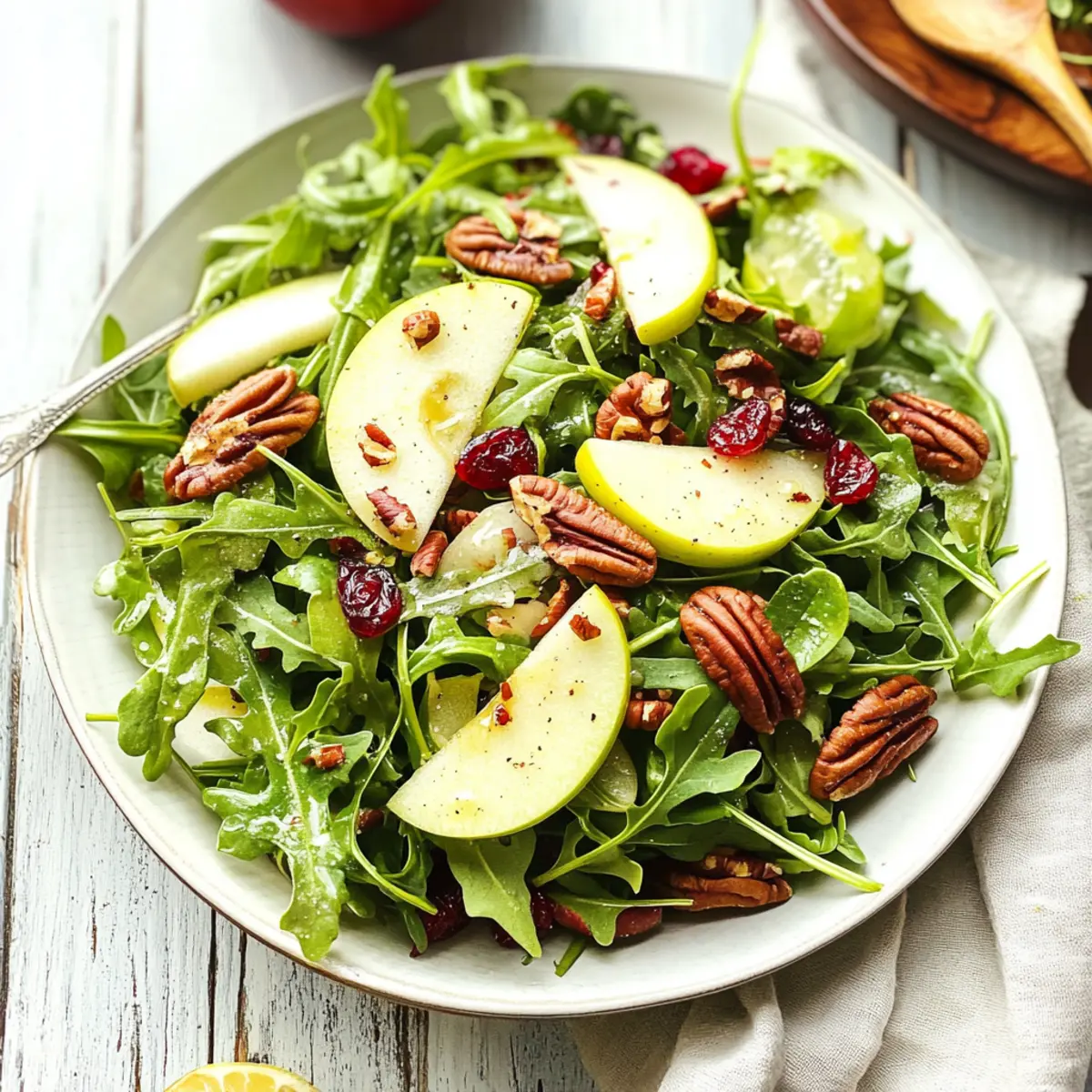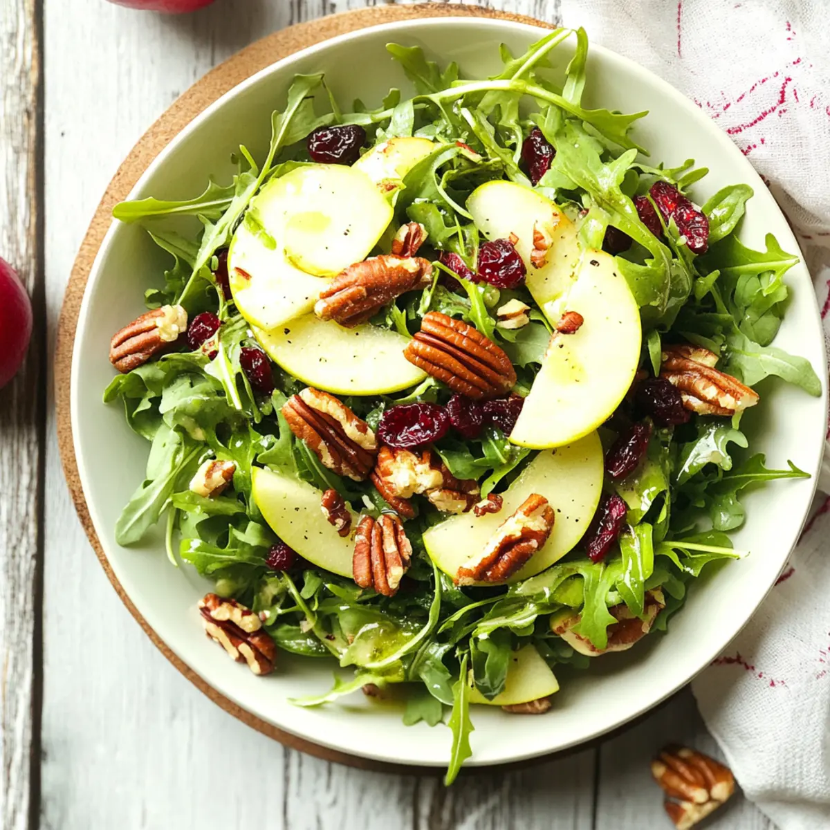 As the warm sun casts a golden glow on my kitchen, I find myself reaching for the freshest ingredients to craft a delightful dish. Today, I’m excited to share my Quick and Easy Apple Pecan Arugula Salad, a perfect blend of peppery arugula, sweet crisp apples, and crunchy toasted pecans. This salad is not only a breeze to whip up in just 15 minutes but also a refreshing, nutrient-packed option that brightens any meal. Whether you’re looking for a light lunch option or a vibrant side dish to complement dinner, it ticks all the boxes—gluten-free, vegan, and brimming with flavor. How about elevating your next dining experience with this tantalizing dish? Let’s dive into the delicious simplicity of this salad! Why is This Salad a Game Changer? Simplicity: This Apple Pecan Arugula Salad can be prepared in just 15 minutes, making it an ideal option for those busy days when you want something healthy but quick. Flavor Explosion: The combination of sweet apples, crunchy pecans, and peppery arugula creates a delightful contrast that will have your taste buds dancing. Versatile Delight: Perfect as a light lunch or paired as a side dish with grilled meats. For variety, check out my Chicken Caesar Salad or Cucumber Caprese Salad for other fresh meal ideas! Nutrient Rich: This salad is not only delicious but also packed with vitamins and minerals, making it a smart choice for anyone looking to eat healthily. Customizable: Feel free to swap arugula for baby spinach or mix in crumbled feta for a creamy twist. This adaptability allows you to tailor the dish according to your taste preferences. Apple Pecan Arugula Salad Ingredients For the Salad • Raw Pecans – Adds crunch and nuttiness; substitute walnuts if unavailable. • Arugula – Provides a peppery flavor and vibrant green color; organic is preferred. • Apples – One tart and one sweet apple contribute sweetness and balancing acidity; use any combination of apples. • Red Onion – Adds sharpness and depth; use less if sensitive to strong flavors or substitute with scallions. • Dried Cranberries – Optional for added sweetness and chewiness; can be omitted or replaced with pomegranate seeds. For the Dressing • Lemon Juice – Brightens the salad; fresh is preferable. • Maple Syrup – Adds a hint of sweetness to the dressing; honey can be a substitute for non-vegan options. • Sea Salt & Black Pepper – Enhances flavor; adjust to taste. • Olive Oil – Provides richness to the dressing; use extra virgin for the best flavor. Step‑by‑Step Instructions for Apple Pecan Arugula Salad Step 1: Toast the Pecans Preheat your oven to 350°F (176°C) and grab a baking sheet. Spread the raw pecans evenly across the sheet and toast them in the oven for 8-10 minutes, watching closely until they become golden and fragrant. This step adds a delightful crunch and nutty flavor to your Apple Pecan Arugula Salad. Step 2: Prepare the Salad Base While the pecans are toasting, wash and dry the arugula thoroughly. In a large salad bowl, thinly slice your choice of sweet and tart apples, along with the red onion. Combine them gently with the arugula and sprinkle in the dried cranberries if using. This colorful medley forms the vibrant foundation of your salad. Step 3: Make the Dressing In a separate bowl or jar, whisk together the fresh lemon juice, maple syrup, sea salt, and black pepper. Gradually drizzle in the olive oil while whisking to create a smooth, emulsified dressing. The lemon vinaigrette’s bright flavors will perfectly complement the sweetness of the apples in your Apple Pecan Arugula Salad. Step 4: Combine All Ingredients Once the pecans are toasted and fragrant, remove them from the oven and let them cool slightly. Add the toasted pecans to the salad mixture, then drizzle the prepared dressing over the top. Toss everything gently until all the ingredients are well coated with the dressing, ensuring every bite is full of flavor. Step 5: Serve Immediately For the best taste and freshness, serve your Apple Pecan Arugula Salad right away. The crisp texture of the arugula and the crunch of the pecans are at their peak, providing a wonderful contrast with the sweet apples. Enjoy this delightful salad as a light meal or side dish! Make Ahead Options Preparing your Apple Pecan Arugula Salad in advance can save precious time during busy weeknights! You can wash and dry the arugula, slice the apples and red onion, and even toast the pecans up to 24 hours ahead. Once prepped, store the arugula and sliced apples (to prevent browning, consider tossing the apple slices with a little lemon juice) in separate airtight containers in the refrigerator. When you’re ready to serve, simply combine the salad ingredients and drizzle with the prepared lemon vinaigrette. This method ensures your salad is just as delicious as if you made it fresh, while keeping your kitchen routine smooth and efficient! How to Store and Freeze Apple Pecan Arugula Salad Fridge: Store leftovers in an airtight container in the refrigerator for up to 2-3 days. Keeping the dressing separate will help maintain the freshness of the salad. Freezer: It’s best not to freeze the Apple Pecan Arugula Salad, as the texture of the arugula and apples may become mushy once thawed. Reheating: This salad is best enjoyed cold. To refresh the flavors, toss it with a bit of extra dressing before serving. Tips for Freshness: Add fresh ingredients just before serving if you’re preparing this salad in advance; this will enhance both flavor and texture. Expert Tips for Apple Pecan Arugula Salad Watch the Pecans: Keep an eye on pecans while toasting; overcooking can cause them to become bitter. Aim for golden brown, aromatic nuts. Dress at the Right Time: Dress the salad just before serving to maintain texture. If you want to prepare ahead, keep the dressing separate until ready to serve. Mix and Match Apples: Use a combination of tart and sweet apples to balance flavors beautifully. Exper