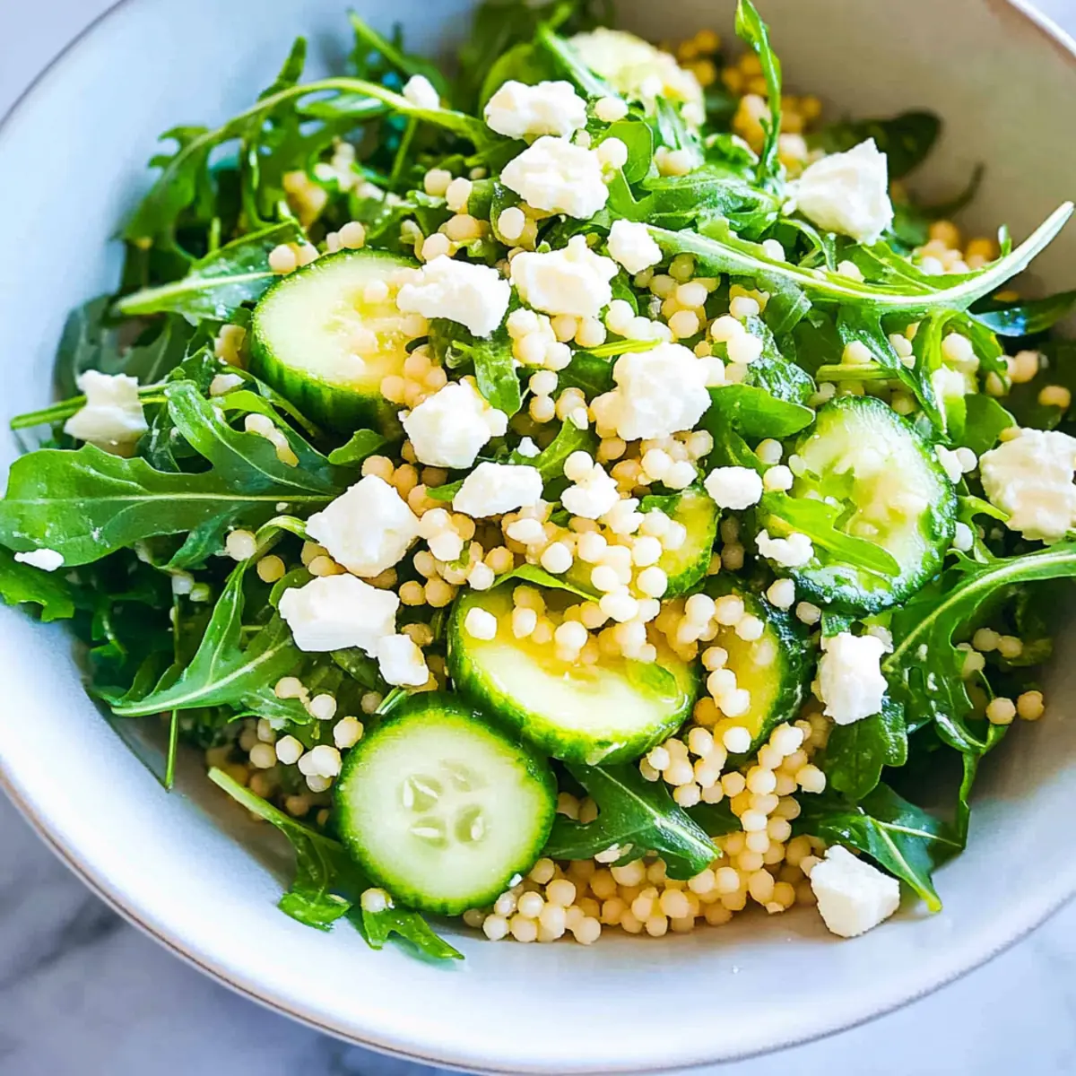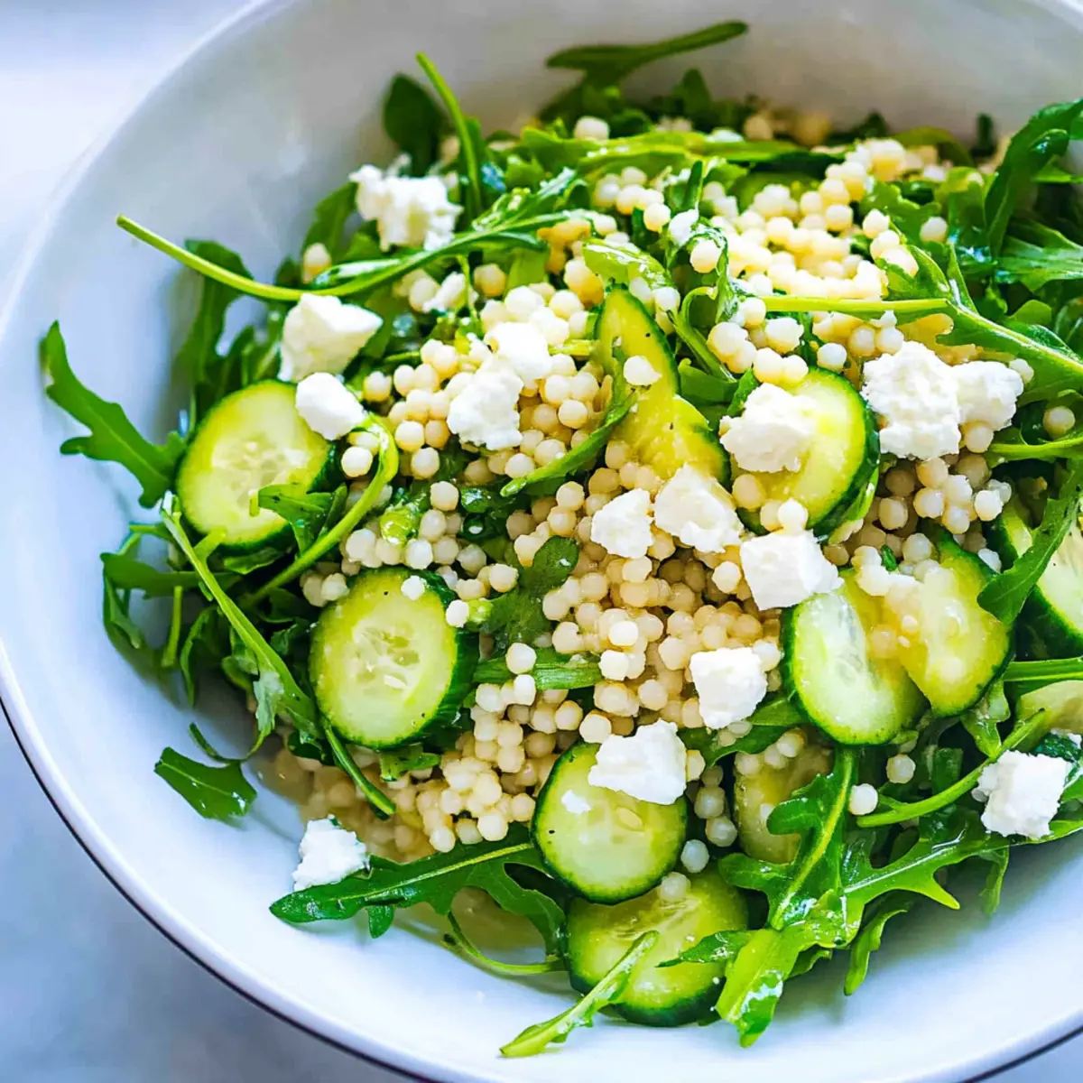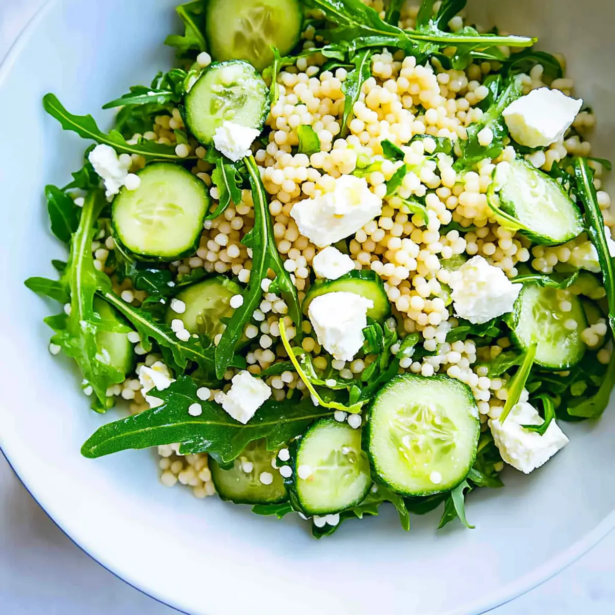 In the hustle and bustle of daily life, finding a quick yet satisfying meal can feel like a balancing act. Enter my Arugula Couscous Salad with Feta, a delightful Mediterranean escape that’s as easy to make as it is delicious. This vibrant salad combines the peppery bite of fresh arugula, the tender texture of pearl couscous, and the creamy goodness of feta, all tossed with a bright lemon vinaigrette. Not only is it a breeze to whip up—taking just 20 minutes from start to finish—it’s a fantastic, light option that’s perfect for a nourishing lunch or as a side dish for dinner. Whether you’re a busy professional, a passionate home chef, or someone just looking for a tasty alternative to fast food, this salad is here to inspire your culinary creativity. Ready to elevate your mealtime routine? Let’s dive in! Why is this salad a must-try? Simplicity: With just 20 minutes of prep time, this salad is perfect for busy weeknights or quick lunch breaks. Vibrant flavors: The peppery arugula and creamy feta create an exciting flavor profile that’s bound to impress your taste buds. Versatile base: Customizable with options like grilled chicken or seasonal vegetables, this salad adapts to your preferences perfectly. Health-conscious: Packed with nutritious ingredients, it offers both a satisfying meal and a boost of healthy goodness! For more refreshing ideas, check out this Feta Avocado Salad. Elevate your dining experience with something truly special! Arugula Couscous Salad with Feta Ingredients Looking to make this refreshing salad? Here’s everything you need! For the Salad • Dried Pearl Couscous – The main component, providing a chewy texture; feel free to substitute with quinoa or bulgur for a gluten-free option. • Baby Arugula – This peppery green adds a delightful bite; you can swap it out for any tender salad greens available. • Seedless Cucumber – Offers crunch and hydration to the dish; other cucumber varieties can easily work as well. • Feta Cheese – Melts beautifully into the salad with a creamy tang; goat cheese or a dairy-free alternative works just as well! • Fresh Lemon Juice – Elevates the freshness of this salad; if you’re in the mood for something different, try lime juice instead. • Extra Virgin Olive Oil – A flavorful base for the dressing that enhances overall richness; another neutral oil can be used if preferred. • Honey or Maple Syrup – A touch of sweetness to balance flavors; feel free to omit if you’re watching your sugar intake. • Preserved Lemon (optional) – Adds a unique citrus depth; lemon zest is a great alternative for a fresh taste. • Dried or Fresh Basil (optional) – Infuses aromatic freshness; substitute with parsley if you prefer or cannot find basil. • Sea Salt and Black Pepper – Essential seasonings to bring all flavors together! Dive into this delightful dish, and enjoy the breezy Mediterranean vibes of the Arugula Couscous Salad with Feta! Step‑by‑Step Instructions for Arugula Couscous Salad with Feta Step 1: Boil the Couscous Begin by bringing a large pot of salted water to a rolling boil over high heat. Once boiling, add the dried pearl couscous and reduce the heat to medium. Cook the couscous for about 8-10 minutes, or until it’s tender yet al dente. After cooking, drain the couscous in a colander and transfer it to a large mixing bowl to cool slightly. Step 2: Whisk the Vinaigrette In a separate bowl, prepare the zesty lemon vinaigrette by whisking together freshly squeezed lemon juice, extra virgin olive oil, honey or maple syrup, diced preserved lemon (if using), and chopped fresh basil (optional). Keep whisking until the mixture is well combined and emulsified. Season the vinaigrette to taste with a pinch of sea salt and black pepper for added flavor. Step 3: Combine Couscous and Dressing While the couscous is still slightly warm, pour the prepared vinaigrette over it. Gently toss the couscous with the dressing, ensuring every grain is coated. Allow the salad to sit for about 5 minutes, enabling the couscous to soak in the bright flavors of the dressing, which enhances the overall taste of your Arugula Couscous Salad with Feta. Step 4: Add Fresh Ingredients Next, fold in the peppery baby arugula, diced seedless cucumber, and crumbled feta cheese into the couscous mixture. Use a spatula to gently mix everything together, ensuring that the ingredients are evenly distributed without wilting the greens. The fresh arugula will provide a wonderful crunch and enhance the salad’s vibrant look and taste. Step 5: Serve the Salad Once combined, your Arugula Couscous Salad with Feta is ready to serve! Spoon it into individual bowls or a large serving platter for sharing. This refreshing salad is best enjoyed immediately while the ingredients are fresh and crisp. Ideal as a light lunch or a delightful side dish, get ready to savor every bite! What to Serve with Arugula Couscous Salad with Feta Enhancing your meal with delightful pairings creates a symphony of flavors and textures around this refreshing salad. Grilled Chicken: Juicy and tender, grilled chicken infuses a savory touch, making for a satisfying protein-packed meal. Roasted Vegetables: Warm, caramelized veggies add earthy flavors that beautifully contrast the fresh brightness of the salad. Mediterranean Quinoa: This protein-rich blend gives a nutty flavor and texture, perfect for complementing the creamy feta. Tahini Sauce: Drizzled on top, this nutty and creamy sauce enhances the overall flavor profile and enriches the dish. Light Gazpacho: A chilled cucumber or tomato soup offers a refreshing contrast, echoing the freshness of arugula and feta. Pita Chips: Crunchy and salty, they provide a satisfying textural balance and make for delightful dipping alongside. Chilled White Wine: A crisp, zesty Sauvignon Blanc elevates the meal; its acidity cuts through the richness of the feta beautifully. Minty Yogurt Dip: Cooling and refreshing, thi