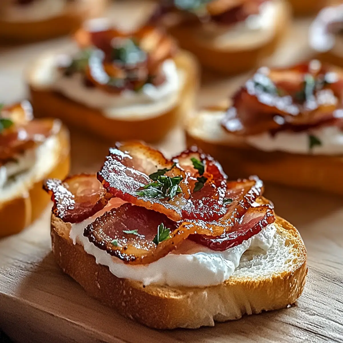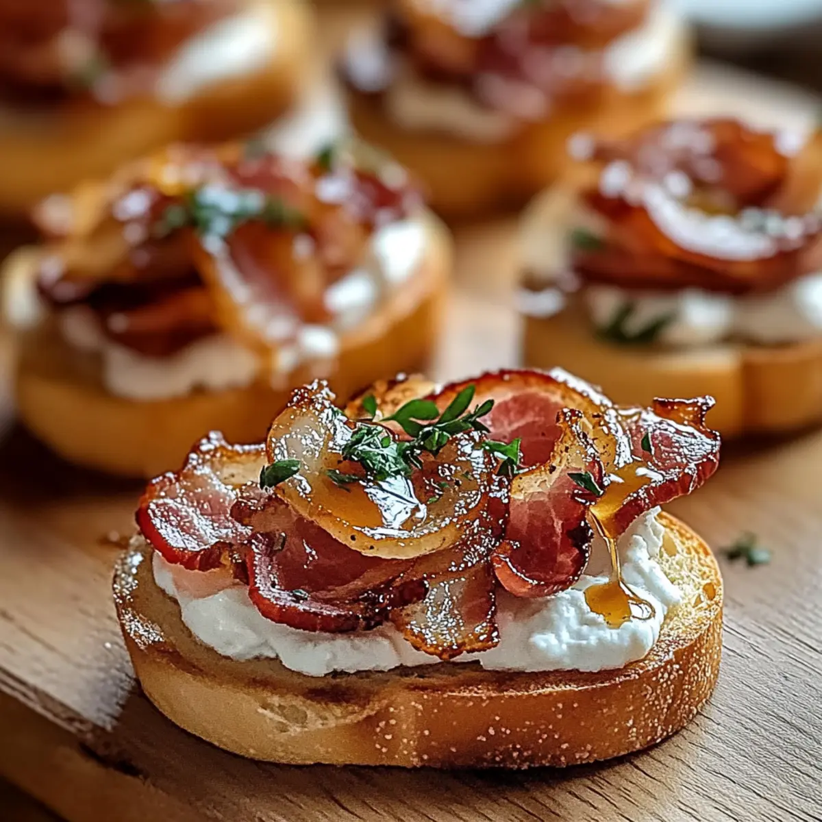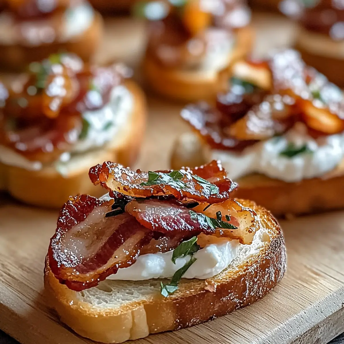 As the oven warms and the rich scent of bacon starts wafting through the kitchen, I can’t help but feel a wave of excitement. Today, I’m sharing my Million Dollar Bacon Crostini, an irresistible blend of creamy goat cheese, crispy bacon, and a touch of sweetness from your choice of syrup. This recipe is a game changer for any gathering—plus, it’s effortlessly customizable for all tastes, whether you prefer gluten-free options or non-pork alternatives. With just a few simple ingredients, you’ll create a dish that not only pleases the crowd but also leaves you with time to enjoy the party. So, how adventurous will you get with your toppings? Why Will You Love This Bacon Crostini? Versatile Options: This recipe is easily customizable, whether you choose to use different syrups or explore toppings like fresh herbs or spicy seasonings. Crowd-Pleaser: With its combination of savory bacon and creamy goat cheese, this dish makes for an unforgettable appetizer at any gathering. Simplicity: The steps are easy to follow, making it a perfect choice for both novice cooks and experienced chefs. Time-Saving: Ready in under 40 minutes, you can whip these crostini up even on short notice, so you’re never left without a flavorful snack. Diet-Friendly: Gluten-free and non-pork bacon alternatives mean everyone can enjoy this treat! Elevate your next meal with stunning flavors reminiscent of my Bourbon Bbq Bacon delights. Bacon Crostini Ingredients For the Bacon Coating Thick-Cut Bacon – Provides a rich, crispy texture; use brisket or turkey bacon for a non-pork option. Brown Sugar – Adds delightful sweetness and caramelization; consider coconut sugar for a healthier twist. Water – Essential for dissolving the brown sugar for that sticky coating. Black Pepper – Offers depth and heat; adjust to your spice preference. Cayenne Pepper – Adds a dash of spice; omit for a milder taste. Red Pepper Flakes – Optional for heat; sprinkle sparingly based on your flavor preference. Smoked Paprika – Introduces a smoky flavor; you can swap it for regular paprika if needed. For the Crostini Base Baguette – Crunchy foundation for the crostini; opt for gluten-free baguette if desired. Olive Oil – Brushed onto the baguette for crispiness; melted butter can serve as a rich alternative. Salt and Pepper – Key for seasoning; feel free to adjust according to your taste. Garlic Clove – Optional for rubbing onto the toasted bread to infuse aromatic flavor. For the Topping Goat Cheese – Adds a creamy element; cream cheese makes a milder substitute. Syrup (Maple, Honey, Hot Honey) – Drizzled on top for sweetness; sugar-free syrup works as an alternative. Fresh Herbs (Thyme, Chives) – Optional garnish that enhances flavor and presentation. Elevate your appetizer spread with this delicious Bacon Crostini, effortlessly customizable to suit all palates! Step‑by‑Step Instructions for Million Dollar Bacon Crostini Step 1: Prep Oven Begin by preheating your oven to 375°F (190°C). To catch any drippings, line a baking sheet with foil and place a wire rack on top. This setup will ensure your thick-cut bacon crisps evenly, which is essential for achieving that delightful texture in your Million Dollar Bacon Crostini. Step 2: Mix Coating In a mixing bowl, combine brown sugar, water, black pepper, cayenne, and red pepper flakes until you achieve a thick, paste-like consistency. This sticky mixture is what will adhere to the bacon, providing a delicious sweet and slightly spicy coating. Set this aside as you prepare the bacon. Step 3: Dredge Bacon Take each strip of thick-cut bacon and coat it evenly with the brown sugar mixture. Ensure every inch is covered, then lay the strips flat on the wire rack. This allows the heat to circulate around the bacon, which helps it crisp up beautifully as it cooks. Step 4: Bake Bacon Slide the bacon-laden rack into the preheated oven and bake for 25-30 minutes. Keep an eye on the bacon as it bakes, flipping halfway through to achieve uniform crispiness. You’ll know it’s done when it’s caramelized and crispy. Allow it to cool before chopping into smaller pieces. Step 5: Prepare Baguette While the bacon cools, slice your baguette into thin pieces and brush each side with a little olive oil. Season with salt and pepper to taste. Place the slices on a baking sheet and toast them in the oven for about 8-10 minutes, until golden brown and crispy. This crunchy base is essential for your Million Dollar Bacon Crostini. Step 6: Assemble Crostini Now comes the fun part! Spread a generous amount of creamy goat cheese on each toasted baguette slice. Top with pieces of your delicious bacon and finish with a drizzle of your choice of syrup—maple, honey, or hot honey. This combination of flavors will elevate your crostini to new heights. Step 7: Garnish & Serve For an extra touch of flavor, sprinkle fresh herbs such as thyme or chives over your assembled Million Dollar Bacon Crostini. Serve immediately to enjoy the delightful contrast of crispy, creamy, and sweet flavors. Your guests will rave about this tasty appetizer! What to Serve with Million Dollar Bacon Crostini Make your gathering unforgettable by complementing this delightful appetizer with equally tantalizing dishes and drinks. Fresh Arugula Salad: A citrus-dressed salad adds a peppery crunch, balancing the rich crostini beautifully. The bright flavors will awaken your palate. Roasted Vegetable Platter: Colorful, caramelized veggies provide a wholesome contrast to the savory bite of the crostini. Plus, they add visual appeal to your spread. Creamy Tomato Soup: Pairing with a warm bowl of creamy tomato soup creates a cozy vibe, perfect for a casual evening with loved ones. The comforting flavors are a match made in culinary heaven. Strawberry Basil Lemonade: This refreshing drink offers a sweet and herbaceous twist that enhances the sweet notes of the crostini. It’s a vibrant sipper everyone will adore! Cheese and C