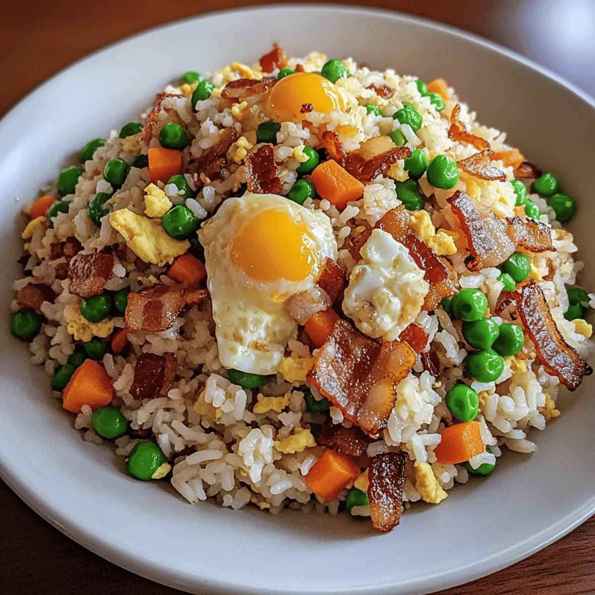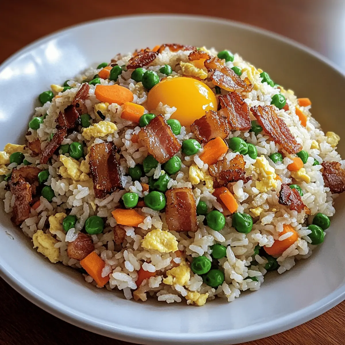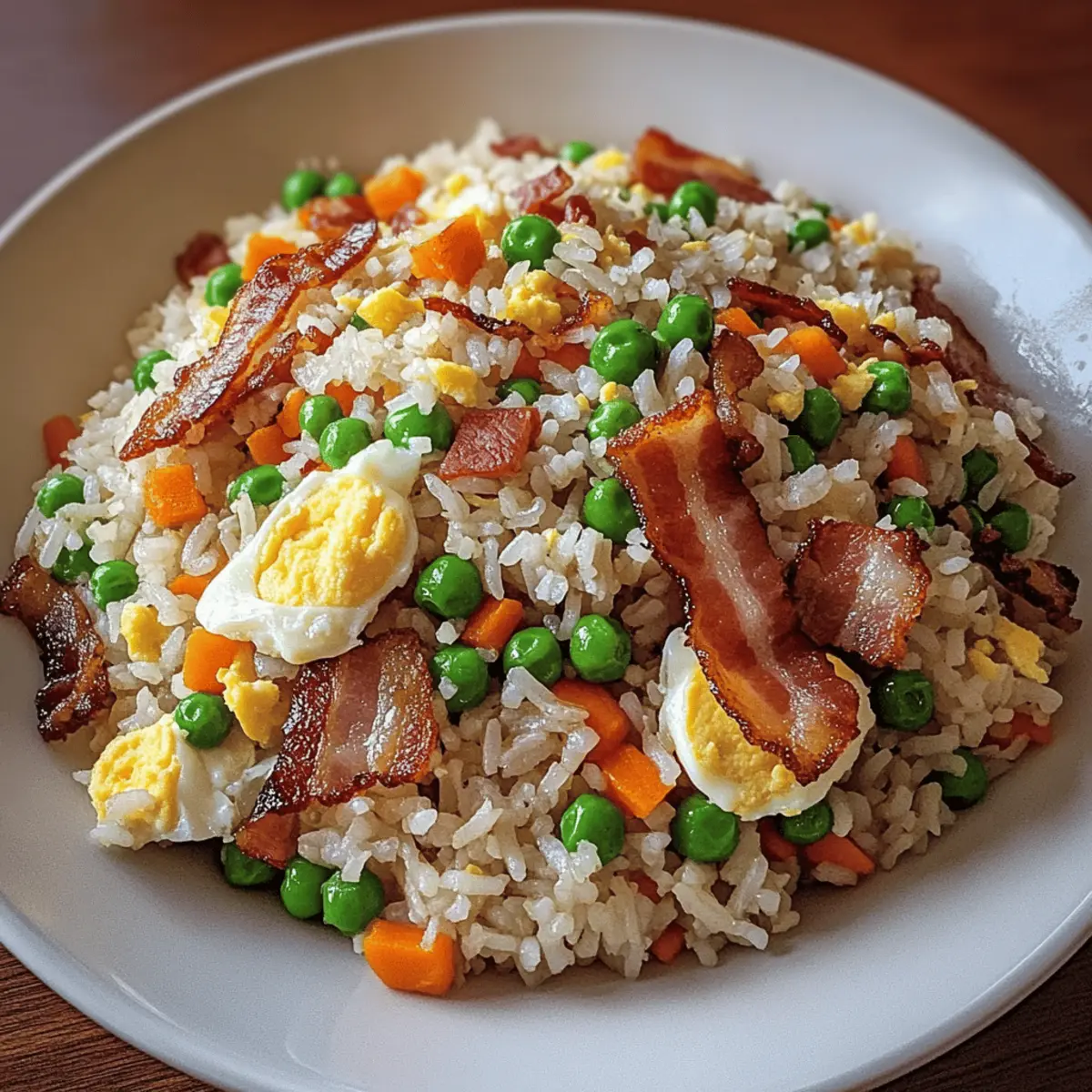 As I stood at the stove, the enticing aroma of sizzling bacon filled the kitchen, instantly lifting my spirits. This delightful scene unfolds into one of my all-time favorites: Bacon Fried Rice. It’s not just a meal; it’s a quick dinner solution that packs in all the comfort you crave when the day demands something satisfying yet easy to prepare. With the rich smokiness of bacon harmonizing with fluffy rice, vibrant vegetables, and scrambled eggs, you’re in for a flavor adventure. Perfectly simple to make in under 30 minutes, this dish is sure to become a staple for busy weeknights. Curious about how to whip up this delightful dish? Let’s dive in! Why Is Bacon Fried Rice So Delicious? Satisfying Comfort: There’s nothing quite like the combination of crispy bacon and fluffy rice to make your taste buds dance with delight. Quick to Prepare: In just under 30 minutes, you can bring this dish to life, making it a perfect solution for those hectic weeknights. Versatile Flavor: Feel free to mix in your favorite veggies or even add a spicy kick with some chili oil—make it your own! Crowd-Pleasing Appeal: This dish is always a hit at family dinners or casual gatherings, leaving everyone asking for seconds. Effortless Leftover Meal: Utilizing cold, leftover rice makes this dish not only delicious but also a fantastic way to reduce food waste. Pair it with a soft-boiled egg for extra creaminess, or check out my Homemade Fried Rice for more inspiration! Bacon Fried Rice Ingredients For the Rice Base • Cold Cooked White Rice – The key element that provides structure; leftover rice works best for texture. For the Bacon Flavor • Bacon (4 slices, chopped) – Infuses the dish with savory richness and crispy texture; turkey bacon is a great low-fat alternative. For the Eggs • Large Eggs (2) – Adds creaminess and a boost of protein; scramble lightly for the fluffiest result. For the Vegetables • Small Onion (1, finely chopped) – Adds a sweet depth of flavor; chopping finely ensures even cooking. • Frozen Peas and Carrots Mix (1 cup) – Brings color, sweetness, and balanced nutrition; fresh veggies can make a delightful swap. For Flavoring • Soy Sauce (3 tablespoons) – This umami powerhouse enhances the dish; adjust the amount based on your salt preference. • Sesame Oil (2 tablespoons) – Delivers a nutty aroma that envelops the dish in rich flavor. For Garnish • Green Onions (2, chopped) – Adds a fresh crunch and vibrant color to finish your dish. To Season • Salt and Black Pepper – To taste, make sure to adjust these to elevate the overall flavor profile of your Bacon Fried Rice. With these simple Bacon Fried Rice ingredients on hand, you’re just moments away from enjoying a comforting, homemade meal! Step‑by‑Step Instructions for Bacon Fried Rice Step 1: Cook the Bacon Heat a large skillet or wok over medium heat. Add the chopped bacon and cook, stirring occasionally, for about 5-7 minutes, or until the bacon is crispy and golden brown. This will infuse your kitchen with a delightful aroma. Once cooked, use a slotted spoon to remove the bacon and drain it on paper towels while leaving the bacon fat in the skillet. Step 2: Scramble the Eggs In the same skillet with the residual bacon fat, crack the 2 large eggs. Stir gently with a spatula over medium-low heat for about 1-2 minutes until they’re just set but still soft. The eggs should be fluffy and pale yellow. Remove them from the skillet and set aside with the bacon to keep them warm. Step 3: Sauté the Onions Next, add the finely chopped onion to the skillet and increase the heat to medium. Sauté for about 3-4 minutes, or until the onion is translucent and fragrant. This step creates a beautiful flavor base for your Bacon Fried Rice, inviting some sweetness into the dish. Step 4: Add Vegetables Stir in the frozen peas and carrots into the skillet with the sautéed onions. Cook for about 2-3 minutes, making sure to stir frequently until they are warmed through and vibrant in color. The vegetables add a lovely pop of color along with nutrition to your dish, enhancing the overall taste. Step 5: Incorporate the Rice Raise the heat to medium-high and add the cold cooked white rice to the skillet, breaking up any clumps with your spatula. Stir-fry for 2-3 minutes, allowing the rice to heat evenly and absorb the wonderful flavors in the pan. The goal is for the rice to take on a warm, glossy finish. Step 6: Season with Soy Sauce Pour in the 3 tablespoons of soy sauce and 2 tablespoons of sesame oil, thoroughly mixing to coat all the rice and vegetables. Continue stir-frying for another minute or two until everything is evenly combined and heated through. This will elevate the potential flavor of your Bacon Fried Rice, giving it that umami hit. Step 7: Return Bacon and Eggs Add the crispy bacon and scrambled eggs back to the skillet. Gently fold them into the rice mixture, ensuring they are distributed evenly throughout the dish. Cook for an additional 1-2 minutes to heat everything through and allow the flavors to meld beautifully. Step 8: Final Seasoning Taste your Bacon Fried Rice and season with salt and black pepper as needed. Stir well and give it a minute longer on the heat to ensure it’s fully combined and warming throughout. The contrast of flavors comes alive in this delightful comfort food. Step 9: Garnish and Serve Remove the skillet from the heat and sprinkle the chopped green onions on top for a fresh garnish. Serve your Bacon Fried Rice hot, optionally with a soft-boiled egg on top for added creaminess. This lively dish is sure to become a family favorite! Bacon Fried Rice Variations & Substitutions Feel free to get creative with this Bacon Fried Rice recipe and make it your own, adding personal touches that tantalize your taste buds! Turkey Bacon: Substitute traditional bacon with turkey bacon for a lighter, lower-fat version that still delivers on flavor. It’s a great alternative that w