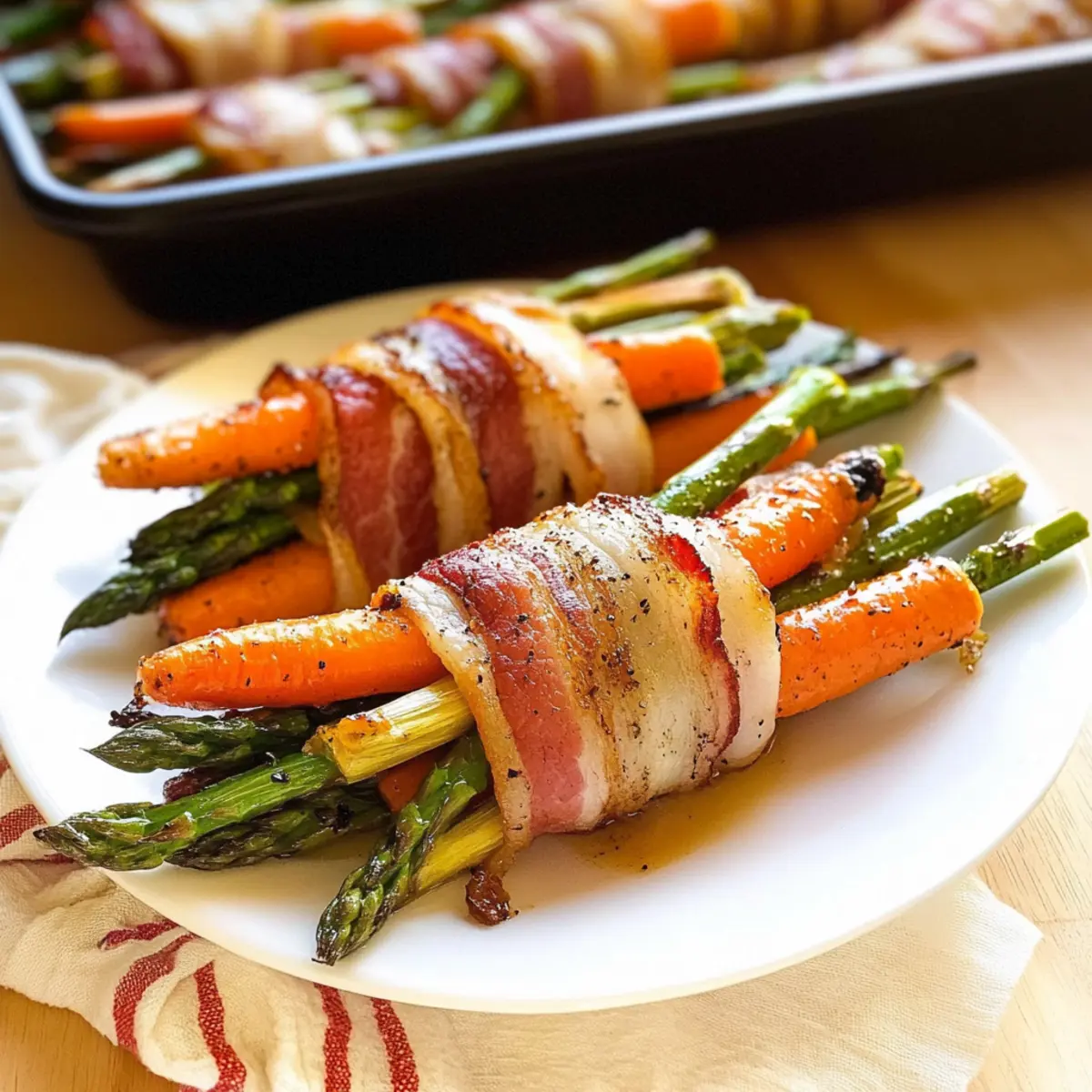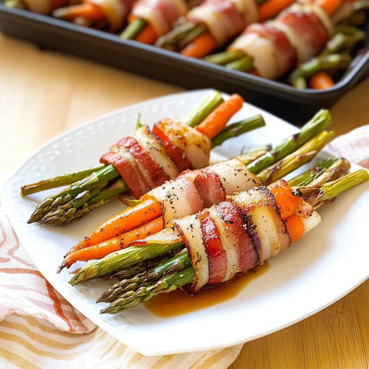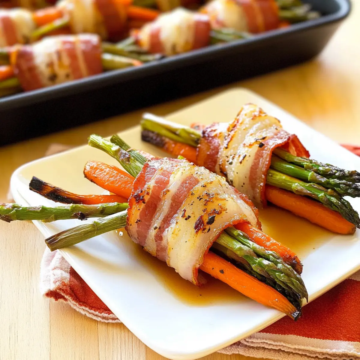 As I pulled out the skillet, the rich aroma of sizzling bacon filled the kitchen, instantly making my mouth water. It’s moments like these that remind me just how magical a simple dish can be, especially when it’s Bacon Wrapped Vegetables with Maple Glaze. This oven-roasted delight elevates any holiday meal with a perfect blend of savory and sweet. Not only is it a quick and easy side dish, but it also sneaks in those essential veggies in a way that even the pickiest eaters can’t resist. Whether you’re prepping for Thanksgiving, Christmas, or just a cozy family dinner, these bundles offer satisfying textures and flavors that celebrate the season. Ready to discover how to create this crowd-pleaser? Let’s dive in! Why Are Bacon Wrapped Vegetables Irresistible? Flavor Explosion: The combination of crispy bacon and sweet maple glaze creates a mouthwatering experience that will have everyone coming back for seconds. Visually Stunning: Each vegetable bundle is beautifully presented, making your holiday table shine. Healthy Twist: You’re sneaking in nutritious veggies without sacrificing taste, perfect for health-conscious guests. Quick Prep: Ready in under 30 minutes, giving you more time to enjoy the festivities. Crowd-Pleaser: This dish has broad appeal, pleasing both meat-lovers and veggie enthusiasts alike—perfect alongside roast turkey or as a delightful side to your favorite Garlic Roasted Vegetables. With all these irresistible qualities, it’s no wonder these Bacon Wrapped Vegetables with Maple Glaze are a must-have at any gathering! Bacon Wrapped Vegetables Ingredients For the Vegetable Bundles • Carrots – Adds natural sweetness and crunch; feel free to substitute with parsnips or turnips for a different flavor profile. • Parsnips – Provides a slightly nutty flavor; alternatively use celery root or large beets for variation. • Asparagus – Adds a fresh, vibrant touch; consider broccolini or green beans as substitutes if desired. For the Bacon • Thick Cut Bacon – Introduces savory richness and crispy texture; prosciutto can be used for a lighter option. For the Maple Glaze • Pure Maple Syrup – Sweetens and enhances the flavor with depth; honey or agave syrup can work as alternatives, but may change the overall taste. • Apple Cider Vinegar – Provides acidity to balance the sweetness; other options include balsamic or red wine vinegar for variety. • Ground Cumin – Adds warmth and earthiness; replace with smoked paprika if you want a different twist. • Ground Ginger – Offers a gentle spiciness; fresh ginger can be a more potent substitute if you’re looking for a kick. For Seasoning • Salt and Pepper – Essential for seasoning; adjust according to your taste or dietary needs. With these Bacon Wrapped Vegetables, you’re set to impress your guests with a deliciously healthy side that embodies the spirit of the holidays! Step‑by‑Step Instructions for Bacon Wrapped Vegetables Step 1: Preheat the Oven Begin by preheating your oven to 450°F (232°C). This high temperature will ensure that your Bacon Wrapped Vegetables achieve that irresistible crispiness. While the oven heats, line a baking sheet with foil or parchment paper for easy cleanup—this will catch any drippings from the bacon. Step 2: Prepare the Vegetables Next, wash and peel the carrots and parsnips, then cut them into long, even spears. Aim for a size that matches the asparagus for even cooking. These vibrant veggies will shine in your Bacon Wrapped Vegetables, so ensure they’re fresh and firm for the best texture and flavor. Step 3: Create Vegetable Bundles Now it’s time to assemble those tasty bundles! Gather about three asparagus spears, three carrot spears, and three parsnip spears, then tightly wrap a slice of bacon around each bundle. Secure the bacon with a toothpick if needed. This step not only boosts flavor but also creates an appealing presentation for your holiday table. Step 4: Season and Arrange Place the assembled bundles onto the prepared baking sheet, ensuring they are spaced out for even roasting. Generously sprinkle salt and pepper over the bundles to enhance their flavor. The seasoning will beautifully complement the savory bacon in your Bacon Wrapped Vegetables, elevating the entire dish. Step 5: Roast in the Oven Slide the baking sheet into the preheated oven and roast the vegetable bundles for 20 minutes. Keep an eye on them; the bacon should start to crisp up and turn golden brown while the vegetables become tender. You’ll know they’re close to ready by the lovely aroma wafting through your kitchen! Step 6: Whisk the Maple Glaze While the bundles roast, combine the maple syrup, apple cider vinegar, ground cumin, and ground ginger in a small bowl. Whisk these ingredients together until smooth. This glaze will add a glossy finish and a delicious balance of sweet and savory to your Bacon Wrapped Vegetables, so take a moment to enjoy the fragrant aroma as it comes together. Step 7: Drizzle the Glaze After 20 minutes, carefully remove the baking sheet from the oven. Drizzle the maple glaze generously over each bundle, ensuring every piece gets its share. Return the bundles to the oven for an additional 5 minutes—this will caramelize the glaze slightly and enhance that mouth-watering sweetness. Step 8: Serve Warm The Bacon Wrapped Vegetables are now ready! Remove the baking sheet from the oven and let the bundles cool slightly. Serve them warm and enjoy the delightful combination of crispy bacon and tender, flavorful veggies that will have everyone reaching for seconds at your festive gathering! Bacon Wrapped Vegetables Variations & Substitutions Now, let your creativity shine in the kitchen! These variations allow you to tailor the dish to your taste buds, making it even more delightful. Root Veggies: Swap out carrots and parsnips for sweet potatoes or turnips for a unique taste. Green Goodness: Use zucchini or bell peppers in place of asparagus