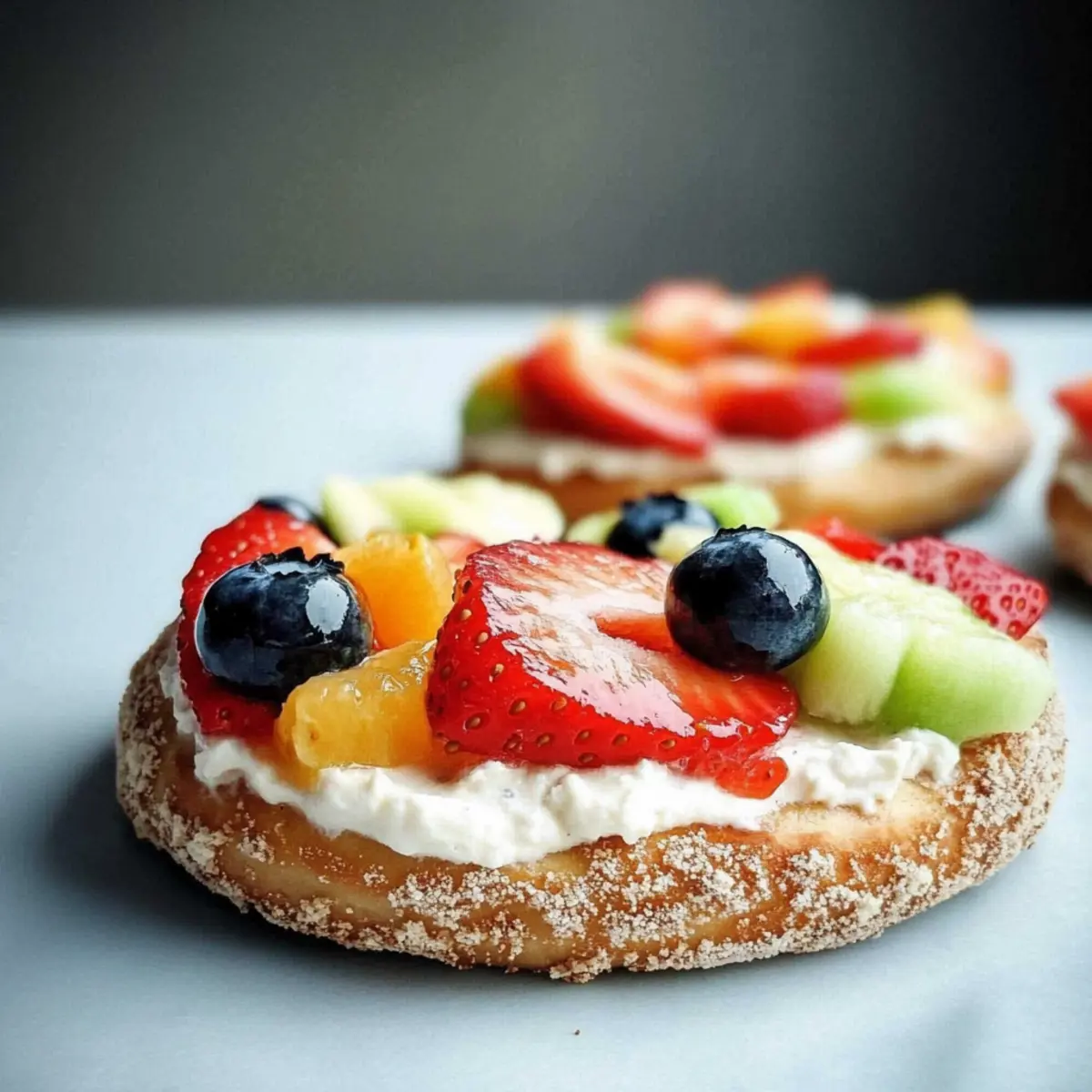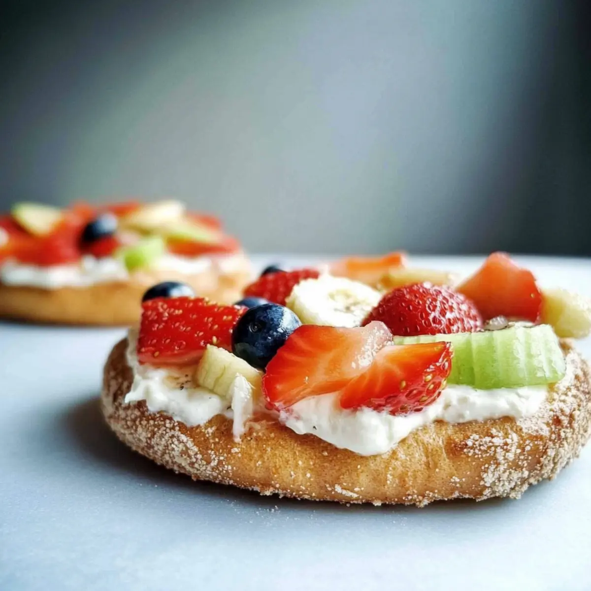 The moment my kids see a tray of Bagel Fruit Pizzas, their eyes light up with delight! Who wouldn’t want to start their day with an edible canvas, just waiting for a burst of color? These joyful creations are not only a healthy breakfast option but also a fantastic way to engage little hands in the kitchen. With creamy layers of cheese and a rainbow of fresh fruits, these pizzas are a breeze to prepare, making them perfect for busy mornings. Plus, the minimal prep ensures you can whip them up in no time, leaving room for creativity at the breakfast table. So, are you ready to discover how to transform simple bagels into a fun and nutritious start to your day? Why will you love Bagel Fruit Pizzas? Customizable: You can mix and match fruits, allowing each family member to create their unique flavor combo. Kid-Friendly Fun: Kids love getting involved in their meals, making breakfast a breeze with this hands-on approach. Quick Preparation: Ready in just minutes, these Bagel Fruit Pizzas fit perfectly into any busy morning routine. Nutritious & Wholesome: Packed with fiber, vitamins, and minerals, this recipe checks all the boxes for a healthy start to the day. Visually Appealing: A colorful array of fruits makes these pizzas not just delicious but also inviting—perfect for little ones! Elevate your breakfast game with this delightful idea and don’t forget to check out our Fruity Pebble Sugar Cookies for a sweet treat to pair with your morning creations! Bagel Fruit Pizzas Ingredients For the Bagels • Bagels – The sturdy base for our pizzas; consider whole grain for added health benefits. For the Creamy Layer • Cream Cheese – This luscious spread lends richness; Greek yogurt offers a lighter alternative. For the Toppings • Fresh Fruit (e.g., strawberries, bananas, blueberries) – Adds a burst of natural sweetness and fiber; feel free to substitute with any seasonal fruit or dried fruits for variety. • Honey (optional) – A drizzle adds extra sweetness if desired; maple syrup works well too for a unique twist. With these fresh Bagel Fruit Pizzas ingredients, you’ll be on your way to a deliciously wholesome breakfast in no time! Step‑by‑Step Instructions for Bagel Fruit Pizzas Step 1: Prepare the Bagels Start by slicing your bagels in half to create the perfect canvas for your Bagel Fruit Pizzas. If you prefer a crunchier texture, pop them in the toaster for about 3-5 minutes until they are golden brown. This slight toasting will enhance their flavor and provide a delightful contrast with the creaminess of the toppings. Step 2: Gather and Prepare the Fruit While the bagels are toasting, wash and prepare your fresh fruit. Slice strawberries, bananas, and any other fruits into small, manageable pieces, arranging them on a vibrant platter. Visually appealing colors make this step fun and inviting—perfect for enticing kids to help assemble their own Bagel Fruit Pizzas! Step 3: Spread the Cream Cheese Once the bagels are toasted and slightly cooled, it’s time to spread a generous layer of cream cheese over each half. Use a butter knife or a small spatula to evenly distribute the cream cheese, allowing it to reach the edge for a delicious base. This creamy layer will complement the fresh fruit perfectly and bind the toppings. Step 4: Decorate with Fruit Invite your little ones to unleash their creativity by topping each bagel half with the prepared fruit. Encourage them to arrange the slices in fun patterns or create a rainbow effect. Letting kids decorate their Bagel Fruit Pizzas not only makes eating more enjoyable but also provides a wonderful way for them to engage in the cooking process. Step 5: Serve Immediately Serve your Bagel Fruit Pizzas right away for the best taste and texture. The crunch of the toasted bagels with the creamy cheese and fresh fruit will be delightful! If you’d like, drizzle a touch of honey on top for an added sweetness. Encourage everyone to dig in and enjoy this fun, healthy breakfast that’s bursting with flavor. How to Store and Freeze Bagel Fruit Pizzas Fridge: Store assembled Bagel Fruit Pizzas in an airtight container for up to 2 hours to prevent sogginess. They are best enjoyed fresh, but if any remain, keep them cool. Freezer: While not recommended for freezing after assembly due to potentially soggy bagels, you can freeze unassembled bagels without toppings for up to 3 months. Just toast them when ready to use. Reheating: If you’ve toasted bagels in advance, reheat in the toaster or oven at 350°F for about 5 minutes until warm, then spread cream cheese and top with fresh fruits before serving. Make-Ahead: Prepare and chop fruits the night before, storing them covered in the fridge. This way, you can quickly assemble Bagel Fruit Pizzas in the morning and start your day on a delicious note! Bagel Fruit Pizzas Variations & Substitutions Feel free to get creative and make these Bagel Fruit Pizzas your own with these fun variations! Nut Butter: Swap out cream cheese for your favorite nut butter like almond or peanut for a protein-packed treat. Greek Yogurt: Use Greek yogurt instead of cream cheese for a lighter option that’s still creamy and delicious. Seasonal Fruits: Adapt the fruit toppings according to the season; try peaches in summer or apples in fall for delightful freshness. Granola Crunch: Top off your pizzas with a sprinkle of granola for added texture that gives a satisfying crunch. Herbal Spice: Add a dash of cinnamon or nutmeg to the cream cheese for a warm, inviting flavor that elevates each bite. Flavored Cream Cheeses: Experiment with different cream cheese flavors like strawberry, honey, or chive for a whole new taste experience. Honey Alternative: Replace honey with agave nectar or coconut syrup for a sweet twist that does the job just as well. Dried Fruits: If fresh fruit isn’t available, try using dried fruits like cranberries or raisins for a tasty alternative. Creating your own Bagel Fruit Pizzas can be a 