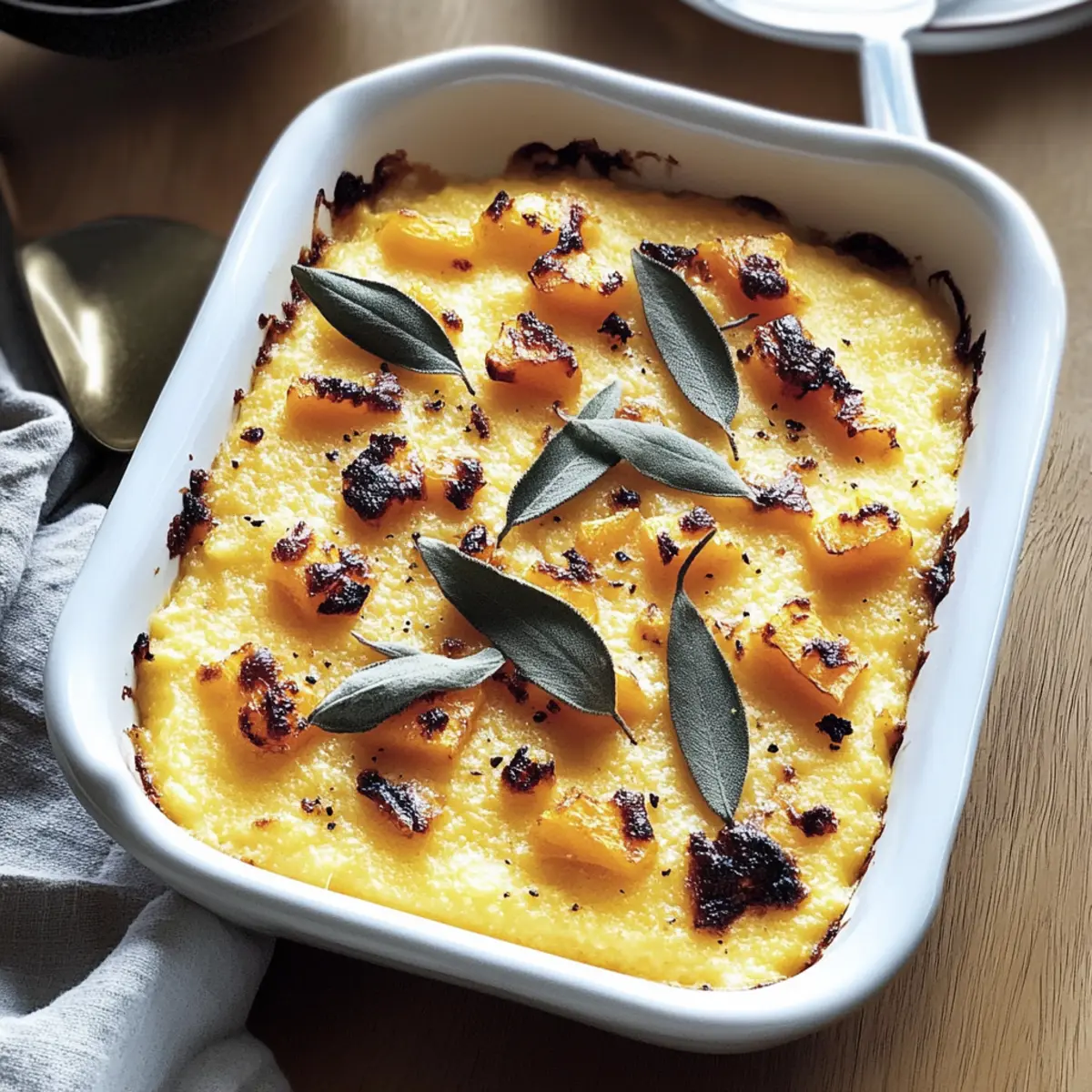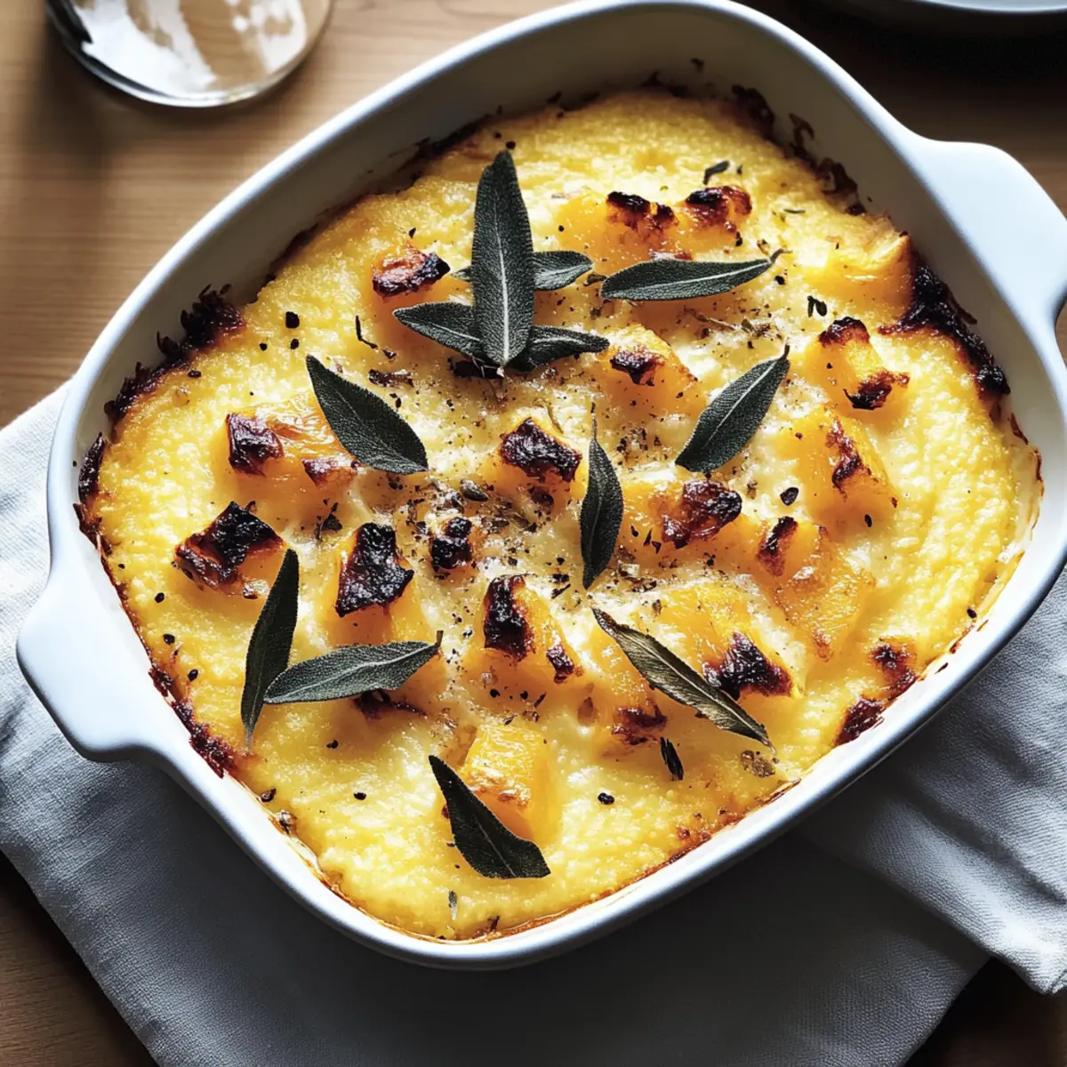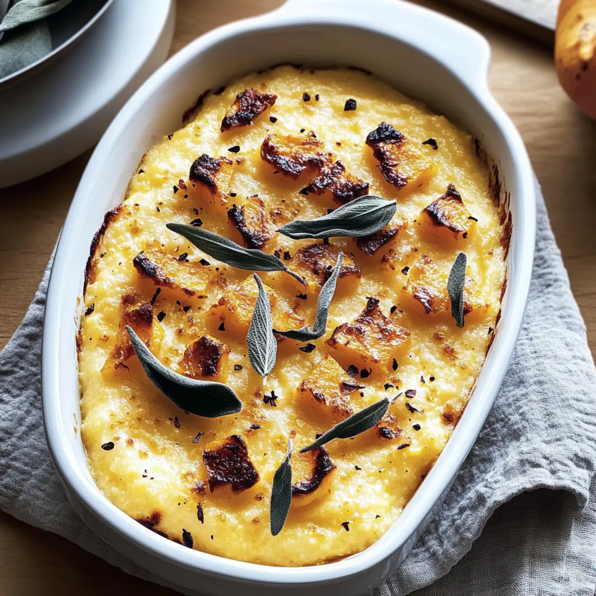 The kitchen fills with a delightful aroma as sweet butternut squash roasts to perfection, a sensory delight that sets the stage for my Cozy Cheesy Baked Butternut Squash Polenta recipe. This dish seamlessly blends the natural sweetness of caramelized squash with creamy polenta and luscious Fontina cheese, creating a warm hug on the plate. Not only is this recipe incredibly comforting, perfect for chilly evenings or gatherings, but it’s also make-ahead friendly, making weeknight dinners a breeze. Imagine pulling a golden, bubbling casserole from the oven, ready to impress your family and friends. What’s your favorite way to enjoy cheesy comfort food? Why is Baked Butternut Squash Polenta Amazing? Comforting Warmth: This dish wraps you in cozy flavors that make every bite feel like a warm embrace. Deliciously Versatile: Enjoy it as a hearty main dish or a delightful side, pairing beautifully with roasted meats or crisp salads. Make-Ahead Convenience: Roast the butternut squash in advance or store leftovers for a quick, satisfying meal anytime. Nutritiously Rich: Packed with fiber and vitamin A, this dish is not just tasty but also a wholesome choice. Crowd-Pleasing Appeal: With its gooey Fontina cheese and creamy texture, it’s sure to impress at any gathering—just like my recipe for Soft Baked Maple treats! Baked Butternut Squash Polenta Ingredients For the Polenta • Polenta – the base of the dish, providing a smooth, creamy texture when cooked properly. • Vegetable Broth or Water – enhances the flavor and depth of the dish; using broth is especially recommended for a savory kick. • Salt – adjust to taste preferences for the perfect cheesy experience and enhance overall flavor. For the Butternut Squash • Butternut Squash – adds natural sweetness and creaminess; roasting it brings out richer flavors. For the Cheesy Twist • Fontina Cheese – creates rich, gooey pockets of cheese; can be substituted with Gruyère for a different flavor profile. This delectable Baked Butternut Squash Polenta is not only easy to prepare but also a fantastic make-ahead meal option! Step‑by‑Step Instructions for Baked Butternut Squash Polenta Step 1: Preheat the Oven Begin by preheating your oven to 400°F (200°C). This ensures that the Baked Butternut Squash Polenta will experience optimal cooking conditions, allowing the squash to caramelize beautifully. Prepare a baking sheet lined with parchment paper while you wait for the oven to heat up, creating a smooth surface for your squash. Step 2: Roast the Butternut Squash Peel and cube the butternut squash into bite-sized pieces, about 1-inch cubes. Spread them evenly on the prepared baking sheet and roast for 25-30 minutes, or until they’re tender and golden brown, stirring halfway through for even cooking. This roasting brings out the natural sweetness and enhances the flavors for your polenta. Step 3: Cook the Polenta In a medium pot, bring 4 cups of vegetable broth (or water) to a boil. Gradually whisk in 1 cup of polenta, stirring continuously for about 10-15 minutes over medium heat. You want the mixture to thicken and become creamy without lumps. If you see any lumps forming, use an immersion blender for a smooth texture in your Baked Butternut Squash Polenta. Step 4: Combine Squash and Season Once the polenta is finely cooked, gently fold in the roasted butternut squash, ensuring to keep the texture intact. Season with salt to taste, enhancing the flavors as you blend the sweet squash with the creamy polenta. This will create a deliciously comforting base for your dish. Step 5: Prepare for Baking Transfer the creamy polenta mixture to a greased baking dish, using a spatula to create an even layer. Press chunks of Fontina cheese evenly into the mixture, leaving pockets of cheese for that gooey, cheesy delight throughout the Baked Butternut Squash Polenta. This step is crucial for achieving a rich, cheesy experience. Step 6: Bake Until Bubbling Place the baking dish in the preheated oven and bake for 20-25 minutes until the Fontina cheese has melted and is bubbly, creating a golden crust on top. Keep an eye on it towards the end to prevent over-browning, as you want a perfect melt and a tantalizing aroma wafting through your kitchen. Step 7: Cool and Serve Once out of the oven, let your Baked Butternut Squash Polenta cool for about 5 minutes before serving. This pause allows the dish to set slightly, making it easier to scoop out servings. The creamy texture paired with the sweet squash will surely create a comforting and satisfying meal. Expert Tips for Baked Butternut Squash Polenta Smooth Polenta: Stir continuously while cooking to avoid lumps; a smooth mixture is key to perfect Baked Butternut Squash Polenta. Roasting Perfection: Roast butternut squash until it’s caramelized; this brings out its natural sweetness, enhancing the overall flavor of the dish. Cheesy Delight: Press Fontina cheese chunks into the polenta before baking to create gooey pockets of cheese that everyone will love. Adjusting Consistency: If your polenta thickens too much upon reheating, simply stir in a splash of vegetable broth or water to restore creaminess. Make-Ahead Hacks: Roast the squash in advance or store leftovers properly—this dish tastes even better the next day! How to Store and Freeze Baked Butternut Squash Polenta Fridge: Store leftovers in an airtight container in the fridge for up to 3 days, ensuring it retains its creamy texture. Freezer: Wrap portions tightly in cling film and place them in freezer-safe bags. Baked Butternut Squash Polenta can be frozen for up to 2 months, perfect for quick meals. Reheating: To reheat, thaw in the fridge overnight, then warm gently in a saucepan over low heat, adding a splash of broth or water if necessary to restore creaminess. Make-Ahead Tip: Roast the butternut squash up to 3 days ahead and store it separately; the polenta can be cooked and refrigerated for up to 24 hours before baking. Bak