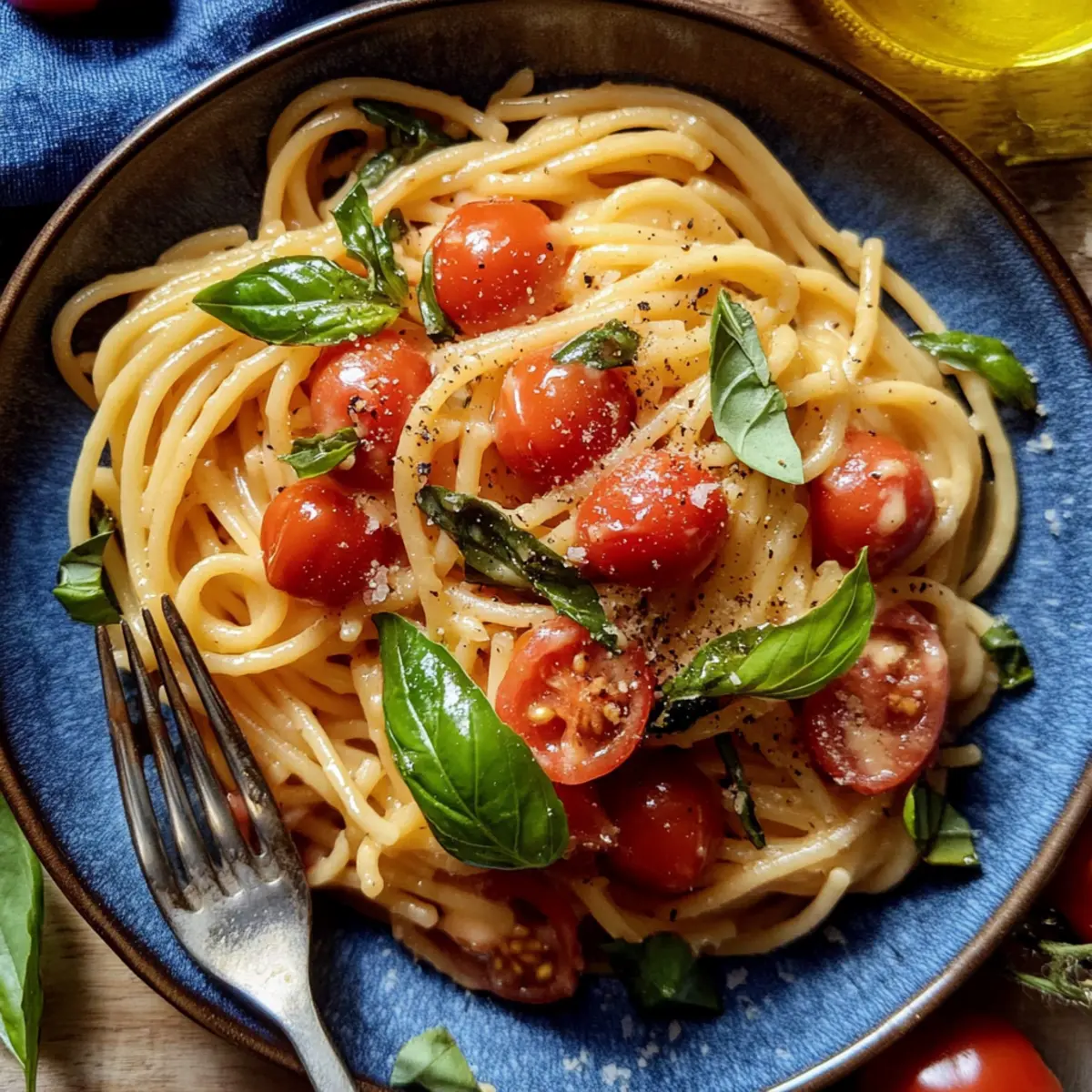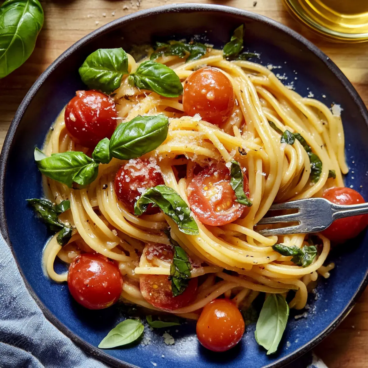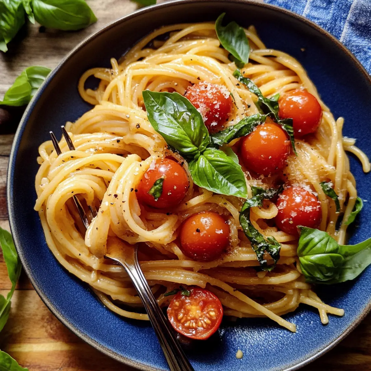A burst of summer is just a forkful away with my Quick & Easy Basil Pasta with Cherry Tomatoes. The first time I made this dish, the sweet aroma of blistering cherry tomatoes and fragrant basil filled my kitchen, transporting me straight to a sun-drenched Italian terrace. Perfectly suited for those busy weeknights, this light and refreshing meal comes together in just 15 minutes, making it a busy home chef’s dream. Plus, it’s versatile enough to allow for quick substitutions—whether you prefer zucchini noodles or a different pasta shape, you’ll create a satisfying dinner that feels gourmet without fuss. Are you ready to elevate your weeknight meals? Let’s dive into this delightful recipe! Why is this pasta dish a winner? Simplicity at Its Best: This recipe is super easy, coming together in just 15 minutes! No complicated techniques here—perfect for beginners or busy cooks. Bursting with Flavor: The combination of blistered cherry tomatoes, fresh basil, and aromatic garlic creates a taste sensation that will impress anyone at your dinner table. Versatility: Swap in any pasta shape or even zucchini noodles to suit your preference. This dish adapts to your pantry, making it a go-to for those “what do I have on hand?” nights. Crowd-Pleasing Appeal: Whether you’re hosting a summer gathering or enjoying a quiet dinner, this basil pasta is always a hit. Pair it with grilled chicken or a side salad to make it a complete meal. Healthy & Light: With fresh ingredients and just a touch of parmesan, this dish is a guilt-free indulgence, perfect for light summer evenings. Need more inspiration? Check out my Cajun Chicken Pasta for another delicious and easy option! Basil Pasta with Cherry Tomatoes Ingredients For the Pasta • Spaghetti – This classic pasta base gives you the perfect texture, but feel free to use any shape or even zucchini noodles for a lighter option. For the Sauce • Unsalted Butter – Adds a creamy richness to the sauce; substitute with olive oil for a lighter taste. • Olive Oil – Complements and enhances all the flavors; extra virgin olive oil provides an even bolder flavor. • Garlic – Infuses aromatic depth; using pressed garlic ensures optimal flavor release. • Cherry Tomatoes – Bursting with sweetness and acidity, they are the star of the show; you can use chopped larger tomatoes if needed. • Red Pepper Flakes – Just a pinch adds a nice warmth; adjust according to your spice preference. • Kosher Salt – Essential for enhancing the dish’s flavors; about 1/2 tablespoon is perfect for boiling pasta. • Freshly Cracked Black Pepper – Adds subtle warmth and depth to the dish. For the Finish • Parmesan Cheese – Brings creaminess and umami flavor; adjust the quantity to match your taste. • Fresh Basil – Provides a fresh, aromatic finish; add it at the end to maintain its bright flavor. Step‑by‑Step Instructions for Basil Pasta with Cherry Tomatoes Step 1: Prep Pasta Begin by bringing a large pot of salted water to a rolling boil over high heat. Use about 1/2 tablespoon of kosher salt to enhance the flavor of your pasta. Once boiling, add spaghetti or your chosen pasta shape, cooking it according to package instructions until al dente, typically around 8-10 minutes. Stir occasionally to prevent sticking. Step 2: Sauté Aromatics While the pasta cooks, heat a medium skillet over medium heat and add 1 tablespoon of unsalted butter along with 1 tablespoon of olive oil. Allow the butter to melt and foam before adding 2-3 cloves of minced garlic. Sauté the garlic for 1-2 minutes, stirring frequently, until it becomes fragrant and lightly golden, filling your kitchen with a delicious aroma. Step 3: Cook Tomatoes Next, add 2 cups of blistering cherry tomatoes to the skillet along with a pinch of red pepper flakes, kosher salt, and freshly cracked black pepper to taste. Cook the tomatoes for about 6-8 minutes, stirring occasionally, until they begin to burst and release their juices, creating a delicious sauce that will coat the Basil Pasta perfectly. Step 4: Boil Pasta Check your spaghetti as the tomatoes cook. Once it reaches al dente texture, reserve about 1/2 cup of the pasta cooking water, then drain the pasta in a colander. Be sure to have a heatproof bowl nearby to catch any drips, as the pasta water will be vital for thickening the sauce later. Step 5: Combine Ingredients Remove the skillet from heat, and immediately add the drained pasta to the skillet filled with the tomato mixture. Using tongs, gently toss the pasta with the tomatoes, allowing the hot pasta to absorb the flavors. Don’t forget to save a splash of pasta water for the next step to create the perfect Basil Pasta with Cherry Tomatoes. Step 6: Emulsify Sauce Now, add the reserved pasta water, about 1/2 cup, to the skillet along with 1/4 cup of freshly grated parmesan cheese and a handful of torn fresh basil leaves. Toss everything together until the pasta is evenly coated with the glossy sauce. The heat will help the cheese melt, creating a rich and creamy texture that enhances the dish. Step 7: Adjust Consistency Finally, check the consistency of the sauce. If it seems too dry, gradually add more of the reserved pasta water until desired creaminess is reached. Taste the dish and adjust the seasoning with additional salt and pepper if needed, ensuring your Basil Pasta with Cherry Tomatoes is bursting with flavor before serving. How to Store and Freeze Basil Pasta with Cherry Tomatoes Fridge: Store leftovers in an airtight container in the fridge for up to 3 days to maintain freshness and flavor. Freezer: For longer storage, freeze the Basil Pasta with Cherry Tomatoes in individual portions for up to 1 month. Use freezer-safe containers to prevent freezer burn. Reheating: Gently reheat on the stovetop over low heat with a splash of cooking water to restore creaminess. Alternatively, microwave in 30-second intervals until heated through. Wrapping: If freezing, wra