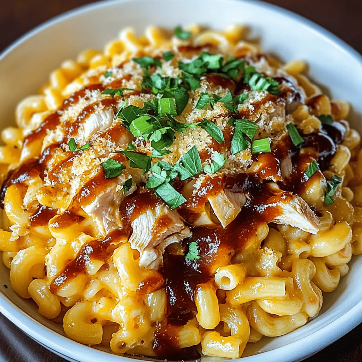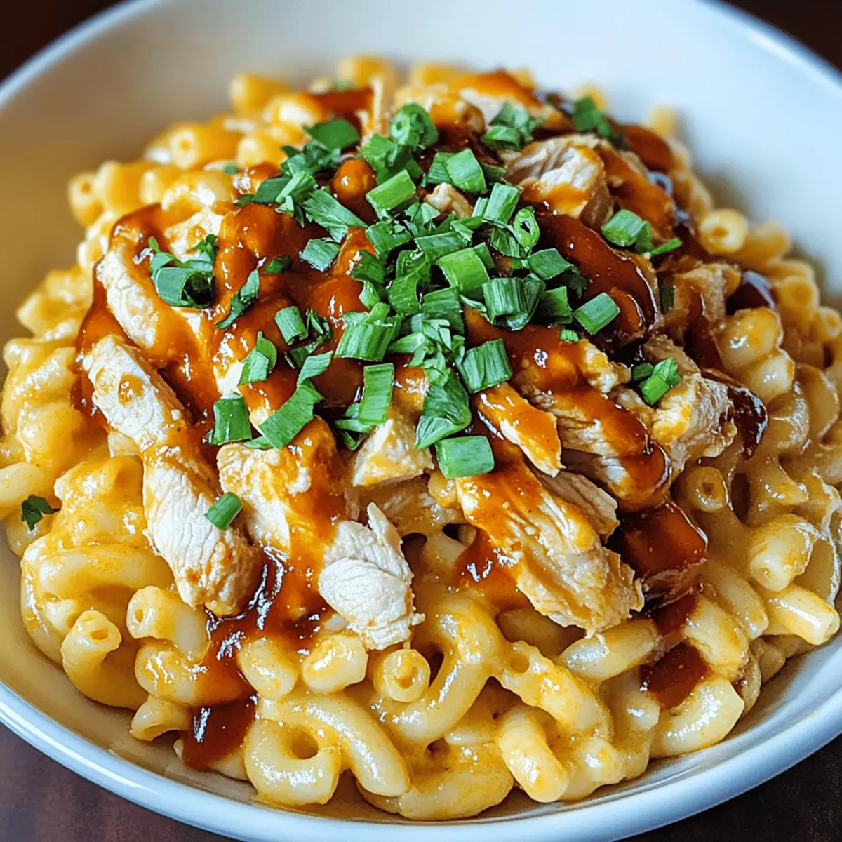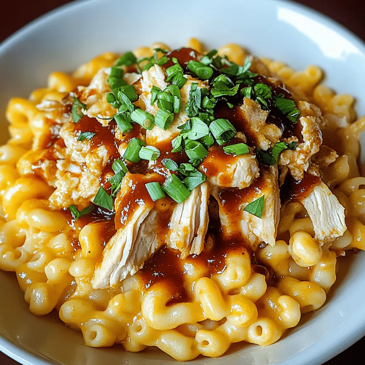 As I stirred the bubbling pot of creamy goodness, a memory rushed back—a backyard barbecue where laughter mingled with the scent of smoky meat. That’s the inspiration behind my BBQ Chicken Mac and Cheese, an easy recipe that transforms your traditional mac and cheese into a comforting masterpiece. This dish is not only perfect for cozy family dinners but also a fun twist for game nights, guaranteed to leave everyone asking for seconds. With tender, BBQ-sauced chicken combined with a rich, cheesy sauce enveloping al dente macaroni, it’s a delightful medley of flavors and textures. Intrigued? Let’s dive into this mouthwatering creation that’s sure to impress everyone at your table! Why is BBQ Chicken Mac and Cheese irresistible? Creamy Indulgence: This dish boasts a velvety cheese sauce that perfectly clings to the pasta, ensuring every bite is rich and satisfying. Heartfelt Comfort: It blends the smoky sweetness of BBQ chicken with an all-time favorite, macaroni and cheese—ideal for family gatherings or cozy nights at home. Easy to Make: With straightforward ingredients and simple steps, you’ll whip up this delight in no time, making it perfect for busy weekdays. Crowd-Pleaser: Whether served at a potluck or a casual dinner, this dish will surely earn rave reviews, keeping everyone coming back for more. Versatile Options: Feel free to customize by adding your favorite veggies or spices, like in my Garlic Butter Chicken recipe, for a personalized touch! BBQ Chicken Mac and Cheese Ingredients Unlock the flavors of comfort food with these simple yet essential ingredients! For the Pasta • Elbow Macaroni – The perfect shape for cradling that delicious cheese sauce. For the Cheese Sauce • Unsalted Butter – Essential for a rich roux that forms the foundation of your creamy sauce. • All-Purpose Flour – Thickens the sauce, ensuring it clings beautifully to every piece of pasta. • Milk – Adds creaminess and balances flavors; choose whole for a richer taste. • Shredded Cheddar Cheese – Provides sharpness and depth, making the sauce utterly irresistible. • Shredded Mozzarella Cheese – Offers a gooey stretch and creamy finish that complements the cheddar. • Garlic Powder – Enhances the savory notes of the sauce, giving it that comforting depth. • Onion Powder – Adds a sweet, savory flavor that pairs perfectly with the garlic. • Salt and Pepper – Key players in elevating the flavors, ensuring a perfectly seasoned dish. For the Chicken • Shredded Chicken Breast – Juicy protein that soaks up the BBQ sauce’s beautiful flavor. • BBQ Sauce – The star ingredient that marries the chicken and cheese, adding a tangy, smoky sweetness. For the Topping • Sliced Green Onions – Fresh garnish that adds a pop of flavor and color. • Chopped Fresh Parsley (optional) – Brightens the dish with a fresh herbal note. • Breadcrumbs (optional) – Sprinkle for a crunchy topping that contrasts beautifully with the creamy mac and cheese. Dive into this BBQ Chicken Mac and Cheese dish that’ll make your taste buds dance! Step‑by‑Step Instructions for BBQ Chicken Mac and Cheese Step 1: Preheat and Prepare Pasta Preheat your oven to 350°F (175°C) while you cook the elbow macaroni in a large pot of boiling salted water. Cook until al dente, usually about 7–8 minutes, stirring occasionally. Once done, drain the pasta, return it to the pot, and set aside, allowing it to cool slightly while you prepare the creamy sauce. Step 2: Make the Roux In a medium saucepan, melt 4 tablespoons of unsalted butter over medium heat until it’s foamy, about 2 minutes. Sprinkle in 1/4 cup of all-purpose flour, whisking continuously for about 1 minute to form a smooth roux. Ensure it doesn’t brown; it should remain pale, signaling a solid base for your BBQ Chicken Mac and Cheese. Step 3: Whisk in the Milk Gradually add 3 cups of milk to the roux, whisking constantly to prevent lumps. Continue stirring for about 4–5 minutes or until the mixture thickens and can coat the back of a spoon. This creamy consistency is crucial, providing the perfect sauce to envelop your macaroni later. Step 4: Incorporate the Cheeses Lower the heat to medium-low and slowly stir in 2 cups of shredded cheddar cheese and 1 cup of shredded mozzarella cheese. Continue stirring until the cheeses melt completely and create a smooth, velvety sauce, approximately 3–4 minutes. This cheese blend is what makes your BBQ Chicken Mac and Cheese irresistibly creamy and flavorful. Step 5: Season the Sauce Add 1 teaspoon of garlic powder, 1 teaspoon of onion powder, and season with salt and pepper to taste. Stir well to combine and let the flavors meld for an additional 1–2 minutes. Your cheese sauce should be rich and inviting, ready to embrace the macaroni and BBQ chicken. Step 6: Combine Pasta and Chicken Fold the cooked macaroni gently into the cheese sauce, ensuring each piece is covered with that glorious cheesy goodness. Next, add 2 cups of shredded BBQ chicken, previously tossed in your favorite barbecue sauce. Mix carefully to combine, ensuring the chicken is evenly distributed throughout the pasta. Step 7: Transfer to Baking Dish Grease a 9×13 inch baking dish with cooking spray or butter, then transfer the macaroni and cheese mixture into the dish. If you like, you can sprinkle breadcrumbs on top for added crunch. The contrasting texture will beautifully complement the creamy mac and cheese once baked. Step 8: Bake to Perfection Place the baking dish in the preheated oven and bake for 20–25 minutes. Look for a golden-brown top with bubbling cheese around the edges as a sign that your BBQ Chicken Mac and Cheese is ready to come out. This step enhances the flavors and adds a delightful crust. Step 9: Rest and Garnish Once out of the oven, let the dish rest for about 10 minutes. This resting time helps the cheese to set, preventing spills when you serve. Drizzle a bit of extra BBQ sauce on top fo