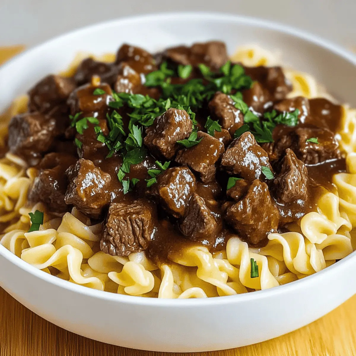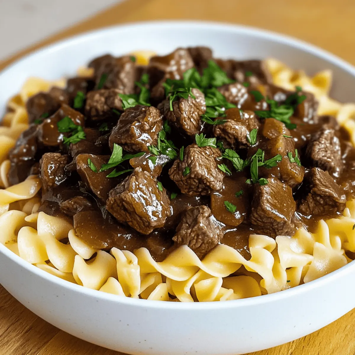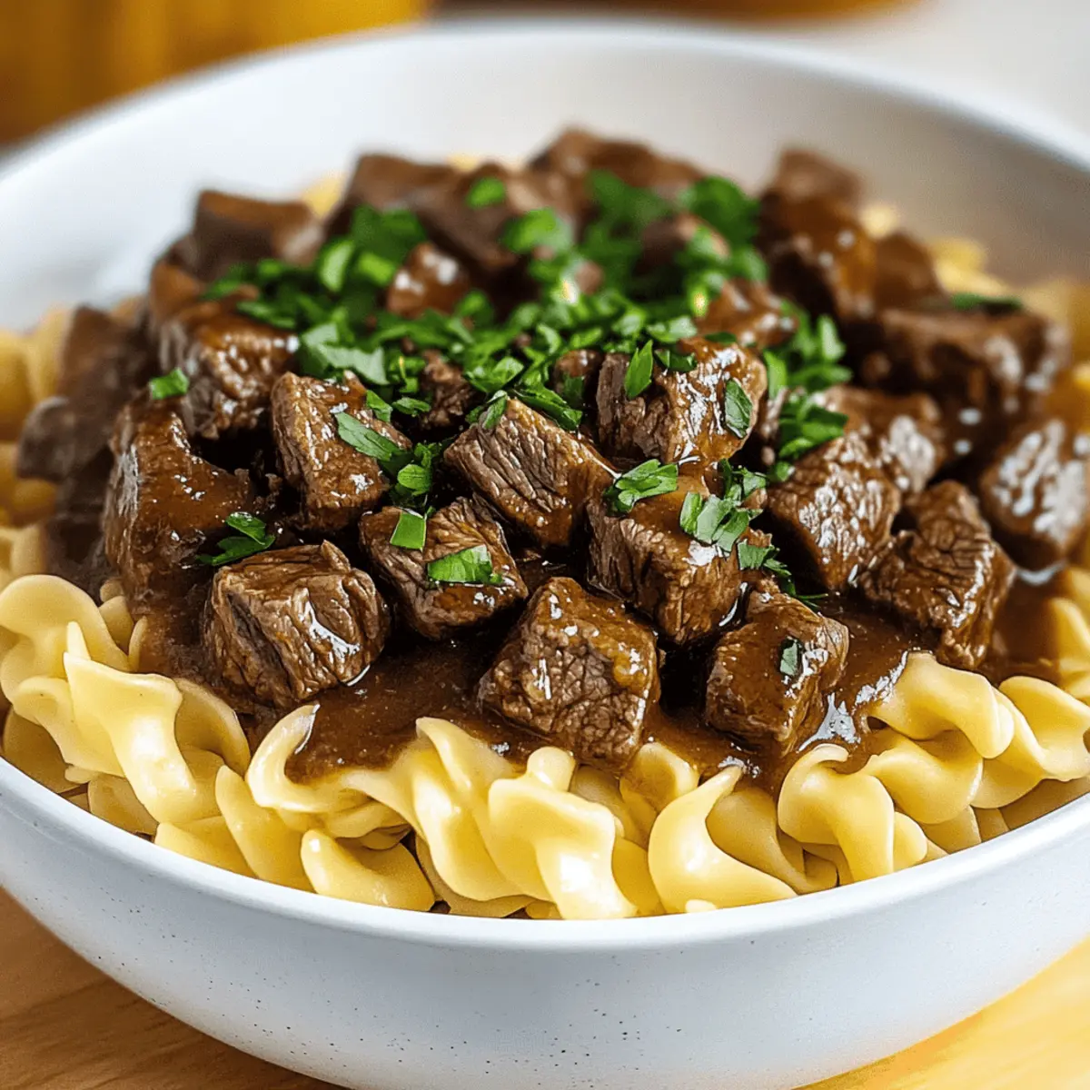 One chilly evening, as I rummaged through my kitchen, I stumbled upon some cubed beef and a forgotten bag of egg noodles. I thought, “Why not whip up a hearty dish?” Enter Beef Tips and Noodles, my go-to comfort food that not only warms the soul but also nourishes the body. This delightful recipe brings together melt-in-your-mouth beef showered in rich gravy, all atop buttery noodles, making it the perfect quick meal for busy families. With just under an hour of prep, it’s a stress-free solution for anyone tired of fast food. Plus, the versatile cooking methods – whether in a Crockpot, Instant Pot, or stovetop – cater to your busy lifestyle. Ready to dive into this savory experience? Let’s unleash your inner chef together! Why Choose Beef Tips and Noodles? Comforting and savory, this dish brings a sense of warmth to any table. Versatile cooking methods mean you can choose from a Crockpot, Instant Pot, or stovetop to suit your schedule. Quick prep time guarantees satisfaction in under an hour, making it perfect for busy weeknights. Family-friendly, it’s a meal that delights both kids and adults alike, easily appealing to every palate. Plus, for those searching for new meal ideas, try pairing it with a side salad or perhaps a cozy bowl of Brussels Sprouts Pie for an extra touch of freshness. Enjoy a taste of comfort that transforms your cooking routine! Beef Tips and Noodles Ingredients For the Beef and Gravy Butter – Adds richness and flavor; olive oil is a lighter substitute. Onion – Provides depth and sweetness; shallots can be used for a milder flavor. Cubed Beef – The main protein source; chuck roast or sirloin are excellent alternatives. Beef Broth – Adds moisture and enhances flavor; switch to chicken or vegetable broth for a lighter taste. Bay Leaves – Infuses subtle herbal aroma; feel free to omit if you don’t have any on hand. Thyme – Contributes earthiness; when using dried thyme, stick to 1/3 of the amount for the same flavor. Salt & Pepper – Essential for seasoning; adjust according to taste and dietary needs. Cornstarch – Used for thickening the gravy; arrowroot or flour can be good substitutes. For the Noodles Egg Noodles – Provide a comforting base; gluten-free noodles work well for a gluten-free option. Fresh Parsley (optional) – Adds a pop of color and freshness for garnishing. This collection of ingredients is designed to help you create a comforting bowl of Beef Tips and Noodles that warms both heart and home. Enjoy cooking! Step‑by‑Step Instructions for Hearty Beef Tips and Noodles Step 1: Sauté Onions Begin by heating a large skillet over medium-high heat. Add 2 tablespoons of butter and allow it to melt, then toss in 1 diced onion. Sauté the onions for about 3-4 minutes until they become translucent and fragrant, stirring occasionally to prevent burning. This step sets a flavorful foundation for your Beef Tips and Noodles. Step 2: Brown Beef Next, increase the heat slightly and add 1 pound of cubed beef to the skillet. Sear the meat for about 8-10 minutes, turning frequently until all sides are nicely browned. This step enhances the flavor of your dish, ensuring the beef tips are juicy and delicious as they meld with the gravy. Step 3: Add Broth and Seasonings Pour in 2 cups of beef broth along with 2 bay leaves, 1 teaspoon of thyme, and season with salt and pepper to taste. Stir everything together and bring the mixture to a boil. Once boiling, reduce the heat to low, letting the flavors combine as the beef cooks and absorbs the savory broth—a crucial part of making Beef Tips and Noodles. Step 4: Simmer Cover the skillet with a lid and allow the beef to simmer gently on low heat for about 20-30 minutes. You’ll know the beef is done when it’s fork-tender and easily shreds apart. Stir occasionally, adding more broth if needed to keep the mixture moist and prevent any sticking to the bottom of the skillet. Step 5: Thicken Gravy While the beef is simmering, mix 2 tablespoons of cornstarch with 2 tablespoons of cold water to create a slurry. Once the beef is tender, slowly stir the slurry into the skillet. Cook for an additional 5-10 minutes, allowing the gravy to thicken to a luscious consistency that will coat your Beef Tips beautifully. Step 6: Cook Noodles In a separate pot, bring salted water to a boil. Add 8 ounces of egg noodles and cook according to the package instructions, usually about 6-8 minutes, until al dente. Drain the noodles and, if desired, toss them with a small amount of butter for extra flavor. This complements the hearty beef and gravy perfectly. Step 7: Combine and Serve To bring your dish together, spoon the beef and rich gravy mixture generously over the cooked egg noodles. Garnish with freshly chopped parsley for a pop of color and a hint of freshness. Serve immediately and enjoy the comforting flavors of your homemade Beef Tips and Noodles with loved ones! Make Ahead Options These Beef Tips and Noodles are perfect for meal prep enthusiasts! You can sauté the onions and brown the beef up to 24 hours in advance, then refrigerate them in an airtight container to maintain freshness. Additionally, prepare the gravy component by simmering the broth and seasonings beforehand, storing it separately for optimal flavor retention. When you’re ready to enjoy this comforting dish, simply reheat the beef and gravy mixture on the stovetop until warmed through, which helps keep the beef just as tender. Cook the egg noodles fresh for the best texture before serving, and you’ve got a hearty meal ready in no time—ideal for busy weeknights! Beef Tips and Noodles Substitutions Feel free to get creative with this recipe and make it your own—there are plenty of delicious twists to explore! Gluten-Free Noodles: Swap traditional egg noodles for gluten-free noodles to cater to dietary needs without sacrificing taste. Vegetable Medley: Add chopped carrots and peas for a burst of color and nutrition, enhancing the 
