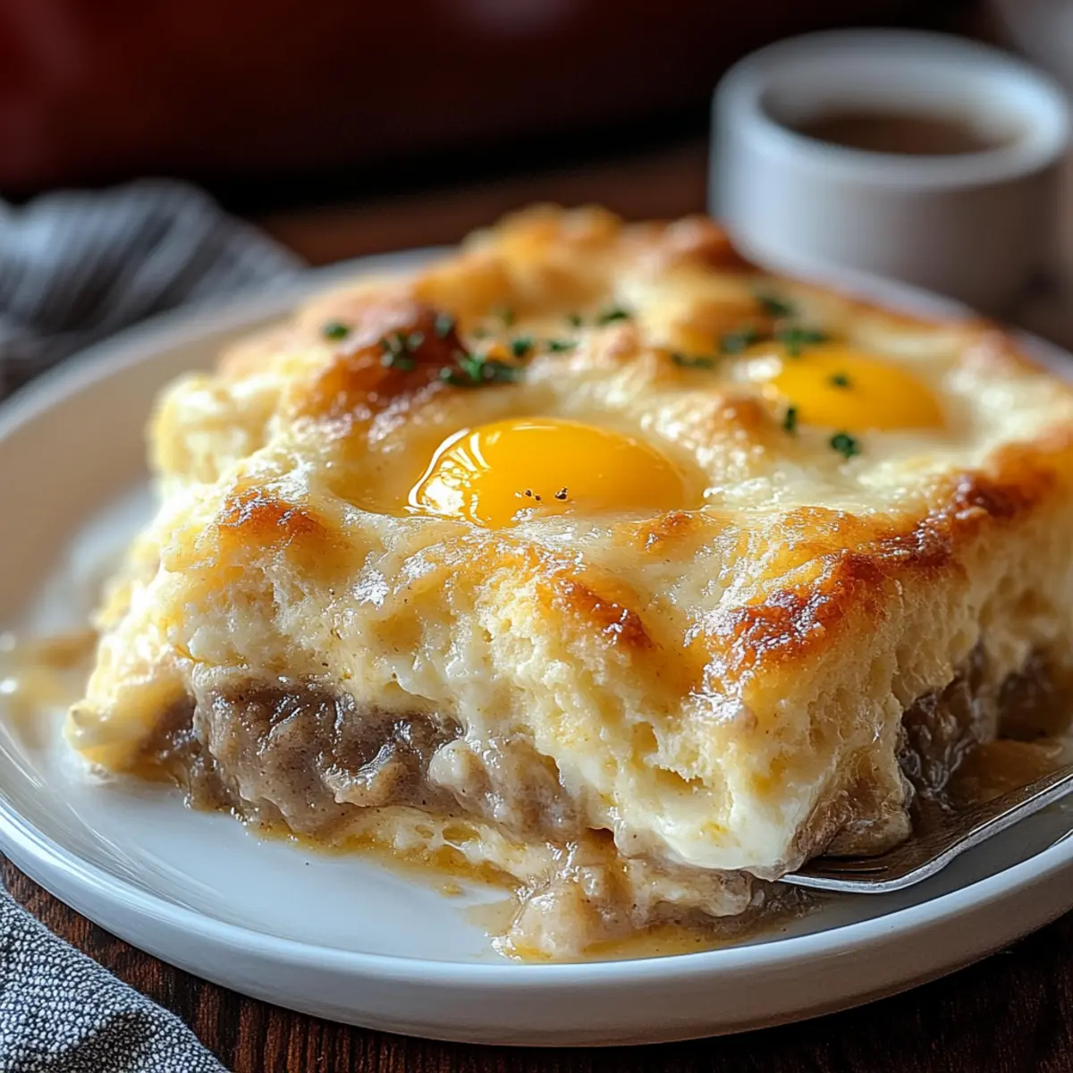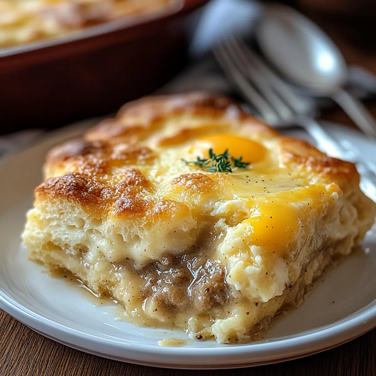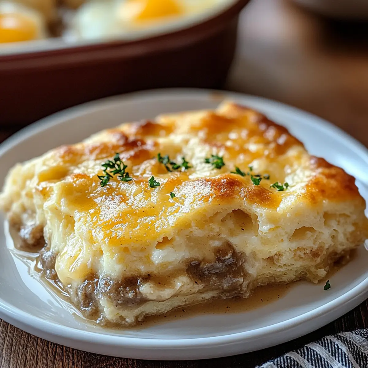 The scent of sizzling sausage fills the air, whisking me back to sun-drenched mornings in the South. There’s something utterly comforting about a hearty breakfast, especially one that brings family and friends together—like this Biscuits and Gravy Breakfast Casserole. With its flaky buttermilk biscuits nestled beneath layers of savory sausage, creamy gravy, and fluffy eggs, this dish turns an ordinary morning into a delightful feast. Not only is it a crowd-pleaser perfect for brunch gatherings or those special holiday breakfasts, but it’s also a make-ahead wonder, saving you precious time during busy mornings. Are you ready to elevate your breakfast game and create a dish that everyone will crave? Let’s dive into this Southern-style delight! Why is This Casserole a Must-Try? Comforting Flavors: Each bite of this Biscuits and Gravy Breakfast Casserole offers a warm embrace that reminds you of home-cooked meals and cherished family moments. Effortless Preparation: With just a few basic ingredients and minimal cooking steps, you can whip up this delightful dish in no time—perfect for busy mornings or lazy weekends. Customizable Goodness: Want to spice it up? Add fresh herbs or swap in your favorite cheese for a unique twist. Crowd-Pleaser: Whether it’s for a brunch gathering, holiday feast, or a simple family breakfast, this casserole is sure to impress everyone at the table. Plus, if you’re exploring other delicious options, don’t miss out on our Cheese Croissant Breakfast or Hashbrown Breakfast Casserole. Biscuits and Gravy Breakfast Casserole Ingredients For the Casserole Refrigerated Buttermilk Biscuits – 1 (16 oz) can (8-count) forms the flaky base that makes this dish so comforting. Breakfast Sausage (Pork or Turkey) – 1 lb adds a savory, hearty flavor; feel free to substitute with spicy sausage for an extra kick. Large Eggs – 6 eggs contribute fluffiness and bind all the delicious layers together. For the Gravy All-Purpose Flour – ¼ cup thickens the gravy and adds a wonderful texture to each bite. Whole Milk – 2 ½ cups needed for the gravy and an additional ½ cup for the egg mixture; low-fat milk could be a lighter option here. For Extra Flavor Shredded Cheddar Cheese (optional) – 1 cup adds richness and enhances flavor; substitute with pepper jack for a spicy twist if desired. Salt and Pepper – A must! Use ½ teaspoon salt and ¼ teaspoon black pepper to round out the flavors perfectly. Each ingredient works in harmony to create the ultimate Biscuits and Gravy Breakfast Casserole, making every bite a comforting reminder of Southern breakfast traditions. Step‑by‑Step Instructions for Biscuits and Gravy Breakfast Casserole Step 1: Preheat Oven Begin by preheating your oven to 350°F (175°C). While the oven heats, take a 9×13-inch baking dish and spray it generously with nonstick cooking spray to ensure easy removal of the casserole after baking. Step 2: Cook the Sausage In a large skillet over medium heat, add the 1 pound of breakfast sausage, breaking it up with a spatula as it cooks. Stir occasionally, cooking until the sausage is browned and cooked through, about 8-10 minutes. Keep that delicious fat in the pan—it’s essential for the gravy! Step 3: Make the Gravy With the sausage still in the skillet, sprinkle ¼ cup of all-purpose flour evenly over the meat. Stir well to incorporate for about 1-2 minutes until slightly golden. Gradually whisk in 2 ½ cups of whole milk, cooking over medium heat for 5-7 minutes until thickened. Season with salt and pepper to taste, and then remove from heat. Step 4: Cut the Biscuits Take your refrigerated buttermilk biscuits and remove them from the can. Carefully quarter each biscuit and layer the pieces evenly in the bottom of the prepared baking dish, ensuring they cover the entire surface. Step 5: Assemble Casserole Pour the prepared sausage gravy over the biscuit layer, making sure to distribute it evenly. In a separate bowl, whisk together 6 large eggs, ½ cup of milk, and a bit more salt and pepper. Pour this egg mixture over the entire casserole, allowing it to seep through the biscuits and gravy. Step 6: Bake Place the dish in the preheated oven and bake uncovered for 35-40 minutes. You’ll know it’s ready when the eggs are set and the top has transformed into a lovely golden-brown color that looks irresistible. Step 7: Cool and Serve Once baked, remove the casserole from the oven and let it rest for 5-10 minutes. This will make slicing easier and allow the flavors to settle, making your Biscuits and Gravy Breakfast Casserole even more delicious as you serve it warm! Storage Tips for Biscuits and Gravy Breakfast Casserole Fridge: Store leftovers in an airtight container for up to 4 days. Make sure to let it cool completely before refrigerating to maintain texture. Freezer: Freeze individual portions wrapped tightly in plastic wrap and foil for up to 3 months. Thaw overnight in the fridge before reheating. Reheating: To reheat, place the casserole in a preheated oven at 325°F (163°C) until warmed through, about 20-25 minutes. For best results, add a splash of milk to keep it moist. Make-Ahead: You can assemble your Biscuits and Gravy Breakfast Casserole a day ahead; just cover tightly with foil and refrigerate before baking in the morning. Expert Tips for Biscuits and Gravy Breakfast Casserole Avoid Overbaking: Check your casserole at the 35-minute mark to ensure a soft, fluffy texture. Overbaking can lead to a dry dish. Veggie Boost: Enhance nutrition by adding sautéed vegetables like bell peppers or onions. Just layer them with the biscuits for extra flavor! Gravy Choices: While homemade gravy is tasty, using canned sausage gravy can save time. Just ensure you season it well! Make-Ahead Wonder: Prepare the casserole the night before, cover it tightly with foil, and refrigerate. Bake it fresh in the morning for effortless enjoyment. Cheese Options: Experiment with different cheeses like pepp