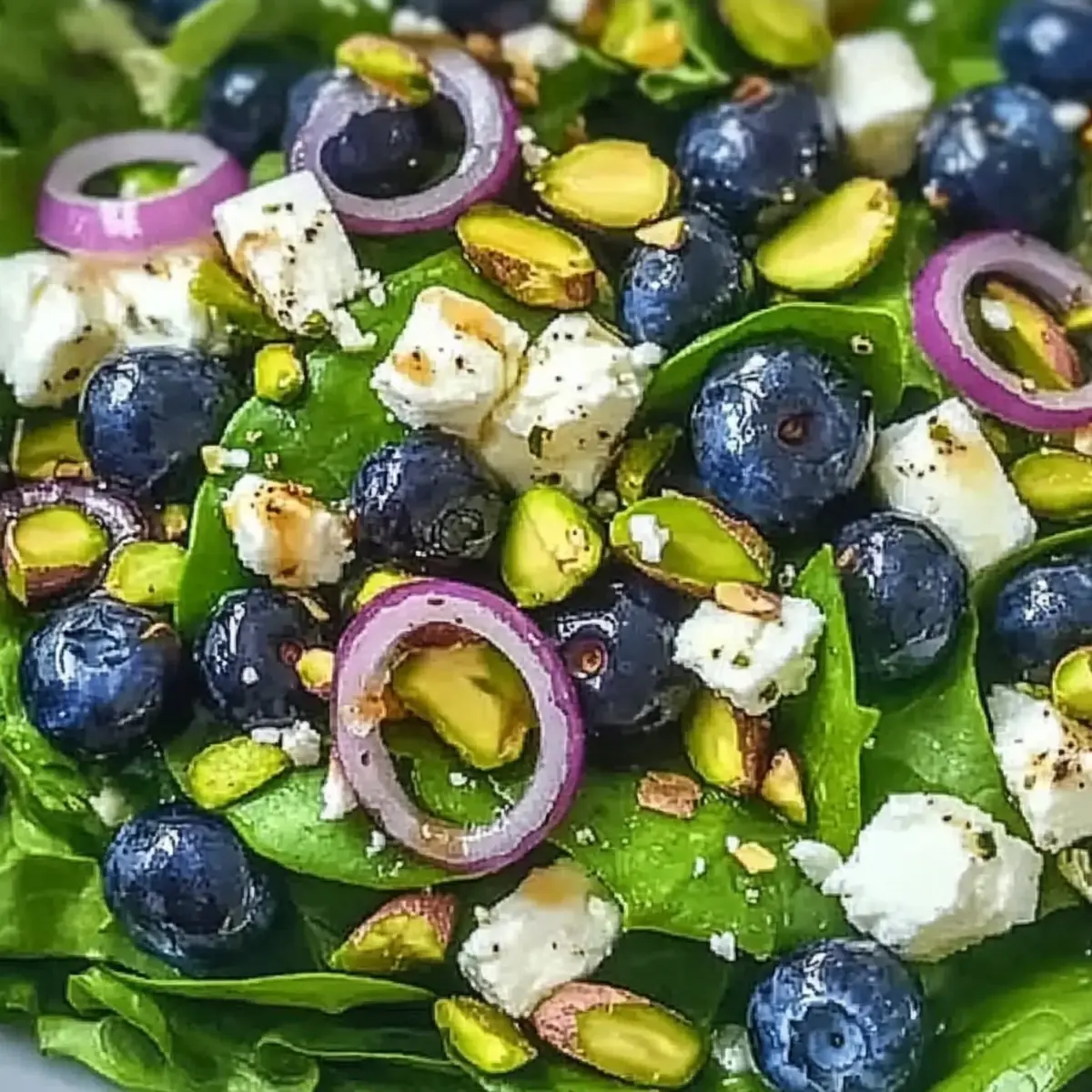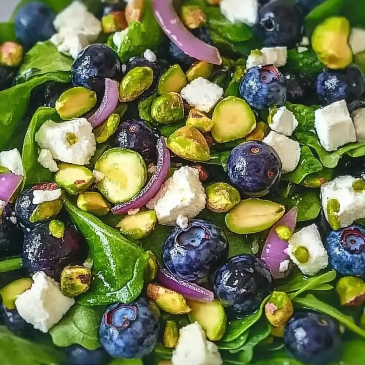 The first day of spring greeted me with a delightful surprise—my garden bursting with vibrant leaves and the scent of fresh blooms. It’s moments like these that inspire a craving for light, refreshing meals, and nothing captures that seasonal spirit quite like a Blueberry Pistachio Spring Salad. This salad is a lesson in simplicity and freshness, showcasing juicy blueberries, crunchy pistachios, and the creamy delight of feta, all drizzled with a honey-balsamic vinaigrette. Not only is it a breeze to prepare, making it a perfect choice for busy weeknights, but it’s also an incredibly nutritious dish that impresses at any gathering. Who wouldn’t love to indulge in a wholesome salad that feels like a sunny picnic on a plate? Ready to take your spring meals to the next level? Let’s dive in! Why Is This Salad So Refreshing? Vibrant Ingredients: This Blueberry Pistachio Spring Salad showcases seasonal ingredients that are not just colorful but also bursting with flavor. Quick Prep: With minimal preparation, you can whip this up in no time, perfect for those busy weeknights or last-minute gatherings. Nutritious Delight: Packed with vitamins and healthy fats, this salad aligns with a healthy lifestyle—refreshing without sacrificing taste. Endless Versatility: Feel free to mix in other seasonal fruits or grains, like quinoa, for added heartiness. Impressive Presentation: Its vibrant colors and textures will impress guests, making it a standout dish at any spring gathering or as a light lunch topped with grilled chicken. Blueberry Pistachio Spring Salad Ingredients For the Salad • Mixed Salad Greens – A fresh and crisp base that provides a light canvas for other ingredients; use a mix for varied texture. • Fresh Blueberries – These bright, juicy gems enhance sweetness; opt for ripe, firm berries for the best flavor. • Shelled Pistachios – They add a delightful crunch and texture; roughly chop them for a more robust bite or swap with almonds. • Crumbled Feta Cheese – Infuses the salad with savory depth and creaminess; goat cheese is a tangy alternative you might enjoy. • Red Onion (thinly sliced) – Offers mild sharpness to balance sweetness; a milder onion variety can mitigate sharpness or use green onions instead. For the Dressing • Extra Virgin Olive Oil – The base for the dressing that enriches flavors; using a high-quality oil elevates the overall taste. • Honey – Serves as a sweetener for the dressing, balancing the acidity; adjust the quantity based on your desired sweetness. • Balsamic Vinegar – Adds tangy depth to the dressing; if you prefer a different flavor profile, you can substitute it with apple cider vinegar. • Dijon Mustard – Acts as an emulsifier for a smooth consistency in the dressing; omitting it will change the texture but not significantly affect the flavor. • Salt – Enhances all flavors; be sure to adjust to taste, especially since feta can be salty. • Black Pepper – Adds a hint of heat; freshly ground pepper is recommended for a brighter flavor. This Blueberry Pistachio Spring Salad is a delightful blend of vibrant ingredients that are sure to bring a taste of spring to your table! Step‑by‑Step Instructions for Blueberry Pistachio Spring Salad Step 1: Prep Greens Begin by washing and drying the mixed salad greens to ensure they are crisp and clean. Rinse them under cold water in a colander and gently pat them dry with a clean kitchen towel or paper towels. Once the greens are dry, place them in a large salad bowl, creating a fresh base for your Blueberry Pistachio Spring Salad. Step 2: Prep Blueberries Rinse the fresh blueberries thoroughly under cold water, allowing any dirt or debris to wash away. After rinsing, gently remove any stems and set the berries aside in a colander to drain. The vibrant, juicy blueberries will add a burst of sweetness to your salad, so make sure they are plump and firm for the best flavor. Step 3: Chop Nuts Take the shelled pistachios and roughly chop them to enhance their crunchiness. Use a sharp knife and cutting board to create bite-sized pieces, releasing their nutty aroma. Sprinkle the chopped pistachios generously over the mixed salad greens in the bowl, adding both texture and a delightful flavor contrast to the Blueberry Pistachio Spring Salad. Step 4: Crumble Feta Next, grab your crumbled feta cheese and sprinkle it evenly over the top of the salad. Use your fingers to break any large chunks into smaller pieces, allowing the creamy cheese to meld with the vibrant ingredients. The feta adds a savory depth to your Blueberry Pistachio Spring Salad, enhancing its flavor profile wonderfully. Step 5: Slice Onions Thinly slice the red onion using a sharp chef’s knife, aiming for delicate slices that provide a subtle bite. As you cut, try to keep the slices uniform for an appealing presentation. Add the thinly sliced red onion to the salad bowl, infusing the mixture with a mild sharpness that beautifully balances the sweetness of the blueberries. Step 6: Mix Dressing In a small mixing bowl, whisk together the extra virgin olive oil, honey, balsamic vinegar, Dijon mustard, salt, and black pepper. Combine these ingredients until fully emulsified, creating a smooth and flavorful dressing. This honey-balsamic vinaigrette will bring the flavors of your Blueberry Pistachio Spring Salad together beautifully, so taste and adjust the seasoning if needed. Step 7: Combine & Serve Drizzle the prepared dressing over the salad and use tongs to gently toss the ingredients together. Aim to coat the greens, berries, and nuts evenly without bruising the delicate blueberries. You can serve the salad immediately for the freshest taste or allow it to chill in the fridge for a few minutes before serving, letting the flavors meld for an even more delightful Blueberry Pistachio Spring Salad. Blueberry Pistachio Spring Salad Variations Feel free to play with this recipe and tailor it to suit your tastes, tur