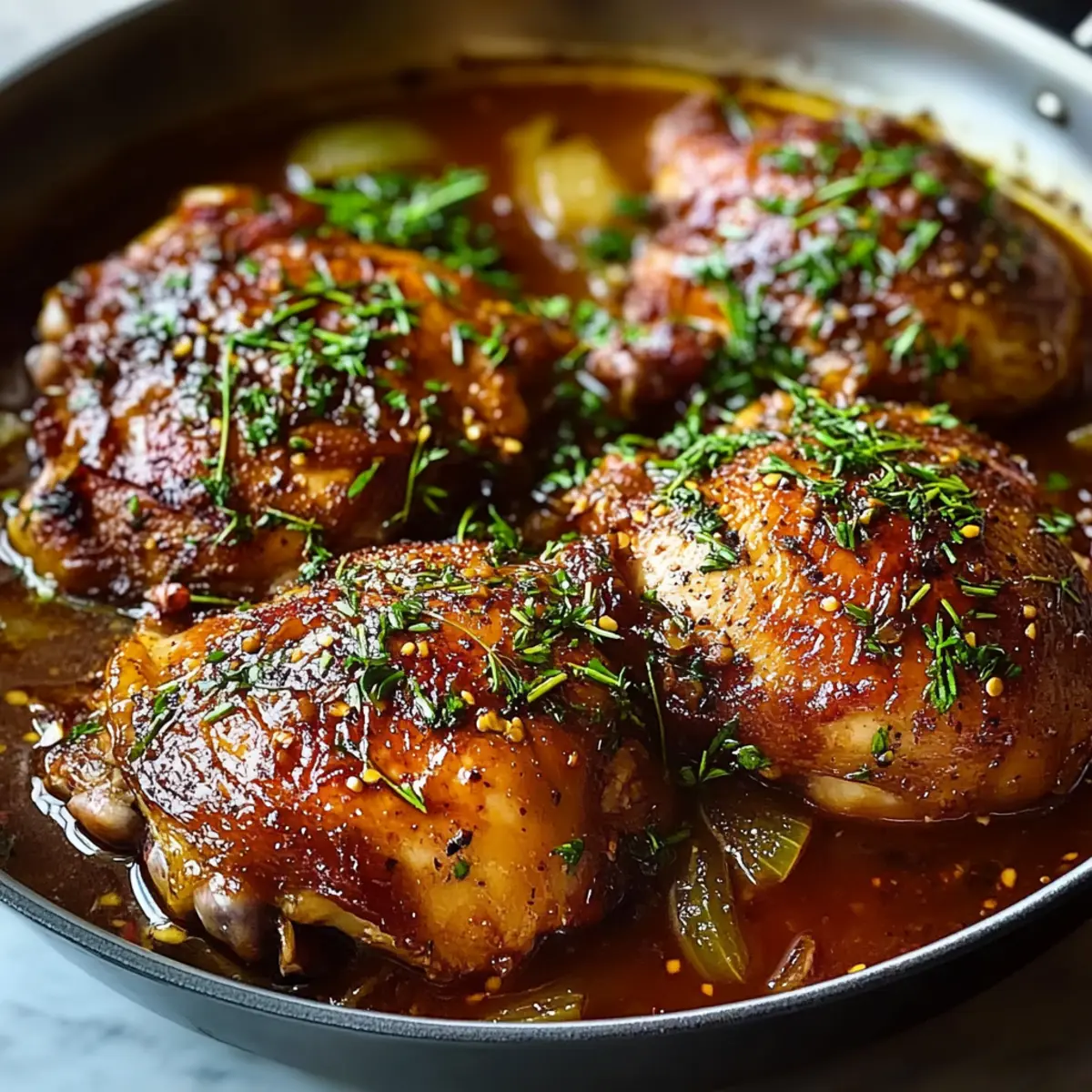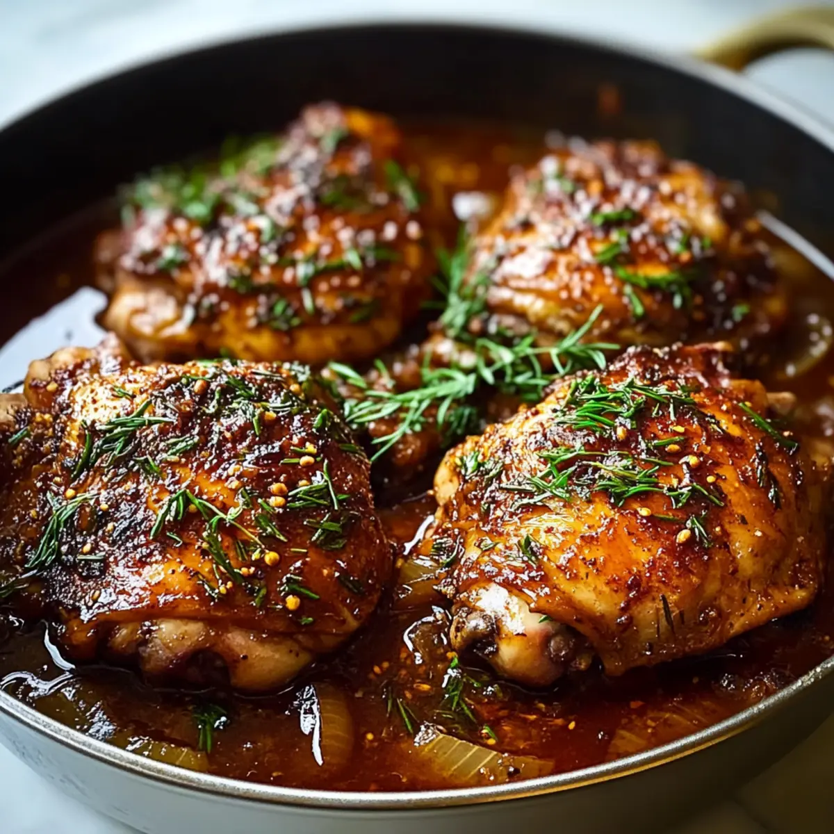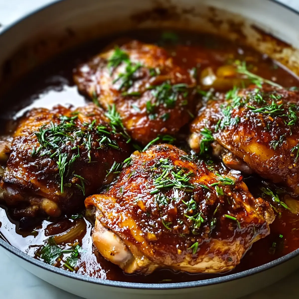 As the aroma of slow-braising chicken fills my kitchen, I’m instantly transported back to cherished family gatherings where hearty meals brought us all together. This Braised Catalina Chicken is more than just comfort food; it’s a celebration of sweet and savory flavors that will warm your heart and satisfy your cravings. With tender chicken thighs beautifully cooked in a rich, homemade Catalina-style sauce, this dish is a true crowd-pleaser. Plus, it’s simple enough for a weeknight dinner yet impressive enough for casual gatherings—definitely a win-win! Whether you’re looking for a cozy meal or hunting for a fun twist on a classic, this recipe promises to delight every palate at your table. Curious about how to elevate your dinner routine with this cozy dish? Let’s dive in! Why Choose Braised Catalina Chicken? Comforting, hearty meal: This Braised Catalina Chicken is the ultimate cozy dinner, perfect for those chilly evenings when you crave something warm and delicious. Flavorful homemade sauce: The rich, homemade Catalina-style sauce provides a beautiful balance of sweet and savory notes that will tantalize your taste buds. Effortless preparation: With minimal ingredients and straightforward instructions, this recipe is perfect for home cooks of any skill level. Feel free to pair it with Garlic Butter Chicken and Potatoes Skillet for a sideshow! Versatile dining option: Ideal for family gatherings or cozy weeknight dinners, it’s a dish that appeals to everyone. Time-saving: The slow-braising method allows you to set it and forget it, giving you time to relax while your kitchen fills with inviting aromas. Braised Catalina Chicken Ingredients • Get ready to savor each bite! For the Chicken Chicken Thighs – The star of this dish, offering tender and juicy bites. You can substitute with boneless chicken thighs or breasts for quicker cooking. Olive Oil – Used for searing the chicken, enhancing richness; any neutral oil will work if you prefer. Salt & Pepper – Essential for seasoning, bringing out the chicken’s flavors; be sure to adjust according to your taste. For the Catalina-style Sauce Ketchup – The base of the sauce, adding sweetness; look for no-sugar versions for a healthier twist. Brown Sugar – Enhances the sweet notes of the sauce; use honey or maple syrup for a natural alternative. Apple Cider Vinegar – Introduces tanginess that balances the sweetness; substitute with red wine vinegar if necessary. Worcestershire Sauce – Adds a depth of flavor; you can omit it if you’re out, but the dish will lose some complexity. Cayenne Pepper – For a kick of spice; adjust to your preferred heat level for the perfect sauce. Optional Garnish Fresh Parsley – Adds a pop of color and freshness upon serving; try cilantro for a different flavor profile! Step‑by‑Step Instructions for Braised Catalina Chicken Step 1: Preheat the Oven Begin by preheating your oven to 350°F (175°C). This step is crucial for ensuring that your Braised Catalina Chicken cooks evenly and thoroughly. While the oven heats up, gather your ingredients and prep your work area to create a smooth cooking experience. Step 2: Prepare the Chicken Pat the chicken thighs dry with paper towels, ensuring they have a nice surface for searing. Season both sides generously with salt and pepper to enhance the overall flavor of the dish. This simple step will help the spices adhere to the chicken and encourage a delicious browning during cooking. Step 3: Sear the Chicken In a sturdy Dutch oven, heat 2 tablespoons of olive oil over medium heat until shimmering. Carefully place the chicken thighs skin-side down in the hot oil and sear for 4–5 minutes until the skin turns golden brown and crispy. Then, flip the pieces and sear the other side for an additional 2 minutes for a beautifully caramelized exterior. Step 4: Whisk the Sauce While the chicken is searing, whisk together the homemade Catalina sauce ingredients in a medium bowl until smooth. The combination of ketchup, brown sugar, apple cider vinegar, Worcestershire sauce, and cayenne will create a tantalizing balance of sweet and tangy flavors. Taste the sauce and adjust any seasonings based on your preference to achieve the perfect blend. Step 5: Combine Chicken and Sauce Once the chicken is properly seared, pour half of the Catalina sauce into the Dutch oven while ensuring the chicken remains nestled in the pot. Arrange the thighs skin-side up, then drizzle the remaining sauce over the top, allowing the rich flavors to envelop the chicken, ensuring every bite will be deliciously infused with flavor. Step 6: Bake the Chicken Cover the Dutch oven with a tight-fitting lid and transfer it to your preheated oven. Bake for 45 minutes, letting the chicken soak in the warm, savory influences of the sauce. After this time, remove the lid and allow it to bake uncovered for an additional 20–25 minutes. Watch as the sauce thickens and caramelizes, turning glossy and luscious. Step 7: Serve and Garnish When the Braised Catalina Chicken is fully cooked, remove it from the oven and let it rest for a few moments. Serve the chicken hot, drizzling the sticky sauce generously over each piece. If desired, garnish with freshly chopped parsley for a pop of color and added freshness, enhancing the dish’s visual appeal and flavor. Expert Tips for Braised Catalina Chicken Searing Tips: Ensure the chicken thighs are dried well before seasoning; this promotes better browning and crispiness for a delicious skin. Adjust Sweetness: Don’t hesitate to tweak the sauce ingredients! Taste as you go, adjusting the sweetness with brown sugar or vinegar to match your family’s preferences. Slow & Steady: The longer the chicken cooks, the more tender it becomes. Avoid opening the oven door too often to maintain consistent heat during the braising. Crispier Skin Option: For an extra layer of texture, broil the chicken for about 2–3 minutes after baking to achieve a beautiful