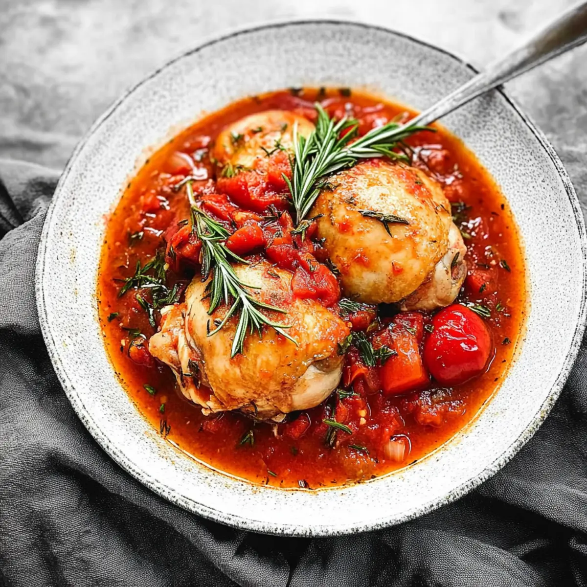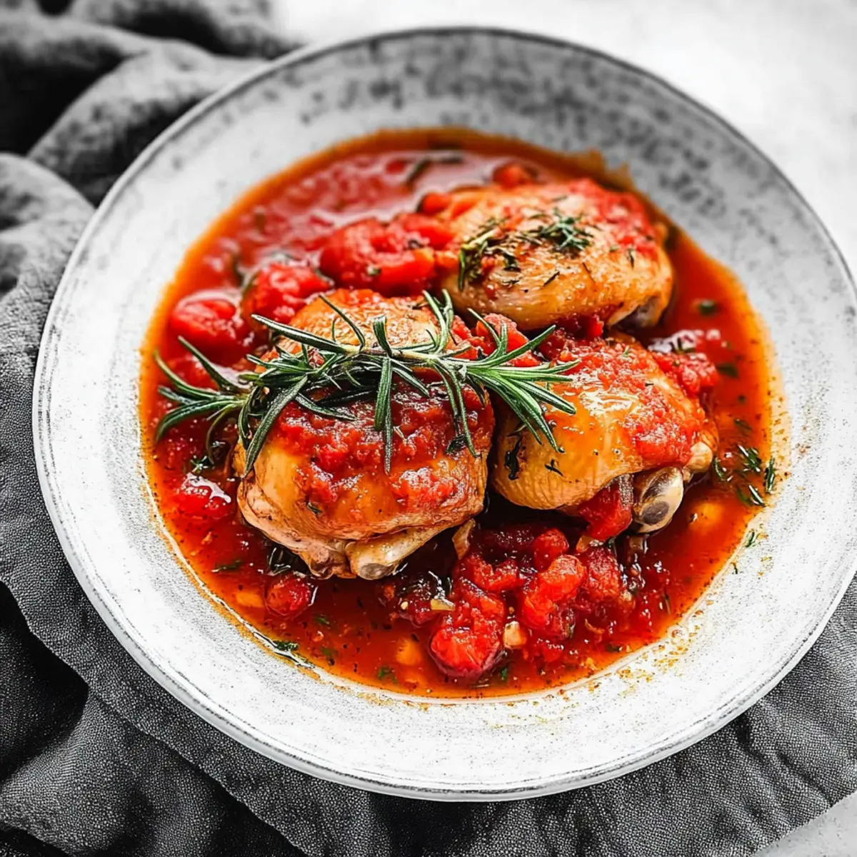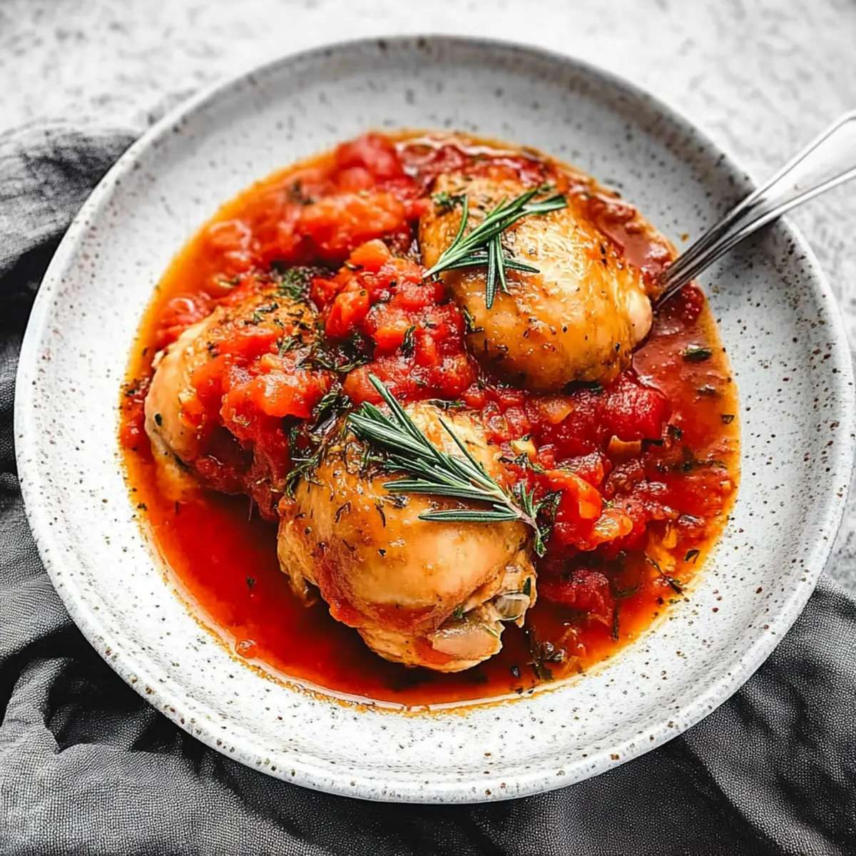 The kitchen fills with the intoxicating aroma of rosemary and simmering tomatoes, transporting me straight to a quaint Italian trattoria. As I dive into the art of making Pollo in Potacchio—braised chicken with tomatoes and rosemary—I can’t help but feel an overwhelming sense of warmth and comfort. This dish showcases juicy, fork-tender chicken thighs that melt in your mouth while being slow-cooked to perfection. The beauty of this recipe lies in its effortless preparation; whether you’re using a slow cooker or an Instant Pot, a sumptuous and heartwarming meal is just a few hours away. Beyond being a delightful crowd-pleaser, this classic Italian dish is also a budget-friendly gem that pairs beautifully with pasta, creamy polenta or even some crusty bread. So, are you ready to bring a taste of Italy to your home? Let’s dive into the heart of this cozy recipe together! Why is this dish a must-try? Simplicity at its Core: With just a handful of ingredients, this Pollo in Potacchio is incredibly easy to whip up, making it perfect for both novice and seasoned chefs alike. Rich, Savory Aroma: The combination of tomatoes and fresh rosemary creates a warm and inviting scent that will draw everyone to the dinner table. Versatile Pairing Options: Whether served over pasta, creamy polenta, or alongside a slice of crusty bread, this dish adapts to what your taste buds crave. Crowd-Pleasing Comfort: A guaranteed favorite, this recipe is perfect for family gatherings or intimate dinners, ensuring everyone leaves with a satisfied smile. Budget-Friendly Goodness: Enjoy the flavors of Italy without breaking the bank, and surprise your loved ones with a heartwarming meal that feels gourmet. For more delicious chicken recipes, check out Savory Chicken Piccata Meatballs or the inviting Chicken Waffle Casserole! Braised Chicken with Tomatoes Ingredients For the Chicken • Skinless Chicken Thighs – This main protein ensures tenderness and flavorful bites; bone-in thighs add even more taste. For the Aromatics • Kosher Salt and Fresh Black Pepper – Essential for layering flavor; adjust according to your preference. • Fresh Rosemary – Delivers an aromatic touch; use 3-4 sprigs for the most fragrant result. • Olive Oil – Perfect for sautéing; feel free to switch to avocado oil for a different flavor. • Yellow Onion – Adds sweet depth; finely chopped for even cooking. • Garlic Cloves – Infuses rich flavor; chop them finely and adjust the amount to suit your garlic cravings. • Celery and Carrot – Chopped to enhance the mirepoix base, adding sweetness and complexity. • Red Pepper Flakes – Optional for a hint of heat; adjust based on your spice tolerance. For the Sauce • Imported Crushed Tomatoes – The heart of your sauce; choose Tuttoroso for quality. • Dried Marjoram – Complements the other flavors; a light touch goes a long way. • Dry White Wine – Adds acidity and depth; omit for Whole30, or substitute with extra broth if preferred. • Low-Sodium Fat-Free Chicken Broth – Keeps it low-sodium; regular broth works if you’re not concerned. With these delightful ingredients, you’re just a few steps away from savoring your homemade Braised Chicken with Tomatoes and Rosemary! Step‑by‑Step Instructions for Braised Chicken with Tomatoes and Rosemary Step 1: Season Chicken Begin by lightly seasoning your skinless chicken thighs with kosher salt and freshly cracked black pepper, ensuring an even coating for maximum flavor. This foundational step primes the chicken for a delicious braise. Allow the seasoned chicken to rest while you prepare your cooking equipment. Step 2: Sear Chicken In a Dutch oven, heat 2 tablespoons of olive oil over medium-high heat until it shimmers. Carefully add the seasoned chicken thighs in batches, ensuring not to overcrowd the pot. Sear each side for about 6-7 minutes until golden brown, then remove the chicken and set it aside on a plate. Step 3: Sauté Aromatics In the same pot, reduce the heat to medium and add the finely chopped yellow onion and garlic cloves. Sauté for approximately 3 minutes, stirring frequently, until the onions turn golden and fragrant. Then, add the chopped celery and carrot, continuing to sauté for another 2-3 minutes to develop the mirepoix base. Step 4: Deglaze Pour in ½ cup of dry white wine (if using) and 1 cup of low-sodium chicken broth to deglaze the pot. Use a wooden spoon to scrape any browned bits from the bottom, which will enhance the flavor of your braised chicken. Bring the mixture to a gentle simmer, allowing the alcohol to evaporate for about 2 minutes. Step 5: Add Sauce Ingredients Stir in a can of imported crushed tomatoes, 1 teaspoon of dried marjoram, and additional salt and pepper to taste. Bring the pot back to a simmer and let the sauce cook for about 30 minutes, allowing the flavors to meld beautifully and thicken lightly. Step 6: Combine and Cook Return the browned chicken thighs to the pot and tuck 3-4 sprigs of fresh rosemary among them. Cover the Dutch oven partially with a lid and lower the heat to cook for another 25-30 minutes. Ensure the chicken is cooked through and tender, adding a splash of water if the sauce becomes too thick. Step 7: Final Adjustments As the braised chicken finishes cooking, taste the sauce and adjust the seasoning with extra salt, pepper, or red pepper flakes if you desire some heat. This last touch will elevate your Braised Chicken with Tomatoes and Rosemary, making it even more flavorful before serving. Storage Tips for Braised Chicken with Tomatoes and Rosemary Fridge: Store any leftover braised chicken in an airtight container for up to 3 days. Ensure it’s completely cooled before sealing to maintain freshness. Freezer: For longer storage, freeze the braised chicken in a freezer-safe container for up to 3 months. Allow it to cool down before freezing to prevent ice crystals from forming. Reheating: When ready to enjoy, thaw in the fridge overn