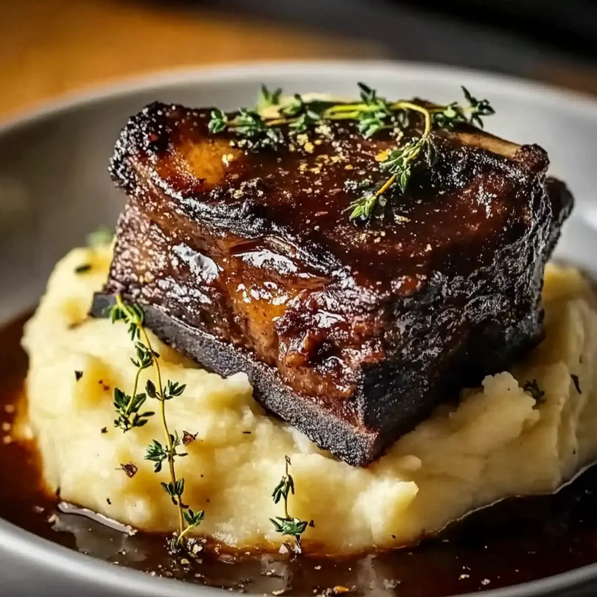 The scent of slow-cooked beef wafts through the air, instantly transporting me to cherished family gatherings. Today, let’s dive into the ultimate comfort food experience with my Braised Short Ribs with Mashed Potatoes. Each bite of these tender, flavor-infused ribs melts in your mouth, making them a surefire way to impress your loved ones. Not only is this classic recipe perfect for cozy weekends, but it’s also surprisingly simple, requiring minimal prep time for maximum deliciousness. The creamy, buttery mashed potatoes serve as the ideal accompaniment, soaking up the rich sauce and rounding out this heartwarming meal. Are you ready to elevate your dinner routine and bring a taste of home to your table? Why Are Braised Short Ribs So Irresistible? Tenderness Like No Other: Slow-cooked to perfection, these ribs practically fall off the bone, delivering incredible softness and flavor with each bite. Rich, Flavorful Sauce: The unique combination of red wine, beef broth, and aromatic herbs creates a deliciously rich sauce that elevates every aspect of the meal. Comfort Food Classic: Perfect for family gatherings or cozy nights in, this dish brings everyone together around the table for a heartwarming experience. Creamy Mashed Potatoes: Our buttery mashed potatoes perfectly soak up the savory sauce, making each forkful a delightful combination of flavors. Minimal Prep Time: You’ll be surprised at how quickly you can throw this dish together, allowing you more time to enjoy with family or explore other recipes like Garlic Butter Potatoes or Cooker Swamp Potatoes. Make-Ahead Magic: Prepare this one day in advance, and it only gets better when reheated, making it an ideal choice for busy weeknights or entertaining! Braised Short Ribs with Mashed Potatoes Ingredients For the Ribs Short Ribs – The star of the dish, providing rich flavor and tenderness from slow cooking. Note: Can also use chuck roast if short ribs are not available. Onions – Adds sweetness and depth to the braising liquid. Substitution: Shallots or leeks can be used for a milder flavor. Carrots – Contributes sweetness and earthy flavor. Substitution: Parsnips or sweet potatoes for a different taste profile. Garlic – Enhances the overall savory profile of the dish. Note: Fresh garlic is recommended for the best flavor. Beef Broth – Provides moisture and adds savory depth to the dish. Substitution: Homemade stock for an even richer flavor. Red Wine – Used for deglazing and adding acidity; enhances the flavor of the broth. Substitution: Beef broth or grape juice for a non-alcoholic version. Bay Leaves & Thyme – Herbs that infuse the braising liquid with aroma and flavor. Note: Fresh herbs are preferred, but dried herbs can be substituted. For the Mashed Potatoes Mashed Potatoes – Serve as a creamy base to absorb the juices from the ribs. Substitution: Yukon Gold or Russet potatoes; sweet potatoes for a twist. Butter – Makes the mashed potatoes rich and smooth. Use more or less depending on desired creaminess. Cream – Adds a luxurious texture to the mashed potatoes. Feel free to adjust for your preferred richness. Step‑by‑Step Instructions for Braised Short Ribs with Mashed Potatoes Step 1: Prep the Ribs Start by seasoning your short ribs generously with salt and pepper on all sides. This will enhance their flavor during the braising process. Let them sit for about 15 minutes to allow the seasoning to adhere better while you prep the other ingredients. Step 2: Sear the Ribs In a large, heavy pot or Dutch oven, heat a tablespoon of oil over medium-high heat. Once shimmering, carefully add the short ribs and sear them for about 4-5 minutes on each side until they turn a rich brown. This step is crucial for developing deep flavors in your Braised Short Ribs with Mashed Potatoes. Step 3: Sauté Vegetables Remove the seared ribs from the pot and set them aside. In the same pot, add chopped onions, sliced carrots, and minced garlic. Sauté these for about 5-7 minutes until the onions are tender and slightly caramelized, soaking up all the delicious residue left behind from the ribs. Step 4: Deglaze Pour in a cup of red wine, scraping the bottom of the pot with a wooden spoon to lift any browned bits. Allow the wine to simmer for about 3-4 minutes, reducing slightly. This process enhances the flavors, creating a robust base for your braising liquid. Step 5: Braise the Ribs Return the short ribs to the pot, nestling them among the sautéed vegetables. Add enough beef broth to cover the ribs halfway and toss in bay leaves and fresh thyme. Bring the mixture to a gentle simmer, cover, and let it braise on low heat for 2-3 hours, or until the ribs are fork-tender and flavorful. Step 6: Prepare Mashed Potatoes While the ribs are braising, peel and chop your potatoes into even chunks. Boil them in salted water for about 15-20 minutes until fork-tender. Drain the potatoes well, and return them to the pot to steam off excess moisture for a couple of minutes before mashing. Step 7: Mash and Season Add butter and cream to the drained potatoes, and mash them until smooth and creamy. Season to taste with salt and pepper. The creamy mashed potatoes will perfectly complement the rich flavor of the braised short ribs, soaking up the savory sauce beautifully. Step 8: Serve the Dish Once the ribs are tender and the sauce has thickened, serve them atop a generous mound of creamy mashed potatoes. Ladle some of the flavorful braising sauce over the dish and garnish with fresh herbs if desired. Enjoy the warmth and comfort of your Braised Short Ribs with Mashed Potatoes! Expert Tips for Braised Short Ribs Sear for Flavor: Always sear the ribs first to develop a rich, deep flavor that enhances the overall dish. Cook Low and Slow: If the ribs aren’t tender after 2-3 hours, don’t hesitate to braise longer. They should easily fall off the bone for the best Braised Short Ribs with Mashed Potatoes. Drain Potatoes Well: Fully drain you