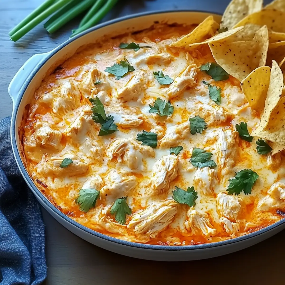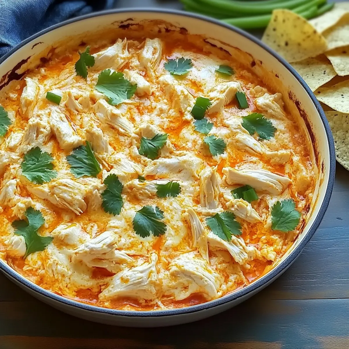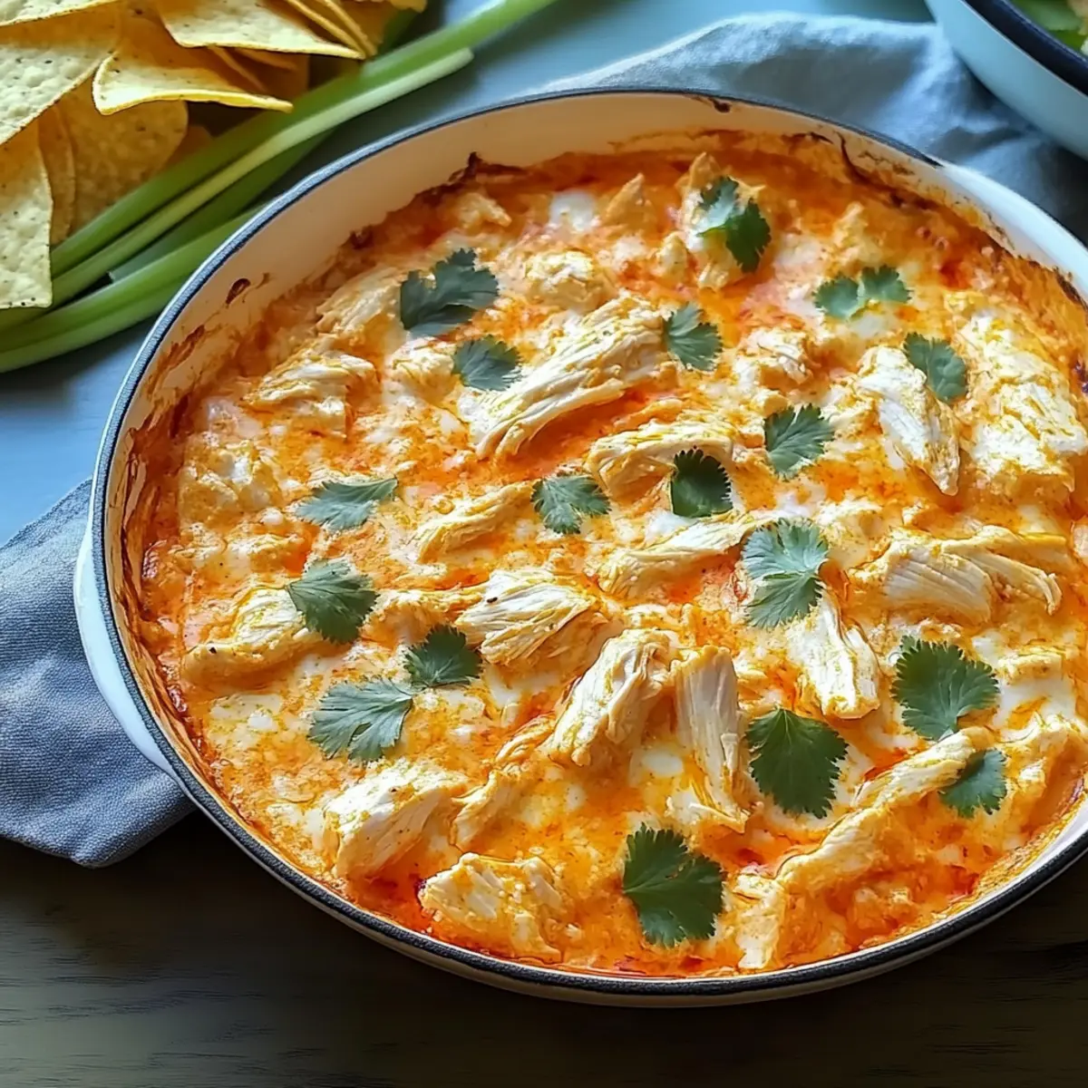 As I stood in my kitchen, I could already picture that familiar buzz bubbling around the game day table. The aroma of creamy Buffalo Chicken Dip wafting through the air is a sure-fire way to turn any gathering into a memorable feast. This dish combines the perfect harmony of spicy hot sauce and rich cheeses, transforming simple ingredients into an impressive appetizer that’s both customizable and easy to make ahead. Whether you’re serving up a mild version for the kids or cranking up the heat for the spice enthusiasts, this dip offers a delightful twist to fit every palate. With just 20 minutes of prep, you’ll have a crowd-pleaser ready to impress family and friends. Curious about how to make this comforting favorite? Let’s dive into the details! What Makes This Buffalo Chicken Dip Special? Irresistible Flavor: The combination of spicy hot sauce and creamy cheeses creates a bold taste that keeps everyone coming back for more. Customizable Creations: Whether you’re in the mood for a vegetarian delight or a spicy twist with jalapeños, this dip can adapt to suit your guests’ preferences. Quick & Easy: With only 20 minutes of prep, you can whip up this dish at a moment’s notice, making it perfect for unexpected guests or last-minute plans. Crowd-Pleasing Appeal: This recipe is a guaranteed hit at any gathering, elevating game nights, parties, or family dinners into a flavorful celebration. Make-Ahead Marvel: Save precious time by preparing it in advance; just pop it in the oven when it’s time to serve! For more great recipes like this one, check out my Garlic Butter Chicken and Orange Chicken Takeout options that will also impress your guests! Buffalo Chicken Dip Ingredients • The essential components for crafting this delicious dish await you! For the Dip Unsalted Butter – Adds richness and helps in browning; substitute with olive oil for a lighter option. Shredded Cooked Chicken – The main protein; rotisserie chicken is a convenient choice. Buffalo-Style Hot Sauce – Introduces spiciness and flavor; opt for a milder sauce if you prefer less heat. Fresh Lemon Juice – Brightens flavor and balances richness; lime juice can also work in a pinch. Sour Cream – Contributes a creamy, tangy note; Greek yogurt serves as a nutritious alternative. Cream Cheese – Essential for a smooth and creamy texture; remember to use it at room temperature for easier mixing. White Cheddar Cheese – Adds depth and gooeyness; freshly shredded cheese like gouda or pepper jack is also suitable. Blue Cheese – Enhances flavor with a delicious twist; crumbled feta can be a milder substitute. Chives – Provides a fresh onion flavor for garnish; green onions can stand in if needed. Dippers (e.g., celery sticks, carrot sticks, tortilla chips) – Perfect for serving and scooping up that irresistible Buffalo Chicken Dip. Step‑by‑Step Instructions for Buffalo Chicken Dip Step 1: Preheat the Oven Begin by preheating your oven to 375°F (190°C). This temperature is perfect for ensuring that your Buffalo Chicken Dip cooks evenly and bubbles nicely. While the oven heats up, gather your ingredients and a reliable ovenproof skillet or a cast-iron pan to make mixing a breeze. Step 2: Melt the Butter In your preheated skillet, melt approximately 2 tablespoons of unsalted butter over medium-high heat. Allow the butter to foam and turn a light golden color, which will add depth to the flavor of the Buffalo Chicken Dip. Be careful not to burn the butter, as this can lead to a bitter taste. Step 3: Combine Chicken and Hot Sauce Once your butter has melted, add in the shredded cooked chicken along with your preferred buffalo-style hot sauce. Stir the mixture well and let it simmer for 2-3 minutes until the sauce thickens and clings to the chicken. This step is essential for infusing the chicken with that signature spicy flavor of the dip. Step 4: Mix in Creamy Ingredients After the chicken has simmered, reduce the heat to medium and stir in fresh lemon juice, sour cream, and cream cheese. Keep mixing until the cream cheese is fully integrated and the mixture becomes smooth and creamy. This step creates the luscious texture that makes Buffalo Chicken Dip a crowd-pleaser. Step 5: Add Cheese and Bake Sprinkle a generous amount of shredded white cheddar cheese on top of your dip mixture. Transfer the skillet to the preheated oven and bake for about 10 minutes, until the dip is bubbly and the cheese is melted. Keep an eye on it to ensure it doesn’t overcook. Step 6: Broil for a Golden Finish For an appetizing golden crust, switch your oven to broil and broil the dip for an additional 1-2 minutes. Watch closely as the top can brown quickly. When it’s ready, you should see a beautifully bubbly, golden cheese layer that makes your Buffalo Chicken Dip simply irresistible. Step 7: Garnish and Serve Once broiled to perfection, remove the skillet from the oven and let it cool slightly. Garnish your Buffalo Chicken Dip with crumbled blue cheese and fresh chives for an extra flavor boost. Serve it warm with a selection of dippers like tortilla chips, celery sticks, or carrot sticks, and watch it disappear! Make Ahead Options These Buffalo Chicken Dip are perfect for busy home cooks looking to streamline meal prep! You can prepare the entire dip up to 24 hours in advance by following the recipe instructions until just before baking. Simply cover it tightly with plastic wrap and refrigerate; this not only saves time but allows the flavors to meld beautifully. On the day you plan to serve it, just pop it in the oven and bake at 375°F (190°C) for about 10 minutes, broiling it for an additional 1-2 minutes for that golden, bubbling finish. Reassuringly, it will taste just as delicious as if made fresh, ensuring your gatherings remain stress-free and flavorful! Storage Tips for Buffalo Chicken Dip Fridge: Store leftover Buffalo Chicken Dip in an airtight container for up to 3 days. Make sure it’s cooled completel