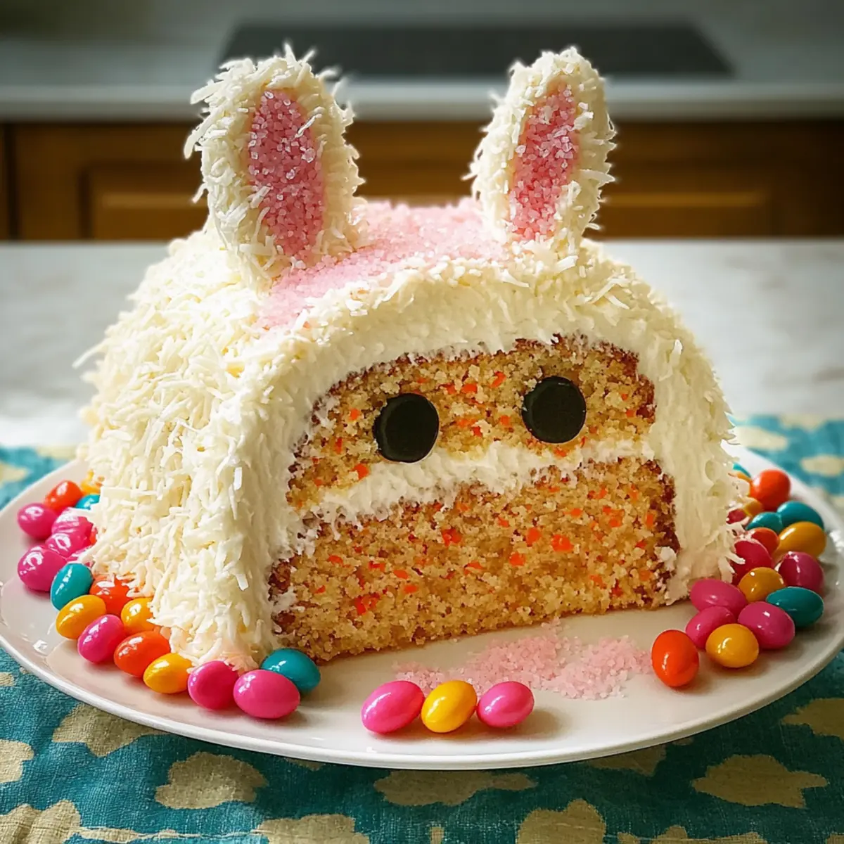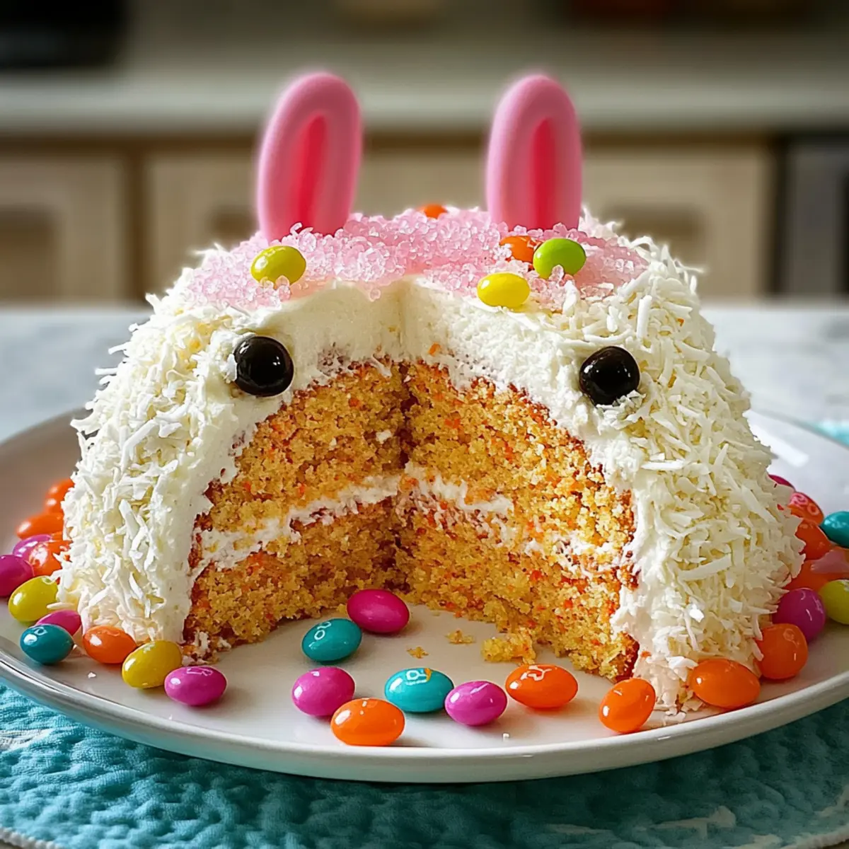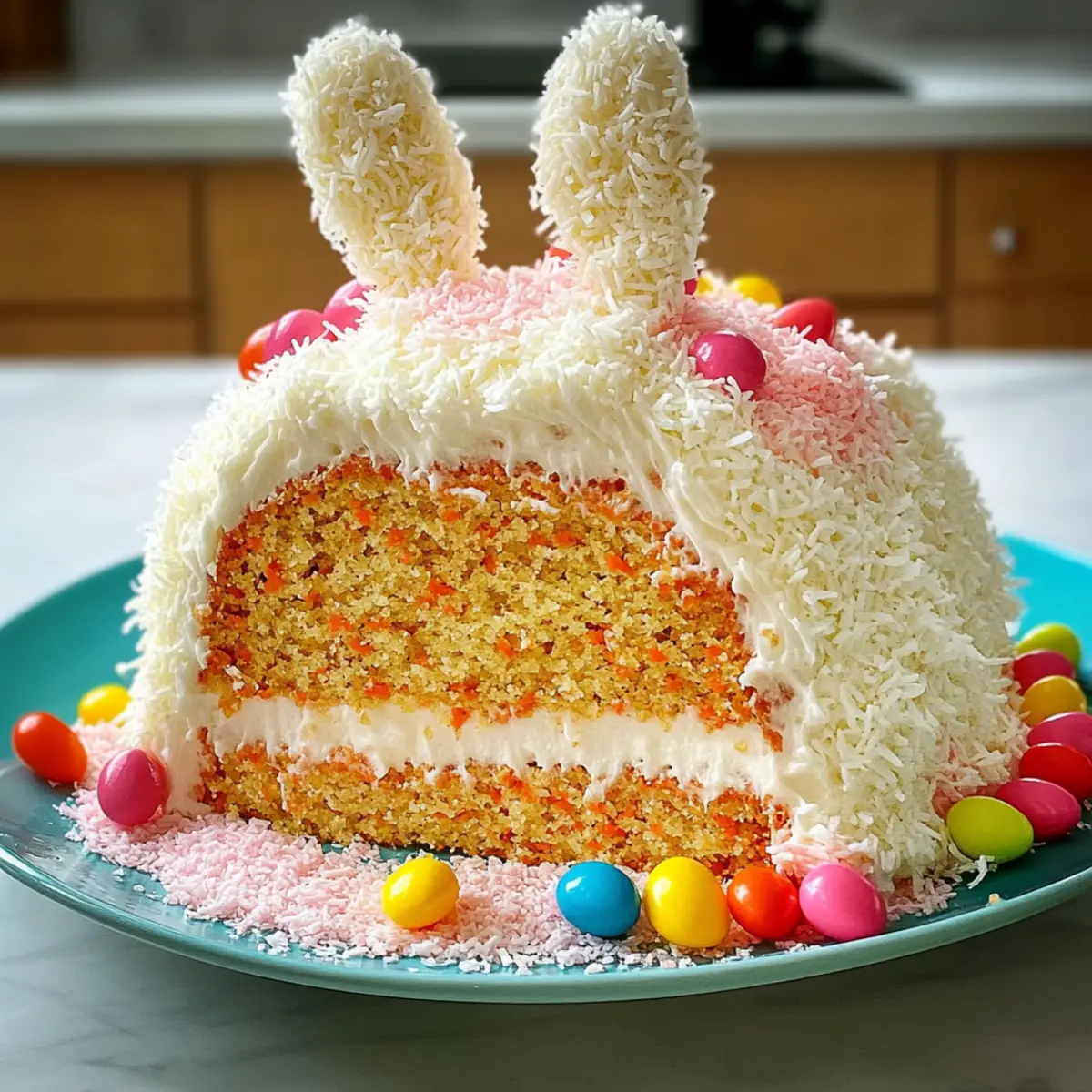 Imagine walking into a room filled with laughter and the sweet aroma of freshly baked treats. In the center, a joyful Bunny Cake captures everyone’s attention, inviting you to take a slice of its colorful charm. This delightful dessert, with its moist carrot cake base and fluffy coconut “fur,” is perfect for any festive occasion. The best part? It’s customizable to suit every taste—think chocolate, nutty, or even vegan options. Whether you’re hosting a family gathering or surprising friends, this cake is sure to become a cherished favorite. Plus, it’s incredibly easy to whip up, making it a go-to recipe for busy home chefs craving a touch of whimsy in the kitchen. Are you ready to create your own festive masterpiece? Why is Bunny Cake a Must-Bake? Customization: The Bunny Cake is your canvas—choose from chocolate, nutty, or fruity variations, and even vegan alternatives to cater to everyone’s taste. Family-Friendly Fun: Kids adore the playful design, making it a hit at Easter and other celebrations. Easy to Create: Don’t worry if you’re not a pro baker; this recipe is straightforward and forgiving, perfect for home chefs of all levels. Crowd-Pleasing Delight: Its charming appearance and delightful flavors will wow your guests and spark joy at any gathering. Leftover Magic: Store any leftovers for a sweet treat to enjoy throughout the week, just like a slice of Oatmeal Apple Pancakes tastefully reminisces of your baking success! Bunny Cake Ingredients • Gather these delightful ingredients to create your own Bunny Cake masterpiece! For the Cake Cooking Spray – Prevents sticking to pans; ensure even application across the surfaces. Light or Dark Brown Sugar – Adds moisture and flavor depth; feel free to use either variety interchangeably. Neutral Oil – Provides moisture and a tender crumb; coconut or canola oil are excellent substitutes. Granulated Sugar – Sweetens the cake; can be replaced with a sugar alternative for a guilt-free twist. Large Eggs – Essential for structure; make sure to keep them at room temperature for the best incorporation. Pure Vanilla Extract – Enhances overall flavor; opt for high-quality extract to elevate the taste. All-Purpose Flour – Forms the cake’s structure; can be substituted with a gluten-free blend if needed. Baking Powder – Acts as a leavening agent; always ensure it’s fresh for optimal rise. Baking Soda – Another crucial leavening agent; do not substitute without adjusting acidity. Ground Cinnamon – Adds warmth and spice; adjust according to your personal taste. Ground Ginger – Introduces flavor depth; can be omitted if you prefer a simpler spice profile. Ground Nutmeg – Provides aromatic flavor; modify the amount based on your preference. Kosher Salt – Balances sweetness and enhances flavor; a must for a perfect cake. Grated Carrots – The star ingredient for flavor and moisture; fresh grating is key for the ideal texture. For the Frosting and Decoration Unsalted Butter – Ensures creamy frosting; it should be at room temperature for best results. Confectioners’ Sugar – Sweetens and thickens frosting; adjust to your desired level of sweetness. Heavy Cream – Adds richness; use at room temperature to help it incorporate smoothly. Sweetened Shredded Coconut – Creates the adorable “fur” for decoration; can be fresh or packaged. Rice Krispies Treats – Perfect for crafting the bunny ears; go for homemade or store-bought. Pink Sanding Sugar – A decorative element that adds a pop of color and charm. Jelly Beans – Used for the bunny’s features; feel free to choose your favorite varieties for fun. Green Food Coloring – Optional, for additional decoration to elevate the festive look. With this collection of ingredients, you’re well on your way to creating a delightful Bunny Cake that promises to be the highlight of any celebration! Step‑by‑Step Instructions for Bunny Cake Step 1: Prepare Batter Preheat your oven to 350°F (175°C) and generously grease two 9-inch round cake pans with cooking spray. In a large mixing bowl, whisk together light or dark brown sugar, granulated sugar, neutral oil, large eggs, and pure vanilla extract until smooth and well combined. Gently fold in all-purpose flour, baking powder, baking soda, ground cinnamon, ground ginger, ground nutmeg, kosher salt, and freshly grated carrots until just incorporated, ensuring not to overmix. Step 2: Bake Divide the cake batter evenly between the prepared pans, smoothing the tops with a spatula for an even surface. Bake in the preheated oven for 25-30 minutes, or until a toothpick inserted into the center comes out clean. Once baked, remove the pans from the oven and let them cool for 10 minutes. Carefully transfer the cakes to a wire rack to cool completely before frosting. Step 3: Shape Cake Once your Bunny Cake layers are cool, level the tops if required using a serrated knife for a flat surface. To create bunny ears, take one of the cooled cakes and cut it creatively into two large triangular shapes. Arrange the cake layers and ears on a serving platter, ready to be transformed into an adorable Bunny Cake centerpiece for your festive celebration. Step 4: Make Frosting In a large mixing bowl, beat softened unsalted butter until creamy and light in texture. Gradually add in confectioners’ sugar, heavy cream, pure vanilla extract, and a pinch of salt, mixing until fluffy and spreadable. Apply a crumb coat on the entire cake and chill it in the refrigerator for 30 minutes to firm up the frosting layer, ensuring a clean finish for your Bunny Cake. Step 5: Frost and Decorate Once chilled, remove the Bunny Cake from the refrigerator and generously cover it with the prepared frosting using a spatula, creating a smooth surface. Carefully press sweetened shredded coconut onto the frosting to create the delightful “fur” look. For extra charm, use jelly beans to form the bunny’s eyes, nose, and mouth, completing the w