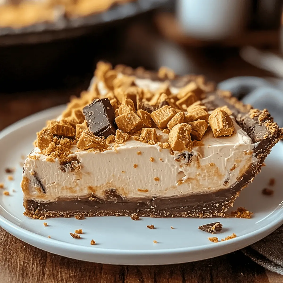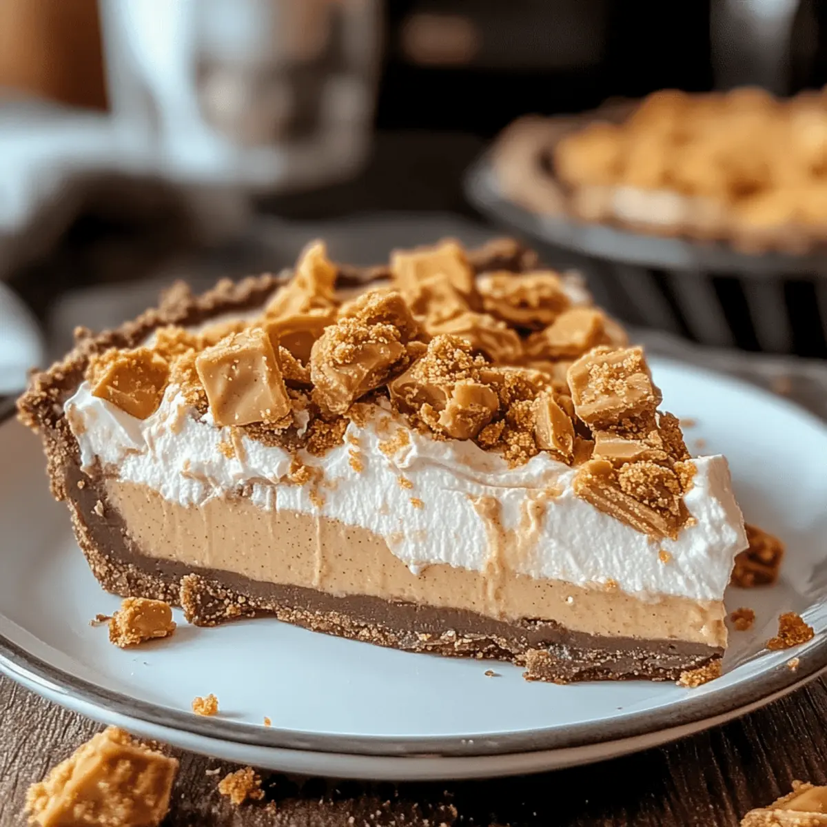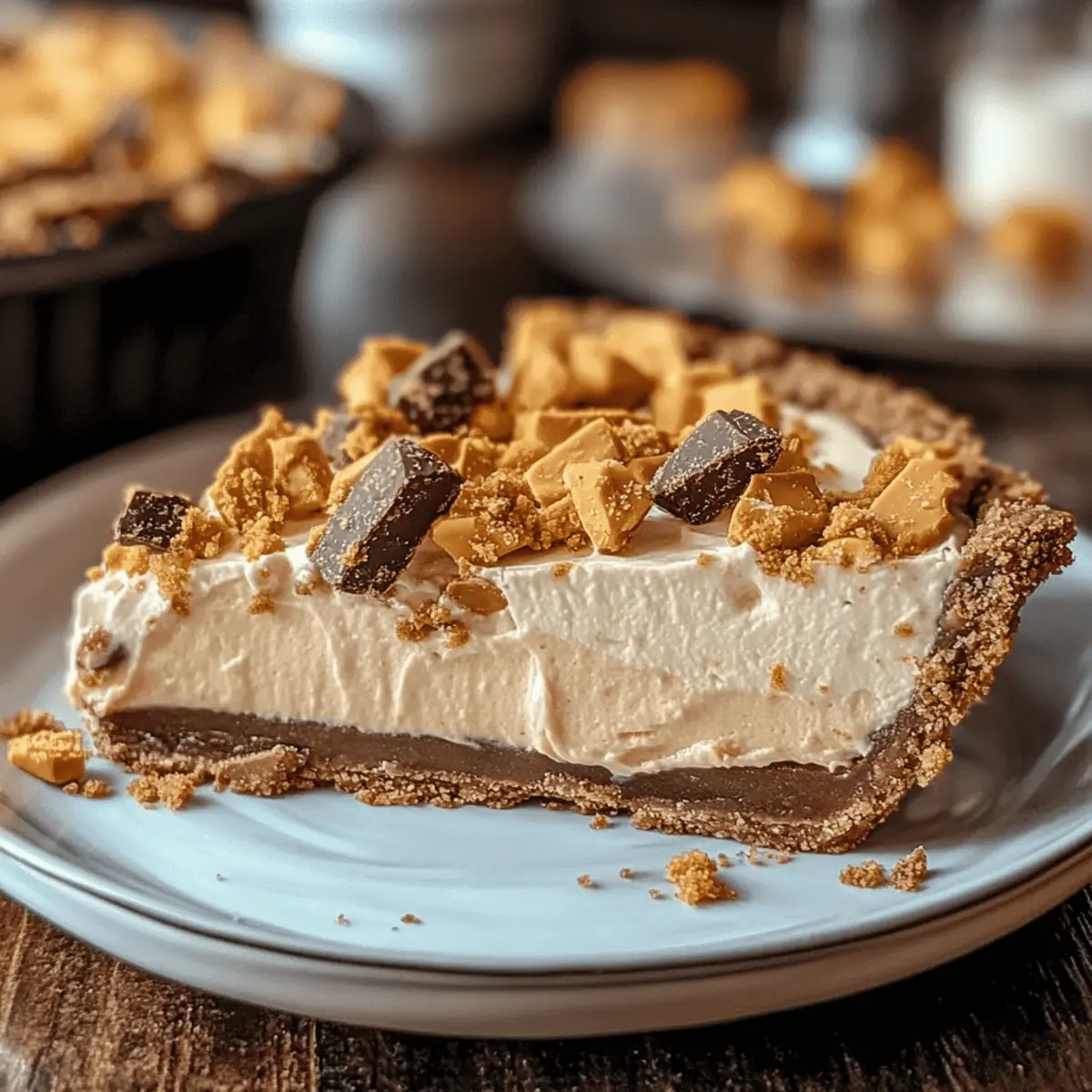 As the kitchen filled with the sweet aroma of melting chocolate and creamy peanut butter, I couldn’t help but feel like a kid again. This No-Bake Butterfinger Peanut Butter Pie combines nostalgia with ease, making it a perfect dessert for gatherings or a cozy night in. With its silky peanut butter filling and generous chunks of Butterfinger candy, it’s not just a treat—it’s a showstopper. The best part? It comes together without the need for an oven, saving you time and hassle while still delivering that sought-after, rich flavor. Whether you’re a seasoned home chef or a busy parent just seeking a quick indulgence, this pie is sure to satisfy your sweet cravings. Curious about how to create this delightful dessert? Let’s dive in! Why Is This Peanut Butter Pie Special? Simplicity at Its Finest: This no-bake Butterfinger Peanut Butter Pie is incredibly easy to make, perfect for anyone looking to whip up a dessert without the fuss. Versatile Variations: With simple swaps like using crushed Oreos instead of graham crackers, you can customize this pie to match your taste. Crowd-Pleaser: Its rich, creamy filling and delightful crunch make it a hit at parties and gatherings, guaranteeing compliments from friends and family. Nostalgic Flavor: Enjoying a slice feels like indulging in your favorite childhood candy bar, bringing back sweet memories with every bite. Quick Prep Time: You’ll have this delectable pie ready in no time—just mix, assemble, and refrigerate! For more easy recipes, check out my Slow Cooker Butter for a fantastic meal that’s just as effortless! Butterfinger Peanut Butter Pie Ingredients • Discover the key ingredients for this irresistible dessert! For the Crust 2 cups graham cracker crumbs – This forms the base; swap with crushed Oreos for a chocolatey twist. ½ cup unsalted butter, melted – Binds the crust together perfectly. For the Filling 1 cup creamy peanut butter – The heart of the dessert; opt for high-quality peanut butter for amazing flavor. 8 oz cream cheese, softened – Ensures a rich, smooth texture; be sure it’s fully softened to avoid lumps. 1 cup powdered sugar – Sweetens and stabilizes the filling beautifully. 1 teaspoon vanilla extract – Adds that extra depth of flavor. 8 oz whipped topping (Cool Whip), thawed – Lightens up the filling for a creamy finish. 4 Butterfinger candy bars, crushed (plus extra for topping) – Infuses the pie with a delightful crunch and signature flavor. Now you have everything you need to create your very own Butterfinger Peanut Butter Pie! Let’s get started on crafting this dreamy dessert. Step‑by‑Step Instructions for Butterfinger Peanut Butter Pie Step 1: Prepare the crust In a large mixing bowl, combine 2 cups of graham cracker crumbs with ½ cup of melted unsalted butter. Stir until the mixture resembles wet sand. Press this mixture firmly and evenly into the bottom and up the sides of a 9-inch pie dish, creating a solid crust that is about ½-inch thick. Set the crust aside to firm up while you prepare the filling. Step 2: Make the filling In a mixing bowl, use an electric mixer to beat 8 oz of softened cream cheese until smooth and fluffy. Gradually add in 1 cup of creamy peanut butter, 1 cup of powdered sugar, and 1 teaspoon of vanilla extract. Mix for about 2-3 minutes on medium speed until well-combined and smooth with no lumps. This creamy mixture forms the base for your Butterfinger Peanut Butter Pie. Step 3: Fold in whipped topping Carefully fold in 8 oz of thawed whipped topping (Cool Whip) into the peanut butter mixture. Use a spatula to gently incorporate the whipped topping until everything is evenly combined. Then, add in the crushed pieces of 4 Butterfinger candy bars, mixing just until evenly dispersed throughout the filling. This will provide that delightful crunch in your pie. Step 4: Assemble the pie Once the filling is ready, pour it into the prepared graham cracker crust. Use a spatula to spread the filling evenly across the crust, smoothing the top so it looks inviting. For an extra touch, sprinkle additional crushed Butterfinger candy on top of the filling for garnish. This adds both visual appeal and more crunch for your Butterfinger Peanut Butter Pie. Step 5: Chill Cover the assembled pie with plastic wrap and refrigerate it for at least 4 hours, or until the filling has fully set and is firm to the touch. This chilling time helps the flavors meld and provides a perfect slice when it’s time to serve. Once chilled, your Butterfinger Peanut Butter Pie is ready to delight your taste buds! Step 6: Serve and enjoy When ready to serve, slice the pie into wedges and plate them up. Optionally, add a dollop of whipped cream and a sprinkle of crushed Butterfinger on each slice for added flavor and garnish. Enjoy the rich, creamy texture combined with the crunchy bits of Butterfinger in every delightful bite! How to Store and Freeze Butterfinger Peanut Butter Pie Fridge: Store leftovers in an airtight container in the refrigerator for up to 3 days to maintain freshness and texture. Freezer: For longer storage, you can freeze the pie, wrapped tightly in plastic wrap and then aluminum foil, for up to 2 months. Thaw in the fridge before serving. Serving: To enjoy the best flavor, serve chilled. If the pie has been frozen, allow it to thaw completely before cutting and serving. Make Ahead: You can prepare the Butterfinger Peanut Butter Pie a day in advance, making it a convenient choice for gatherings and special occasions. What to Serve with No-Bake Butterfinger Peanut Butter Pie Looking to create a complete dessert experience? Here are some delightful pairings that will elevate your no-bake treat to a whole new level. Creamy Vanilla Ice Cream: Adds a soothing, cool contrast to the rich flavors of the pie, making every bite even more indulgent. Fresh Strawberries: These juicy, sweet berries provide a refreshing contrast, cutting through the richness of the pie with a burst o