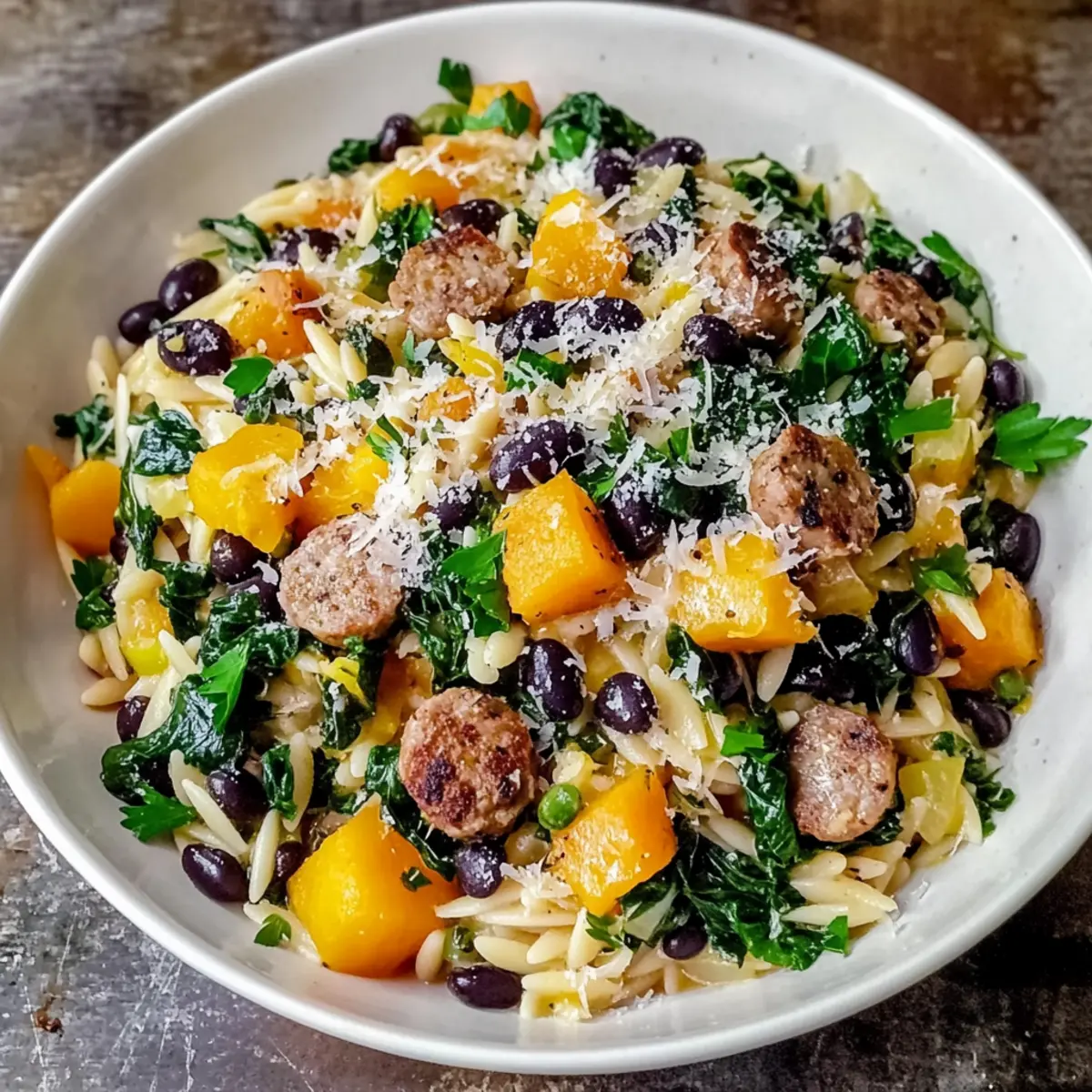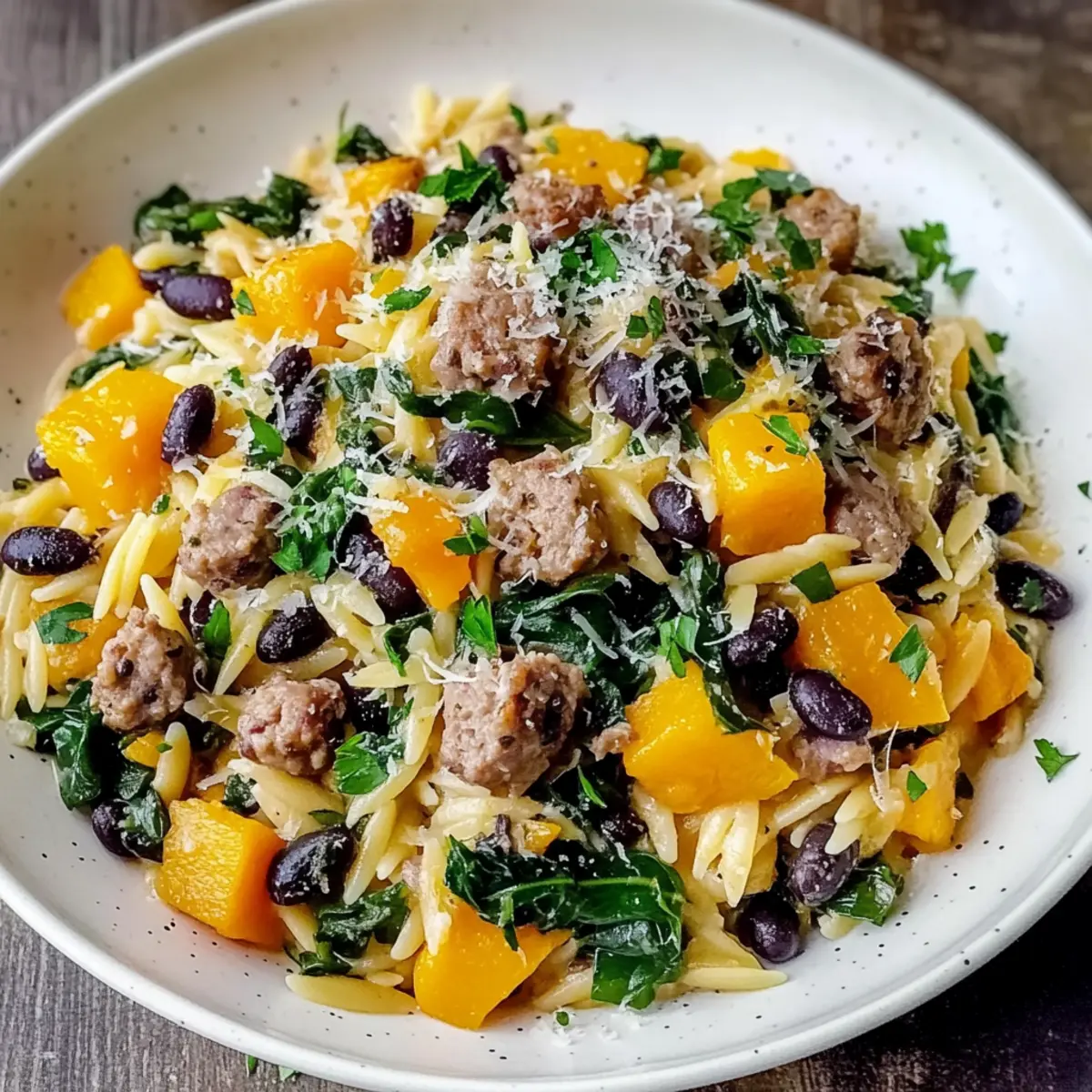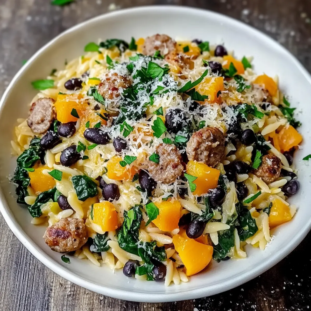 As I stood by the stove, the rich aroma of roasting butternut squash filled the air, mingling with the savory scent of sausage sizzling in the pan. That’s when I knew I was onto something special: Butternut Squash and Black Bean Orzo with Sausage and Spinach is the comforting dish that can brighten any weeknight dinner. With just 15 minutes of prep time and 50 minutes of cooking, this recipe not only saves you from the fast-food trap but also delivers a nourishing meal packed with flavors and nutrients. It’s a perfect choice for busy evenings or cozy gatherings with friends. Plus, it’s easy to customize, whether you’re hoping for a hearty meat option or a satisfying vegetarian variation. Curious about how to make this vibrant dish? Let’s dive in! Why is this recipe a must-try? Hearty Comfort: Each bite of Butternut Squash and Black Bean Orzo with Sausage and Spinach provides a warm embrace of flavors that are perfect for any occasion. Quick & Easy: With just 15 minutes of prep and 50 minutes of cooking, this dish is designed for busy weeknights! Versatile Options: Whether you prefer the savory sausage or want a delicious vegetarian twist, this recipe allows for easy substitutions to fit your needs. Consider making it vegetarian by removing the sausage and upping the black beans or lentils for extra protein! Nutritious Goodness: Packed with fiber, vitamins, and protein, this dish serves as a wholesome alternative to fast food, giving your body the fueling it deserves. Satisfying Flavor Profile: The combination of roasted butternut squash, aromatic garlic, and spices creates an irresistible flavor, reminiscent of cozy Mediterranean meals. If you enjoy comforting and vibrant dishes, you’ll also love recipes like Spinach Mushroom Pasta or Shrimp Orzo Lemon. Butternut Squash and Black Bean Orzo Ingredients For the Dish Orzo Pasta – The comforting base of the dish; for a twist, substitute with ditalini or fusilli. Butternut Squash – Adds a sweet, creamy flavor; remember to peel, seed, and dice before roasting. Olive Oil – Essential for roasting and sautéing, enhancing all the flavors beautifully. Salt and Pepper – Crucial for balancing the dish’s flavor profile; adjust to taste for perfection. Sausage (chicken or turkey) – Provides savory protein; can be switched out for plant-based options for a vegetarian version. Onion – Finely chopped for a touch of sweetness and depth in flavor. Garlic – Minced for that aromatic touch that’s hard to resist. Ground Cumin – Adds warm earthiness that elevates the complexity of flavors. Black Beans – Canned, drained, and rinsed for a creamy texture and protein boost. Fresh Spinach – This vibrant green ingredient adds color and should wilt perfectly during cooking. Parmesan Cheese – Provides savory richness; nutritional yeast works as a tasty dairy-free substitute. Fresh Parsley – Optional garnish that brings a burst of freshness and color to the dish. Lemon Juice – Brightens the flavors beautifully, just a squeeze over the top before serving will do! This hearty, healthy dinner option, Butternut Squash and Black Bean Orzo with Sausage and Spinach, is truly a delightful feast for both your senses and your well-being! Step‑by‑Step Instructions for Butternut Squash and Black Bean Orzo with Sausage and Spinach Step 1: Preheat and Roast the Squash Preheat your oven to 400°F (200°C). In a bowl, toss the diced butternut squash with 1 tablespoon of olive oil, and season with salt and pepper. Spread the squash on a baking sheet in a single layer and roast for 25–30 minutes, or until it becomes tender and slightly caramelized, turning occasionally for even cooking. Step 2: Cook the Orzo While the squash is roasting, bring a large pot of salted water to a boil. Add the orzo pasta and cook according to package instructions, usually around 8–10 minutes, until al dente. Drain the orzo in a colander and set aside, ready to add to your delicious Butternut Squash and Black Bean Orzo with Sausage and Spinach. Step 3: Sauté the Sausage In a large skillet, heat 2 tablespoons of olive oil over medium heat. Once hot, add the sausage, breaking it apart with a spatula. Cook for about 5–7 minutes until the sausage is browned and cooked through, stirring occasionally to ensure it browns evenly. This step adds wonderful flavor to your dish! Step 4: Add Onions and Garlic Next, add the finely chopped onion and minced garlic to the skillet with the sausage. Sauté for 3–4 minutes until the onion becomes translucent and the garlic is fragrant—this builds the aromatic base of your Butternut Squash and Black Bean Orzo with Sausage and Spinach. Step 5: Incorporate Spices and Spinach Sprinkle in 1 teaspoon of ground cumin, stirring for about 1 minute to awaken its earthy aroma. Then, add the drained black beans and fresh spinach to the skillet. Cook until the spinach wilts down, about 2–3 minutes, allowing the mixture to become rich and flavorful. Step 6: Combine Squash, Orzo, and Cheese Once the spinach is wilted, gently fold in the roasted butternut squash. Follow by adding the cooked orzo and ½ cup of grated Parmesan cheese, stirring until the cheese melts into the warm mixture, coating each element with creamy goodness. Your hearty Butternut Squash and Black Bean Orzo dish is taking shape! Step 7: Finish and Adjust Flavor Remove the skillet from heat, then squeeze fresh lemon juice over the pasta medley. Taste and adjust the seasoning, adding extra salt and pepper as needed to enhance the flavors. This bright touch elevates the dish, bringing all the elements together beautifully. Step 8: Serve and Enjoy Serve your Butternut Squash and Black Bean Orzo with Sausage and Spinach warm, garnished with a sprinkle of fresh parsley if desired. Arrange it in shallow bowls, maybe with a drizzle of extra virgin olive oil and a wedge of lemon on the side for an inviting presentation. How to Store and Freeze Butternut Squash and Black Bean 