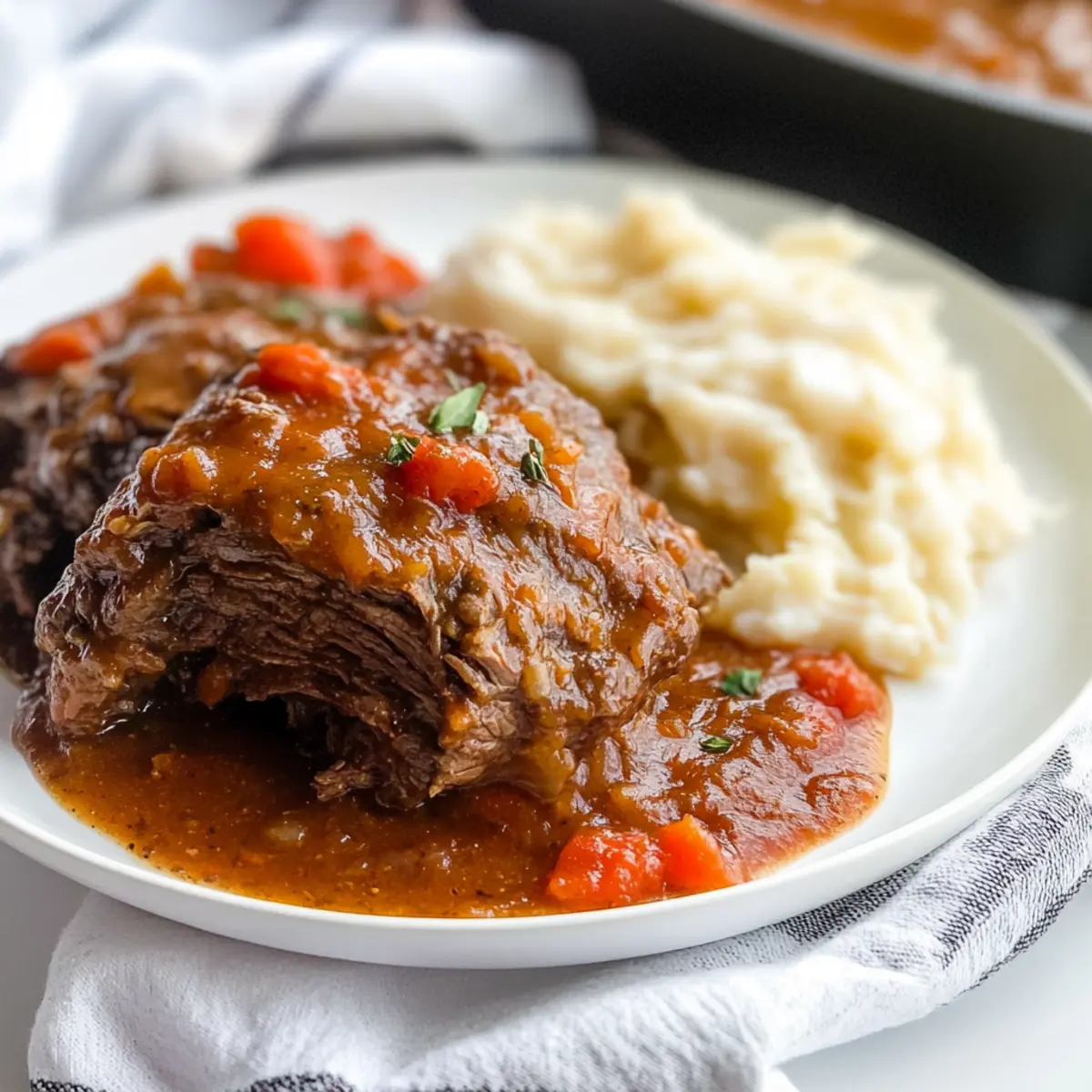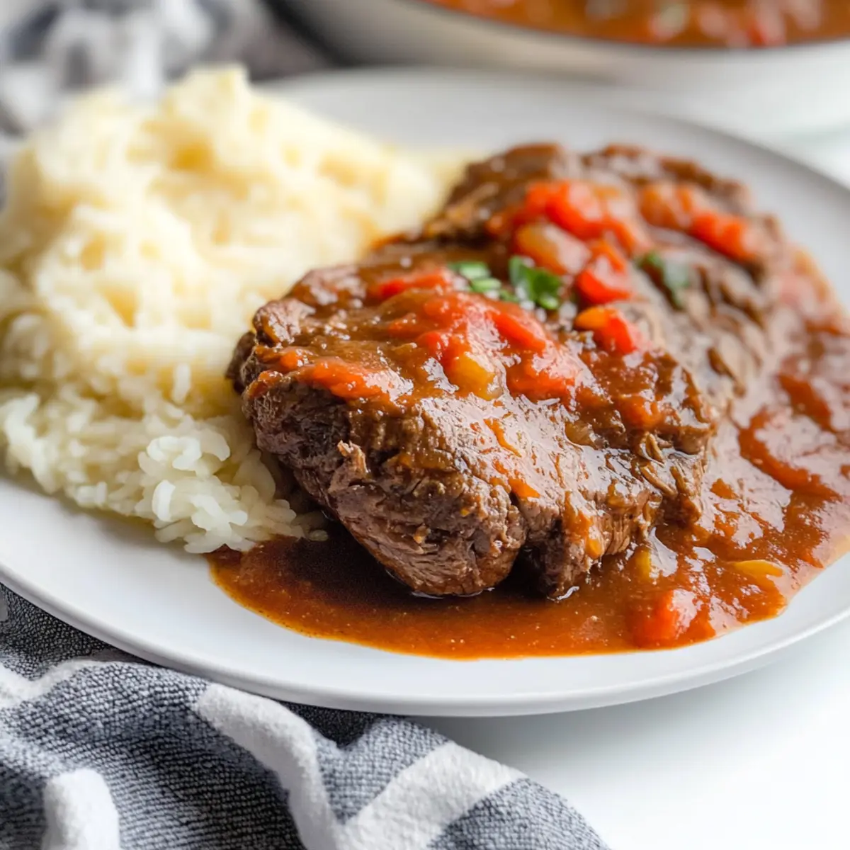 There’s nothing quite like the aroma of Cajun spices wafting through the kitchen, making hearts race and mouths water. As I unearth my trusty Dutch oven, I can’t help but feel a sense of nostalgia—this Cajun Pot Roast with Tomato Gravy has been the star of countless family gatherings and cozy evenings in. It’s not just a meal; it’s a warm hug served on a plate. The melt-in-your-mouth beef stews peacefully in a rich, savory tomato gravy that speaks of comfort food at its finest. Plus, it’s incredibly easy to whip up whether you choose the traditional oven method or opt for a convenient slow cooker. Trust me, this dish becomes even more delicious after a day in the fridge, making it perfect for meal prep! Are you ready to dive into this flavorful, heartwarming experience? Let’s get cooking! Why is Cajun Pot Roast So Irresistible? Comforting aroma: The scent of Cajun spices fills your kitchen, creating an inviting atmosphere that pulls everyone in. Melt-in-your-mouth beef: This pot roast is cooked slowly until fork-tender, ensuring each bite is a pleasure. Versatile cooking methods: Whether you choose the oven, slow cooker, or Instant Pot, this recipe adapts beautifully to your schedule. Savory tomato gravy: A rich, thick gravy enhances every morsel, perfect for drenching mashed potatoes or rice. Make-ahead magic: It tastes even better the next day, making it a fantastic option for effortless meal prep. With all these delightful features, this Cajun Pot Roast is bound to become a family favorite! Cajun Pot Roast Ingredients • Get ready for a culinary delight packed with Cajun flavor! For the Pot Roast Olive Oil – Adds richness and helps in searing the meat; substitute with vegetable oil if needed. Pot Roast (2¾ pounds) – The star protein that provides a hearty foundation; choose a well-marbled cut for that tender melt-in-your-mouth feel. Creole Seasoning (1 tablespoon) – Imparts a spicy, aromatic flavor; can be substituted with Cajun seasoning or a homemade spice blend for a personal touch. Flour (1/3 cup + 2 tablespoons, divided) – Thickens the gravy and enhances meat browning; for gluten-free options, try cornstarch. Onion (1, sliced) – Adds sweetness and depth; yellow or white onions are preferred, but shallots make a great substitute too. For the Gravy Diced Tomatoes (14.5 ounce can, undrained) – They contribute to the savory tomato gravy base; fresh tomatoes can be used for a fresher taste. Beef Broth (2 cups, divided) – Provides moisture and enhances flavor; for a lighter option, use vegetable broth instead. With these simple ingredients, you’ll create a delicious Cajun Pot Roast with Tomato Gravy that will warm your heart and home! Step‑by‑Step Instructions for Cajun Pot Roast with Tomato Gravy Step 1: Preheat and Prepare Begin by preheating your oven to 325°F (160°C). While the oven warms, take out your large Dutch oven and place it on the stovetop over medium-high heat. Add a couple of tablespoons of olive oil, allowing it to heat until shimmering, which will set the stage for that beautiful sear on your pot roast. Step 2: Sear the Pot Roast Rub your 2¾-pound pot roast generously with 1 tablespoon of Creole seasoning, making sure to coat all sides thoroughly. Dredge the seasoned roast in 1/3 cup of flour to enhance the browning. Carefully place the roast in the hot Dutch oven and sear for about 3 minutes on each side, until it’s nicely browned and develops a rich crust. Step 3: Add Onions and Tomatoes After searing, remove the pot roast from the Dutch oven and set it aside momentarily. In the same pot, add your sliced onion, allowing it to sauté for a couple of minutes until it becomes translucent. Next, pour in a 14.5-ounce can of undrained diced tomatoes, using a wooden spoon to scrape the flavorful browned bits from the bottom of the pot. Step 4: Combine and Braise Return the pot roast to the Dutch oven, nestling it among the onions and tomatoes. Pour in 1 cup of beef broth, ensuring the liquid surrounds the roast. Bring the mixture to a gentle simmer before covering the pot with a snug lid and transferring it to the preheated oven. Let it braise for approximately 3 hours until the meat is fork-tender and infused with savory flavor. Step 5: Thicken the Gravy Once the roast is tender, carefully remove it from the Dutch oven and place it on a cutting board to rest while you prepare the gravy. In a small bowl, mix the remaining 2 tablespoons of flour with 1 cup of beef broth, whisking until smooth. Pour this mixture into the pan juices and stir to combine, bringing it to a boil over medium heat for about 5 minutes until thickened and rich. Step 6: Serve and Enjoy To serve your Cajun pot roast, slice the tender meat against the grain and arrange it on a platter. Drizzle the thickened tomato gravy generously over the meat, allowing it to seep into every crevice. Pair this dish with creamy mashed potatoes or rice, and bask in the comfort of this hearty, soul-warming meal. How to Store and Freeze Cajun Pot Roast Refrigerator: Store any leftover Cajun Pot Roast in an airtight container for up to 3 days. The flavors deepen over time, making it taste even better after a day’s rest. Freezer: For longer storage, freeze the pot roast in a freezer-safe container or heavy-duty freezer bag for up to 3 months. Ensure all air is removed to prevent freezer burn. Reheating: When ready to enjoy, thaw the frozen pot roast in the fridge overnight. Reheat gently on the stove or microwave until warmed through, adding a splash of beef broth to rehydrate the gravy if needed. Souper Idea: Leftover gravy is perfect for making a comforting soup—just add broth and your choice of vegetables! Expert Tips for Cajun Pot Roast Searing is Key: Don’t skip the searing step! It locks in the flavors and creates a delicious crust that enhances the overall taste of the Cajun pot roast. Slow Cooker Option: If using a slow cooker, remember to sear the meat first to develop f