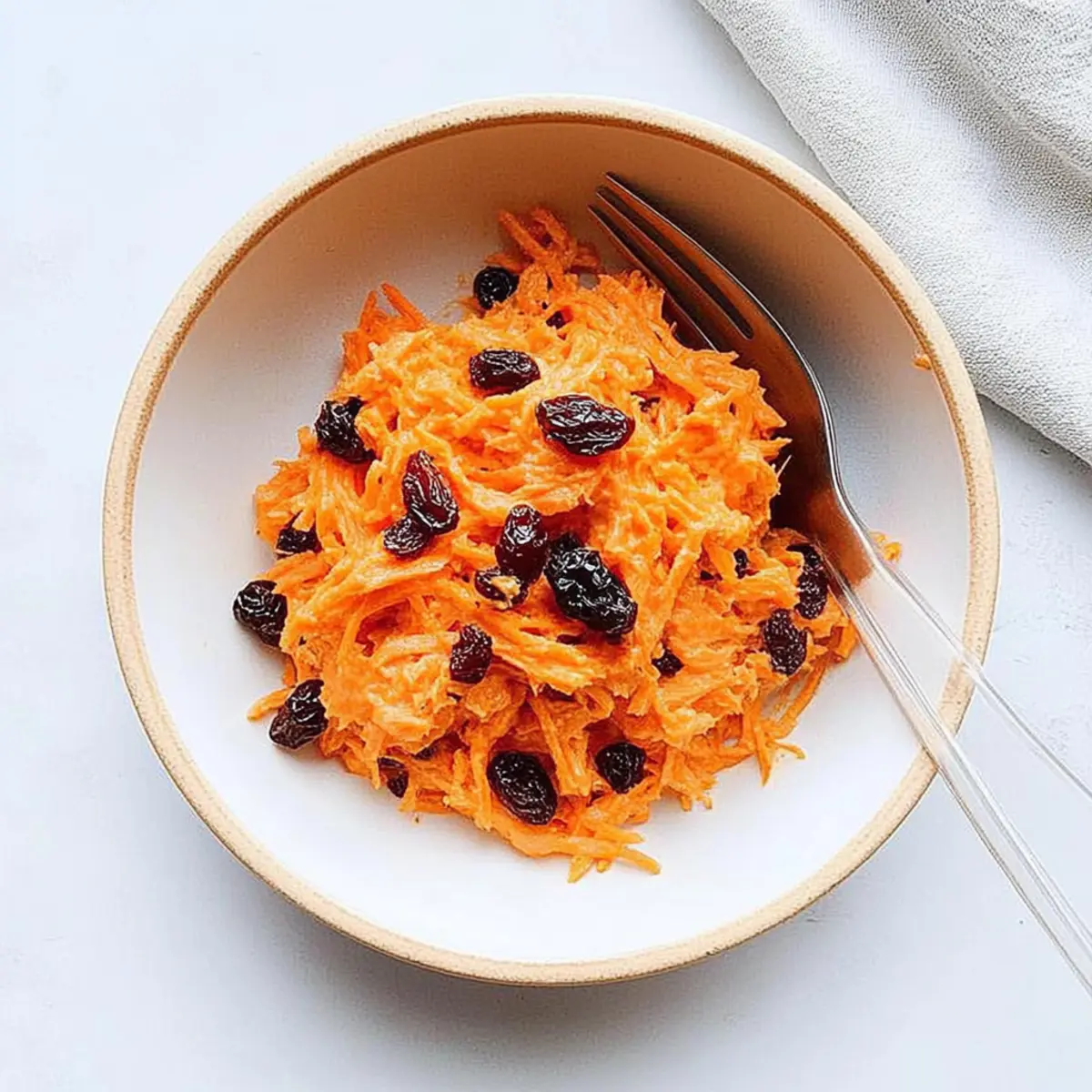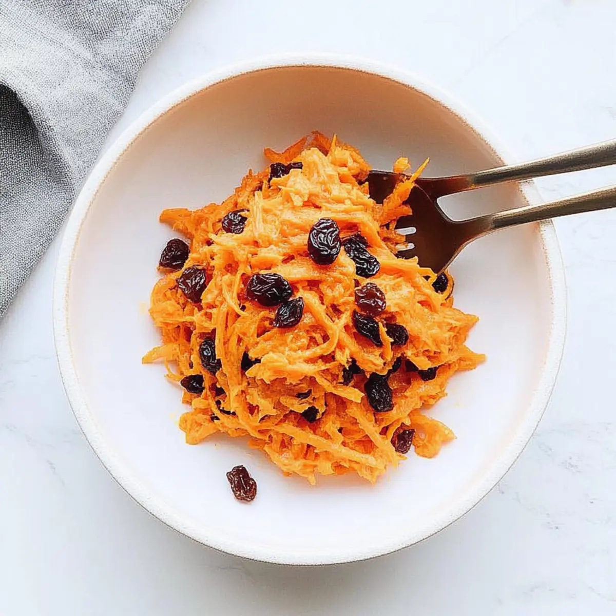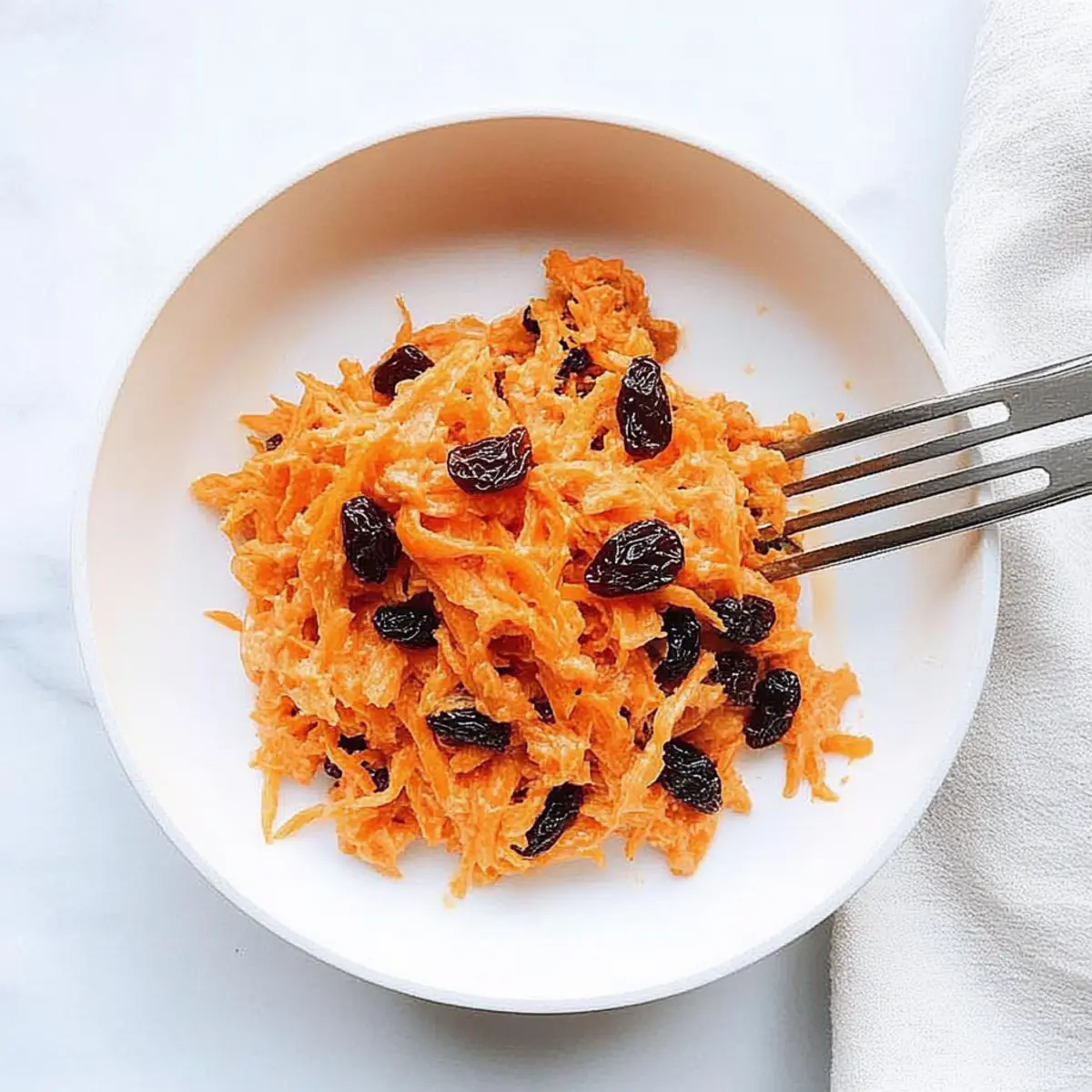 The moment I took a bite of my first carrot raisin salad, a wave of nostalgia washed over me, transporting me to sunny picnics where vibrant flavors danced on my palate. This Quick & Easy Carrot Raisin Salad is the perfect marriage of crunchy carrots and sweet raisins, all wrapped in a creamy dressing that elevates any meal. With just 10 minutes of prep, it’s an effortless side dish ideal for potlucks or a refreshing accompaniment to grilled meats. Plus, it’s unbelievably versatile; you can easily tweak it to fit your preferences, whether by adding apples for a crisp twist or swapping in Greek yogurt for a healthier spin. Ready to impress your family or guests without breaking a sweat? Let’s dive into this delightful recipe that’s sure to become a staple in your kitchen! Why is this salad a must-try? Simplicity at its finest: This Carrot Raisin Salad takes just 10 minutes to whip up, making it a breeze for even the busiest home cooks. Endless Customization: Adjust ingredients to suit your taste—try adding crunchy nuts, or swap mayonnaise for Greek yogurt for a healthier twist. Crowd-Pleasing Flavor: The delightful combination of sweet raisins and fresh carrots coated in creamy dressing makes it a hit at potlucks and family gatherings. Nutrient-Dense: Packed with vitamins and minerals, this salad supports a healthy lifestyle without sacrificing flavor. Perfect Pairing: It’s a fantastic side to complement grilled chicken or fish, adding color and freshness to any meal. For more fresh and quick ideas, check out my recipes for Cucumber Caprese Salad and Chicken Caesar Salad Wrap. Carrot Raisin Salad Ingredients • Whip up your own vibrant creation with these easy ingredients. For the Salad Shredded Carrots – Provides crunch and natural sweetness; pre-shredded carrots can save you time! Raisins – Adds delightful sweetness and chewy texture; swap with craisins for a tart twist. Mayonnaise – Serves as the creamy dressing base; substitute with Greek yogurt for a lighter option. For the Sweetness Sugar – Enhances the overall sweetness; consider using honey or maple syrup for a natural alternative. For the Dressing Milk – Adjusts the dressing’s consistency; 2% gives creaminess, while non-dairy milk can work too. Feel free to customize your Carrot Raisin Salad with a splash of lemon juice for zing or add nuts for an extra crunch! Step‑by‑Step Instructions for Carrot and Raisin Salad Step 1: Prepare the Ingredients Begin by gathering your ingredients for the Carrot and Raisin Salad. Peel and shred about four medium carrots, yielding approximately 4 cups of shredded carrots. If you’re short on time, feel free to use pre-shredded carrots from the store. In a separate bowl, measure out 1 cup of raisins, ensuring they are fresh and plump, ready to bring sweetness to your salad. Step 2: Mix the Salad Base In a large mixing bowl, combine the shredded carrots and raisins. Add 1 cup of mayonnaise and 2 tablespoons of sugar to create a creamy dressing. Using a spatula or a large spoon, gently fold the ingredients together until evenly coated. The vibrant colors of the carrots and raisins will create a beautiful visual as the dressing envelops them. Step 3: Adjust the Dressing Consistency To achieve the desired dressing consistency, gradually stir in 2 to 4 tablespoons of milk. Mix well, allowing the dressing to become creamy and smooth. Be attentive to the texture; it should be thick but not clumpy. A drizzle of milk can make it lighter while keeping the salad rich and delicious, just how a Carrot and Raisin Salad should be! Step 4: Chill the Salad Cover your mixing bowl with plastic wrap or transfer the salad to an airtight container. Refrigerate the Carrot and Raisin Salad for at least 30 minutes. This chilling step allows the flavors to meld beautifully and enhances the overall taste. While waiting, you’ll notice the vibrant colors intensifying, making for an appealing dish when you serve it. Step 5: Serve and Enjoy Once chilled, remove the salad from the refrigerator. Before serving, give it a gentle stir to redistribute the dressing and maintain that glorious texture. Spoon the salad into a serving bowl, and consider garnishing with a sprinkle of chopped nuts or fresh herbs for added color and flavor. This Carrot and Raisin Salad is now ready to delight your family and friends! How to Store and Freeze Carrot Raisin Salad Fridge: Store the carrot raisin salad in an airtight container for up to 3 days to maintain its freshness and flavor. Make-Ahead: You can prepare the salad a day in advance; this allows the flavors to develop fully. Just remember to stir before serving! Freezer: For longer storage, freeze portions of the salad in airtight containers for up to 2 months. Thaw in the fridge overnight when ready to enjoy. Reheating: While this salad is best served cold, if you prefer a slightly warmer dish, let it sit at room temperature for 15 minutes before serving. Expert Tips for Carrot Raisin Salad Drain Excess Liquid: To prevent a watery carrot raisin salad, make sure to drain any excess liquid from the shredded carrots before mixing. Chill for Flavor: Giving your salad at least 30 minutes to chill in the refrigerator allows flavors to meld beautifully, enhancing the overall taste. Balance Sweetness: If your salad turns out too sweet, adding a squeeze of lemon juice or a splash of apple cider vinegar can provide a perfect balance. Make-Ahead Friendly: You can prepare this carrot raisin salad up to a day in advance; the flavors deepen with time, creating a delicious dish ready when you need it. CustomizeIngredients: Feel free to mix in your favorite additions, like chopped apples or nuts, to create a version of carrot raisin salad that suits your personal taste! Make Ahead Options These Carrot Raisin Salad preparations are ideal for busy home cooks looking to save time during the week! You can prepare the salad and refrigerate it up to 24 hours in advance, allowing the 