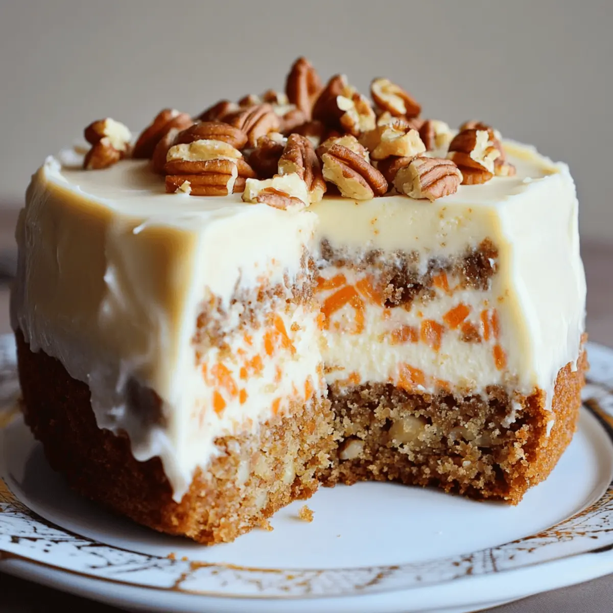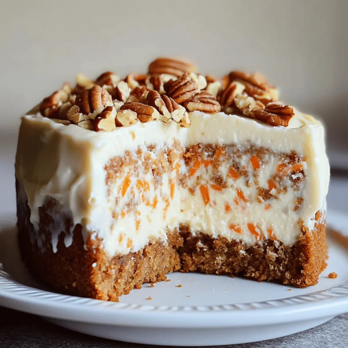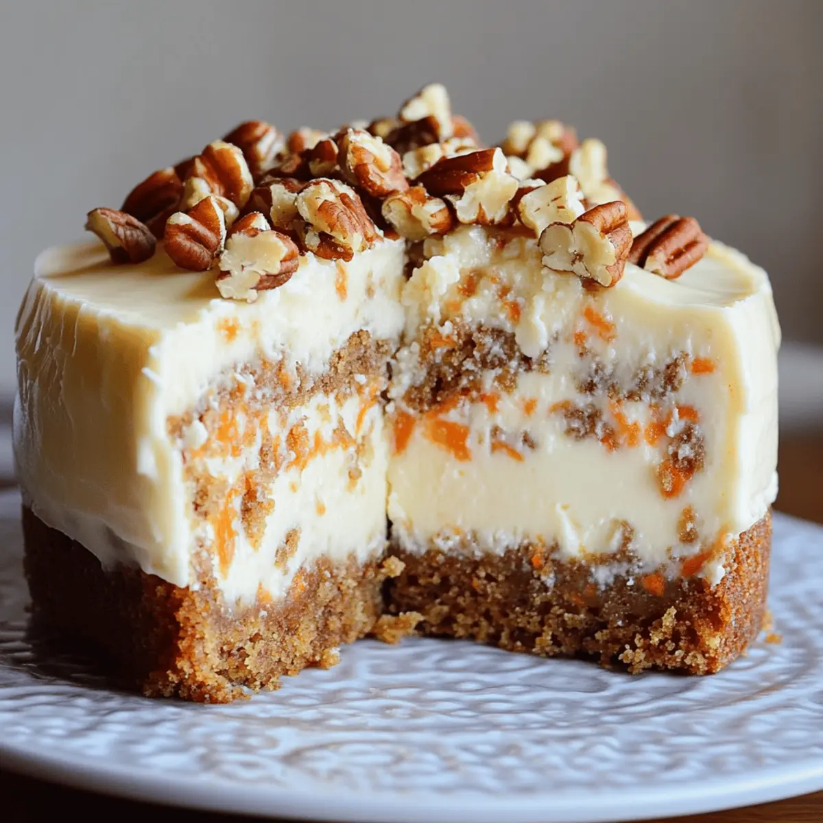 This Carrot Cake Cheesecake combines spiced carrot cake with creamy cheesecake for a delightful dessert experience.