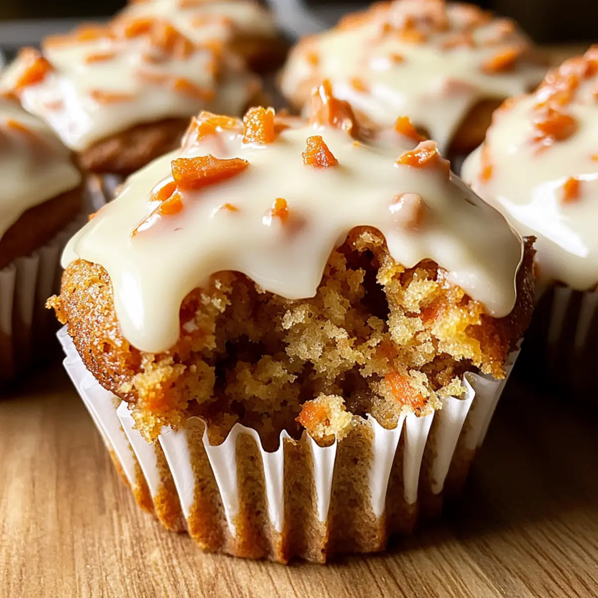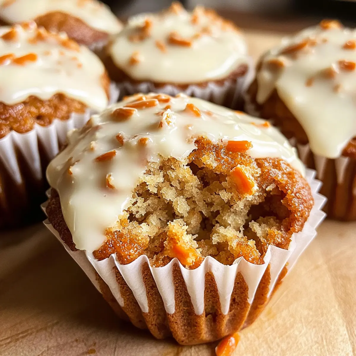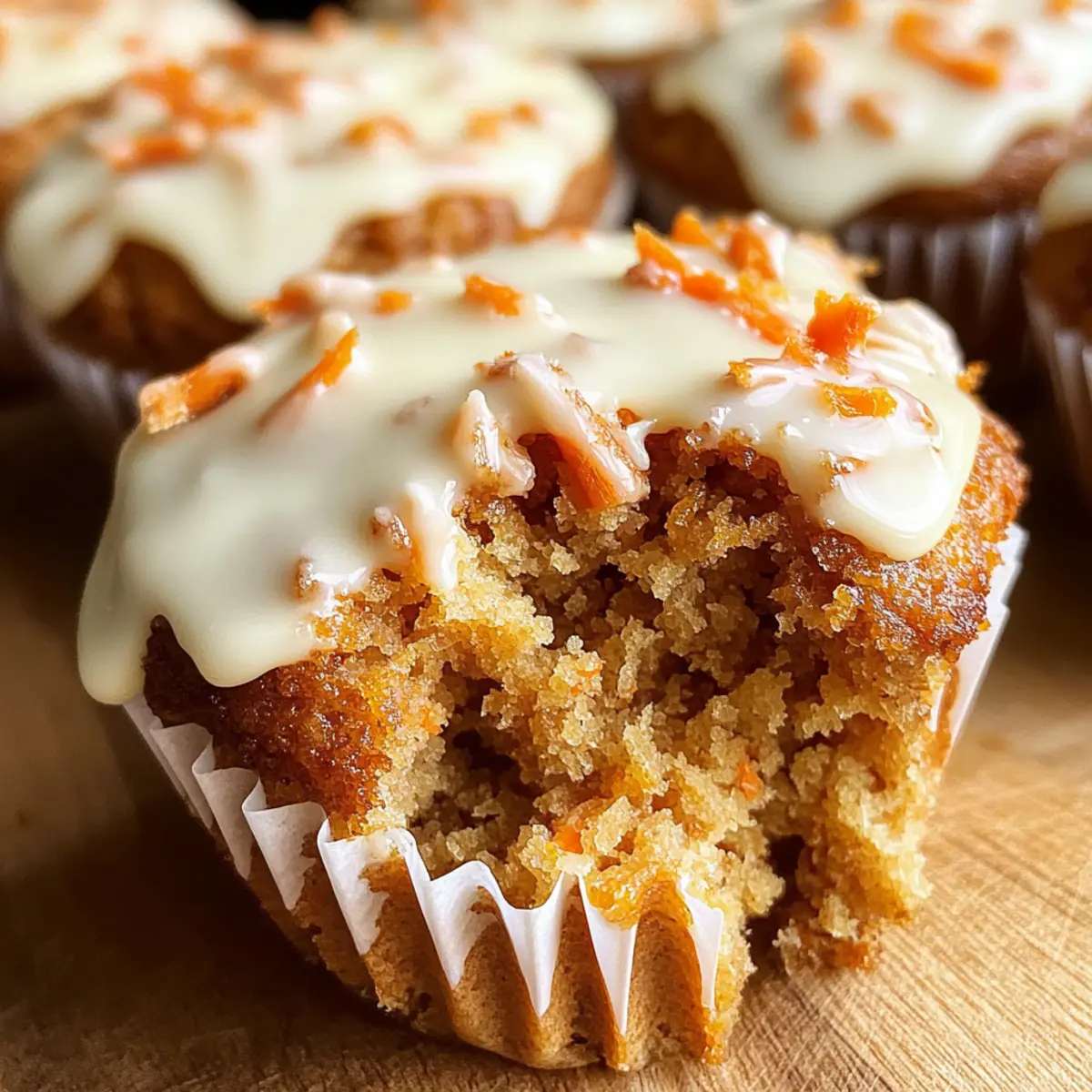 As I pulled the warm Carrot Cake Muffins from the oven, the aroma of cinnamon and nutmeg filled my kitchen like a cozy hug on a chilly morning. These delightful treats are not only moist and fluffy but also versatile enough to fit seamlessly into any meal, be it a hearty brunch or an afternoon snack. Topped with a creamy glaze that melts into the muffins, each bite feels like a celebration of homemade goodness. And the best part? You can easily customize them to fit various dietary needs, making it simple to enjoy a healthier version if you wish! Ready to indulge in baking these scrumptious muffins that everyone will love? Why Are These Muffins So Special? Moist and Fluffy: Each muffin is bursting with moisture and a delightful airy texture that makes them incredibly satisfying. Irresistible Aroma: The sweet scent of cinnamon and nutmeg creates an inviting atmosphere, drawing everyone to the kitchen. Customizable Options: With simple substitutions, you can transform these muffins to suit any dietary preference, whether it’s whole wheat or vegan adaptations. Perfect for Any Occasion: Whether it’s a brunch gathering or a cozy afternoon snack, these muffins are versatile enough to impress anyone. Draped in Glaze: The cream cheese glaze adds a rich and luscious touch that elevates these muffins, making them feel indulgent yet homemade. Don’t forget to try serving these muffins alongside a cup of coffee or tea, just like with my Blueberry Buttermilk Pancake recipe! Carrot Cake Muffin Ingredients • Here’s what you’ll need to whip up these delightful muffins! For the Muffins All-purpose flour – Provides structure. Can substitute with whole wheat flour for a denser texture. Light brown sugar – Adds sweetness and moisture. Regular granulated sugar can be used but will alter the flavor slightly. Ground cinnamon – Offers warm spice flavor. Substitute with pumpkin pie spice for a different spice profile. Ground nutmeg – Enhances flavor depth. Omit for a subtler taste or use allspice as a substitute. Baking soda – Leavening agent for rise. Ensure it is fresh to maximize effectiveness. Baking powder – Additional leavening. Check expiration for optimal results. Salt – Balances sweetness and enhances flavor. Can be omitted for low-sodium diets. Vegetable oil – Adds moisture and richness. Substitute with unsweetened applesauce for a healthier option. Eggs – Binds ingredients and provides structure. Flax eggs can be used for a vegan option. Vanilla extract – Adds aroma and flavor. Almond extract can be used for a different flavor twist. Grated carrots – Adds moisture and texture. Substitute with finely shredded zucchini for a variation. For the Cream Cheese Glaze Cream cheese – Forms the base of the glaze, providing richness. Mascarpone can be used as an alternative for a lighter glaze. Powdered sugar – Sweetens and thickens the glaze. Honey can be combined with cream cheese for a different sweetness profile. Milk – Adjusts glaze consistency. Any milk alternative works for dairy-free options. Now that you’re prepped with all the ingredients, let’s get baking those delicious Carrot Cake Muffins! Step‑by‑Step Instructions for Fluffy Carrot Cake Muffins with Cream Cheese Glaze Step 1: Preheat the Oven Begin by preheating your oven to 350°F (175°C). While the oven warms up, line a 12-cup muffin tin with paper liners. This will prevent the muffins from sticking and help you achieve those perfectly fluffy Carrot Cake Muffins, ready for baking. Step 2: Mix the Dry Ingredients In a large mixing bowl, combine 2 cups of all-purpose flour, 1 cup of light brown sugar, 1 teaspoon of ground cinnamon, ½ teaspoon of ground nutmeg, 1 teaspoon of baking soda, 1 teaspoon of baking powder, and ½ teaspoon of salt. Whisk the dry ingredients together until well blended, ensuring that the spices are evenly distributed for that delicious, aromatic flavor. Step 3: Combine Wet Ingredients Add ¾ cup of vegetable oil, 2 large eggs, and 1 teaspoon of vanilla extract to the bowl with the dry ingredients. Using a whisk, mix until smooth and thoroughly combined. The batter should appear glossy and inviting, forming the perfect foundation for the moist and fluffy texture of your Carrot Cake Muffins. Step 4: Incorporate the Carrots Gently fold in 2 cups of grated carrots with a rubber spatula. Be careful not to over-mix; you want to maintain the lightness of the batter. The vibrant orange of the carrots should be evenly distributed, adding both moisture and a delightful texture to your muffins. Step 5: Fill the Muffin Tin Spoon the muffin batter evenly into the prepared muffin cups, filling each about two-thirds full to allow room for rising. This will give each muffin a dome-like shape as they bake. An ice cream scoop works great for even distribution, making the process quicker and less messy! Step 6: Bake the Muffins Place the filled muffin tin in the preheated oven and bake for 20-25 minutes. Keep an eye on them; the muffins will rise beautifully and turn golden brown. They are done when they spring back lightly when touched and a toothpick inserted into the center comes out clean, ensuring deliciously fluffy Carrot Cake Muffins. Step 7: Cool the Muffins Once baked, remove the muffin tin from the oven and allow it to cool in the pan for 5 minutes. This brief resting period helps them firm up slightly, making it easier to transfer them to a wire cooling rack, where they can cool completely before glazing. Step 8: Prepare the Cream Cheese Glaze While the muffins cool, prepare the cream cheese glaze. Microwave 4 ounces of cream cheese for about 15 seconds until softened, then add 1 cup of powdered sugar and 1-2 tablespoons of milk. Stir together until smooth and creamy, adjusting the milk for your desired consistency. This luscious glaze will elevate your muffins beautifully! Step 9: Glaze the Muffins Once the muffins have cooled slightly, dip the tops into the cream cheese glaze, allow