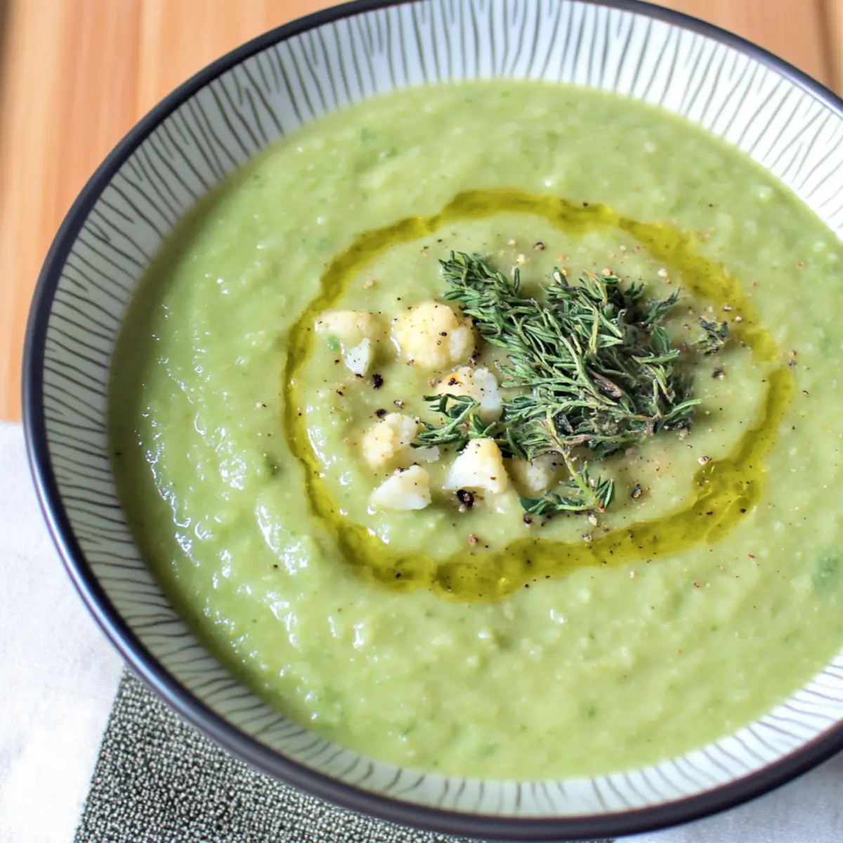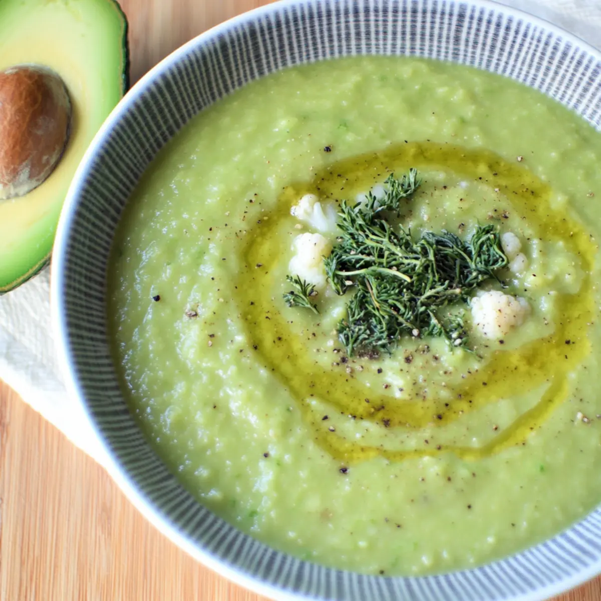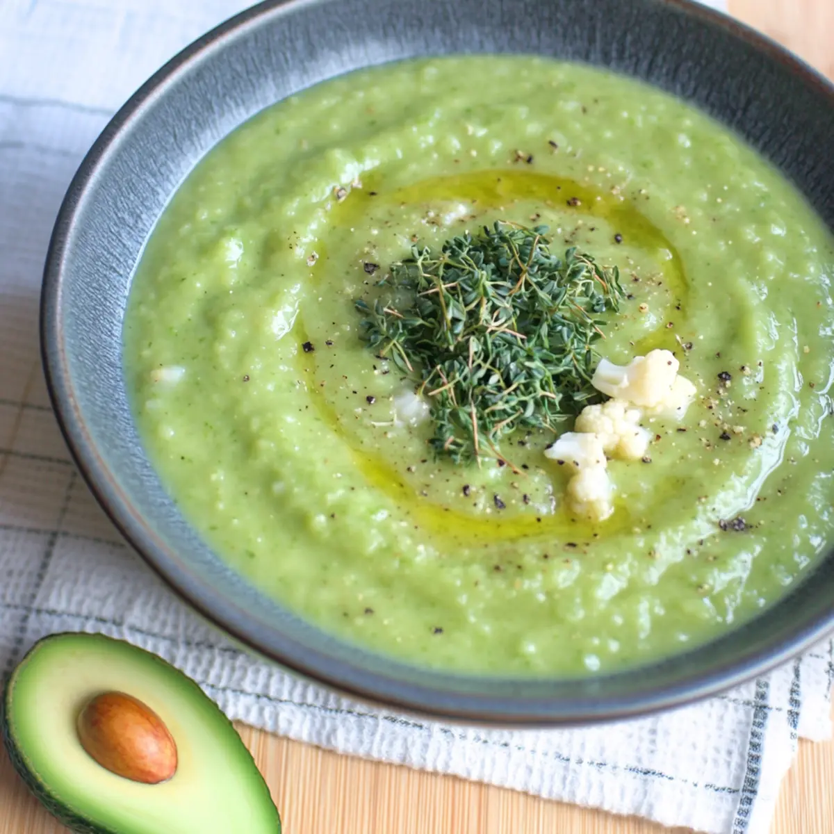 As I nestled into my cozy kitchen one brisk evening, I craved something warm and comforting that wouldn’t compromise my healthy eating goals. Enter the creamy Cauliflower Kale Avocado Soup! This vibrant bowl of goodness is not just a feast for the taste buds; it’s a nutrient-rich powerhouse that supports a healthy lifestyle. Whipping up this vegan delight is a breeze—perfect for those in a hurry yet yearning for homemade meals. Packed with anti-inflammatory goodness and a delightful creamy texture, this soup is sure to have everyone coming back for seconds. With just a handful of wholesome ingredients like roasted garlic and fresh kale, you can create a dish that nourishes both body and soul. Curious how this simple recipe can transform your mealtime experience? Let’s dive into the delightful details! Why Is This Soup a Must-Make? Creamy, Comforting Bliss: This Cauliflower Kale Avocado Soup delivers the warmth and satisfaction of a classic soup, with a modern twist that caters to your health goals. Rich in Nutrients: Overflowing with vitamins A, C, and K, this soup provides ample nutrition while keeping calories in check. Quick and Easy: With just a handful of ingredients and under an hour of prep, it’s perfect for those busy weeknights. Versatile Options: Want to spice it up? Season with smoked paprika or a squeeze of lemon juice for a refreshing kick! Plus, it pairs beautifully with a fresh salad or some crusty bread for a complete meal. Crowd-Pleasing Flavor: Whether you’re serving family or friends, the luscious blend of flavors will impress even the pickiest eaters. Keep some leftovers for a nourishing lunch or an easy dinner option! Cauliflower Kale Avocado Soup Ingredients For the Base Cauliflower – Provides a creamy texture when pureed; broccoli can be used for a similar taste and color. Kale – Adds fiber and nutrients, essential for overall health; spinach can be used for a milder flavor. Garlic (whole cloves) – Enhances flavor and boasts numerous health benefits; this ingredient is crucial for depth of flavor. Onion (1/2 medium) – Offers sweetness and depth to the soup; shallots can be substituted for a milder taste. Water (approx. 4 cups) – Serves as the base liquid for the soup; vegetable broth can enhance the flavor profile. For the Creaminess Avocado – Contributes creaminess and healthy fats; silken tofu can provide a similar texture with added protein. For Flavoring Extra-Virgin Olive Oil (2 tbsp) – Essential for roasting and flavor enhancement; avocado oil can be a neutral substitute. Thyme (1/4 tsp) and Cumin (1/4 tsp) – Add aromatic and savory notes; fresh herbs can replace dried for more vibrant flavor. Salt – To taste; adjust depending on dietary needs, but can be omitted for a low-sodium option. With these simple ingredients, you can whip up a delicious Cauliflower Kale Avocado Soup that warms your heart and soothes your soul! Step‑by‑Step Instructions for Cauliflower Kale Avocado Soup Step 1: Roast the Vegetables Preheat your oven to 400°F (200°C). On a baking sheet, combine the cauliflower florets, diced onion, and whole garlic cloves drizzled with 2 tablespoons of extra-virgin olive oil. Roast them for about 25–30 minutes, or until the cauliflower is golden brown and tender, stirring halfway through to ensure even caramelization. Step 2: Simmer the Broth In a large pot, bring approximately 4 cups of water or vegetable broth to a gentle simmer over medium heat. Add the roasted onions, garlic, and cauliflower from the oven, along with 2 cups of chopped kale. Allow this mixture to simmer for about 10 minutes, letting all the flavors meld together while the kale wilts and softens. Step 3: Add the Creamy Avocado With the soup simmering, stir in one ripe avocado, chopped into chunks. Continue to cook for an additional 5 minutes, allowing the avocado to warm and soften further. This step will contribute to the creamy texture of your Cauliflower Kale Avocado Soup, creating a delightful blend of flavors. Step 4: Blend Until Smooth Using an immersion blender, carefully puree the soup mixture until it reaches a smooth and creamy consistency. If you prefer a thinner soup, feel free to add more water or broth, blending until you achieve your desired texture. Take a moment to enjoy the vibrant green color as you blend. Step 5: Season and Serve Once blended, taste and adjust seasoning with salt and optional spices like thyme and cumin to enhance the soup’s flavor profile. Serve your warm Cauliflower Kale Avocado Soup hot, drizzled with a bit of olive oil for an extra touch of richness, and savor the comforting and nutritious goodness with each spoonful. Cauliflower Kale Avocado Soup Variations Get ready to play with your soup creation and discover delightful twists that awaken your taste buds! Creamy Chickpeas: Add a cup of canned chickpeas for extra protein and texture. These tender legumes will make the soup more filling and nutritious. Spicy Kick: Stir in red pepper flakes or a dash of cayenne for a warm, spirited heat. A hint of spice elevates the flavors beautifully and might just become your favorite twist! Herbaceous Delight: Fresh basil or cilantro can freshen up the soup right before serving. Scatter some chopped herbs on top for a burst of color and flavor. Nutty Flavor: Toasted pine nuts or sunflower seeds sprinkled on top add a delightful crunch. This adds not only flavor but a new texture that compliments the creamy soup. Lighter Citrus: A squeeze of fresh lemon or lime juice brightens the flavors. It’s the perfect way to contrast the richness of the avocado with a refreshing zing! Earthy Mushrooms: Saute some chopped mushrooms with the garlic before blending. They’ll bring an earthy depth to your creamy soup that keeps you coming back for more. Cheesy Flavor: For a cheesy twist, add nutritional yeast to the soup for umami goodness. It’s a great, dairy-free way to achieve that cozy, cheesy flavor. Root Veggie Boost: Swap