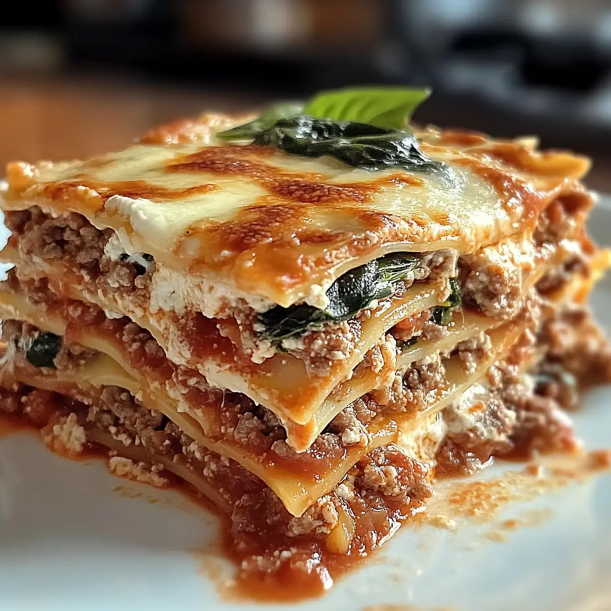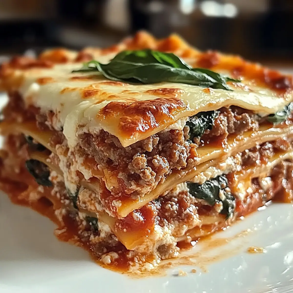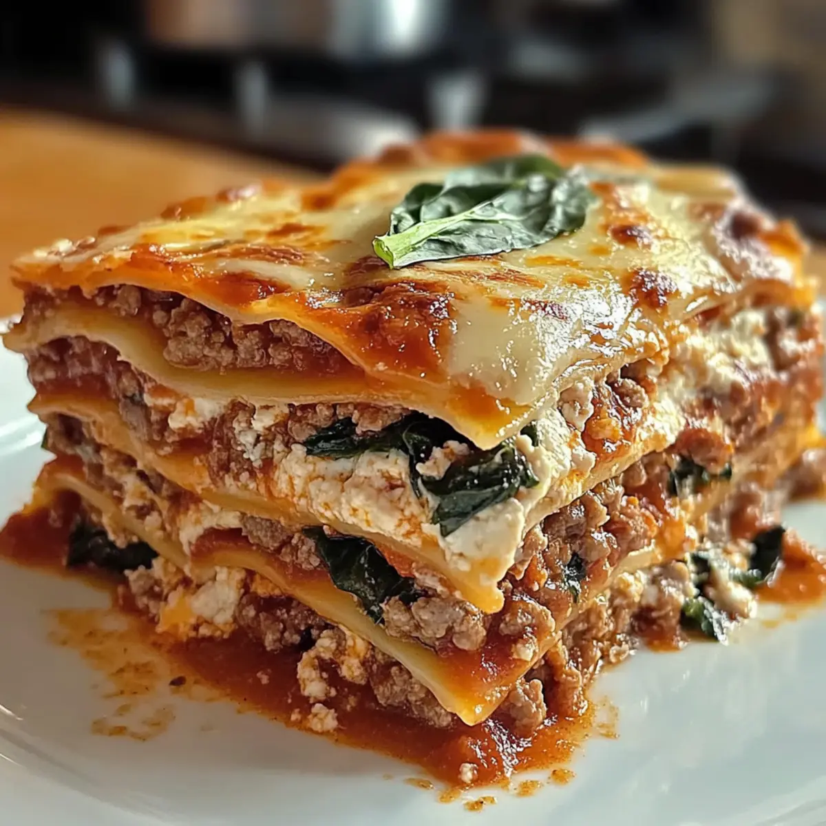 As I stirred the bubbling pot on the stove, the rich aroma of simmering tomato sauce wrapped around me like a warm hug. There’s something magical about making a classic 4 Cheese Beef Lasagna with Spinach that instantly transports me to a cozy Italian kitchen. With layers of tender ground beef, fresh spinach, and a dreamy blend of ricotta, mozzarella, Parmesan, and cheddar, this dish is not just a meal—it’s a comforting culinary experience. Ideal for busy weeknights or special gatherings, it brings everyone together at the table, all while delivering a healthy twist on a classic. Plus, it’s versatile enough to adapt to your dietary preferences, whether you’re a meat lover or looking for a lighter option. Ready to dive into this comforting delight? Let’s get cooking! Why Is This Lasagna So Special? Comforting, Warm Layers: This 4 Cheese Beef Lasagna with Spinach brings the essence of traditional Italian cooking into your home. Versatile Ingredients: Adapt the recipe with ground turkey or even plant-based proteins, making it perfect for diverse dietary preferences. Quick & Simple: With straightforward steps, you’ll have a delightful meal ready to impress in no time. Crowd-Pleasing Flavor: The combination of cheeses creates a rich, savory profile that’s sure to satisfy everyone at the table. Healthy Twist: Packed with spinach and lean protein, this dish provides a nutritious boost without sacrificing taste, similar to dishes like Broccoli Cheese Rounds or Keto Cottage Cheese. Get ready for a cozy meal that everyone will love! Cheese Beef Lasagna with Spinach Ingredients • Here’s everything you need for a truly delicious experience! For the Filling Ground Beef – A hearty protein base; feel free to substitute with ground turkey or plant-based protein for a lighter option. Spinach – Adds vibrant color and nutrients; use fresh or frozen, but make sure to drain any excess water if using frozen. Olive Oil – Perfect for sautéing; can be swapped with vegetable or canola oil for a different flavor. Onion – Enhances flavor; fresh onions are best, though dried can be used in a pinch. Garlic – Adds aromatic depth; fresh garlic will bring the best flavor. Tomato Sauce – Creates a savory base; opt for brands without added sugars for a healthier choice. For the Cheese Mixture Ricotta Cheese – Contributes creaminess; cottage cheese can be used for a lower-fat alternative. Mozzarella Cheese – Melts beautifully; go for low-moisture mozzarella for the best texture. Parmesan Cheese – Provides a nutty flavor; Grana Padano is a good substitute if needed. Cheddar Cheese – Adds extra richness; can be replaced with a blend of mozzarella and Parmesan for a milder taste. For the Lasagna Structure Lasagna Noodles – The foundation of the dish; gluten-free noodles work well if necessary. Get ready to create layers of comfort and flavor with this Cheese Beef Lasagna with Spinach! Step‑by‑Step Instructions for Cheese Beef Lasagna with Spinach Step 1: Sauté Aromatics Heat a large skillet over medium heat and add 2 tablespoons of olive oil. Once shimmering, add 1 diced onion and 2 minced garlic cloves, sautéing until the onion is translucent and fragrant, about 5 minutes. This aromatic base will enhance the flavors in your Cheese Beef Lasagna with Spinach. Step 2: Brown the Beef and Spinach Add 1 pound of ground beef to the skillet, breaking it apart with a spatula. Cook until browned and cooked through, about 7–10 minutes. Stir in 4 cups of spinach and cook until wilted, which takes about 2-3 minutes. Combine everything well, then add 2 cups of tomato sauce, mixing to incorporate. Step 3: Prepare the Cheese Mixture In a separate bowl, blend together 15 ounces of ricotta, 1 cup of shredded mozzarella, ½ cup of grated Parmesan, and ½ cup of shredded cheddar cheese until smooth. This creamy cheese mixture will create rich layers in your Cheese Beef Lasagna with Spinach, adding delightful texture and flavor. Step 4: Assemble the Lasagna Preheat your oven to 375°F (190°C). In a 9×13-inch baking dish, spread a thin layer of tomato sauce on the bottom. Layer 3 lasagna noodles over the sauce, followed by half of the beef and spinach mixture, then half of the cheese mixture. Repeat with another layer, finishing with noodles and a generous layer of remaining cheese. Step 5: Bake to Perfection Cover the lasagna with aluminum foil and bake in the preheated oven for 40 minutes. In the last 10 minutes, remove the foil to allow the top to brown and bubble. You’ll know it’s done when the cheese is golden and the edges are bubbly, creating a mouthwatering presentation. Step 6: Let it Rest Remove the lasagna from the oven and let it rest for at least 15 minutes before slicing. This resting period allows the layers to set, making it easier to serve your delicious Cheese Beef Lasagna with Spinach without losing its shape. Step 7: Garnish and Serve For an extra touch, sprinkle fresh basil or parsley on top before serving. Pair with a crisp salad or roasted vegetables for a complete meal. Enjoy the comforting flavors of your finished Cheese Beef Lasagna with Spinach with family or friends! Make Ahead Options These 4 Cheese Beef Lasagna with Spinach are ideal for meal prep enthusiasts! You can assemble the entire lasagna up to 24 hours in advance. Simply prepare the layers as directed, but cover the assembled dish tightly with plastic wrap or aluminum foil to keep it fresh. When you’re ready to bake, you may need to add an extra 5-10 minutes to the cooking time since it will go into the oven cold. Additionally, the lasagna can be frozen for up to 3 months; just make sure it’s wrapped well to prevent freezer burn. Thaw overnight in the fridge before baking for best results. This way, you can enjoy cozy, homemade comfort food with minimal effort during your busy week! What to Serve with 4 Cheese Beef Lasagna with Spinach? As the rich aroma of a baking lasagna fills your kitchen, it’s