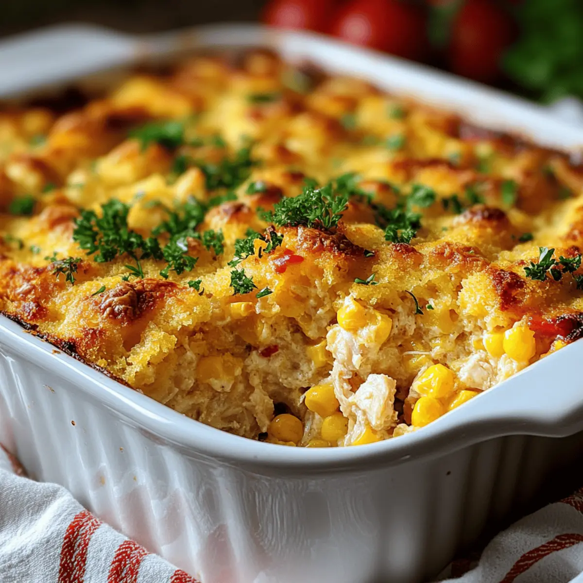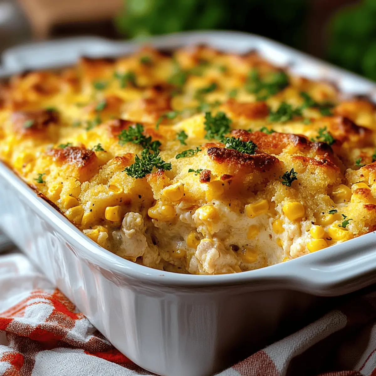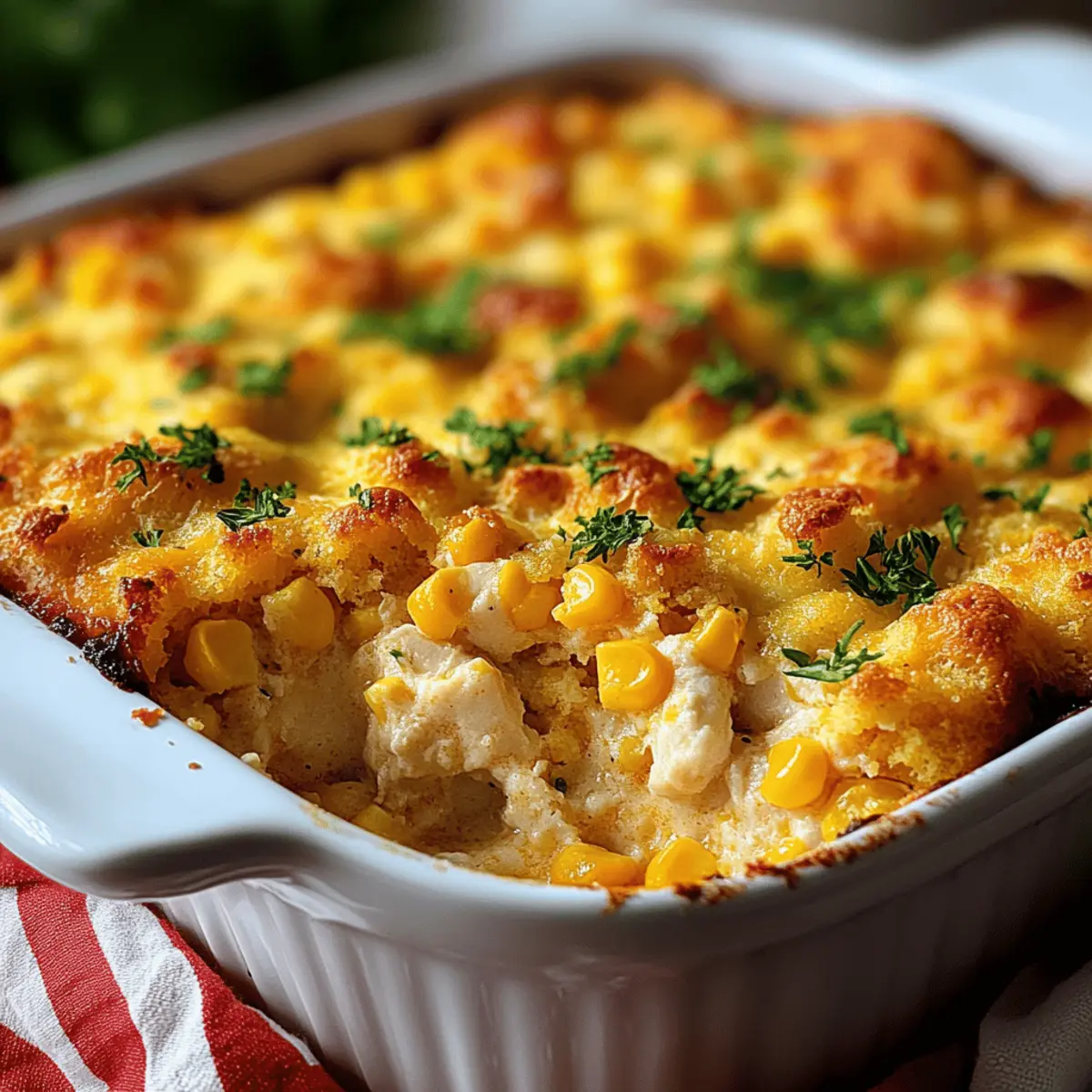 As the warm aroma of cornbread fills my kitchen, it’s impossible not to feel a wave of nostalgia wash over me. There’s something magical about a Chicken and Cornbread Casserole that brings back memories of family gatherings and cozy evenings. This comforting dish melds creamy chicken with a crispy cornbread topping, creating a perfect balance of textures that warms the soul. Plus, with just 15 minutes of prep time, it’s an effortless way to whip up a hearty meal for loved ones—ideal for those nights when you’re craving comfort food without the fuss. With each bite, you’ll experience Southern flavors at their finest, making it a delightful centerpiece for any dinner table. Ready to dive into this deliciousness? Let’s get started! Why is this casserole a must-try? Comforting flavors are at the heart of this dish, perfectly blending creamy chicken with a crunchy cornbread topping. Effortless preparation takes only 15 minutes, making it a time-saving choice for busy weekdays. Crowd-pleaser status ensures it’s loved by everyone, whether it’s a family dinner or a gathering of friends. Versatile options allow for easy customization—swap in turkey or a plant-based protein to suit your palate! For a complete meal, pair it with a fresh side salad or steamed veggies. Each bite is a taste of Southern comfort that will have everyone asking for seconds! Chicken and Cornbread Casserole Ingredients For the Casserole Cooked Chicken – Provides essential protein; rotisserie chicken is a great time-saver. Cream of Chicken Soup – Adds creamy richness; consider a homemade white sauce for extra freshness. Frozen or Canned Vegetables – Enhance both nutrition and flavor; easily accessible for quick prep. For the Topping Cornbread – Creates a delightful crispy layer; choose store-bought for convenience or whip up your favorite homemade recipe. Cheddar Cheese – Introduces a rich, cheesy flavor; sharp cheddar can amplify the taste. For Seasoning Salt & Pepper – Essential for elevating overall taste; adjust to your personal preference. Garlic Powder – Adds depth and aroma; feel free to experiment with fresh garlic for a more intense flavor. Every ingredient in this Chicken and Cornbread Casserole comes together to create the heartwarming dish you’ll cherish for years to come! Step‑by‑Step Instructions for Chicken and Cornbread Casserole Step 1: Preheat the Oven Begin by preheating your oven to 350°F (175°C). This is the ideal temperature for baking the Chicken and Cornbread Casserole, ensuring an evenly cooked dish with a golden crispy top. While the oven heats, gather all your ingredients and prepare for a delightful cooking session. Step 2: Combine the Filling In a large mixing bowl, combine the shredded cooked chicken, cream of chicken soup, and your choice of frozen or canned vegetables. Stir until everything is well mixed, creating a creamy filling. This cohesive blend will be the heart of your casserole, so take a moment to ensure it looks appealing and uniform. Step 3: Season to Taste Next, season your mixture generously with salt, pepper, and garlic powder according to your taste preferences. Each addition enhances the flavor of the Chicken and Cornbread Casserole, making it unforgettable. Mix well to distribute the seasonings evenly, creating a flavorful base for your dish. Step 4: Transfer to Baking Dish Grease a baking dish with a little oil or butter to prevent sticking, then carefully transfer the chicken mixture from the bowl to the dish. Use a spatula to spread it evenly across the bottom. This will create a deliciously creamy layer that is essential for your casserole’s texture and flavor. Step 5: Add the Cornbread Topping Crumble the cornbread evenly over the chicken mixture, ensuring every bite will have that delightful crispy topping. Try to create an even layer that completely covers the filling. This crucial step is what gives the Chicken and Cornbread Casserole its beautiful, golden-brown crust. Step 6: Sprinkle the Cheese Now, take the shredded cheddar cheese and sprinkle it generously over the crumbled cornbread layer. This adds richness and creates a delightful cheesy crust when baked. The contrast of textures between the cornbread and the melted cheese will elevate the flavors in your casserole. Step 7: Bake to Perfection Place the casserole in your preheated oven and bake for 40 minutes. Watch for bubbling edges and a beautifully golden-brown top. The Chicken and Cornbread Casserole is done when it looks invitingly crisp and the cheese is fully melted, creating a mouthwatering appearance. Step 8: Cool and Serve Once baked, carefully remove the casserole from the oven and let it cool for a few minutes. This allows the flavors to settle and makes serving easier. Scoop generous portions onto plates, and prepare to enjoy your comforting Chicken and Cornbread Casserole, perfect for family dinners or gatherings around the table. Make Ahead Options This Chicken and Cornbread Casserole is perfect for meal prep enthusiasts looking for time-saving solutions! You can prepare the filling (chicken, cream of chicken soup, and vegetables) up to 24 hours in advance. Simply mix these components and refrigerate them in a covered container. The cornbread topping can be made a few hours ahead as well. For the best quality, store the topping separately until you’re ready to bake; this prevents it from becoming soggy. When you’re ready to serve, assemble the casserole by spreading the filling in a baking dish, crumbling the cornbread on top, sprinkling with cheese, and then bake at 350°F (175°C) for about 40 minutes. This way, you’ll enjoy a comforting meal that tastes just as delicious as if you made it from scratch on the day! Expert Tips for Chicken and Cornbread Casserole Use Rotisserie Chicken: Opt for rotisserie chicken to save time while adding depth of flavor. Freshly shredded chicken also works beautifully! Avoid Soggy Cornbread: Ensure that any froze