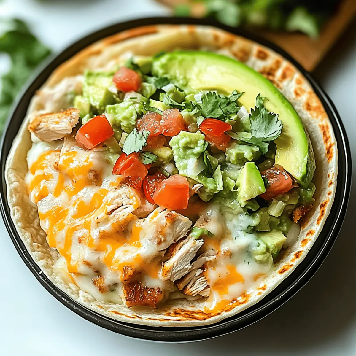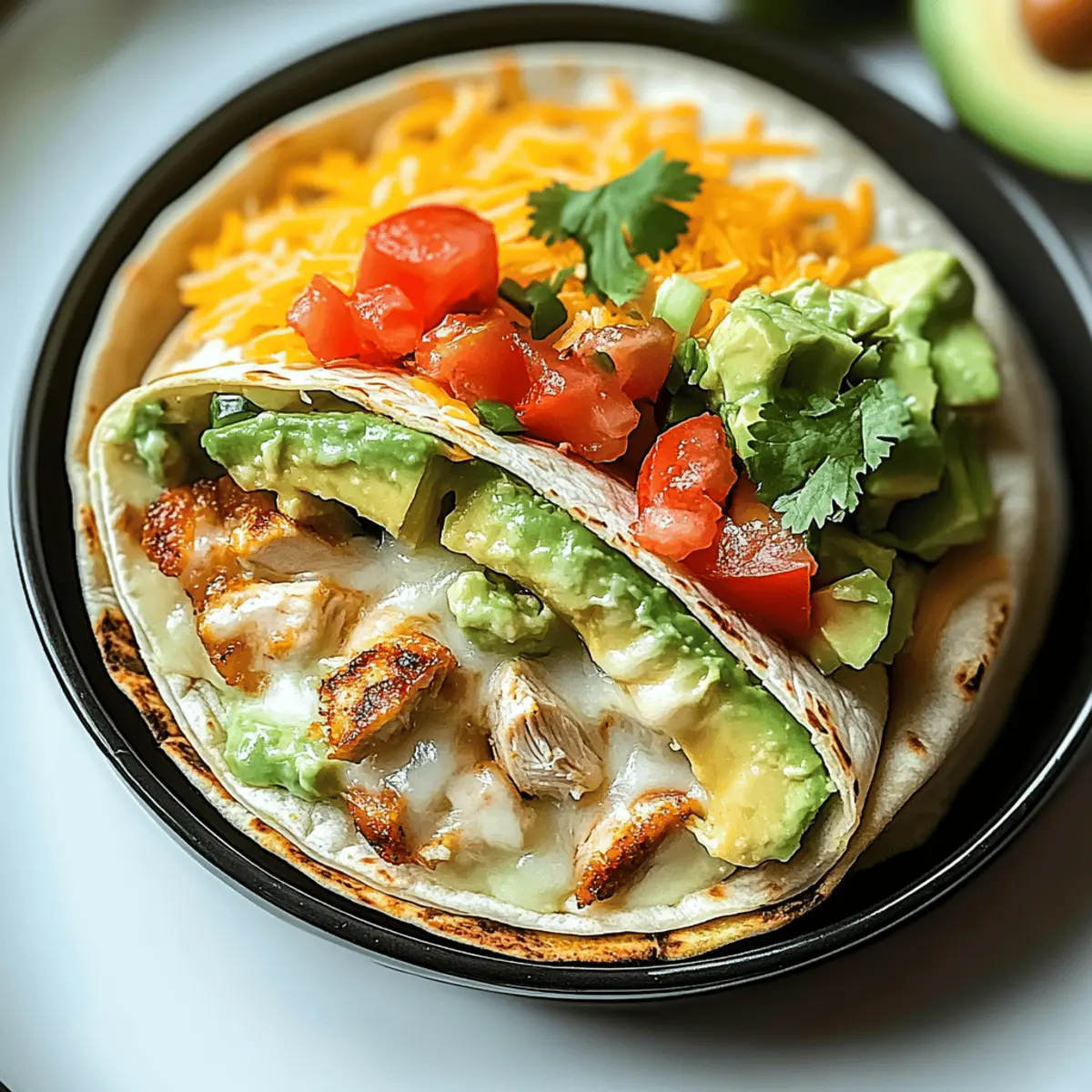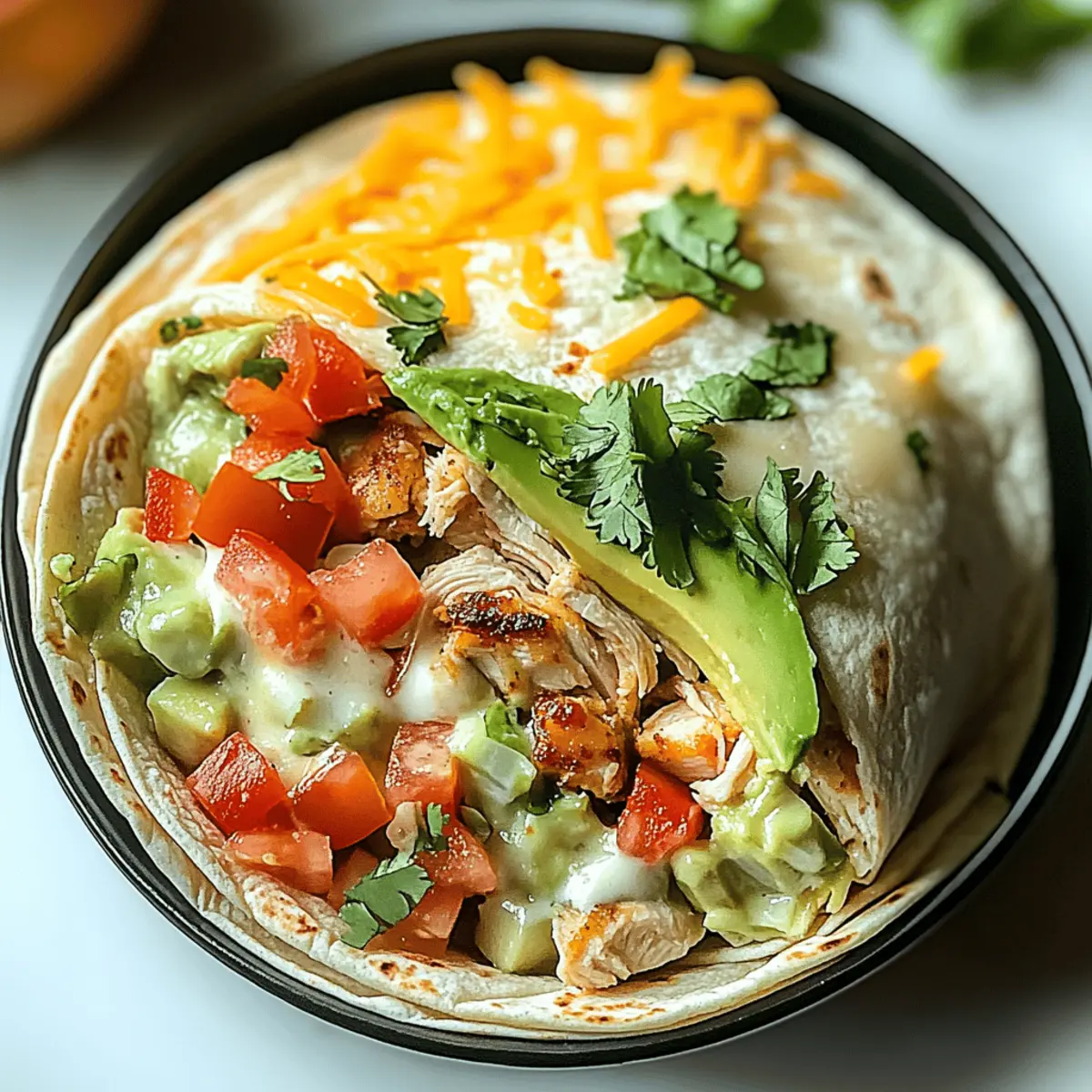 In the midst of a bustling week, I stumbled upon a vibrant twist on a classic comfort food—Chicken Avocado Ranch Burritos. Picture this: tender, juicy chicken nestled among creamy avocado, zesty ranch, and fresh veggies all wrapped in a soft tortilla. This recipe is not just delicious; it’s an easy dinner solution that’s sure to impress at any gathering. With layers of flavor and protein-rich goodness, these burritos are a delightful way to embrace home cooking over fast food. Plus, they’re perfect for meal prep, so you can enjoy the ultimate comfort food throughout the week. Are you ready to take your taste buds on a flavorful journey? Let’s roll up those burritos! Why Are These Burritos So Irresistible? Comfort Food Awesomeness: These Chicken Avocado Ranch Burritos are the perfect blend of flavors, making them a cozy choice for any night. Quick and Easy: With simple ingredients and straightforward steps, this dish is great for busy weeknights or last-minute gatherings. Protein-Packed Goodness: Each bite is loaded with juicy chicken and creamy avocado, ensuring a meal that’s satisfying and nutritious. Versatile Delight: You can easily customize them by swapping ingredients, like using shrimp or tofu for a different twist. Meal Prep Friendly: Make a batch ahead of time and enjoy them throughout the week—a smart alternative to fast food! Crowd-Pleaser: Impress family and friends with these mouthwatering burritos that are sure to disappear in no time. For an extra treat, pair them with some Garlic Parmesan Chicken or a refreshing Chickpea Feta Avocado for a well-rounded meal. Chicken Avocado Ranch Burrito Ingredients For the Burrito Filling • Chicken Breasts – The star ingredient providing a juicy, protein-packed base; for a richer flavor, substitute with boneless, skinless chicken thighs. • Olive Oil – Used for cooking; ensures chicken is moist and rich. • Garlic Powder – Adds savory warmth to the chicken. • Onion Powder – Provides mild onion flavor; complements other ingredients. • Paprika – Adds subtle smokiness for depth in flavor. • Ground Cumin – Contributes earthy warmth and slight spice to the chicken. • Salt – Enhances flavors of all ingredients. • Black Pepper – Offers a mild heat; rounds out the taste. For the Creamy Mixture • Ranch Dressing – Ties the burrito together with its creamy, tangy flavor; a must for Chicken Avocado Ranch Burritos! • Sour Cream – Balances tanginess of ranch and avocado; adds creaminess. For the Burrito Assembly • Avocados – Provides buttery richness; essential for texture. • Shredded Cheddar Cheese – Adds tangy flavor; binds filling together. • Shredded Mozzarella Cheese – Complements cheddar with mild texture and flavor. • Flour Tortillas – Soft base that holds fillings; they add slight chewiness. For Toppings & Freshness • Shredded Lettuce – Adds fresh crunch and vibrancy. • Tomatoes – Provide juicy tang; cuts through richness. • Cilantro – Introduces freshness; brightens flavor. • Lime Juice – Boosts acidity and prevents avocado browning; a great way to keep those avocados vibrant! Step‑by‑Step Instructions for Chicken Avocado Ranch Burritos Step 1: Preheat the Oven Start by preheating your oven to 375°F (190°C). This temperature is perfect for baking juicy chicken breasts to perfection. While the oven heats, gather all your ingredients, including the chicken, olive oil, and seasonings, so you’re ready to assemble your flavorful filling as soon as the oven signals it’s time to start cooking. Step 2: Season the Chicken Drizzle olive oil generously over the chicken breasts, ensuring they’re well-coated. Then, season both sides with garlic powder, onion powder, paprika, ground cumin, salt, and black pepper. Use your hands or a brush to evenly distribute the spices, which will add a burst of flavor to your Chicken Avocado Ranch Burritos while they bake. Step 3: Bake the Chicken Place the seasoned chicken breasts on a baking sheet lined with parchment paper or foil. Bake them in the preheated oven for 20-25 minutes, or until their internal temperature reaches 165°F (74°C). You’ll know they’re done when the chicken is cooked through and juices run clear, filling your kitchen with delightful aromas. Step 4: Prepare the Creamy Mixture While the chicken is baking, prepare the creamy filling by mashing ripe avocados in a bowl. Add a squeeze of lime juice to prevent browning and enhance flavor. In a separate bowl, mix together ranch dressing and sour cream until smooth. This creamy mixture will be the heart of your Chicken Avocado Ranch Burritos, delivering tangy goodness in every bite. Step 5: Shred the Chicken Once the chicken breasts are fully cooked, remove them from the oven and let them rest for a few minutes. This resting time allows the juices to redistribute. Then, using two forks or your hands, shred the chicken into bite-sized pieces. The tender, juicy pieces will be the star of your Chicken Avocado Ranch Burritos, ensuring every bite is packed with flavor. Step 6: Warm the Tortillas To make the tortillas more pliable and easier to roll, warm them in a microwave or skillet. If using a microwave, place a few tortillas on a plate covered with a damp paper towel and heat for about 30-45 seconds. Or, in a skillet, heat them for about 15 seconds on each side, just until warm and slightly toasted. Step 7: Assemble the Burritos Take a warm tortilla and spread a generous layer of the creamy ranch mixture in the center. Top with a portion of shredded chicken, a dollop of mashed avocado, and generous amounts of shredded cheddar and mozzarella cheese for that melty goodness. Add shredded lettuce, diced tomatoes, and chopped cilantro for fresh crunch and flavor, your Chicken Avocado Ranch Burritos are ready to be rolled. Step 8: Roll and Crisp the Burritos Carefully roll the tortilla tightly around the filling, tucking in the sides as you go for a secure wrap