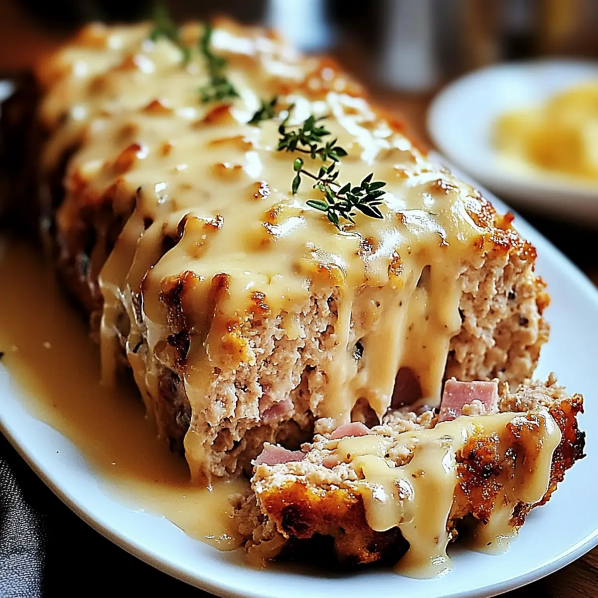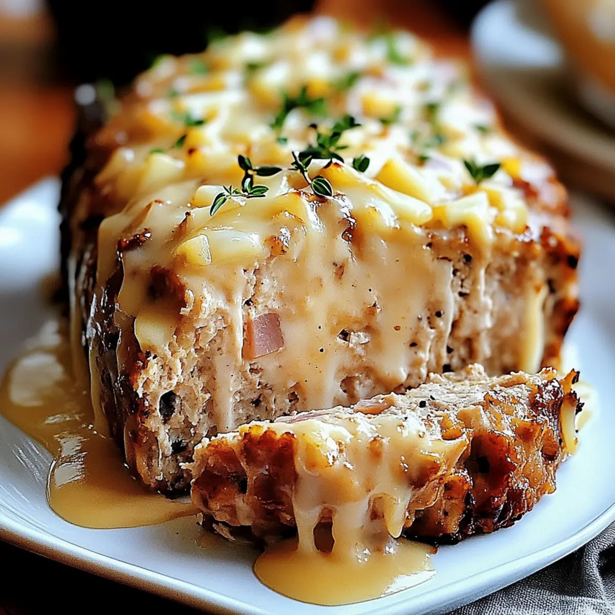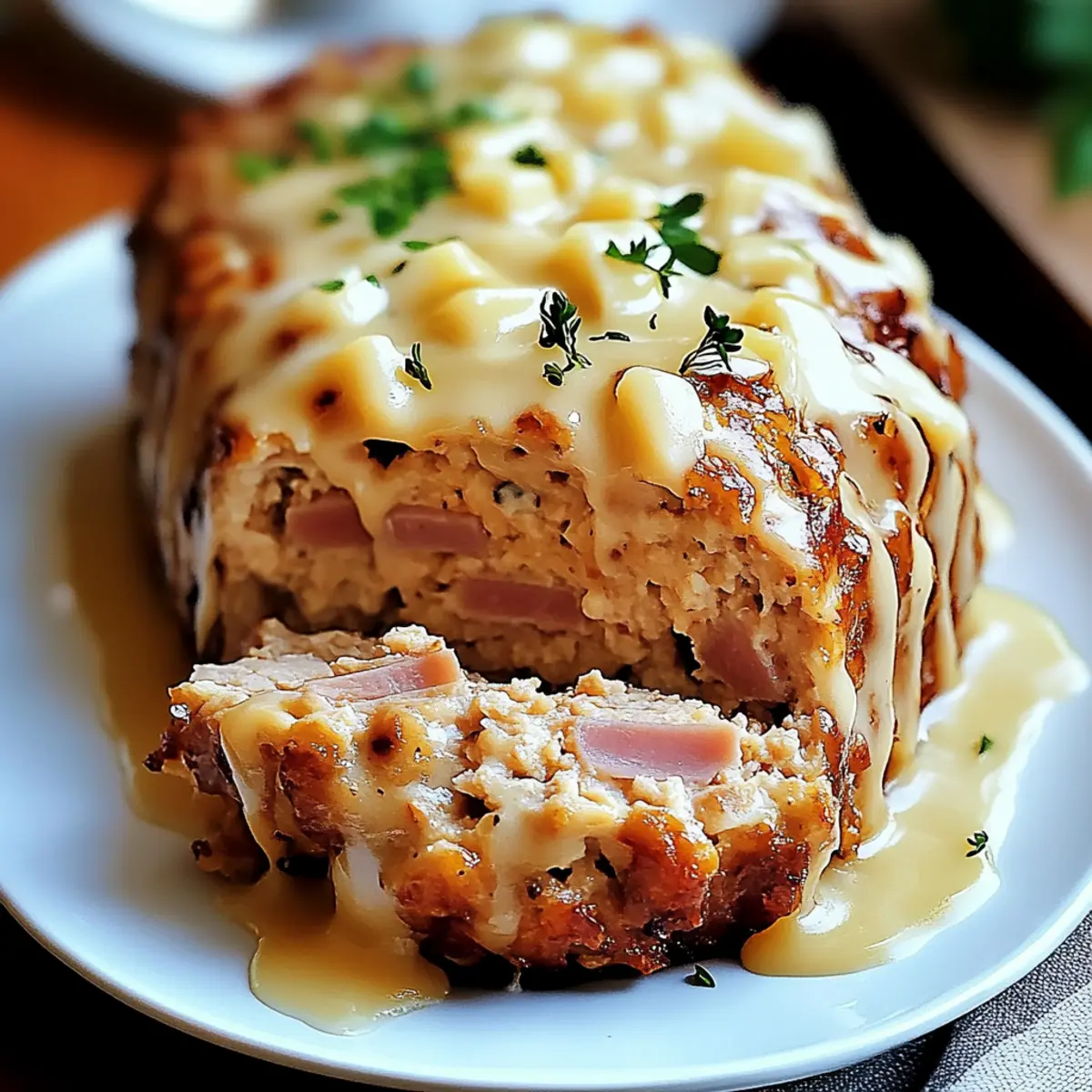 As I chopped onions and reached for the ground chicken, I couldn’t shake the feeling that comfort food deserves a delightful twist. That’s when the idea of Chicken Cordon Bleu Meatloaf came to life—melding the succulent flavors of tender chicken, smoky ham, and creamy Swiss cheese into one cozy dish. A perfect choice for those busy weeknights or family gatherings, this easy recipe transforms a classic into something extraordinary! Not only does it whip up quickly, but it also promises to satisfy everyone at the table—comfort food doesn’t get better than this. Ready to create a culinary masterpiece that dazzles and delights? Let’s dive into how to make this mouthwatering meatloaf! Why is Chicken Cordon Bleu Meatloaf Amazing? Comforting Twist: This meatloaf offers a unique take on a classic, transforming traditional flavors into an inviting dish perfect for cozy nights. Easy to Prepare: Busy cooks rejoice! With simple ingredients and preparation, this recipe comes together effortlessly—ideal for weekdays. Crowd-Pleasing Goodness: Whether it’s family dinners or gatherings with friends, this hearty meatloaf is sure to impress everyone. Versatile Options: Customize it to your liking! From turkey twists to veggie boosts, you can easily modify for dietary needs or flavor preferences. Flavour Explosion: Each bite is a savory blend of chicken, ham, and cheese, delivering a deliciously rich comfort food experience that evokes warmth and happiness. Elevate your meal with sides like creamy mashed potatoes or roasted vegetables to make it a complete feast! Chicken Cordon Bleu Meatloaf Ingredients For the Meatloaf Base: Ground Chicken – The main protein source that provides flavor; you can substitute with ground turkey for a lighter option. Onion – Adds essential moisture and sweetness; yellow or white onions work best for this dish. Garlic – Infuses aromatic depth; fresh minced is superior, but powdered can work in a pinch. Egg – Acts as a binder for all the ingredients; consider a flax egg for a vegan alternative. Dijon Mustard – Introduces a nice tang; for a sweeter alternative, use honey mustard. Parmesan Cheese – Adds rich flavor; substitute with Pecorino for a little extra sharpness. Parsley – Freshens up the dish with color; dried parsley can be used if fresh isn’t available. Salt & Pepper – Essential seasonings; adjust to suit your taste preferences. Panko Breadcrumbs – Creates a delightful crunch; substitute with gluten-free breadcrumbs if necessary. Ham Slices – Vital for that Cordon Bleu flavor; prosciutto can offer a saltier option. Swiss Cheese – Melts beautifully for creaminess; Gruyère can add a nuttier layer of flavor. For the Topping: Butter – Provides richness and flavor; olive oil is a healthier substitute if preferred. Flour – Thickens the creamy sauce; cornstarch can work as a gluten-free alternative. Milk – Serves as the base for the sauce; opt for non-dairy alternatives for lactose intolerance. Step‑by‑Step Instructions for Chicken Cordon Bleu Meatloaf Step 1: Preheat the Oven Begin by preheating your oven to 350°F (175°C) while greasing a loaf pan with a little cooking spray or butter. This ensures your Chicken Cordon Bleu Meatloaf will have a lovely golden-brown crust as it bakes. Gather all the ingredients and equipment you’ll need, including a mixing bowl and parchment paper for easy handling. Step 2: Prepare the Ingredients Next, finely dice the onion, mince the garlic, and chop the fresh parsley. Place these aromatics in a bowl to make adding them to the Chicken Cordon Bleu Meatloaf mixture easier later. Taking this step will enhance the flavors of your dish, making every bite delightful! Step 3: Mix the Meatloaf Base In a large mixing bowl, combine the ground chicken, prepared onion, minced garlic, egg, Dijon mustard, Parmesan cheese, chopped parsley, and a generous pinch of salt and pepper. Gently fold in 1/4 cup of panko breadcrumbs, ensuring everything is evenly mixed without overworking the mixture, which could lead to a dense meatloaf. Step 4: Shape the Meatloaf On a piece of parchment paper, shape the mixture into an 8×12-inch rectangle. Make sure the dimensions are even to ensure even baking. Lay slices of ham and Swiss cheese on top, leaving about an inch around the edges. This step is crucial for your Chicken Cordon Bleu Meatloaf, as it brings the classic flavors into each slice! Step 5: Roll It Up Using the parchment paper to assist, carefully roll the mixture like a log, tucking in the sides as you go. Pinch the seams together to secure the filling, then place the rolled meatloaf seam-side down in the greased loaf pan. This technique traps all the delicious flavors inside, making each slice a savory delight. Step 6: Add the Crunchy Topping In a small bowl, mix the remaining panko breadcrumbs with melted butter until well combined. Sprinkle this mixture evenly over the top of the meatloaf for a crispy finish. This step will enhance the texture and visual appeal, making your Chicken Cordon Bleu Meatloaf even more tempting! Step 7: Bake to Perfection Place the loaf pan in the preheated oven and bake for about 75 minutes, or until the internal temperature reaches 165°F (74°C). If the top browns too quickly, loosely cover it with aluminum foil. The meatloaf should be firm to the touch and beautifully golden when done. Step 8: Make the Creamy Sauce While the meatloaf bakes, melt a tablespoon of butter in a saucepan over medium heat. Whisk in an equal amount of flour, then gradually stir in milk, cooking until it thickens into a smooth sauce. Mix in a touch of Dijon mustard and grated Parmesan cheese to infuse rich flavor into your sauce, perfect for drizzling over slices. Step 9: Rest and Serve Once baked, remove the Chicken Cordon Bleu Meatloaf from the oven and allow it to rest for 10 minutes before slicing. This resting period ensures that each slice holds its shape. Serve your meatloaf drizzled with the cr