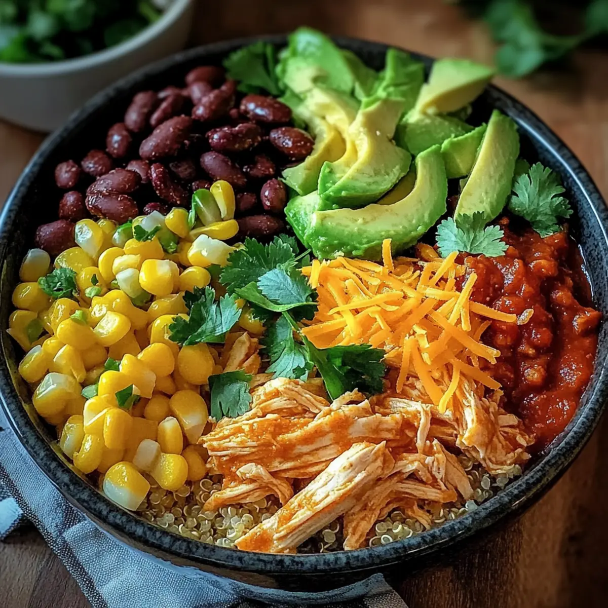 “On a particularly hectic evening last week, I found myself rummaging through the fridge, desperate for a tasty meal that wouldn’t take hours to prep. That’s when I realized I had all the ingredients to whip up my go-to High Protein Chicken Enchilada Bowls. These delightful bowls marry the comfort of Tex-Mex flavors with the nutritional punch of shredded chicken, quinoa, and black beans, all drenched in a zesty enchilada sauce. Not only are they a breeze to prepare—which is a lifesaver on busy nights—but they also pack a protein-rich punch that keeps you satisfied long after dinner. Ready to transform your weeknight menu into something scrumptious and healthy? Let’s get cooking!” Why are Chicken Enchilada Bowls a must-try? Flavor Explosion: Each bite of these enchilada bowls is a medley of spicy and savory tastes, thanks to the enchilada sauce and perfectly seasoned chicken. Nutritious and Filling: Packed with about 20-25g of protein, they satisfy your hunger without the guilt. Beginner-Friendly: Even novice cooks can whip these up in no time—just mix, bake, and enjoy! Versatile Meal Prep: Make it ahead and store for later, perfect for busy weeknights or lunch at work. Plus, try pairing with Cheesy Garlic Chicken for varied meal experiences! Chicken Enchilada Bowls Ingredients For the Chicken Base • Shredded Chicken (2 cups) – Adds protein and substance; use rotisserie or grilled chicken for convenience. • Cooked Quinoa (1 cup) – Provides a nutty flavor and boosts protein content; can substitute with brown rice, farro, or cauliflower rice. • Black Beans (1 can, 15 oz) – Introduces fiber and earthiness; remember to rinse and drain before use. • Frozen Corn (1 cup) – Adds sweetness and color; fresh corn can be used if available. • Diced Tomatoes (1 cup) – Contributes juiciness and tang; canned or fresh tomatoes are acceptable. • Enchilada Sauce (1 cup) – Offers spice and moisture to the dish; choose red or green based on preference. For Seasoning • Ground Cumin (1 teaspoon) – Enhances flavor with a warm, earthy note. • Chili Powder (1 teaspoon) – Provides heat and depth to the Chicken Enchilada Bowls. • Garlic Powder (½ teaspoon) – Infuses a savory taste. • Onion Powder (½ teaspoon) – Adds back-end flavor. • Salt and Pepper – For seasoning, to taste. For Topping and Garnish • Shredded Cheese (1 cup) – Creates a melty topping; use cheddar or a cheese blend. • Avocado (1, diced) – For garnishing, adds creaminess. • Fresh Cilantro (¼ cup, chopped) – Adds brightness and freshness. • Lime Wedges – For serving, they brighten flavors. Step‑by‑Step Instructions for Chicken Enchilada Bowls Step 1: Preheat Your Oven Begin by preheating your oven to 375°F (190°C). This ensures the chicken enchilada bowls bake evenly and reach that perfect bubbly, melted cheese stage. While the oven heats up, gather your ingredients and have a large mixing bowl on hand for the next steps. Step 2: Combine Ingredients In a large mixing bowl, combine the shredded chicken, cooked quinoa, black beans, frozen corn, and diced tomatoes. Pour in half of the enchilada sauce, then stir well to ensure every ingredient is coated with the flavorful sauce. The mixture should look vibrant and inviting, signaling it’s almost ready for the oven. Step 3: Season the Mixture Next, sprinkle the ground cumin, chili powder, garlic powder, onion powder, salt, and pepper over the chicken mixture. Stir thoroughly, making sure the seasonings are evenly distributed. As you mix, you should start to notice the aroma of the spices blending together, adding depth to your chicken enchilada bowls. Step 4: Prepare for Baking Spread the seasoned mixture evenly into a baking dish, creating a well-distributed base for your enchilada bowls. Use a spatula to smooth out the top and ensure everything is packed nicely. This preparation step helps the mixture cook evenly and ensures each bite is bursting with flavor. Step 5: Add the Sauce Pour the remaining enchilada sauce evenly over the chicken mixture in the baking dish, allowing the sauce to cover all corners. The sauce will not only enhance the flavor but also keep everything moist as it bakes. This layer will blend beautifully with the other ingredients as it cooks. Step 6: Top with Cheese Sprinkle the shredded cheese generously over the top of the chicken enchilada bowls. Aim for an even layer to create that delicious, gooey topping that melts beautifully in the oven. Visualize how that bubbly cheese will transform your dish into a comforting, inviting meal. Step 7: Bake and Watch for Bubbles Place the prepared dish in your preheated oven and bake for 20-25 minutes. Keep an eye out for the cheese melting and bubbling—this is your cue to know it’s almost ready. The edges might turn a lovely golden brown, signaling that your chicken enchilada bowls are cooked to perfection. Step 8: Cool and Serve Once baked, remove the dish from the oven and allow it to cool for a few minutes. This resting time helps set the layers for easier serving. As you let it cool, prepare your garnishes, ensuring you have diced avocado, chopped cilantro, and lime wedges ready for an extra flavor boost. Step 9: Garnish and Enjoy Serve the chicken enchilada bowls in individual portions, topped with the diced avocado and fresh cilantro. Squeeze lime juice over each bowl for a zesty finish that brightens the flavors. Each serving should reflect the delicious, hearty nature of the dish, perfect for a satisfying meal. Expert Tips for Chicken Enchilada Bowls Mix Uniformly: Ensure all ingredients are well-combined for balanced flavor throughout the Chicken Enchilada Bowls; uneven mixing might leave some bites bland. Let It Rest: Allow the dish to cool slightly after baking. This helps set the layers, making it easier to serve and enhancing the overall texture. Customize Heat Levels: For more spice, mix in diced jalapeños or use a hotter enchilada sauc