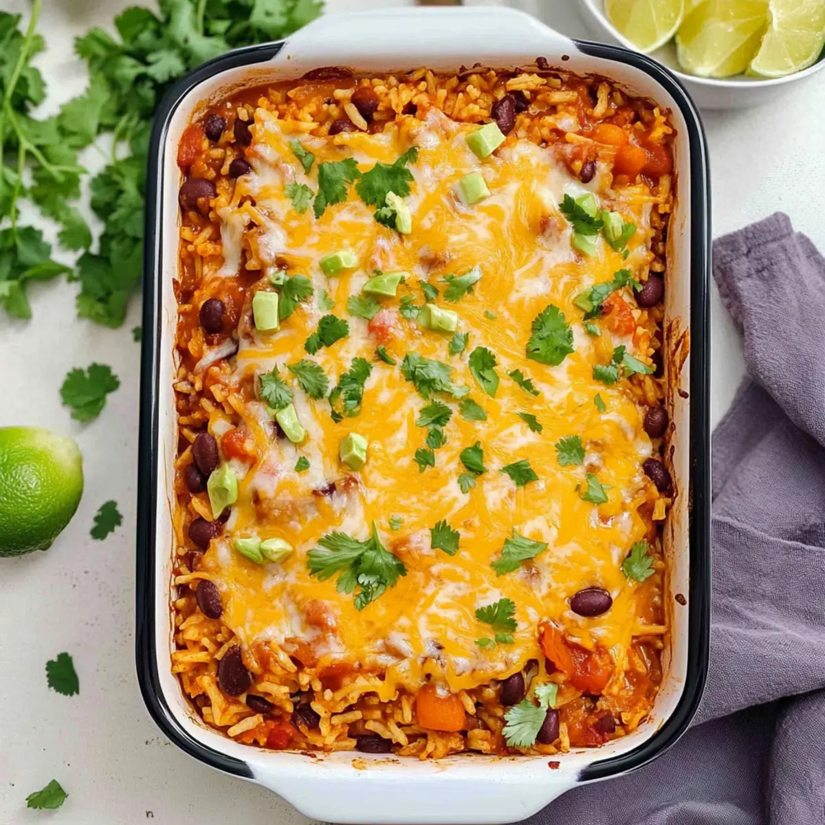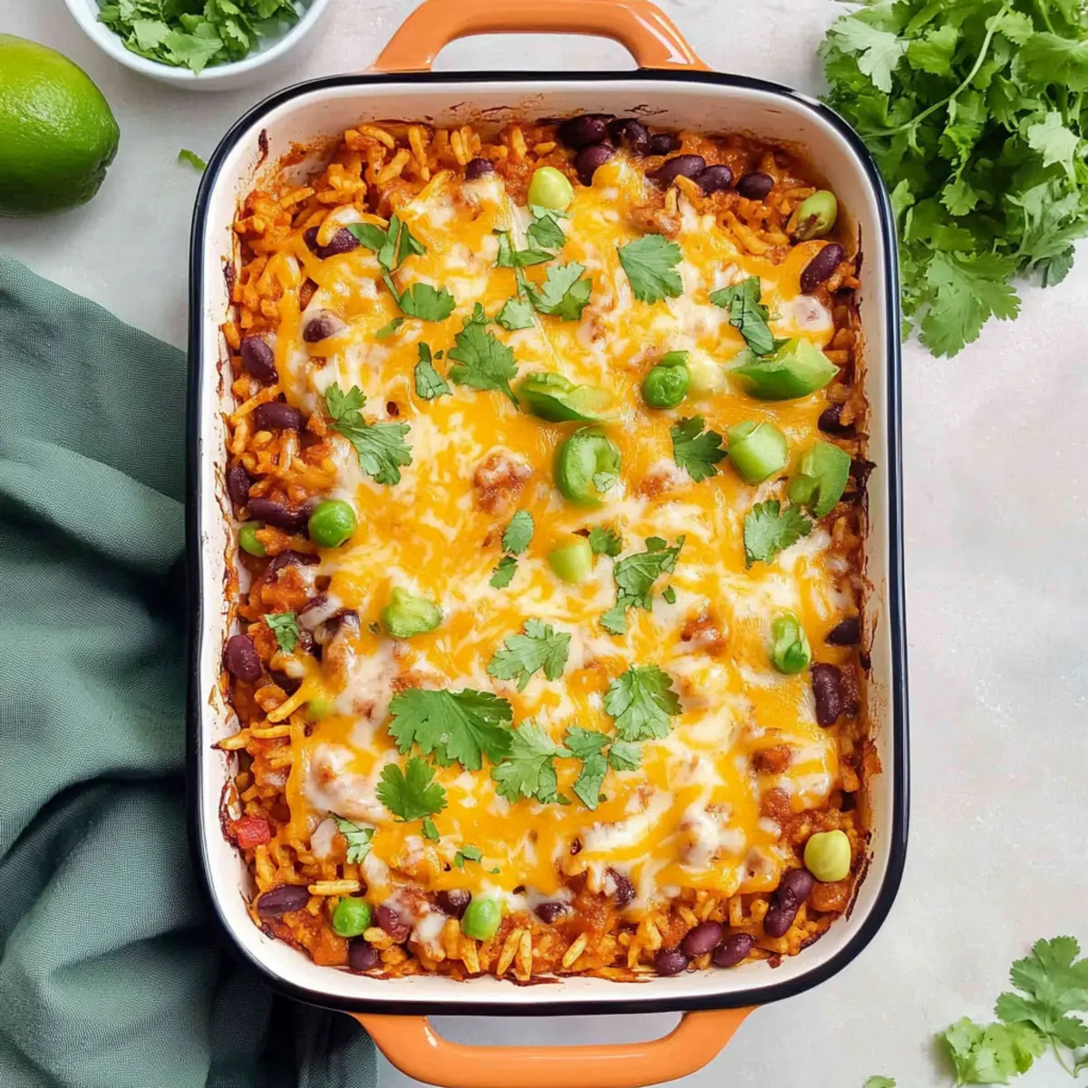 Once the rice is cooked to perfection, remove the casserole from the oven and carefully mix in the lime juice and zest. Fold in half of the shredded cheddar cheese, allowing it to melt slightly into the warm casserole. Sprinkle the remaining cheese on top, creating a beautiful layer ready to bubble up in the next baking step.