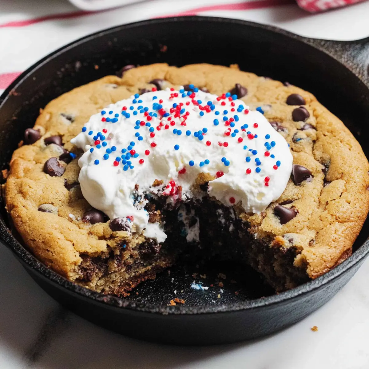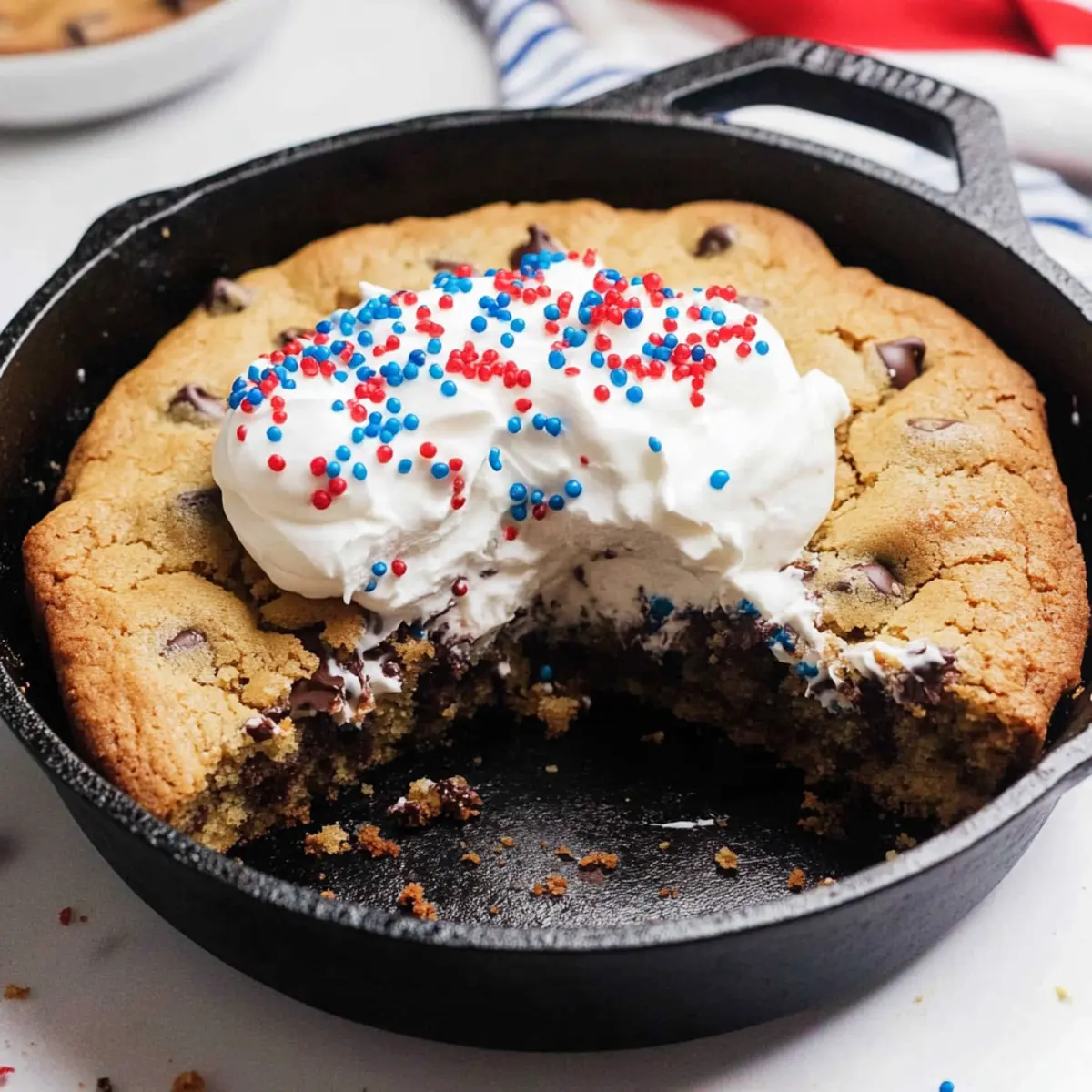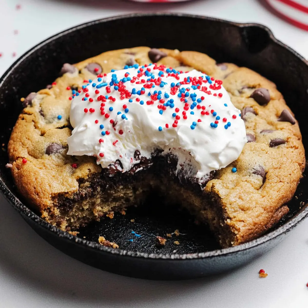 Let the cookie cake cool in the skillet for at least 30 minutes after removing it from the oven. This cooling time helps set the cake, making it easier to slice. Once cooled, dollop generous amounts of whipped cream on top and sprinkle with vibrant red and blue sprinkles for a festive finish before serving.