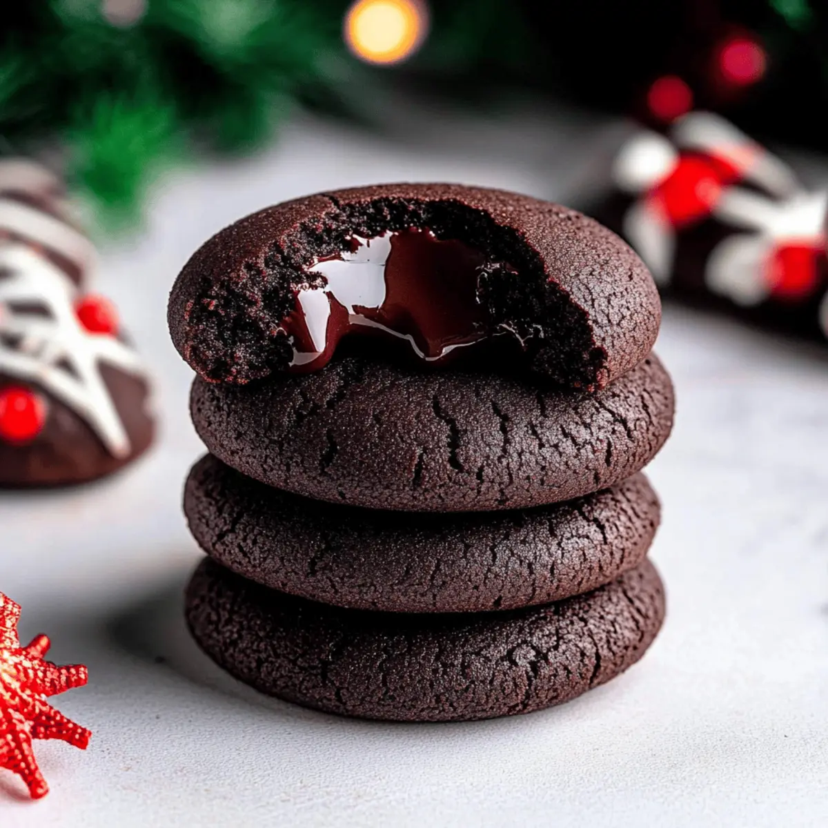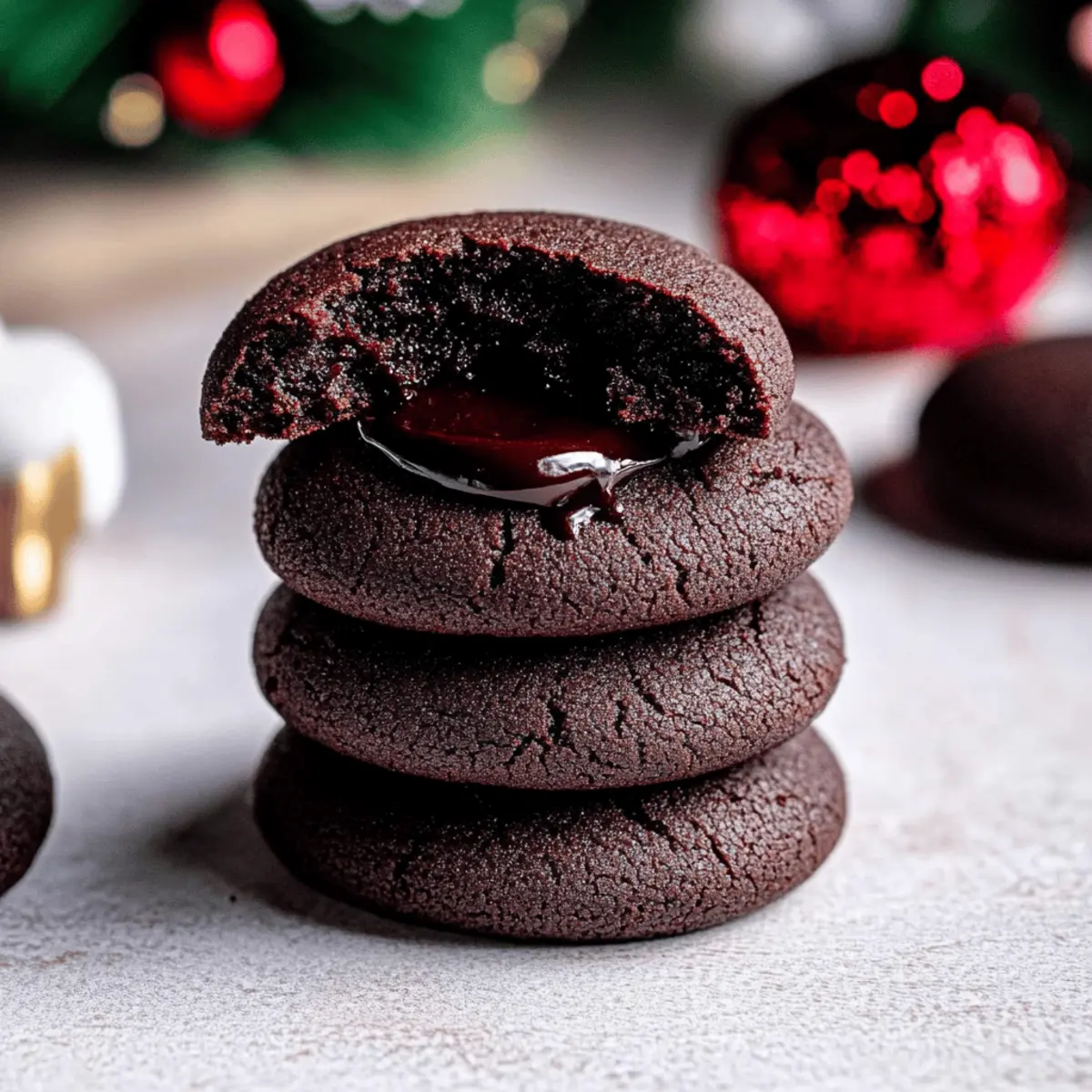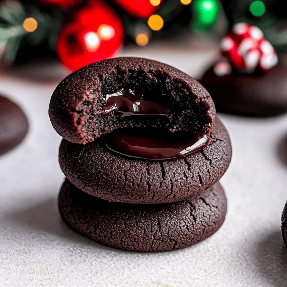 As I pulled my first batch of rich chocolate thumbprint cookies from the oven, the warm, sweet aroma spread through my kitchen, wrapping me in a cozy embrace. These delightful cookies, featuring silky ganache centers, are perfect for holiday gatherings or cookie exchanges, making them an irresistible treat for both friends and family. With their chewy texture and simple ingredients, this easy recipe allows anyone to bake impressive goodies in no time. Whether you’re a passionate home-chef or just looking to swap out takeout for something homemade, these Chocolate Thumbprint Cookies will surely become a favorite in your dessert lineup. What fun twist will you put on yours? Why are these cookies a must-try? Irresistible Chocolate Flavor: Each bite is bursting with rich chocolate goodness, perfectly complemented by a silky ganache center. Easy to Make: With straightforward steps and simple ingredients, these cookies are beginner-friendly, ensuring success for everyone. Perfect for Celebrations: Whether it’s a holiday gathering or a cookie exchange, these treats are guaranteed to impress your guests. Creative Customizations: Add your twist with flavor variations like peppermint or crushed nuts, allowing you to personalize each batch. Crowd-Pleasing Delight: The chewy texture and decadent ganache make these cookies beloved by chocolate lovers of all ages, perfect for sharing or gifting. With so many reasons to love these Chocolate Thumbprint Cookies, how can you resist? They pair beautifully with a cup of coffee or milk, making them a delightful treat anytime. Chocolate Thumbprint Cookies Ingredients • Here’s everything you need to create these delectable cookies! For the Cookie Dough All-purpose flour – Provides structure and texture; be sure to measure correctly to prevent dry cookies. Dutch-process cocoa powder – Adds a rich chocolate flavor; natural cocoa can be used for a lighter taste. Salt – Enhances the sweetness and balances overall flavors beautifully. Baking powder – Helps cookies rise slightly for that tender, chewy bite. Unsalted butter – Adds moisture and richness; margarine can be used if needed. Light brown sugar – Contributes moisture and a hint of molasses flavor; dark brown sugar can deepen that flavor. Granulated white sugar – Sweetness enhancer; substitute with coconut sugar for a healthier alternative. Egg yolks – Provide richness and moisture; make sure they’re at room temperature for best results. Vanilla bean paste/extract – Enhances the overall flavor richness; pure vanilla extract works perfectly as a substitute. For the Ganache Filling Semi-sweet chocolate chips – Use for a silky ganache center; dark or milk chocolate chips are great alternatives. Heavy whipping cream – Creates a luxurious ganache; half-and-half can be used for a lighter texture. For Decoration (Optional) Nonpareils – Perfect for adding a decorative touch; omit if you’d like to keep it simple. With these ingredients at hand, you’re well on your way to baking some unforgettable Chocolate Thumbprint Cookies that will leave everyone asking for more! Step‑by‑Step Instructions for Chocolate Thumbprint Cookies Step 1: Preheat the Oven Begin by preheating your oven to 350°F (175°C). While the oven warms up, line two baking sheets with parchment paper to ensure your Chocolate Thumbprint Cookies don’t stick. Having everything ready will make the baking process smooth, so take a few moments to set up your workspace. Step 2: Combine Dry Ingredients In a medium bowl, whisk together 1 ¾ cups of all-purpose flour, ½ cup of Dutch-process cocoa powder, ½ teaspoon of salt, and ½ teaspoon of baking powder. This mixture forms the base of your cookie dough, and whisking will help to evenly distribute the dry ingredients. Set the bowl aside for the next step. Step 3: Cream the Butters and Sugars In a large mixing bowl, cream together ½ cup of unsalted butter and ½ cup each of light brown sugar and granulated sugar until the mixture is light and fluffy, about 2 minutes using an electric mixer. This step is crucial for achieving that tender, chewy texture in your Chocolate Thumbprint Cookies, so don’t rush! Step 4: Incorporate Eggs and Vanilla Next, add 2 room-temperature egg yolks and 1 teaspoon of vanilla bean paste (or extract) to the creamed mixture. Beat until the mixture is pale and fluffy, which should take about 1 to 2 minutes. The egg yolks contribute to the rich flavor and moistness of your cookies, making this step important for achieving that perfect bite. Step 5: Mix in Dry Ingredients Gradually add the flour mixture to the wet mixture, mixing just until combined. Be careful not to overmix, as this can affect the texture of your Chocolate Thumbprint Cookies. You want a dough that holds together but is still soft and pliable, allowing for effortless shaping. Step 6: Shape the Dough Scoop dough into about 34 portions and roll them into balls, roughly 1 inch in diameter. Using your thumb or a ¼ teaspoon measuring spoon, create an indent in the center of each ball. This is where the ganache will later fill, so make sure the indent is deep enough. Chill the indented dough for at least 1 hour to help them hold their shape while baking. Step 7: Bake the Cookies Once the dough has chilled, place the cookies on the prepared baking sheets, spaced about 2 inches apart. Bake in the preheated oven for 9 to 11 minutes, until the edges are set but the centers still look soft. If necessary, press down gently on the centers again after baking to redefine the indent, ensuring ample space for the ganache. Step 8: Cool on the Baking Sheets After baking, remove the cookie sheets from the oven and let the cookies cool for about 5 minutes. This resting time allows them to firm up slightly. Then, gently transfer the cookies to a wire rack to cool completely. This step is crucial for achieving the right chewy texture in your finished Chocolate Thumbprint Cookies. Step 9: Prepare
