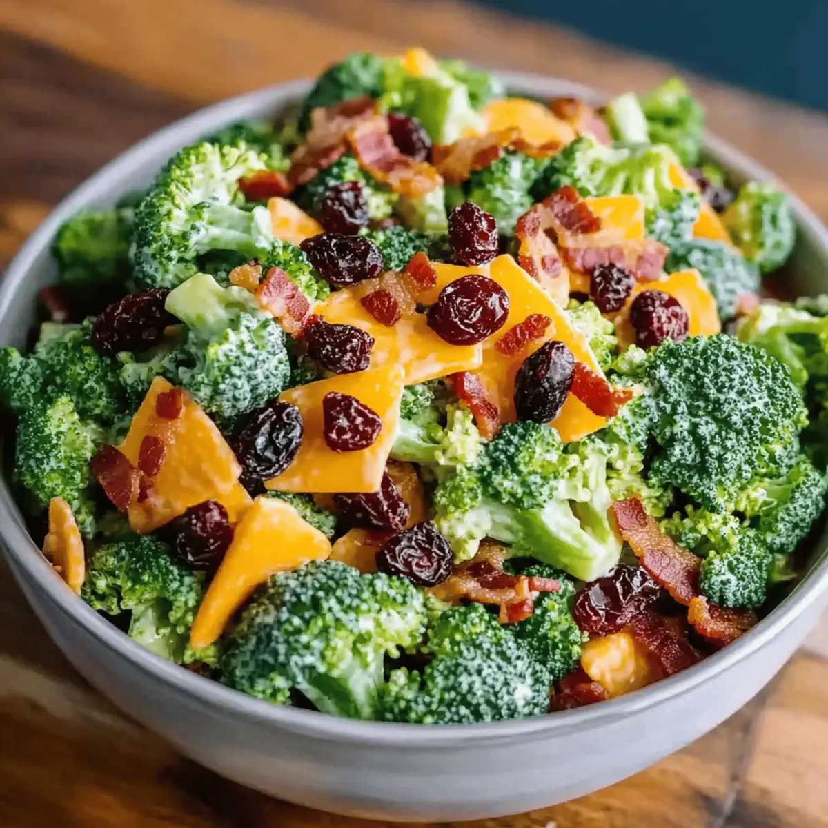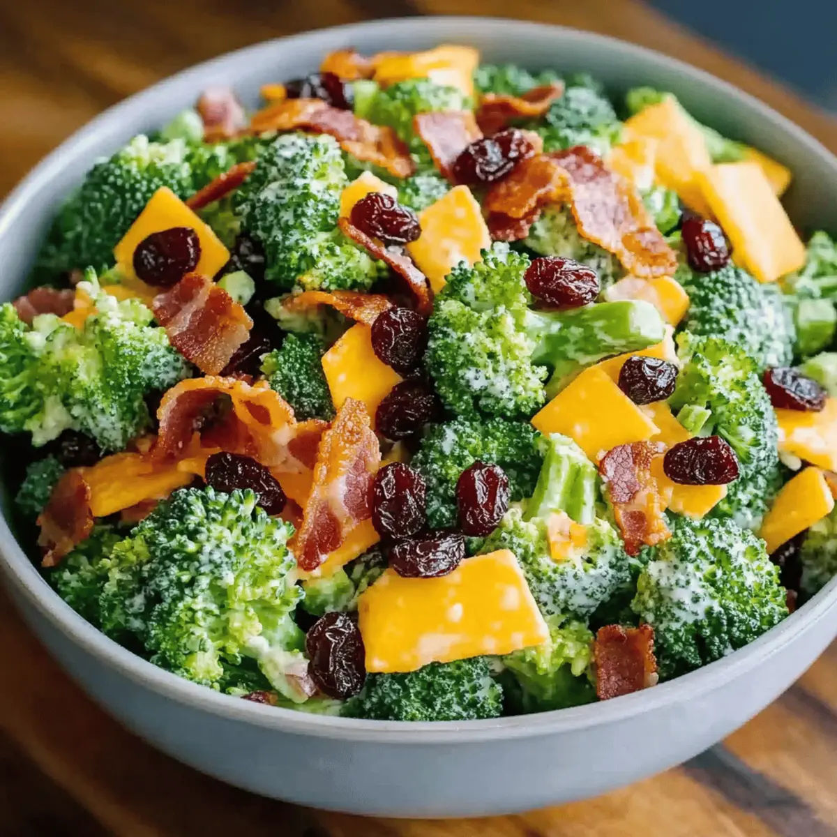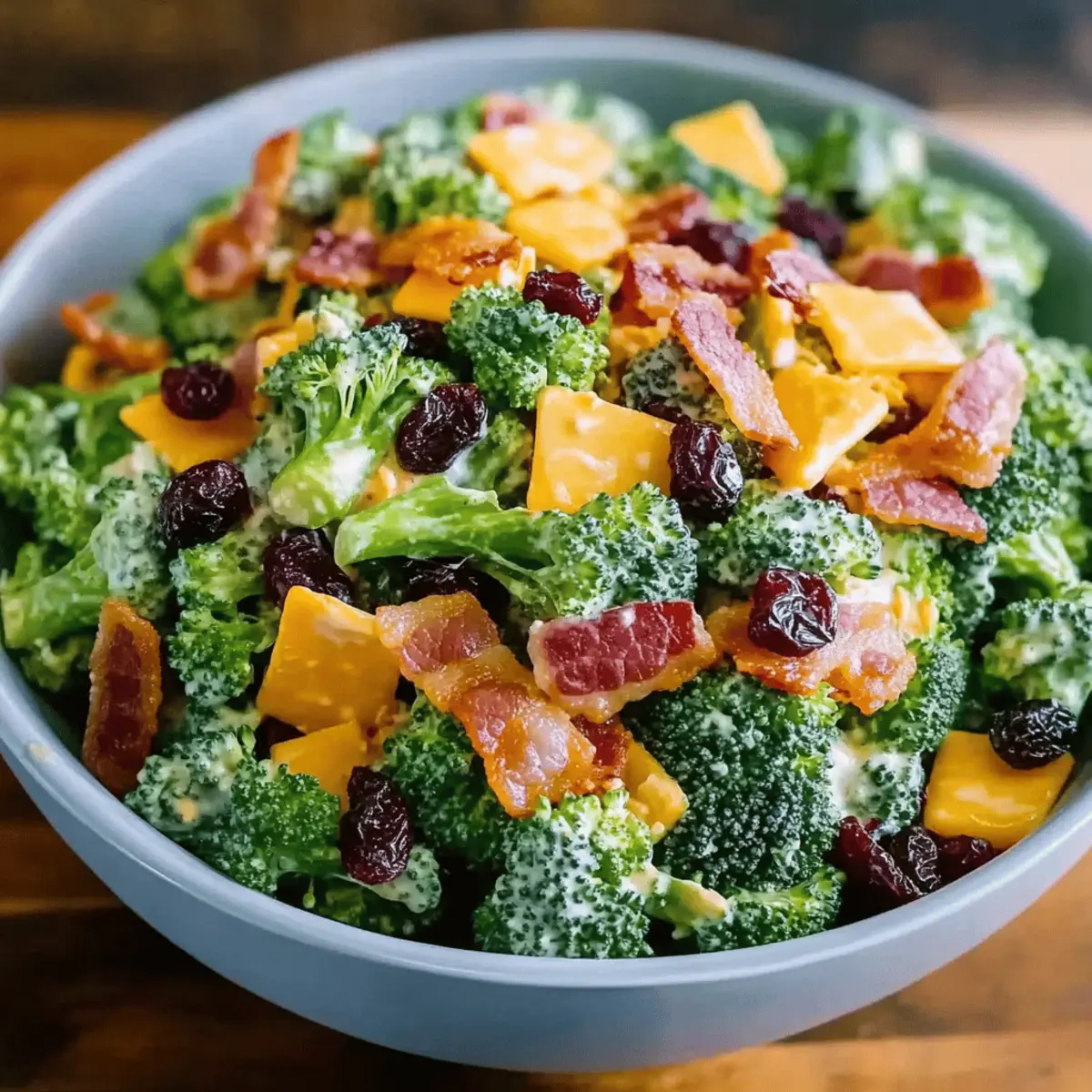 “Have you ever found yourself staring into the fridge, wondering what to bring to your next gathering or potluck?” Enter the Classic Broccoli Bacon Salad with Raisins and Cheddar Cheese, a vibrant side dish that not only comes together in just 20 minutes but also makes a lasting impression. This salad is a fantastic balance of sweet, savory, and crunchy elements, combining fresh broccoli, crispy bacon, juicy raisins, and sharp cheddar for an irresistible flavor explosion. It’s the perfect crowd-pleaser that everyone will love, and you can easily prepare it ahead of time. Plus, it’s a delightful alternative to that old standby of fast food! Ready to elevate your next meal with a touch of homemade magic? Let’s dive into the recipe! Why is This Salad a Must-Try? Quick and Easy: This salad whips up in just 20 minutes, making it a go-to for busy days or last-minute gatherings. Flavor Explosion: The delightful pairing of crispy bacon, sweet raisins, and tangy cheddar cheese creates a vibrant mix that tantalizes your taste buds. Crowd-Pleasing Appeal: Perfect for parties and potlucks, this dish guarantees that it will be a hit, just like our Ham Cheese Croissant for brunch! Versatile Options: Customize with walnuts for crunch or consider a vegetarian twist by swapping bacon for turkey bacon! Make Ahead-Friendly: Prep this salad a day in advance and watch the flavors meld beautifully—there’s practically no hassle involved! Elevate your dining experience and bring a burst of homemade goodness to the table with this scrumptious salad. Classic Broccoli Bacon Salad Ingredients Get ready to create a vibrant Classic Broccoli Bacon Salad with Raisins and Cheddar Cheese that will amaze your guests! For the Salad Broccoli – Freshness is key; trim into small florets for the best crunch. Bacon – Use crumbled, cooked bacon for that smoky flavor; it’s what brings the salad to life! Onion – Chopped red onion is recommended for a mild yet sharp bite. Raisins – These add a burst of sweetness; dried cranberries or chopped apricots are tasty alternatives. Cranberries – They lend a delightful tartness; feel free to omit or replace with more raisins if desired. Cheddar Cheese – Go for sharp cheddar for maximum flavor contrast, but mild works too. For the Dressing Mayonnaise – Acts as the creamy base; Greek yogurt is a great lighter substitute. Vinegar – Apple cider vinegar adds the perfect tang; any mild vinegar will work in a pinch. Sugar – Balances the acidity of the dressing; adjust to taste based on your sweetness preference. Salt and Pepper – Essential for enhancing overall flavor; season to your liking! Now that you have everything prepared, you’re just moments away from assembling a delightful Classic Broccoli Bacon Salad that’s sure to impress! Step‑by‑Step Instructions for Classic Broccoli Bacon Salad with Raisins and Cheddar Cheese Step 1: Prepare the Broccoli Begin by washing a head of fresh broccoli thoroughly under cold water. Trim the broccoli into small florets, aiming for bite-sized pieces that will provide a delightful crunch in your Classic Broccoli Bacon Salad. If you prefer a softer texture, blanch the florets in boiling water for about 2 minutes, then immediately plunge them into an ice bath to halt cooking. Pat them dry with a clean towel. Step 2: Mix the Salad Ingredients In a large mixing bowl, combine the washed and dried broccoli with crumbled, crispy bacon, chopped red onion, juicy raisins, and sharp cheddar cheese cut into small cubes. This blend of ingredients adds a contrast of flavors and textures to your salad. Toss everything gently so the components are evenly distributed, ensuring every bite is packed with the delightful surprises of sweet raisins and savory bacon. Step 3: Prepare the Dressing In a separate bowl, whisk together about half a cup of mayonnaise, two tablespoons of apple cider vinegar, and a teaspoon of sugar for a touch of sweetness that balances the tang. Season the dressing with salt and pepper to taste, whisking until smooth and creamy. This dressing will elevate your Classic Broccoli Bacon Salad, enriching it with a luscious coating everyone will enjoy. Step 4: Combine the Salad and Dressing Pour the creamy dressing over the salad mixture in the large bowl and gently toss everything together until the broccoli, bacon, and cheese are evenly coated. Aim for a thorough mix, ensuring the dressing clings to all components. The vibrant colors will beckon to be served as a fresh side dish, ready to charm your guests. Step 5: Chill Before Serving For optimal flavor, cover the Classic Broccoli Bacon Salad with plastic wrap and place it in the refrigerator for about 1 to 2 hours. This chilling step allows the flavors to meld beautifully while the salad gains a crisp, refreshing taste. Note that this dish is best served cold, so that delightful crunch is at its peak! Step 6: Serve and Enjoy Once chilled, give the Classic Broccoli Bacon Salad a gentle toss and taste for seasoning, adjusting if necessary. Serve it as a vibrant side dish at gatherings, picnics, or barbecues. This salad not only surprises with its flavor but also stands out on the table with its colorful presentation. Make Ahead Options These Classic Broccoli Bacon Salad with Raisins and Cheddar Cheese are perfect for meal prep enthusiasts! You can chop the broccoli and mix the salad ingredients (bacon, onion, raisins, and cheese) up to 24 hours in advance, storing them separately to keep everything fresh. Make the dressing ahead of time too; it will stay delicious in the fridge for up to 3 days. To maintain quality, avoid tossing the salad until you’re ready to serve. When ready, combine everything, give it a toss, and refrigerate for about 1–2 hours before serving. This way, you’ll still enjoy a vibrant and crunchy salad, saving you time on busy weeknights! What to Serve with Classic Broccoli Bacon Salad with Raisins and Cheddar Cheese Imagine the delightful c