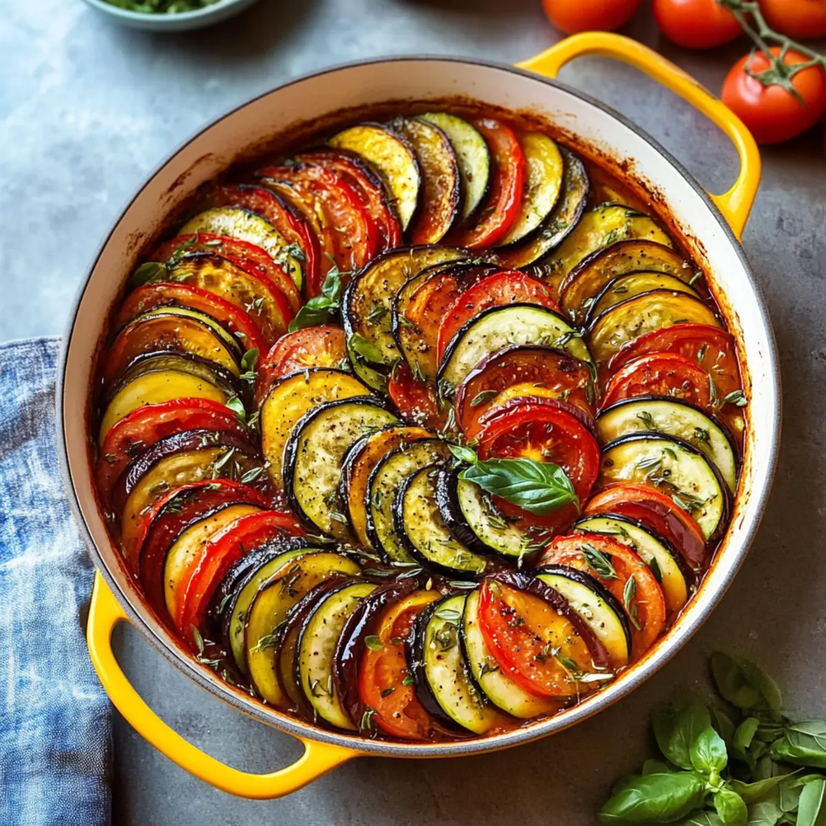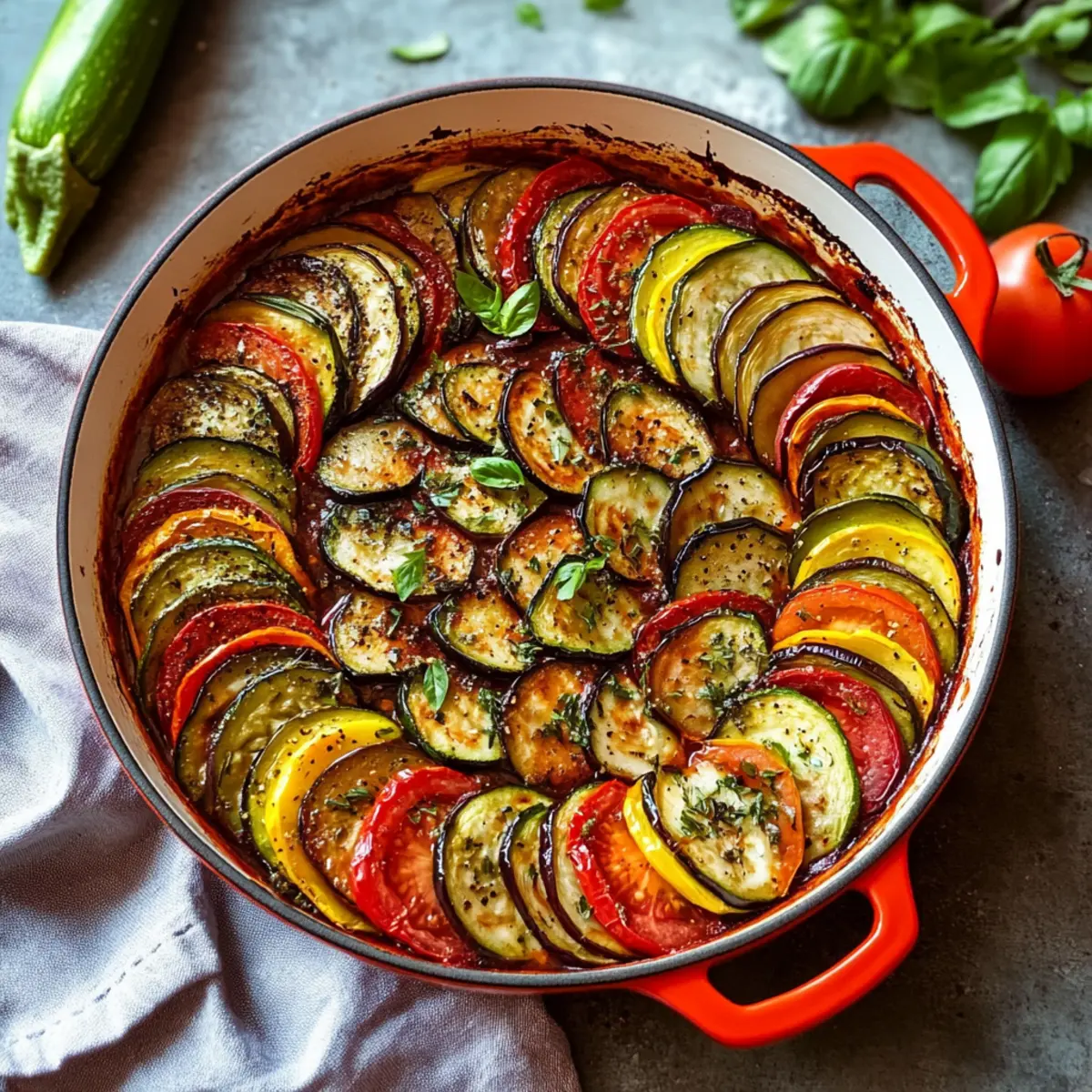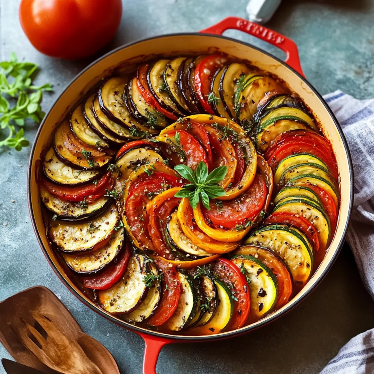 The kitchen was suddenly filled with the sweet, earthy aroma of sautéing garlic and fresh herbs, whisking me back to a little café tucked away in the streets of Provence. Today, I’m thrilled to share my Homemade Classic French Ratatouille recipe, a colorful tribute to summer’s bounty. This dish is not only a feast for the eyes but also a delightful plant-based and gluten-free option, making it a perfect choice for your next gathering. Whether you choose to serve it as a rustic stew or showcase the ingredients in a stunning fan presentation, you’ll find that it’s as easy to prepare as it is to enjoy. With every bite, you’ll experience a harmony of flavors that capture the essence of seasonal cooking. Ready to brighten up your table with vibrant veggies? Let’s dive into this delicious adventure together! Why is Ratatouille a Summer Favorite? Fresh Vegetables: This recipe is a celebration of summer’s finest produce, showcasing a variety of colorful and nutritious vegetables that burst with flavor. Versatile Serving: Enjoy it as a hearty main dish, or pair it alongside crusty bread or fluffy polenta for a complete meal! If you’re a fan of effortless cooking, check out my Cinnamon Roll French Toast for another quick yet impressive dish. Aromatic Seasoning: The blend of fresh herbs and garlic create an inviting aroma that fills your kitchen, making it perfect for gatherings or family dinners. Healthy & Wholesome: Coming in at just 303 calories per serving, this ratatouille aligns perfectly with plant-based and gluten-free diets, allowing you to indulge without the guilt. Crowd-Pleasing Dish: Whether you’re feeding family or friends, this ratatouille is sure to impress with its stunning presentation and delightful taste, much like my Hawaiian Roll French recipe that’s also a hit at get-togethers! Classic French Ratatouille Ingredients For the Base Olive Oil – A foundational ingredient that adds richness and aids in cooking vegetables; feel free to substitute with avocado oil if needed. Roma Tomatoes – Essential for the sauce base, offering a dense consistency; you can use regular tomatoes in a pinch. Crushed Tomatoes – Ties the ingredients together effectively; diced tomatoes can work as a substitute if you’re in a bind. For the Vegetables Eggplant – A key component that delivers a rich texture; mushrooms can be a lighter alternative for a similar umami taste. Zucchini – Provides fresh flavor and charming texture; consider yellow squash as an easy swap. Red Onion – Adds a sweet, mild bite; yellow onion can be used as a substitute if desired. Red Bell Pepper – Contributes sweetness and crunch; any colored bell pepper can be easily interchanged. For the Seasoning Fresh Basil – Offers a sweet and aromatic flavor; fresh oregano or parsley can be substituted for a unique twist. Fresh Parsley – Adds a peppery note and vibrant color; use dried parsley if needed, though the flavor will be less intense. Dry Thyme – Amplifies the dish’s earthy undertones; substitute with fresh thyme, using about twice the amount. Garlic – Delivers depth of flavor; fresh cloves are best, but garlic powder can suffice in a pinch. Salt and Pepper – Essential for enhancing and balancing the overall taste. This Classic French Ratatouille is not only a burst of summer flavors but also a visually stunning dish that’s a must-try for your next meal! Step‑by‑Step Instructions for Classic French Ratatouille Step 1: Prep Vegetables Begin by washing and slicing your eggplant, zucchini, red onions, and red bell pepper into evenly sized pieces, about half an inch thick. This ensures uniform cooking and makes your Classic French Ratatouille visually appealing. Once cut, set them aside on a platter, ready for layering later. Step 2: Make Herb Dressing Chop fresh basil and parsley finely, then combine them in a bowl with olive oil and minced garlic. Stir well and season your dressing with salt and pepper to taste. This aromatic herb mixture adds depth and flavor to your Classic French Ratatouille, so let it sit while you prepare the sauce. Step 3: Preheat Oven Set your oven to preheat at 200°C (390°F). This temperature is perfect for roasting your vegetables and will help achieve that slightly charred texture we want. While the oven heats up, gather your oven-safe skillet or baking dish for the next step. Step 4: Prepare Tomato Sauce In your skillet, heat a generous drizzle of olive oil over medium heat. Sauté the chopped red onions and red bell pepper until softened, about 5–7 minutes. Add in minced garlic, dried thyme, and the crushed tomatoes. Stir everything together and let it simmer for 10 minutes, until thickened and fragrant. Step 5: Arrange Vegetables Once the sauce is ready, layer the sliced vegetables on top in a concentric pattern. Start with the eggplant, then zucchini, and bell pepper, creating a beautiful design. Drizzle the herb dressing over the top and sprinkle with a touch more salt and pepper to enhance the flavors. Step 6: Bake Cover the skillet with aluminum foil and place it in the preheated oven. Bake for 40 minutes, then carefully remove the foil and continue baking for an additional 20 minutes. You’ll know your Classic French Ratatouille is ready when the vegetables are tender and slightly caramelized around the edges. Step 7: Serve Once baked, remove your ratatouille from the oven and let it cool for a few moments. Serve it hot as a delicious main course or alongside crusty bread, fluffy polenta, or rice. This vibrant dish is sure to impress your family and friends with its colors and flavors! Expert Tips for Classic French Ratatouille Uniform Slices: Ensure all vegetables are sliced evenly to promote even cooking and maintain the beautiful presentation of your Classic French Ratatouille. Pre-soak Eggplant: To reduce bitterness and excess moisture, consider salting the eggplant slices for 30 minutes before cooking. Rinse and dry them thoroughly befor