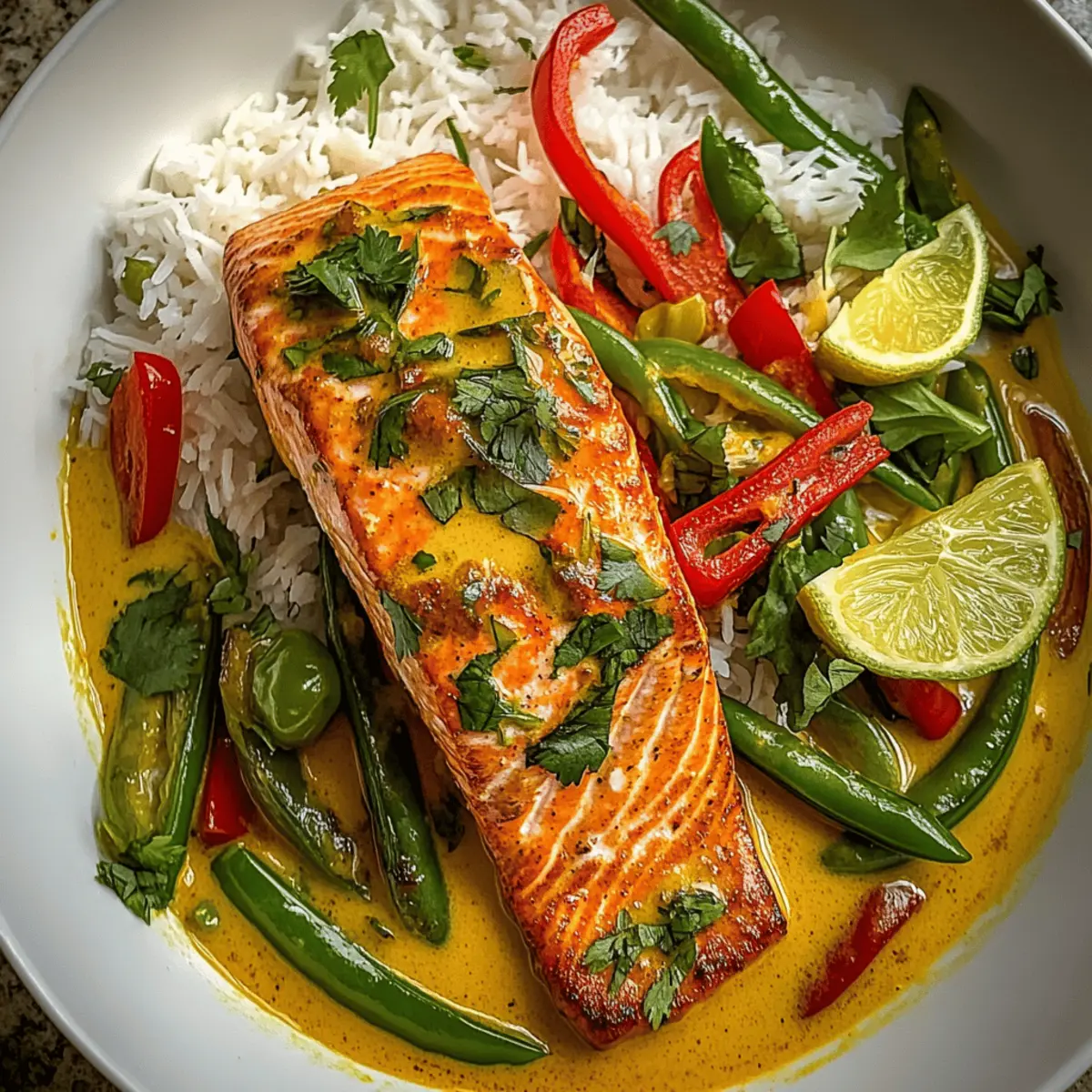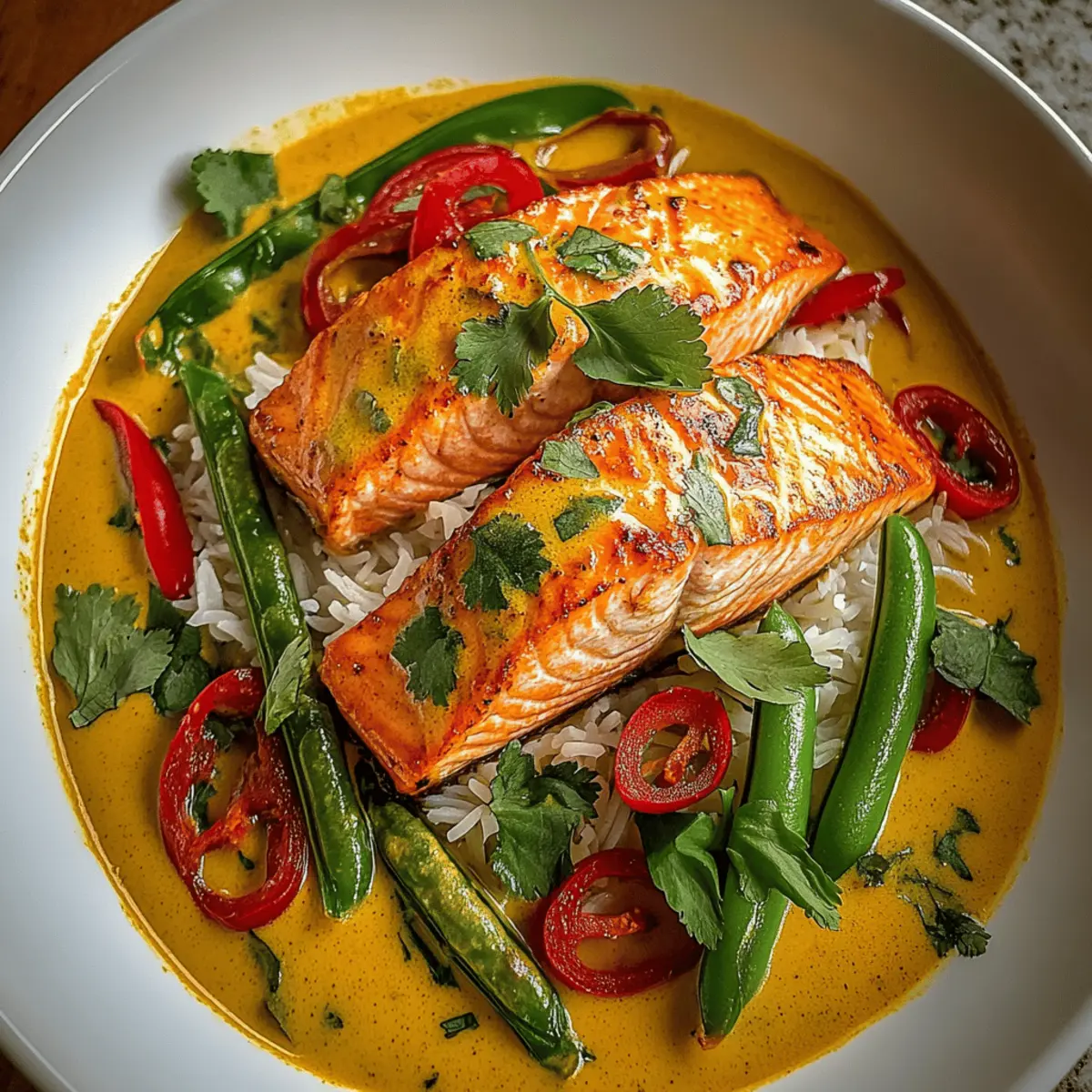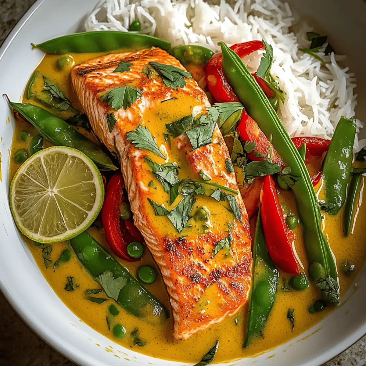 As I stood in my kitchen, tantalizing aromas filled the air, transporting me straight to a sunlit tropical escape. This is the magic of my Easy Coconut Curry Salmon with Colorful Vegetables, a dish that combines rich coconut cream with aromatic spices. It’s a quick, easy dinner option that transforms your usual weeknight routine into an extraordinary culinary adventure. What I love most about this recipe is not only its vibrant flavor but also its health benefits—packed with omega-3s from the salmon and gluten-free ingredients, it’s a comforting yet nutritious meal. Plus, with minimal prep time, you can whip this up even on the busiest of evenings. Ready to discover the secret to making dinner exciting again? Why is Coconut Curry Salmon So Irresistible? Flavor Explosion: The creamy coconut milk blends beautifully with the aromatic spices, creating a sauce that’s full of depth and richness, making every bite a taste sensation. Quick to Prepare: With minimal prep and cooking time, you can have a delicious, healthy meal on the table in under 30 minutes, perfect for those busy weeknights. Healthy Choice: Packed with omega-3 fatty acids from the salmon, this dish supports heart health while being gluten-free and nutrient-rich. Versatile Ingredients: Whether you swap salmon for firm tofu or play with seasonal veggies, there are endless variations to keep your meals exciting. Check out my Spicy Maple Chicken for another easy dinner option! Colorful Presentation: The vibrant vegetables add not just flavor but also a burst of color to your plate, making it a feast for the eyes as well as the palate. Crowd-Pleasing: This dish is perfect for family dinners or entertaining guests, ensuring everyone leaves the table satisfied. Coconut Curry Salmon Ingredients • Discover the delightful components of this vibrant dish! For the Salmon Salmon Fillets – Rich in omega-3 fatty acids, providing a healthy protein option; feel free to substitute with trout, tilapia, or cod if preferred. For the Sauce Olive Oil – The perfect base for sautéing; avocado oil can be used for a different flavor profile. Salt & Black Pepper – Essential for bringing out the flavors; adjust to your taste preference. Onion (1 medium, finely chopped) – Adds sweetness and depth; shallots make a great substitute if you’re out of onions. Garlic (3 cloves, minced) – Enhance your dish’s flavor with this aromatic; garlic powder can be an alternative but fresh is always best. Fresh Ginger (1 tablespoon, grated) – Infuses a spicy zing into the dish; ground ginger can work too, just use less. Red Curry Paste (2 tablespoons) – Provides that essential heat and depth; feel free to try green or yellow curry paste for a different twist. Coconut Milk (1 can, 14 oz) – The main component for creaminess; consider using light coconut milk for a lower fat option. Fish Sauce (2 tablespoons) – Adds a savory umami flavor; soy sauce is a great vegetarian substitute. Brown Sugar (1 tablespoon) – Balances the dish’s flavors nicely; honey or coconut sugar can be used instead. Lime Juice (Juice of 1 lime) – Brightens up the flavors; lemon juice serves as a substitute in a pinch. For the Vegetables Red Bell Pepper (1, thinly sliced) – Adds sweetness and a pop of color; yellow or orange bell peppers work just as well! Sugar Snap Peas (1 cup) – Brings crunch and freshness to the dish; green beans can be swapped if you don’t have sugar snap peas. Fresh Cilantro (¼ cup, chopped) – A fresh herb garnish that elevates the dish; omit if cilantro isn’t your favorite! Lime Wedges – Ideal for serving, adding an extra zing; optional, but totally worth it! Enjoy cooking your healthy and delicious Coconut Curry Salmon! Step‑by‑Step Instructions for Coconut Curry Salmon Step 1: Season the Salmon Begin by seasoning the salmon fillets generously with salt and black pepper on both sides. This adds flavor and helps enhance the richness of the Coconut Curry Salmon. Set the fillets aside while you prepare the skillet, allowing the seasoning to soak in. Step 2: Sear the Salmon Heat 2 tablespoons of olive oil in a large skillet over medium-high heat. Once the oil is shimmering, carefully place the salmon fillets skin side down into the skillet. Sear for about 3-4 minutes until the skin is crispy and the salmon is nearly cooked through. Then, flip the fillets and cook an additional 2-3 minutes. Remove the salmon and keep warm on a plate. Step 3: Sauté the Aromatics In the same skillet, add the finely chopped onion and sauté for 3-4 minutes until softened and translucent. As the onion becomes tender, stir in the minced garlic and grated ginger, cooking for 1 minute until fragrant and aromatic, creating a lovely base for your coconut curry. Step 4: Incorporate the Curry Paste Stir in 2 tablespoons of red curry paste to the sautéed onion mixture. Cook for another minute, allowing the spices to bloom and infuse the mixture with their vibrant flavors. The scent will waft through your kitchen, getting you excited for the Coconut Curry Salmon that’s about to come together. Step 5: Add Coconut Milk and Seasonings Pour in 14 ounces of coconut milk, followed by 2 tablespoons of fish sauce and 1 tablespoon of brown sugar. Stir until well combined and bring the mixture to a gentle simmer over medium heat. Watch for small bubbles to form as the sauce thickens and flavors meld beautifully. Step 6: Cook the Vegetables Add the sliced red bell pepper and sugar snap peas to the simmering coconut curry sauce. Cook for 4-5 minutes, stirring occasionally, until the vegetables are tender yet vibrant in color, providing a lovely contrast to the creamy sauce and perfectly complementing the Coconut Curry Salmon. Step 7: Return the Salmon to the Skillet Carefully return the seared salmon fillets to the skillet, spooning the aromatic sauce over them. Allow the salmon to simmer in the sauce for an additional 2-3 minutes. This final step melds the flavors pe