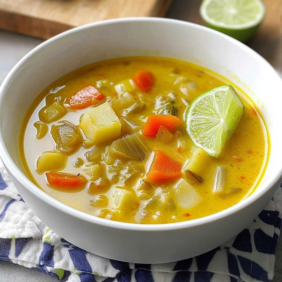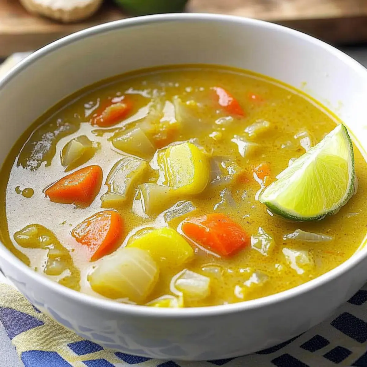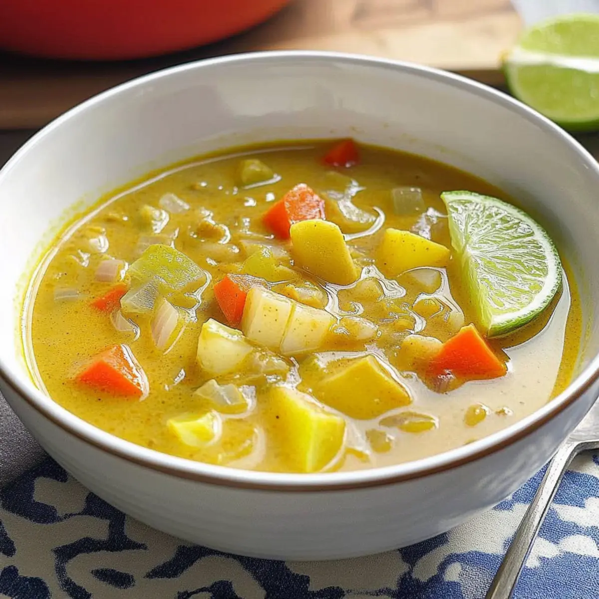 As the soothing aroma of spices fills my kitchen, I can’t help but feel transported to a tropical paradise. This Creamy Coconut Curry Vegetable Soup is more than just a meal; it’s a nourishing hug in a bowl, brimming with vibrant vegetables and delightful flavors. With its quick prep time and healthy profile, this recipe is perfect for those busy weekdays or when you’re craving an indulgent meal without the guilt. Plus, it’s entirely dairy-free, making it a great option for everyone at the table. Imagine cozying up with a steaming bowl and crusty bread—does it get any better? Are you ready to dive into this deliciously simple creation? Why is Coconut Curry Vegetable Soup Amazing? Comforting, this soup is the perfect remedy for chilly nights, wrapping you in warmth and flavor. Quick and Easy, with simple ingredients, you can whip up a nourishing meal in no time. Versatile, feel free to swap in your favorite vegetables, making it a stellar choice for using up your fridge’s contents. Nutritious, packed with vitamins and healthy fats, it’s a guilt-free indulgence. Pair it with crispy bread or a side of Garlic Roasted Vegetables for a complete meal. Enjoy the tropical vibes and rich taste that elevate your dining experience! Coconut Curry Vegetable Soup Ingredients Get ready to explore the delightful flavors! For the Soup Canola Oil – Adds moisture and helps cook vegetables; substitute with vegetable oil or olive oil for a different taste. Celery – Provides crunch and enhances flavor base; replace with bell peppers for a sweeter twist. Carrots – Adds sweetness and vibrant color; peas can be used for a fresh substitution. Garlic Cloves – Boosts flavor with a pungent aroma; use garlic powder if fresh is unavailable (1/8 tsp per clove). Fresh Ginger – Delivers warmth and spice; 1 teaspoon ground ginger is a great alternative. Curry Powder – The core flavor ingredient; try garam masala for a different taste profile. Ground Turmeric – Adds health benefits and vibrant color; can be omitted if you don’t have it on hand. Vegetable Broth – Provides depth; feel free to use homemade or store-bought for convenience. Light Coconut Milk – Ensures creaminess without heaviness; full-fat coconut milk adds a richer flavor. Medium Potato – Adds heartiness and texture; sweet potatoes can offer a sweeter profile. Salt – Enhances overall flavor; adjust to taste and consider low-sodium options. Ready-to-Serve Brown Rice – Adds heft and makes the soup filling; substitute with quinoa or noodles for a twist. Lime Wedges (optional) – Brightens flavors when garnishing; enhances the dish beautifully. Feel the excitement building as you gather these ingredients for your delicious Coconut Curry Vegetable Soup—it’s almost time to cook! Step‑by‑Step Instructions for Coconut Curry Vegetable Soup Step 1: Heat the Oil In a large saucepan, heat 2 tablespoons of canola oil over medium heat. Allow the oil to shimmer for about 1-2 minutes; this indicates it’s hot enough. This step sets the foundation for the Coconut Curry Vegetable Soup, creating a warm base for the vegetables to sauté. Step 2: Sauté the Veggies Add 1 cup chopped celery and 1 cup chopped carrots to the pan, and cook for 6-8 minutes. Stir occasionally until the vegetables soften and become slightly golden. You’ll want them to be tender but not mushy, which will enhance the texture of the Coconut Curry Vegetable Soup. Step 3: Add Aromatics Stir in 4 minced garlic cloves, 1 tablespoon freshly grated ginger, 2 tablespoons curry powder, and 1 teaspoon ground turmeric. Sauté this fragrant mixture for about 1 minute, allowing the spices to bloom and infuse the oil. The aroma will lift, creating an irresistible base for your Coconut Curry Vegetable Soup. Step 4: Pour in Broth and Coconut Milk Carefully add 4 cups of vegetable broth and 1 can (13.5 oz) of light coconut milk to the saucepan. Then, toss in 1 medium diced potato and 1 teaspoon of salt. Stir to combine everything, and bring this creamy mixture to a gentle boil over high heat, watching for bubbles to form. Step 5: Simmer for Tenderness Once boiling, reduce the heat to low, cover the saucepan, and let the soup simmer for 10-15 minutes. During this time, check the potato for tenderness; it should be soft enough to pierce easily with a fork, ensuring the perfect texture for your Coconut Curry Vegetable Soup. Step 6: Prepare the Rice While the soup is simmering, prepare the ready-to-serve brown rice according to package instructions. This step typically takes about 5-10 minutes. Once cooked, fluff the rice and set it aside. It will serve as a hearty base when it’s time to enjoy the Coconut Curry Vegetable Soup. Step 7: Combine and Serve Once the potatoes are tender, stir in the cooked rice into the soup, mixing well to distribute. Heat for an additional 2-3 minutes to warm through before serving. Ladle the Coconut Curry Vegetable Soup into bowls, and garnish with optional lime wedges for a zesty finish. Expert Tips for Coconut Curry Vegetable Soup Lime Juice Last: Wait to add lime juice until serving for the freshest taste; it brightens the soup beautifully without losing its zing. Perfect Potato Texture: Keep an eye on the potato while simmering; a perfectly tender potato enhances the soup’s delightful texture and flavor balance. Spice Adjustments: Customize your spice level by starting with less curry powder, and gradually adjust. This ensures the curry flavor is just right for your palate. Veggie Variations: Don’t hesitate to experiment with different vegetables! Adding spinach, bell peppers, or zucchini makes this Coconut Curry Vegetable Soup even more nutritious. Thicker Consistency: For a thicker soup, blend a portion of the soup before adding the rice. This creates a creamy base that is hearty and satisfying. Garnish for Pop: Consider topping with fresh cilantro or sliced green onions along with lime wedges for added freshness and visual appeal. H