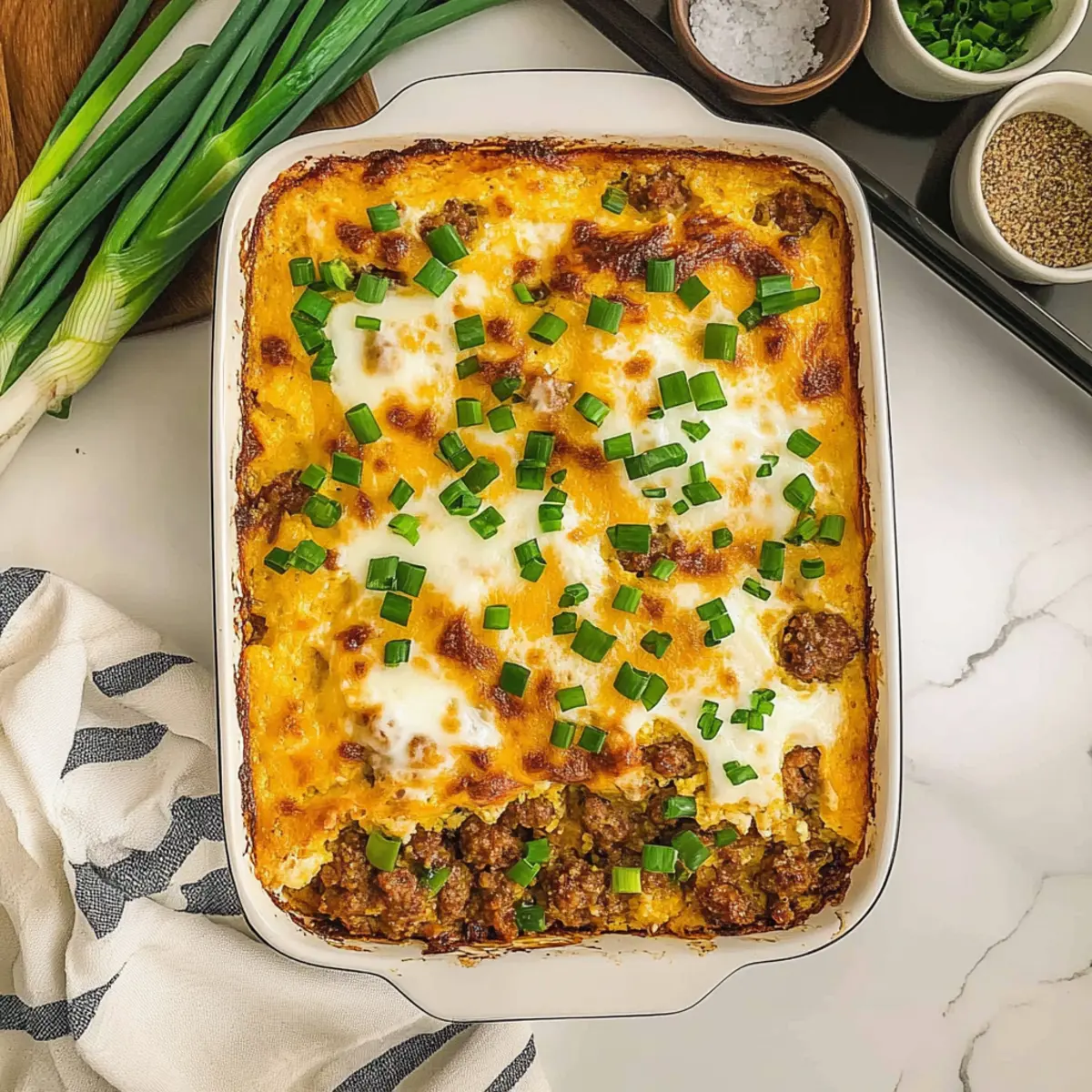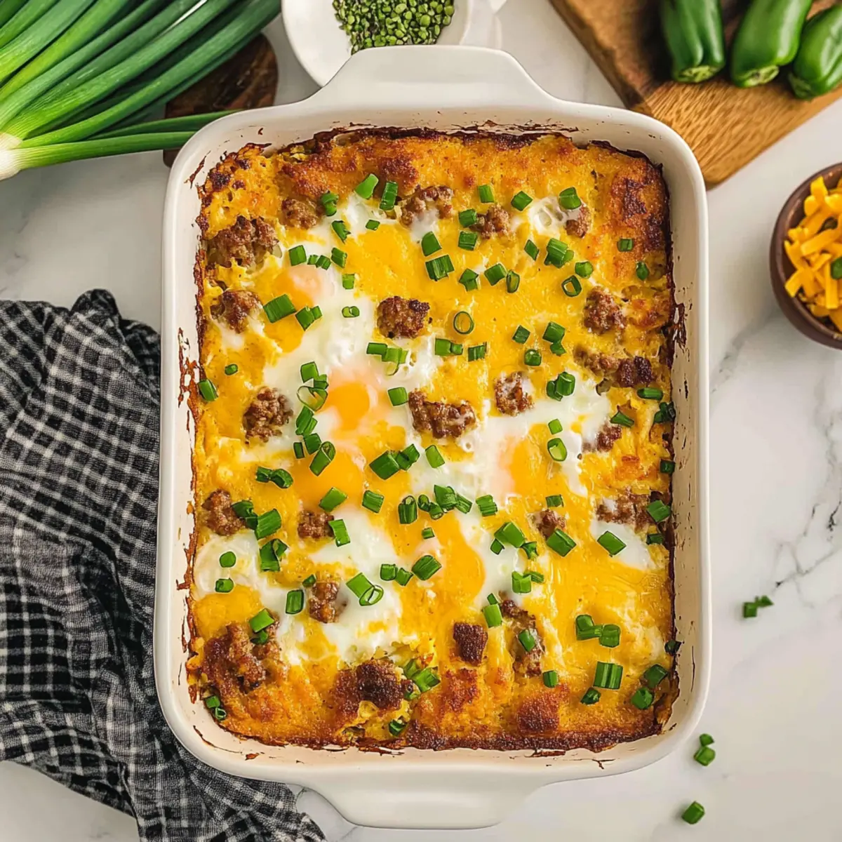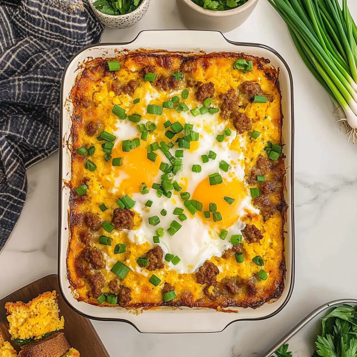 As I took my first bite of the Cornbread Breakfast Casserole, it felt like a warm hug on a chilly morning. This dish masterfully combines the sweetness of cornbread with the savory delight of sausage and cheese, creating a comforting breakfast option that’s downright irresistible. Not only is it a perfect way to impress guests at your next brunch, but it also allows you to creatively use leftover cornbread—what’s not to love? Whether you prefer bold flavors or a vegetarian twist with vibrant veggies, this casserole is truly customizable to your tastes. Are you ready to transform your mornings with this delightful dish? Let’s dive into the recipe! Why is Cornbread Breakfast Casserole a Must-Try? Comforting and Delicious: This casserole is like a warm hug on a chilly morning, with a delightful mix of sweet cornbread and savory sausage. Customizable Options: Whether you want to swap in turkey sausage or add a rainbow of bell peppers, this dish easily adapts to your preferences. For those looking for more veggie goodness, don’t miss the chance to explore the vibrant flavors in our Sweet Potato Breakfast or Squash Scramble Breakfast Tacos! Perfect for Meal Prep: Prepare it the night before and enjoy a hassle-free morning; this casserole makes busy days a cinch! Crowd-Pleasing Flavor: Ideal for breakfast or brunch gatherings, it’s a surefire way to impress friends and family with minimal effort. Hearty and Filling: Packed with protein and flavor, this casserole won’t just fill your stomach—it’ll warm your soul! Cornbread Breakfast Casserole Ingredients For the Casserole • Cornbread – Aim for 3-5 cups cut into large cubes; 4 cups is recommended for the perfect base. • Breakfast Sausage – Adds protein and savory notes; chicken or turkey sausage can be used for a lighter option. • Green Bell Pepper – Contributes freshness and color; any color bell pepper can be used. • Cheddar Cheese – Enhances creaminess and flavor; freshly grated cheese yields better texture. For the Custard Mixture • Milk – Binds ingredients and adds moisture; consider non-dairy milk for a substitute if needed. • Eggs – Acts as a binder for the casserole; no substitutions are recommended. For Seasoning • Salt – Enhances flavor; adjust to taste. • Pepper – Adds a touch of warmth; freshly cracked pepper gives the best flavor. • Onion Powder – Provides depth of flavor; can be swapped with fresh onion if preferred. • Paprika – Brings a slight smokiness and color to the dish; use sweet or smoked according to preference. For Garnish • Green Onion – Adds a fresh, crisp finish; chop and sprinkle just before serving. Let’s create this delightful Cornbread Breakfast Casserole that’s sure to brighten your mornings! Step‑by‑Step Instructions for Cornbread Breakfast Casserole Step 1: Preheat and Prepare Begin by preheating your oven to 350°F (175°C). While the oven warms up, grab a 9×13 baking dish and generously spray it with cooking spray to prevent sticking. This will ensure your Cornbread Breakfast Casserole comes out easily and retains its beautiful shape once baked. Step 2: Layer the Cornbread Next, place the cubed cornbread in a single layer at the bottom of the baking dish. Ensure the pieces are evenly spread out; this provides a solid base for the casserole. Follow with a layer of cooked breakfast sausage, diced green bell pepper, and a generous sprinkle of cheddar cheese, creating an enticing visual contrast. Step 3: Whisk the Custard Mixture In a separate bowl, combine the milk, eggs, salt, pepper, onion powder, and paprika. Using a whisk, beat the mixture until it’s well blended and slightly frothy—this will create a delightful custard for your Cornbread Breakfast Casserole. This step adds moisture and binds all the ingredients together. Step 4: Pour and Combine Carefully pour the egg mixture evenly over the layered ingredients in your baking dish. Make sure it seeps into the gaps between the cornbread and sausage, ensuring each bite is flavorful. Gently press down on the layers if needed to help the custard soak in, making everything nicely cohesive. Step 5: Bake to Perfection Place the baking dish in the preheated oven and bake for 30-35 minutes. You’ll know it’s done when the center is just set; it should feel firm to the touch yet not overly dry. A light golden color on the top will signal that your Cornbread Breakfast Casserole is ready to come out! Step 6: Cool and Garnish Once baked, remove the casserole from the oven and let it rest for about 10 minutes. This resting time helps it to firm up, making it easier to slice. Finally, sprinkle chopped green onions over the top before serving to add a fresh, crisp touch to your delicious breakfast dish. Expert Tips for Cornbread Breakfast Casserole • Add Extra Veggies: Experiment with fresh or roasted vegetables like spinach or mushrooms to amp up the flavor and nutrition of your Cornbread Breakfast Casserole. • Perfect Texture: For ideal texture, use well-dried cornbread cubes; this prevents the casserole from becoming soggy. Day-old cornbread works best! • Meat Alternatives: For a vegetarian twist, substitute sausage with hearty ingredients like black beans or lentils for added protein. • Baking Time Awareness: If you prepare the casserole ahead of time, it may need an extra 10-15 minutes in the oven to fully cook through. • Garnish Smartly: Always let the casserole rest before slicing. Garnish with fresh herbs or additional cheese for an extra touch of flair and taste! Make Ahead Options These Cornbread Breakfast Casseroles are ideal for meal prep, allowing you to enjoy a delicious breakfast without the morning rush! You can assemble the casserole up to 24 hours in advance; simply layer the cubed cornbread, cooked sausage, peppers, and cheese in the dish. In a separate bowl, whisk together the milk, eggs, and seasonings, then cover it in the fridge until you’re ready to bake. For bes