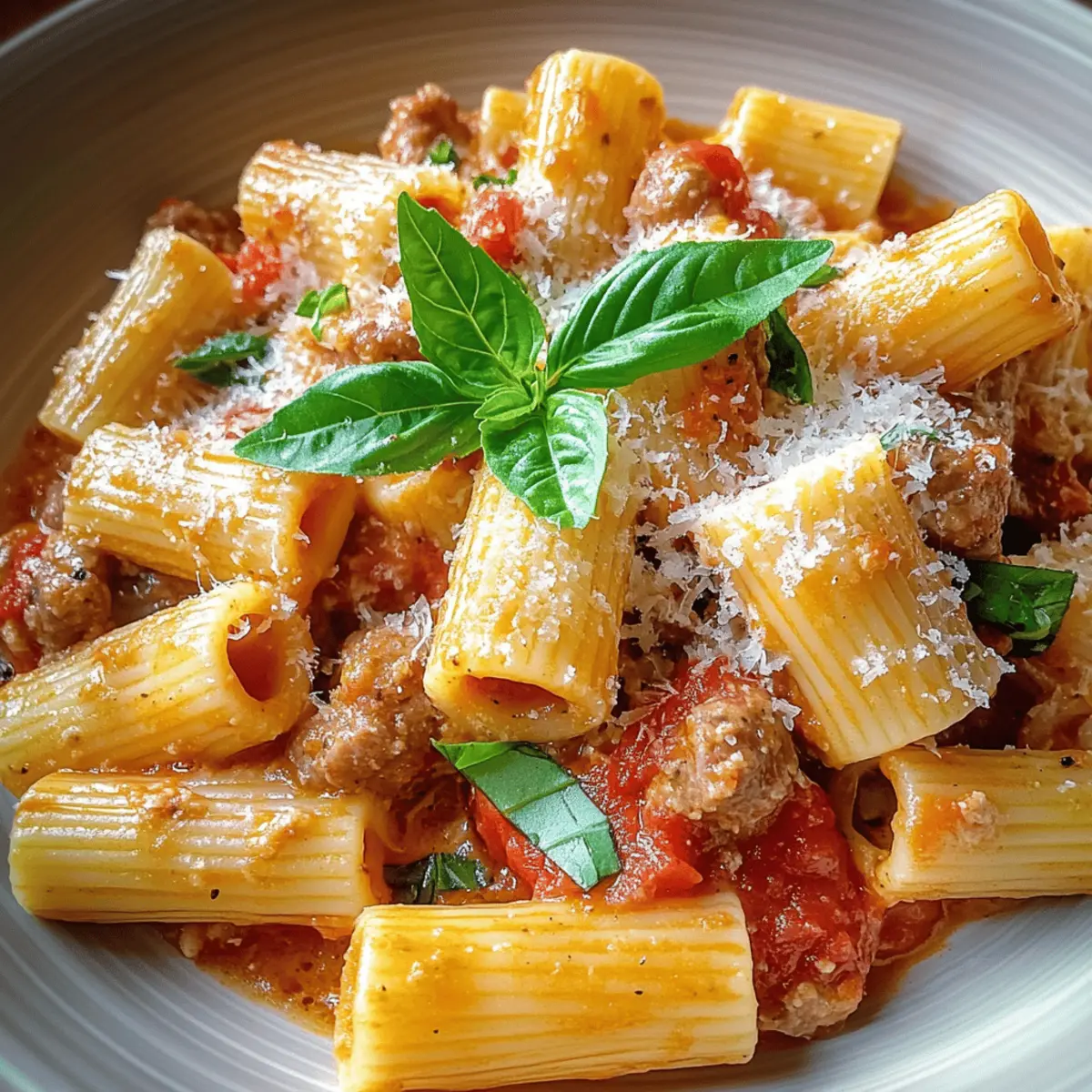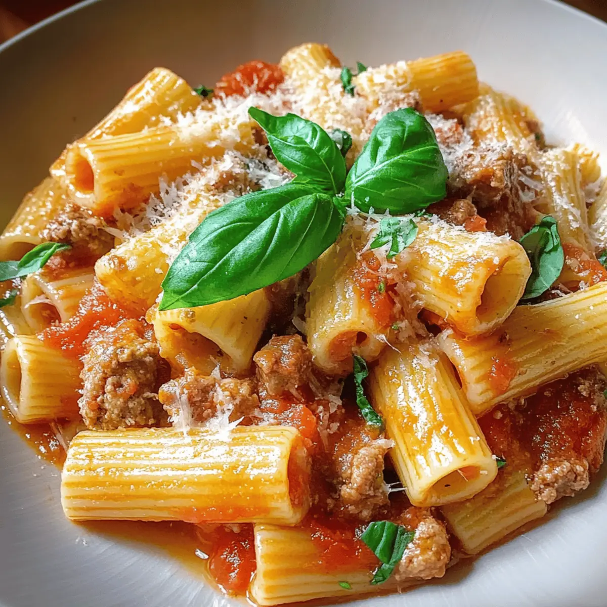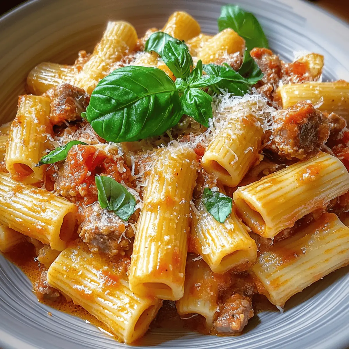 As I stood in my kitchen, a comforting aroma wafted through the air, wrapping me in memories of Italian family dinners. The moment calls for something special, and that’s when I knew it was time to whip up my Creamy Italian Sausage Rigatoni. This dish is a perfect blend of savory Italian sausage, a rich and creamy tomato sauce, and a hearty dose of rigatoni, creating an easy dinner that feels like a warm hug on a busy weeknight. What’s more, it’s a crowd-pleaser that even the pickiest eaters will adore, making it a stellar choice for casual gatherings or cozy family nights. Are you ready to dive into the ultimate comfort food experience? Why is this recipe a must-try? Comforting Flavors: This Creamy Italian Sausage Rigatoni combines savory sausage with a luscious sauce that transports you straight to Italy. Quick and Easy: With simple steps, it’s perfect for those busy weeknights when you crave something homemade without the hassle. Crowd-Pleaser: Ideal for families and gatherings, everyone will be asking for seconds! Rich and Decadent: The combination of heavy cream and grated Parmesan ensures every bite is an indulgent delight. Versatile Options: Feel free to swap the rigatoni for penne or even keep it vegetarian—this dish adapts to your needs! Freshen it up with a side of a light salad or some crisp garlic bread, and you’re all set for the perfect meal! Creamy Italian Sausage Rigatoni Ingredients For the Pasta Rigatoni Pasta – A hearty structure that captures the creamy sauce beautifully; can substitute with penne or fusilli. For the Sauce Italian Sausage – Adds a savory flavor that truly defines this dish; for a vegetarian alternative, consider using plant-based sausage. Olive Oil – Essential for sautéing the sausage, providing a subtle fruity flavor. Diced Onion – Sweetens and forms the savory base of the sauce; don’t skip it! Minced Garlic – Infuses the sauce with its aromatic essence; a key ingredient for depth of flavor. Crushed Tomatoes (1 can, 400g) – The heart of the sauce, adding rich acidity and depth; a foundational element. Heavy Cream (1 cup) – Brings the creaminess that makes this dish indulgent and satisfying. Chicken Broth (1 cup) – Helps thin the sauce while contributing umami richness; swap with vegetable broth for a vegetarian option. Italian Seasoning (1 tsp) – Enhances the Italian flavor profile; it’s a crucial addition for authenticity. Red Pepper Flakes (1/2 tsp, optional) – Introduces a touch of heat; adjust according to your spice preference. Salt and Pepper – Essential for seasoning; ensure you adjust to your taste before serving. Grated Parmesan Cheese (1/2 cup) – Adds nuttiness and aids in thickening the sauce; nutritional yeast can be used in vegan versions. Fresh Basil Leaves – A delightful garnish that adds freshness and brightens the dish visually and flavor-wise. Get ready to indulge in the creamy comfort of this delightful Creamy Italian Sausage Rigatoni! Step‑by‑Step Instructions for Creamy Italian Sausage Rigatoni Step 1: Boil the Pasta Begin by bringing a large pot of salted water to a rolling boil over high heat. Add the rigatoni and cook according to package instructions until al dente, usually about 10-12 minutes. Stir occasionally to prevent sticking. Once cooked, drain the pasta in a colander and set it aside, retaining a splash of the pasta water for later use. Step 2: Sauté the Sausage In a large skillet, heat 2 tablespoons of olive oil over medium heat. Once the oil is shimmering, add the Italian sausage, breaking it apart with a spatula. Sauté for 5-7 minutes or until the sausage is nicely browned and cooked through, turning a golden hue. The aroma will fill your kitchen, signifying that it’s time to move on. Step 3: Cook the Aromatics Add the diced onion to the skillet with the cooked sausage. Sauté for about 3-4 minutes, stirring frequently until the onion becomes translucent. Then, incorporate the minced garlic and continue to cook for another minute, allowing its fragrant aroma to blend with the sausage and onion. This forms a delicious base for your Creamy Italian Sausage Rigatoni. Step 4: Make the Sauce Stir in the crushed tomatoes, heavy cream, and chicken broth, allowing the mixture to come together. Add the Italian seasoning and red pepper flakes, stirring well to combine. Season with salt and pepper to taste. Let the sauce simmer on low for about 10 minutes, stirring occasionally until thickened and the flavors meld beautifully. Step 5: Combine Pasta and Sauce Add the drained rigatoni directly into the simmering sauce, tossing to coat the pasta evenly. Allow the rigatoni to absorb some of the creamy sauce for 2-3 minutes over low heat. The pasta will soak in that luscious flavor, which is exactly what you want for your Creamy Italian Sausage Rigatoni. Step 6: Finish with Cheese Mix in the grated Parmesan cheese until melted and creamy, ensuring every piece of rigatoni is wrapped in that rich sauce. Let it cook for another minute, then remove from heat. The sauce should now be thick, indulgent, and ready to serve. Step 7: Serve and Garnish Plate the creamy rigatoni immediately while hot, garnishing with fresh basil leaves for a pop of color and freshness. Enjoy this comforting bowl of Creamy Italian Sausage Rigatoni as is, or with a side of garlic bread for the perfect cozy meal! Make Ahead Options These Creamy Italian Sausage Rigatoni are perfect for meal prep enthusiasts! You can prepare the sauce up to 3 days in advance, letting the flavors deepen while it’s refrigerated. Simply sauté the sausage, onions, and garlic, then mix in the crushed tomatoes, cream, and seasonings. Allow it to cool before transferring to an airtight container. When you’re ready to enjoy, bring the sauce to a simmer and toss in the cooked rigatoni for 2-3 minutes until well-coated. This way, you’ll have a delicious, comforting dinner on the table in no time, just as indulgent as if you made it fr