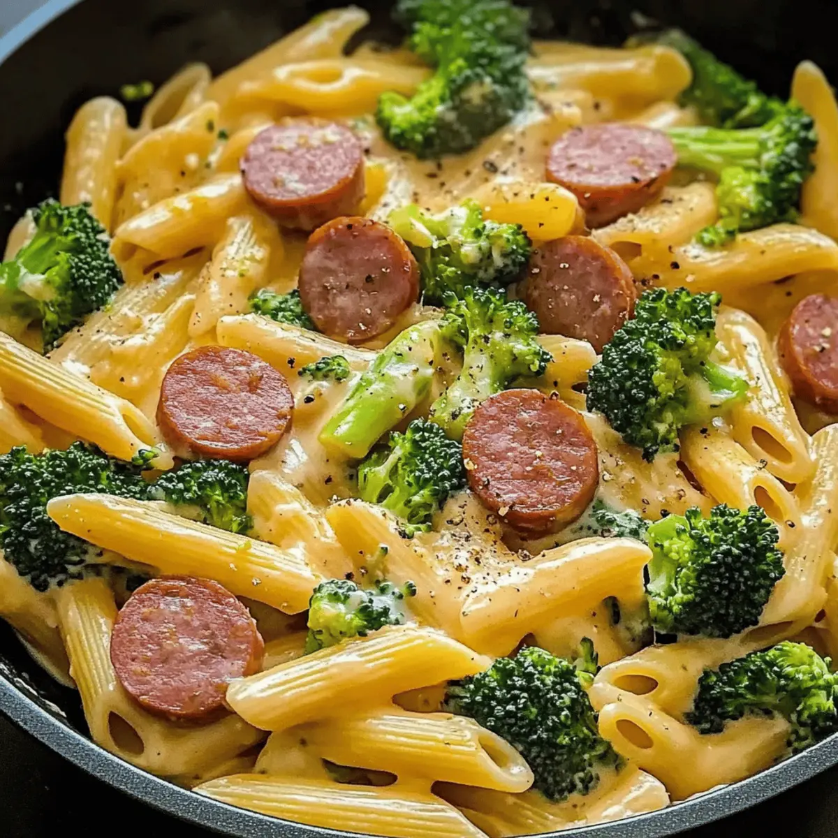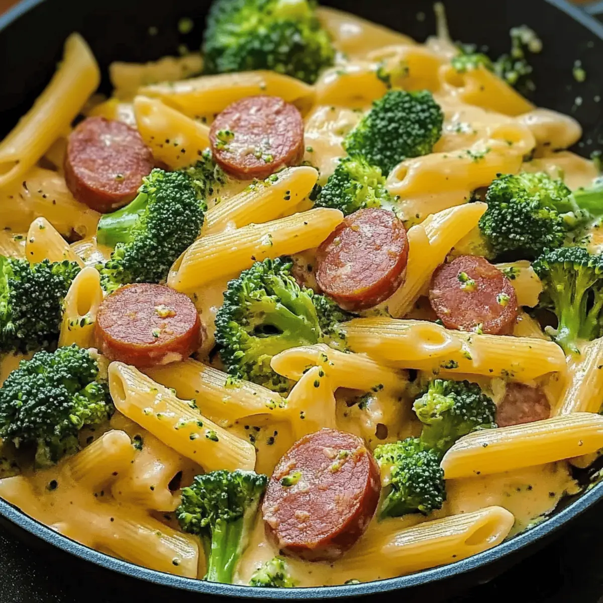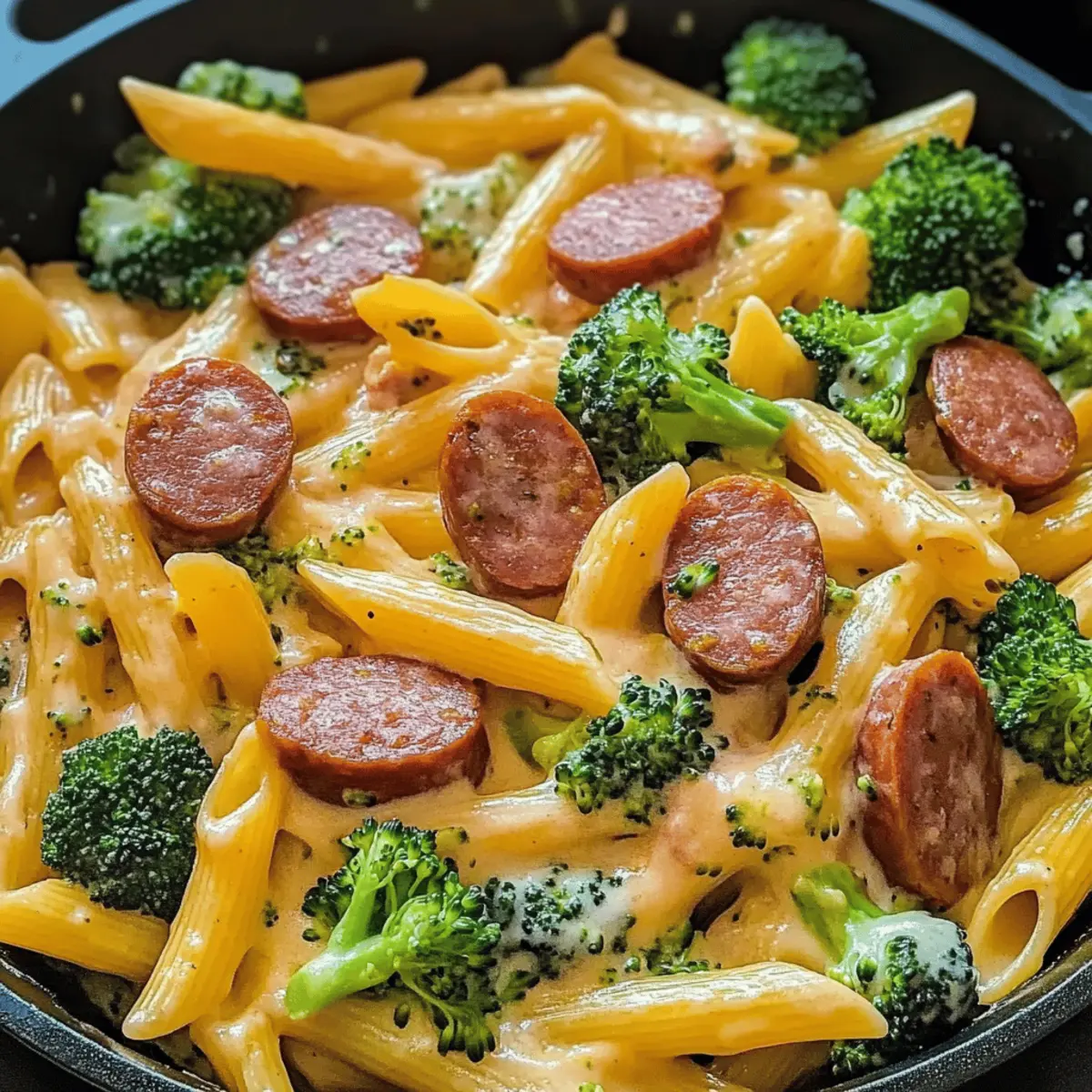 The aroma of sizzling kielbasa fills the air, transporting me back to cozy dinners spent with family around the kitchen table. This Creamy Kielbasa Broccoli Skillet captures all that warmth and nostalgia while delivering a modern twist. In just 30 minutes, you can whip up this delightful one-pan meal that combines savory sausage with vibrant broccoli in a luscious, creamy sauce. It’s the perfect antidote to hectic weeknights—quick to prepare and even quicker to clean up! Best of all, it’s a customizable dish that can cater to various tastes, making it a guaranteed hit with everyone at the table. Ready to transform your dinner routine? Let’s dive into this comforting recipe together! Why is this Kielbasa Skillet so appealing? Quick and Easy: This Creamy Kielbasa Broccoli Skillet comes together in just 30 minutes, making it perfect for busy weeknights without sacrificing flavor. Customizable Goodness: Easily tailor this dish to fit your family’s preferences! Swap out kielbasa for Italian sausage or even tofu for a vegetarian twist. Family-Friendly: Kids and adults alike will love the savory flavors and creamy texture, ensuring everyone at the table is satisfied. One-Pan Wonder: With minimal cleanup involved, you can enjoy your meal and get back to what really matters—spending time with loved ones. Healthy Twist: Packed with fresh broccoli, this skillet not only satisfies your taste buds but also provides essential vitamins, making it a nutritious option for dinner. For more veggie-packed dishes, check out our Air Fryer Broccoli or Crustless Broccoli Quiche. Creamy Kielbasa Broccoli Skillet Ingredients For the Skillet • Penne Pasta – Acts as the hearty base of this dish, providing structure; feel free to use gluten-free pasta for a gluten-free option. • Fresh Broccoli Florets – Offers a crisp texture and is packed with nutrition; you can replace it with green beans or spinach if preferred. • Kielbasa Sausage – The primary protein delivering savory flavor; alternative meats could include Italian sausage, chorizo, or even ground chicken. • Whole Milk – Adds creaminess to your sauce; use plant-based milk such as almond or soy for a dairy-free option. • Shredded Mild Cheddar Cheese – Provides richness and depth to the dish; swap in dairy-free cheese to make it vegan-friendly. • Unsalted Butter – Enhances the overall flavor; for a healthier twist, consider using olive oil or vegan butter. • Yellow Onion – Contributes aromatic flavor; shallots can be a nice substitute for a milder taste. • Minced Garlic – Infuses depth into the dish; fresh garlic works best, but garlic powder can be a quick alternative. • Cornstarch – Thickens the sauce beautifully; if you prefer a thinner sauce, you can leave it out. • Salt and Pepper – Essential for seasoning; adjust according to your taste preferences to elevate the flavors. This Creamy Kielbasa Broccoli Skillet is not just a meal; it’s a simple, satisfying experience that just begs to be shared! Step‑by‑Step Instructions for Creamy Kielbasa Broccoli Skillet Step 1: Cook the Pasta and Broccoli Bring a large pot of salted water to a boil and add the penne pasta. Cook according to the package instructions for about 8-10 minutes, until al dente. Two minutes before the pasta is done, add the fresh broccoli florets to the pot. Once cooked, drain the pasta and broccoli in a colander and set aside. Step 2: Sauté the Kielbasa In a large skillet over medium heat, melt 2 tablespoons of unsalted butter. Once the butter is bubbly, add the sliced kielbasa sausage, cooking for about 5 minutes until the edges are golden brown and crispy. This browning will enhance the flavor of your Creamy Kielbasa Broccoli Skillet, so let them caramelize a bit before the next step. Step 3: Add Aromatics Stir in the diced yellow onion and minced garlic into the skillet with the kielbasa. Sauté for an additional 2-3 minutes until the onion becomes translucent and fragrant. As the onions soften, they will infuse the dish with their sweetness, elevating the overall taste of your creamy sauce. Step 4: Create the Creamy Sauce In a small bowl, whisk together 2 tablespoons of cornstarch with 1 cup of whole milk until smooth. Pour this mixture into the skillet, stirring continuously as the sauce begins to simmer. Cook for about 3-5 minutes, allowing the sauce to thicken and coat the kielbasa and onions evenly, ensuring every bite of this Creamy Kielbasa Broccoli Skillet is rich and satisfying. Step 5: Incorporate the Cheese Reduce the heat to low and gradually stir in 1 cup of shredded mild cheddar cheese. Keep stirring until the cheese is fully melted and the sauce is creamy and velvety. This step adds richness to your dish, transforming it into a delightful Creamy Kielbasa Broccoli Skillet that’s full of comforting flavors. Step 6: Combine and Serve Add the drained penne pasta and broccoli into the skillet, tossing gently to combine everything. Season your dish generously with salt and freshly cracked black pepper to enhance the flavors. Serve warm, garnished with fresh parsley, and enjoy this quick and delicious Creamy Kielbasa Broccoli Skillet with your family! How to Store and Freeze Creamy Kielbasa Broccoli Skillet Fridge: Store leftovers in an airtight container for up to 3-4 days. This keeps your Creamy Kielbasa Broccoli Skillet fresh and tasty for several delicious meals. Freezer: You can freeze the skillet for up to 2 months. Portion into freezer-safe containers and allow to cool completely before sealing to prevent freezer burn. Reheating: Reheat on the stovetop over medium-low heat, stirring occasionally, until heated through, or microwave in short bursts, adding a splash of milk to restore creaminess if necessary. What to Serve with Creamy Kielbasa Broccoli Skillet Looking to elevate your meal beyond a single dish? These delightful pairings will transform your dinner into a truly memorable experience. Crisp Green Salad: A ref