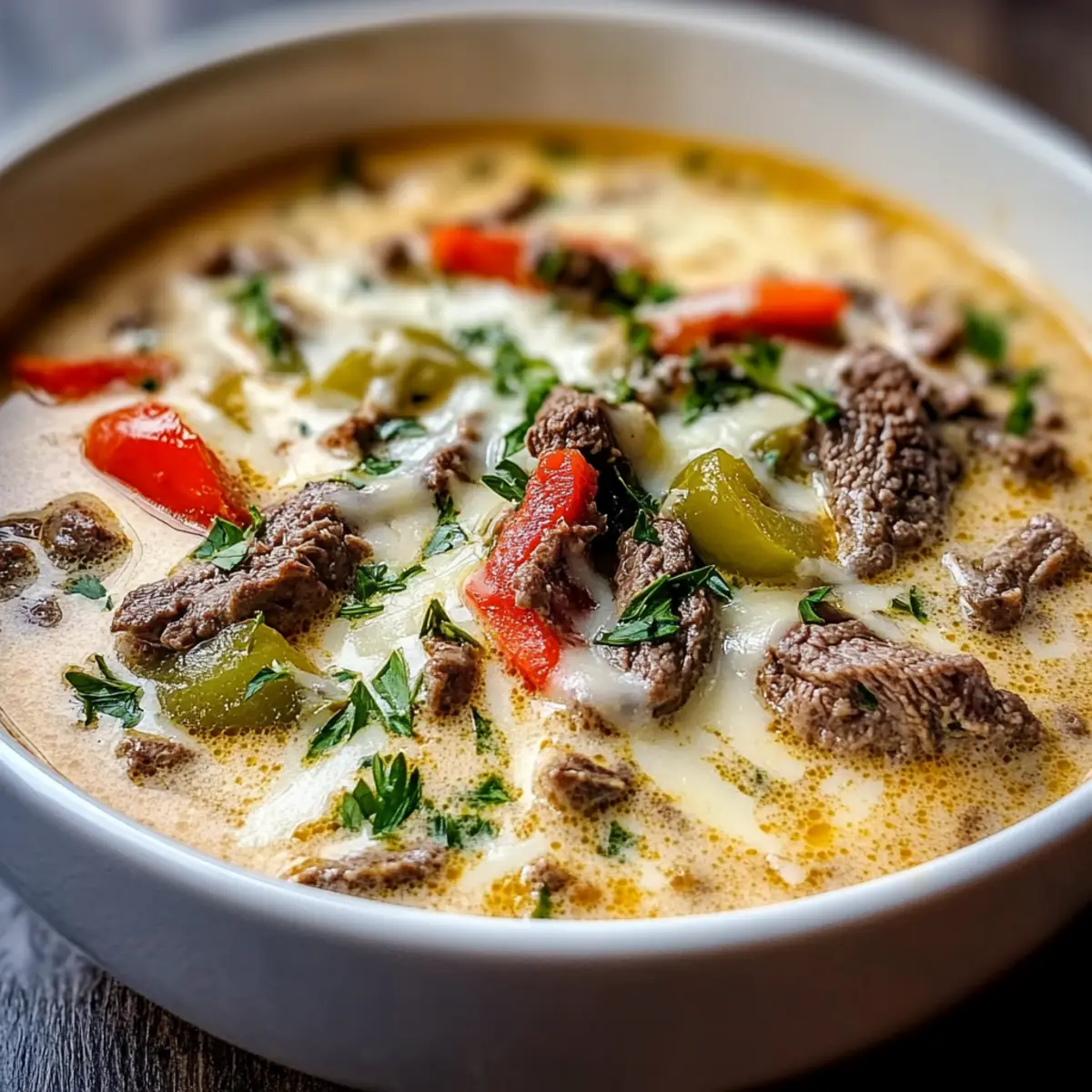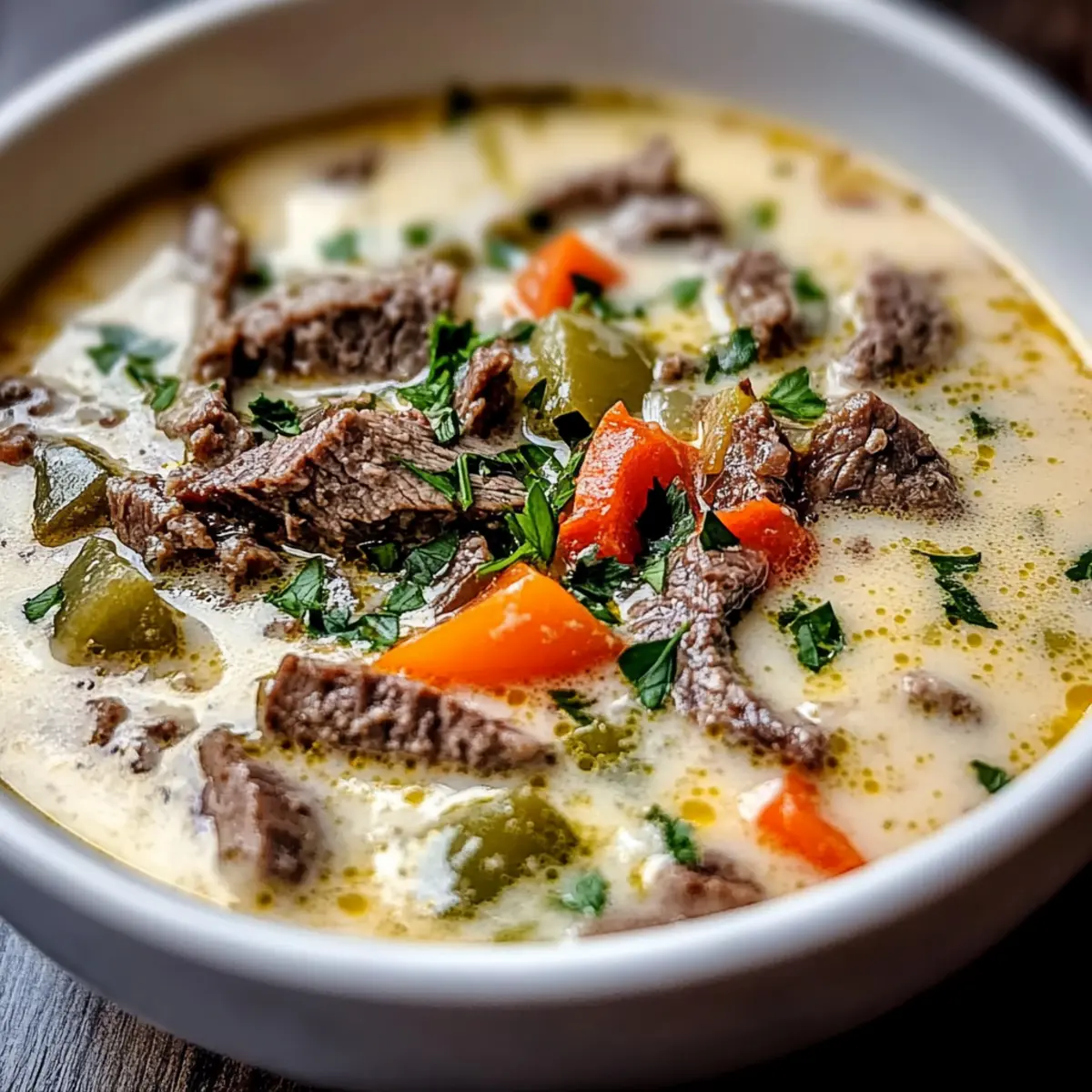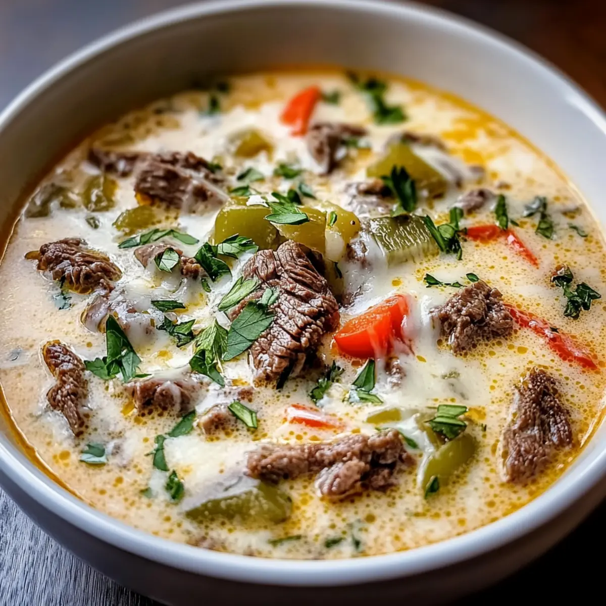 As the chill of winter settles in, nothing feels quite as snug as a warm bowl of Creamy Philly Cheese Steak Soup. Inspired by the iconic Philly cheesesteak sandwich, this comforting dish embraces tender beef and sautéed veggies swimming in a rich, velvety broth. The best part? It’s quick to whip up, making it the ultimate solution for busy weeknights when you crave a hearty meal without the fuss. Plus, each comforting spoonful packs in a wealth of protein to keep you satisfied. Ready to dive into this creamy goodness that transforms your favorite sandwich into a soul-soothing soup? Let’s get cooking! Why is this soup a must-try? Comforting warmth: Imagine wrapping your hands around a steaming bowl of creamy goodness that instantly lifts your spirits on a chilly night. Hearty satisfaction: Featuring tender beef and colorful veggies, this soup is a filling dish that doesn’t skimp on nutrition. Quick preparation: With only a few steps to follow, you can create a delicious meal in under 30 minutes—perfect for busy evenings. Versatile claims: Whether you stick to the classic version or explore variations with grilled chicken or different cheeses, it’s bound to please every palate. Crowd-pleaser: Serve this delightful soup at gatherings, and watch your friends and family come back for seconds, making it a new favorite in your home! Creamy Philly Cheese Steak Soup Ingredients For the Soup • 1 pound thinly sliced beef – This is the backbone of your soup, offering a hearty protein source; substitute with chicken or turkey for lighter options. • 1 medium onion – Adds a sweet depth to your soup; yellow onion works best, but shallots can provide a milder touch. • 1 bell pepper – Introduces sweetness and crunch; feel free to swap with diced poblano for a hint of spice. • 2 cloves garlic – Enhances richness with its aromatic flavor; garlic powder can work if you’re out of fresh. • 4 cups beef broth – The comforting base for your soup; use vegetable broth for a vegetarian twist. • 1 cup heavy cream – This ingredient makes your soup luxuriously creamy; you can substitute with half-and-half for a slightly lighter version. • 1 tablespoon Worcestershire sauce – Provides a boost of umami flavor; balsamic vinegar can serve as a good alternative. • 1 teaspoon salt – Essential for bringing out flavors; adjust according to the saltiness of your broth. • 1/2 teaspoon black pepper – Adds subtle warmth; white pepper can be used for a more delicate heat. • 1 cup shredded provolone cheese – Melts beautifully into the soup, enhancing creaminess; mozzarella or cheddar can also be used. • 2 tablespoons olive oil – For sautéing the vegetables and enriching taste; replace with butter for a richer finish. • Fresh parsley for garnish – Adds a pop of color and freshness; chives or green onions can also be delightful substitutes. Each ingredient combines to create the soul-satisfying Creamy Philly Cheese Steak Soup that will have everyone asking for the recipe! Step‑by‑Step Instructions for Creamy Philly Cheese Steak Soup Step 1: Heat the Oil In a large pot, heat 2 tablespoons of olive oil over medium heat. As the oil shimmers, you’re ready to kick off the delicious Creamy Philly Cheese Steak Soup. It should take about 2 minutes for the oil to become hot enough to sauté the vegetables without burning. Step 2: Sauté the Vegetables Add the diced onion and bell pepper to the pot, sautéing for about 5 minutes until they soften and become a bit translucent. Stir gently to prevent sticking and ensure even cooking. The vegetables will start to release their aromas, creating an inviting base for your soup. Step 3: Incorporate Garlic Next, stir in the minced garlic and cook for an additional minute. You’ll know it’s time to move on when the garlic starts to smell fragrant and turns golden. Be careful not to let it burn, as it can become bitter. This step adds a lovely depth of flavor to the Creamy Philly Cheese Steak Soup. Step 4: Brown the Beef Add the thinly sliced beef, season with salt and black pepper, and cook until browned, about 3 to 4 minutes. Stir frequently to ensure all the meat cooks evenly and turns a delightful brown color. This step enhances the heartiness of your soup, bringing that classic cheesesteak flavor to life. Step 5: Add Broth and Worcestershire Sauce Pour in the beef broth and Worcestershire sauce, stirring well to combine. Increase the heat to bring the mixture to a gentle simmer, and let it bubble away for around 10 minutes. The soup will start to develop a rich and savory aroma that fills your kitchen with comfort. Step 6: Stir in Cream and Cheese Reduce the heat and gently stir in 1 cup of heavy cream and the shredded provolone cheese. Continue to stir until melted and heated through, about 3 to 5 minutes. Ensure the mixture is creamy and smooth, but avoid boiling the soup to prevent curdling the cream. You’re almost there! Step 7: Serve and Enjoy Ladle the warm Creamy Philly Cheese Steak Soup into bowls and garnish with fresh parsley for a pop of color. Serve immediately while hot, alongside crusty bread or a fresh side salad for a complete meal. This soup is a cozy, hearty dish that will warm your soul on chilly nights. Expert Tips for Creamy Philly Cheese Steak Soup Don’t Rush the Sautéing: Cooking the onion and bell pepper slowly enhances their sweetness and flavor. Aim for a nice, soft texture without browning them too much. Slice Beef Thinly: Ensure uniform cooking by slicing the beef as thinly as possible. This guarantees tender bites in your Creamy Philly Cheese Steak Soup. Lower Cream Temperature: Stir in heavy cream over low heat to prevent curdling. Avoid boiling after adding to keep that velvety texture. Thicken Wisely: For a thicker soup, mix 1 tablespoon of cornstarch with 2 tablespoons of cold water and add during the simmering phase, stirring until desired consistency is reached. Adjust Seasoning as Needed: D