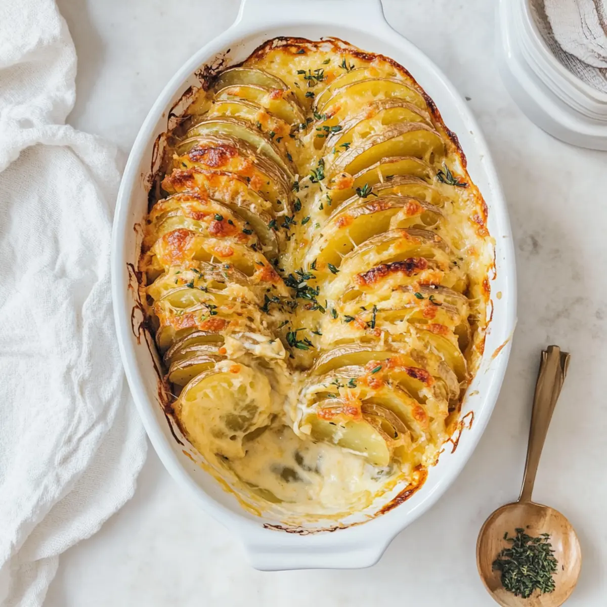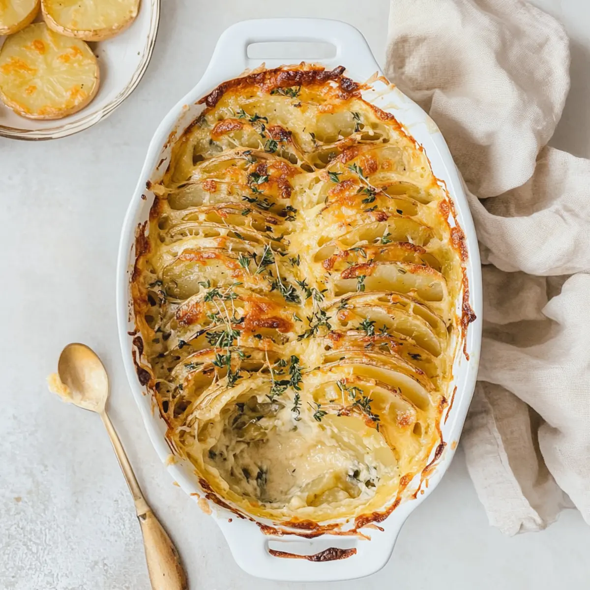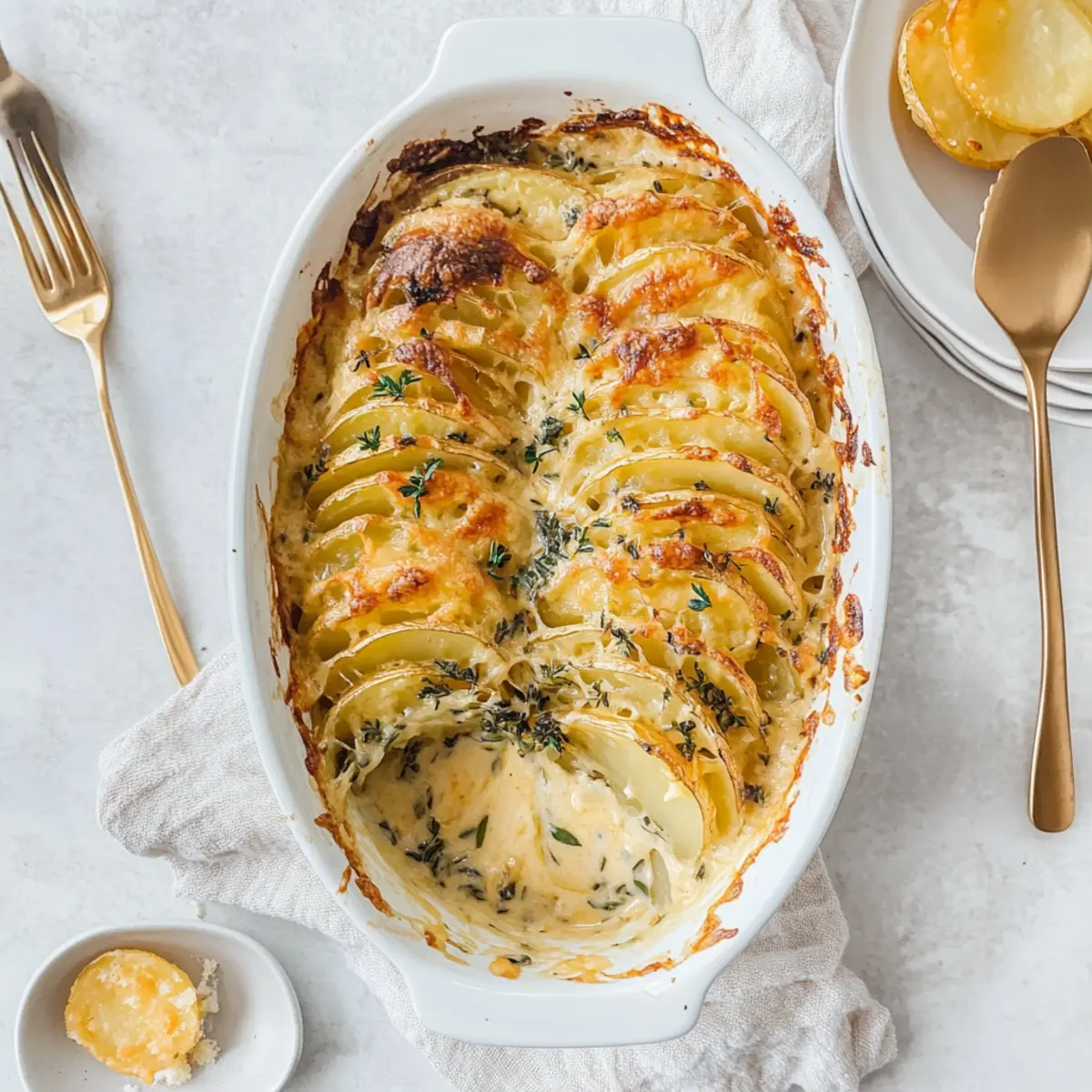 As I opened the oven door, a wave of irresistible warmth enveloped me, instantly transporting me to cozy family gatherings. The delightful aroma of Creamy Scalloped Potatoes filled the kitchen, a perfect side dish that embodies comfort and nostalgia. With their rich, cheesy sauce and those crisp, golden edges, this dish will not only steal the spotlight during your holiday meals but also become a cherished favorite at any gathering. These creamy scalloped potatoes are quick to prepare, allowing you to focus on savoring every moment with loved ones. Trust me, they pair beautifully with roasted meats or even a hearty vegetarian main. Are you ready to elevate your side dish game? Let’s dive into this scrumptious recipe! Why Are Creamy Scalloped Potatoes So Beloved? Irresistible Comfort: These creamy scalloped potatoes bring warmth and nostalgia to any table, making them a crowd-pleaser for holidays or cozy gatherings. Flavor Explosion: The rich, cheesy sauce and crispy edges create a symphony of flavors and textures that delight every bite. Quick to Prepare: With straightforward steps, you’ll have this beloved dish ready in no time, leaving you with more opportunities to connect with family and friends. Versatile Pairing: Perfect with everything from roast turkey to vegetarian stuffed peppers, they adapt beautifully to any meal, ensuring everyone is satisfied. Always a Showstopper: This dish doesn’t just taste great; it looks stunning on the table, deserving of all the “oohs” and “aahs” from your guests! Creamy Scalloped Potatoes Ingredients For the Potatoes • Yukon Gold Potatoes – These waxy potatoes hold their shape during cooking, making them ideal for creamy scalloped potatoes. Substitution Note: Red potatoes can be used instead for similar results. • Kosher Salt – Essential for enhancing the flavor of the dish. • Black Pepper – Adds a hint of spice to balance the creaminess. For the Sauce • Unsalted Butter – Provides a rich flavor and is used to create the roux. Preparation Note: Must be melted with garlic first. • Garlic (minced) – Infuses the sauce with aromatic notes. • All-Purpose Flour – Thickens the cream sauce for that luxurious texture. • Heavy Cream – Creates the richness that makes this dish unforgettable. Substitution Note: Half and half or whole milk can be used for a lighter version. • Parmesan Cheese (optional) – Adds a savory depth and a cheesy layer. Note: Gruyère or Swiss cheese can also be used. • Fresh Thyme – Imparts a fragrant herbal note that brightens the dish. This simple yet elegant ingredient list is what transforms everyday potatoes into creamy scalloped potatoes, sure to wow your holiday guests! Step‑by‑Step Instructions for Creamy Scalloped Potatoes Step 1: Preheat and Prepare Begin by preheating your oven to 400°F (200°C). While the oven is heating, lightly grease a medium-sized ceramic baking dish with butter or cooking spray. This helps prevent sticking and allows the creamy scalloped potatoes to bake evenly. Ensure your workspace is clean and organized for the upcoming steps. Step 2: Slice the Potatoes Next, take your Yukon Gold potatoes and slice them as thinly as possible, ideally about 1/16th of an inch, using a mandolin slicer or a sharp knife for uniformity. These even slices ensure that your creamy scalloped potatoes cook thoroughly and evenly, resulting in a delightful texture. Have a bowl ready to hold the sliced potatoes. Step 3: Melt the Butter and Sauté Garlic In a large pot over medium heat, melt the unsalted butter. Once melted, add minced garlic and sauté for about 1-2 minutes until fragrant, stirring constantly to prevent burning. The aroma should fill your kitchen, creating an inviting atmosphere as this garlic-infused butter acts as the rich base for your sauce in the creamy scalloped potatoes. Step 4: Create the Roux Stir in all-purpose flour, cooking for an additional 1-2 minutes to form a roux. This mixture should become smooth and bubbly without browning. The roux will help thicken the creamy sauce that envelops your scalloped potatoes. Keep stirring to achieve the perfect consistency before moving on to the next step. Step 5: Whisk in the Cream Gradually add heavy cream to the roux, whisking continuously to avoid any lumps. Continue whisking for about 5 minutes, or until the sauce thickens to a luxurious creamy texture. Watch for a gentle simmer to indicate that the sauce is thickening properly, as this will form the delicious base for your creamy scalloped potatoes. Step 6: Season the Sauce Once thickened, mix in grated parmesan cheese, fresh thyme, kosher salt, and black pepper to taste. Stir until the cheese has melted and the sauce is completely smooth. The flavors will meld beautifully, enhancing the richness of the creamy scalloped potatoes, making your mouth water in anticipation. Step 7: Coat the Potatoes Place the sliced potatoes into a bowl and drizzle the creamy sauce over them. Gently toss to ensure every potato slice is well coated with the luscious mixture. This step is crucial for achieving that perfect, rich flavor in your creamy scalloped potatoes, helping each bite to be equally delightful. Step 8: Arrange the Potatoes Carefully stack the coated potato slices upright in the greased baking dish, creating an appealing layered look. If desired, you can arrange them in a circular pattern or in layers for a beautiful presentation. Pour any remaining sauce over the stacked potatoes to ensure they are fully enveloped in that creamy goodness. Step 9: Bake Covered Cover the baking dish tightly with aluminum foil and place it in the preheated oven. Bake for 30 minutes, allowing the potatoes to steam and soften. This step is essential for achieving tender, creamy scalloped potatoes infused with all the delicious flavors from the sauce. Step 10: Bake Uncovered for Crispiness After 30 minutes, carefully remove the foil and bake uncovered for an additional 30 minutes. T