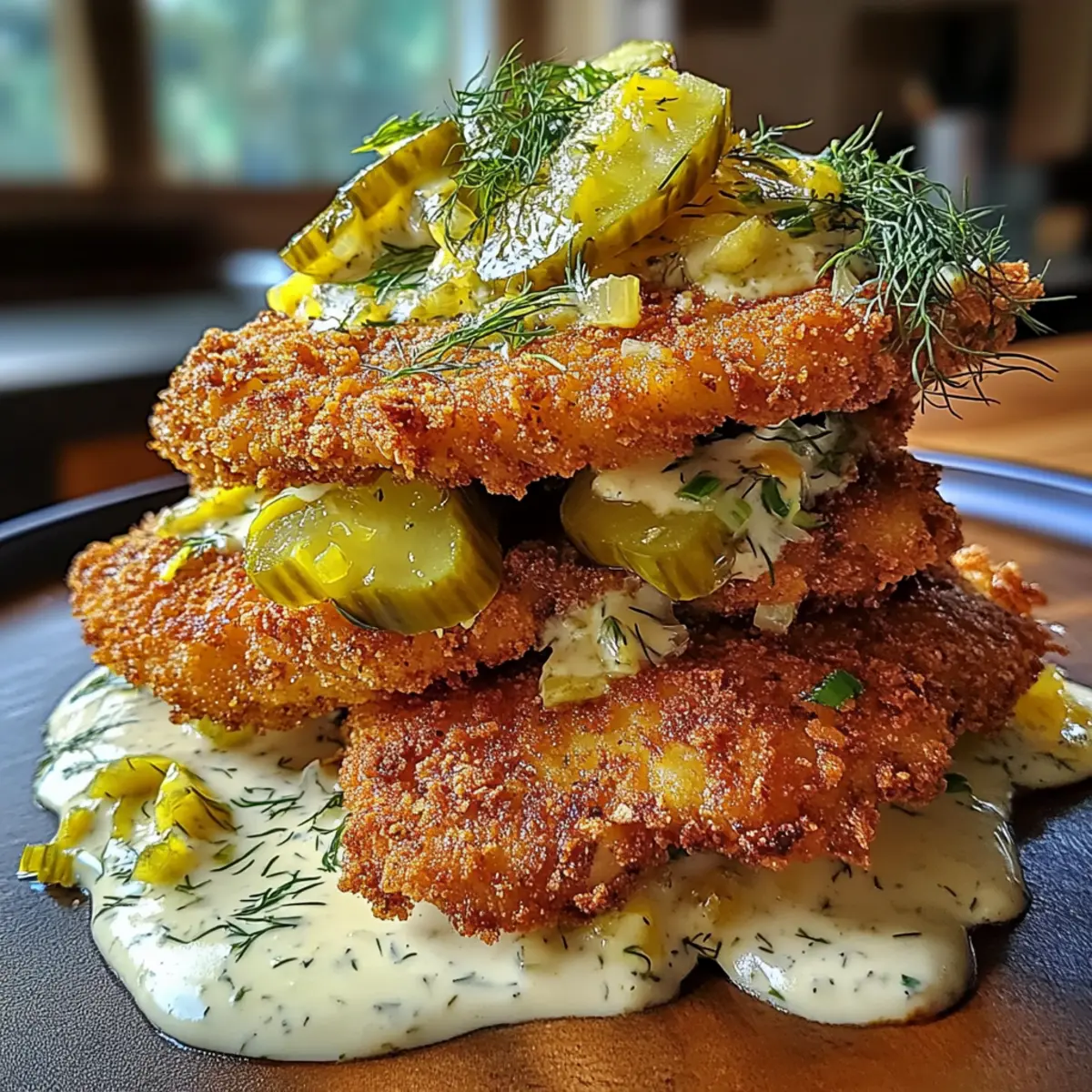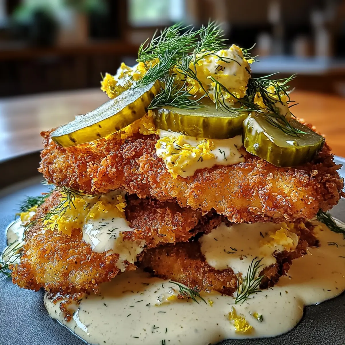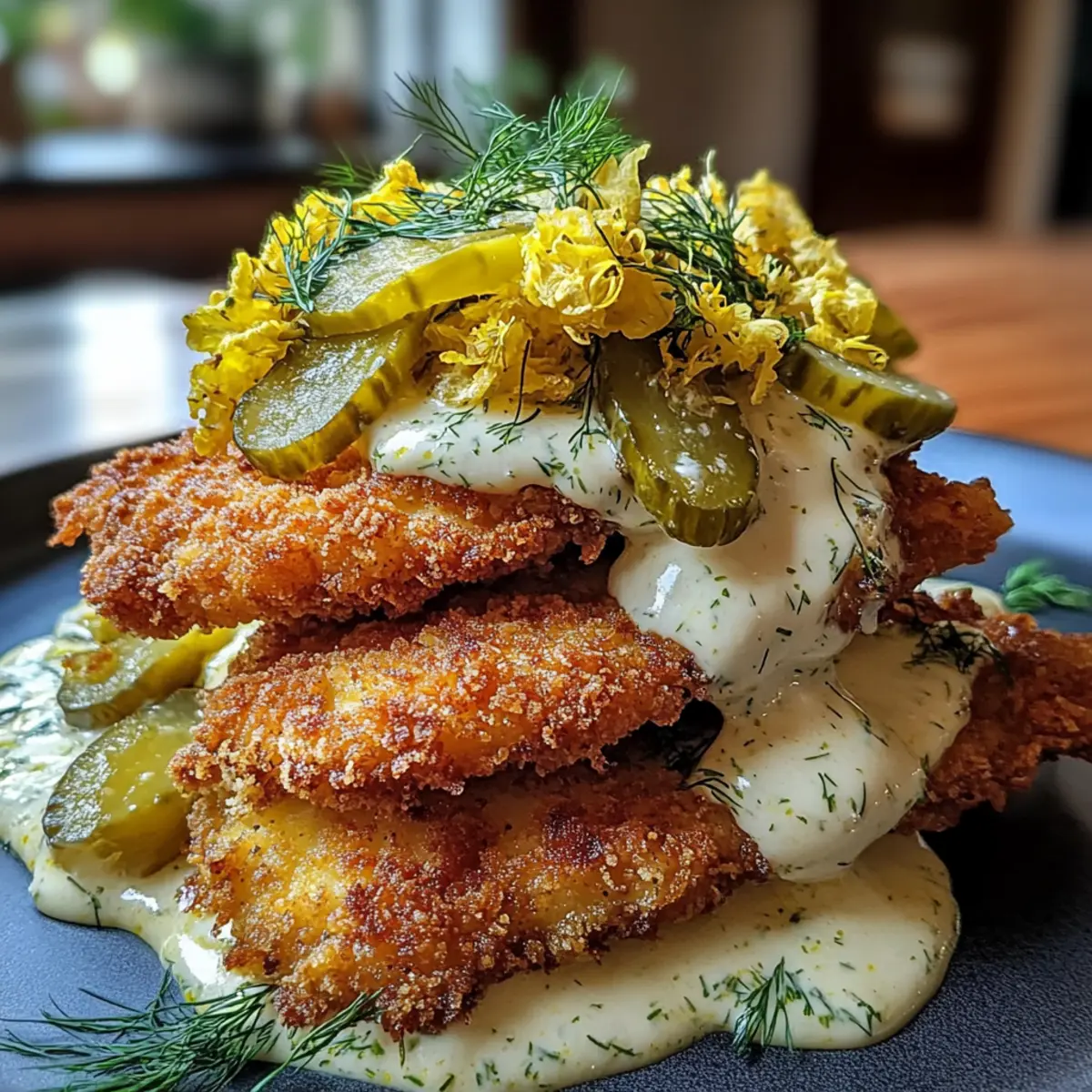 As I sliced through the golden crust of my Crispy Dill Pickle Chicken, a satisfying crunch echoed in the kitchen, and I knew I had struck culinary gold. This recipe transforms ordinary chicken into an irresistible comfort food, with the briny tang of dill pickles infusing each bite. Not only is it quick to whip up, making it perfect for busy weeknights, but it also offers a fun twist on traditional fried chicken that’s sure to impress family and friends. The creamy garlic dill sauce takes this dish over the top, creating a delightful balance of flavors. Are you ready to elevate your chicken game and savor this deliciousness? Let’s dive into this culinary adventure! Why Is This Chicken So Addictive? Crispy, crunchy goodness: Each bite delivers an irresistible crunch that perfectly contrasts the moist chicken inside. Flavor explosion: The dill pickle brine adds a unique twist, infusing the chicken with zesty notes that keep you coming back for more. Quick and easy: Whip this up in no time, making it a fantastic choice for busy weeknights or last-minute guests. Versatile serving options: Whether as a sandwich with fresh toppings or as a scrumptious main dish alongside sides, it’s sure to please everyone at the table. Crowd-pleaser: A surefire hit at gatherings, this Crispy Dill Pickle Chicken will have your friends raving and asking for the recipe! For more great chicken ideas, check out my delicious Garlic Parmesan Chicken Pasta or try the mouthwatering Crispy Orange Chicken. Crispy Dill Pickle Chicken Ingredients Discover how to make this crispy delight! For the Chicken Chicken Breasts – Use 2 large boneless, skinless breasts; slicing them horizontally ensures even cooking. Dill Pickle Juice – Marinate in quality brine for at least 1 hour to add flavor and tenderness. For the Breading All-Purpose Flour – This essential coating helps create that perfect crispy texture. Eggs – 2 large, beaten eggs act as the binder for the breading process. Panko Breadcrumbs – Provides an ultra-crunchy coating that’s lighter than regular breadcrumbs. Garlic Powder – Use 1 tsp to enhance the savory flavor of the chicken. Onion Powder – 1 tsp of this will amplify the overall savoriness of the dish. Paprika – Adds a beautiful color and a subtle warmth; ½ tsp does the trick. Black Pepper – Season your chicken with ½ tsp for a bit of kick. For Frying Vegetable/Canola Oil – Maintain oil temperature at 350°F for the best frying results. For the Creamy Sauce Mayonnaise – ½ cup adds a rich creaminess to the sauce. Sour Cream/Greek Yogurt – Use ½ cup to contribute tangy flavor and smooth texture. Fresh Lemon Juice – Brighten the sauce with 1 tbsp of freshly squeezed lemon juice. Fresh Dill – Chopped finely, 1 tbsp will elevate the flavor of your sauce. Garlic – 1 clove, minced to perfection, adds fresh garlic notes. For Topping Additional Pickles – Use 1 cup of cubed small pickles as a fresh garnish to enhance each serving. With these ingredients on hand, you’re one step closer to creating the delectable Crispy Dill Pickle Chicken that will have mouths watering and taste buds dancing! Step‑by‑Step Instructions for Crispy Dill Pickle Chicken Step 1: Prep Chicken Start by slicing the chicken breasts horizontally to create two equal cutlets from each breast. Use a meat mallet to gently pound them to an even ½-inch thickness, ensuring they cook evenly. Set aside the chicken cutlets and get ready to marinate them in dill pickle juice, which will infuse them with delightful flavor and moisture. Step 2: Brine Place the chicken cutlets in a large bowl or resealable bag, and pour in 1.5 cups of high-quality dill pickle juice. Seal or cover the bowl, and let the chicken marinate in the refrigerator for at least 1 hour—up to 8 hours for even richer flavor. This step is essential for achieving the signature taste of the Crispy Dill Pickle Chicken. Step 3: Dredging Station While the chicken is marinating, set up your dredging station with three bowls. In the first bowl, mix all-purpose flour with garlic powder, onion powder, paprika, and black pepper. In the second bowl, beat two large eggs until frothy. Fill the third bowl with panko breadcrumbs, which will provide that signature crispy texture when frying. Step 4: Sauce Mixing In a mixing bowl, whisk together ½ cup of mayonnaise, ½ cup of sour cream or Greek yogurt, 1 tablespoon of fresh lemon juice, 1 tablespoon of finely chopped dill, and 1 minced clove of garlic. Stir until the mixture is smooth and creamy. This delicious sauce can be made ahead and chilled in the refrigerator while you prepare the chicken, enhancing the flavor. Step 5: Bread Chicken After marinating, remove the chicken from the pickle juice and pat it dry with paper towels. First, dredge each cutlet in the seasoned flour mixture, coating it thoroughly. Next, dip the flour-coated chicken into the beaten eggs, allowing any excess to drip off, and finally coat them in the panko breadcrumbs, pressing lightly to adhere well. Set the breaded cutlets aside. Step 6: Fry Chicken Heat your cooking oil in a deep skillet or frying pan over medium heat until it reaches 350°F. Carefully place the breaded chicken cutlets into the hot oil, ensuring not to overcrowd the pan. Fry for about 3-4 minutes on each side, or until golden brown and crispy. Use a meat thermometer to ensure the internal temperature reaches 165°F for safe consumption. Step 7: Rest and Assemble Once the chicken is crispy and cooked through, transfer the cutlets to a wire rack to rest for a minute. Sprinkle lightly with salt while they’re still warm for added flavor. To serve your Crispy Dill Pickle Chicken, top each cutlet with a generous dollop of the creamy garlic dill sauce and garnish with small cubed pickles for an extra burst of flavor and texture. Expert Tips for Crispy Dill Pickle Chicken Brining Time: Marinating the chicken for at least 1 hour intensifies flavor. For the best results, 