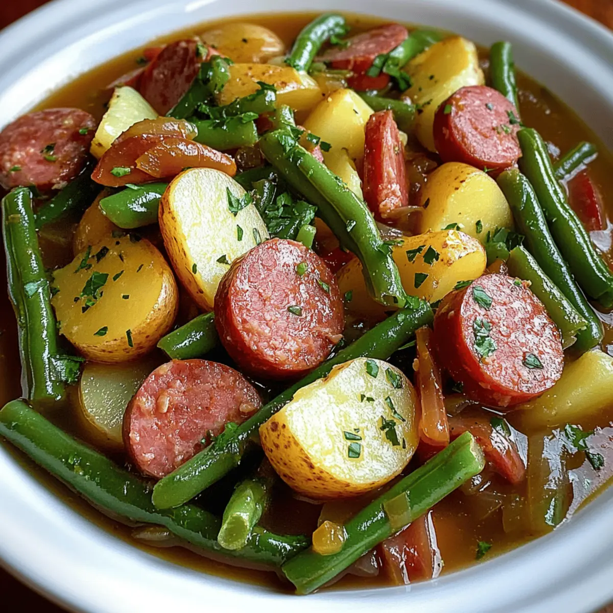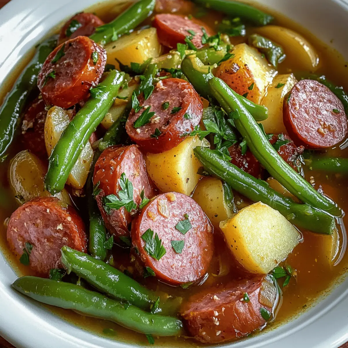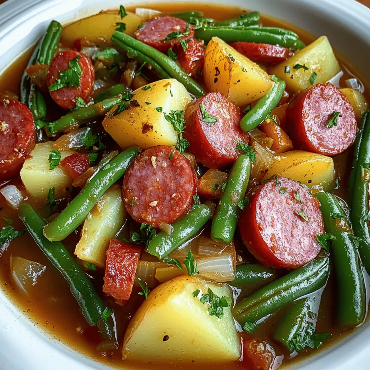 As I stirred the pot, the familiar aroma of savory kielbasa and fresh green beans filled my kitchen, transporting me back to my grandmother’s bustling home. There’s something truly magical about comfort food, especially when it comes together effortlessly in a crockpot. This Easy Crockpot Kielbasa and Green Beans recipe is a humbling reminder of how simple ingredients can create heartfelt meals. With just 15 minutes of prep, this dish is a crowd-pleaser that allows for leisurely gatherings or busy weeknight dinners without fuss. Plus, it’s a beginner-friendly recipe, perfect for anyone looking to embrace homemade cooking without the stress. So, are you ready to wrap your family in a warm hug of flavor? Let’s dive in! Why will you enjoy this dish? Effortless Preparation: With just 15 minutes of prep time, you can set your crockpot and forget about it while it works its magic. Rich and Smoky Flavor: The combination of savory kielbasa and tender veggies simmers into a delightful flavor that feels like a warm hug. Crowd-Pleasing Comfort: Perfect for gatherings, this dish is sure to impress your family and friends, alongside a side of crusty bread or a refreshing salad. Versatile Variations: Feel free to mix in your favorite vegetables or even try a Cheesy Hamburger Green twist for a fun spin. Beginner-Friendly: This recipe is perfect for novice cooks looking to create a satisfying homemade meal without any stress. Get ready to elevate your mealtime with this quick and comforting dish! Crockpot Kielbasa and Green Beans Ingredients • Get ready for a delightful meal! For the Main Dish Kielbasa Sausage – Provides rich, smoky flavor and protein; substitute with turkey or beef kielbasa for a healthier option. Fresh Green Beans – Adds a crisp texture and vibrant color; use frozen green beans in a pinch but adjust cooking time accordingly. Potatoes (medium-sized) – Acts as a hearty base for the dish, soaking up flavors; you can substitute with baby potatoes, cut in half. Onion (chopped) – Brings natural sweetness and depth; substitute with shallots for a milder flavor. Garlic (minced) – Adds aromatic pungency; use garlic powder as an alternative if fresh garlic is unavailable. Chicken Broth – Provides moisture and flavor; vegetable broth can be used for a vegetarian option. For Sautéing Olive Oil – For sautéing the kielbasa and aromatics; can be replaced with canola or avocado oil. For Seasoning Salt – Essential for enhancing flavor; adjust per taste preference. Black Pepper – Adds mild heat and earthiness; freshly ground black pepper is preferred for best flavor. Red Pepper Flakes (optional) – Adds a spicy kick; omit for a milder dish. For Garnish Fresh Parsley – Enhances visual appeal and adds freshness; substitute with chopped green onions if needed. With these ingredients ready, you’re just a step away from creating your cozy comfort meal of Crockpot Kielbasa and Green Beans! Step‑by‑Step Instructions for Crockpot Kielbasa and Green Beans Step 1: Prepare Your Crockpot Set your crockpot to low heat, allowing it to preheat while you gather and prepare the ingredients. This one-pot approach will help the flavors meld beautifully as they cook. Make sure your crockpot has enough capacity to hold all the delicious ingredients you will be adding shortly. Step 2: Sauté the Kielbasa In a large skillet, heat a tablespoon of olive oil over medium heat. Add sliced kielbasa and sauté for about 5 minutes, stirring frequently until it is lightly browned and fragrant. This step infuses the dish with a rich, smoky flavor, so don’t skip it! Once done, remove the kielbasa from the skillet and set aside for later. Step 3: Cook the Aromatics Using the same skillet, add another splash of olive oil if necessary, then toss in the chopped onion and minced garlic. Sauté for 2 to 3 minutes until the onions turn translucent and the garlic becomes fragrant. These aromatics will create a flavorful base for your Crockpot Kielbasa and Green Beans. Step 4: Layer the Vegetables In the preheated crockpot, layer cubed potatoes and halved fresh green beans at the bottom. This creates a hearty base and ensures these vegetables soak up all the savory juices from the dish. Pour the sautéed onion and garlic mixture over the vegetables, distributing them evenly for maximum flavor. Step 5: Add the Kielbasa Carefully place the browned kielbasa on top of the layered vegetables in the crockpot. This layering ensures that the sausage flavors infuse down through the potatoes and green beans as they cook. The vibrant colors of the ingredients will give you a delightful preview of your end result. Step 6: Pour the Broth Gently pour chicken broth over the entire mixture in the crockpot, ensuring all ingredients are submerged and ready to absorb the tasty broth. A rich broth will enhance the overall flavor and maintain moisture as everything simmers together perfectly for your Crockpot Kielbasa and Green Beans. Step 7: Season to Taste Sprinkle in salt, freshly ground black pepper, and optional red pepper flakes for a hint of spice. Using a spoon, gently stir everything together just enough to combine the seasonings with the liquid without disturbing the layers too much, allowing for a meld of flavors as it cooks. Step 8: Cook to Perfection Cover the crockpot and let the mixture cook on low for 6 to 8 hours or on high for 3 to 4 hours. The vegetables should be tender and the flavors well combined when done. Aim to check the doneness during the last hour if possible, adjusting the time as needed based on your specific crockpot model. Step 9: Final Stir and Serve Once the cooking time is complete, carefully stir the dish to blend all the flavors together. Taste and adjust seasoning if necessary, adding a dash more salt or pepper if desired. Your hearty and comforting Crockpot Kielbasa and Green Beans is now ready to be served. Step 10: Garnish and Enjoy Before serving, sprinkle freshly chopped parsley ov