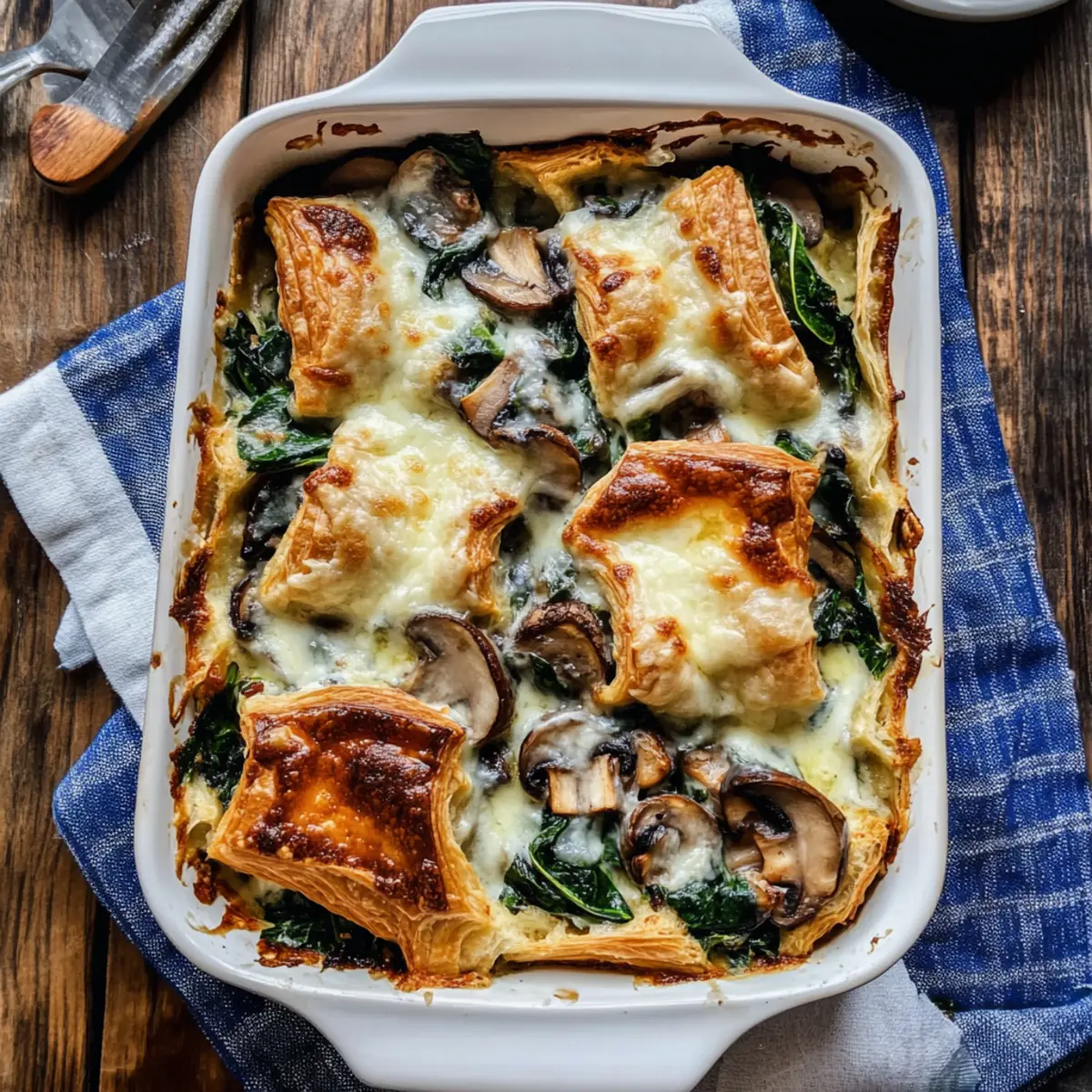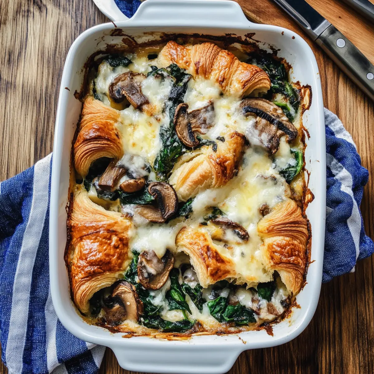 As I stood in my kitchen, the aroma of sizzling mushrooms and fresh spinach enveloped me like a warm hug on a chilly evening. This Savory Croissant Casserole with Mushroom, Spinach, and Cheese is not just a recipe; it’s a cozy experience that transforms ordinary ingredients into something extraordinary. In under 15 minutes, you can create this comforting dish, perfect for a quick brunch or a relaxing dinner. The beauty of this casserole lies in its simplicity—using flaky croissants to cradle tender eggs, earthy mushrooms, and melty Gruyère cheese, it’s truly a crowd-pleaser. Plus, it’s a fantastic way to utilize leftover croissants, minimizing food waste while maximizing flavor. Are you ready to indulge in a heartwarming casserole that will leave your guests raving? Let’s dive into this delicious journey together! Why is this casserole a must-try? Irresistible Comfort: This casserole is a hug in a dish, combining flaky croissants with savory mushrooms and fresh spinach. Quick Preparation: With just 15 minutes of prep time, you can easily whip up this mouthwatering meal for brunch or dinner. Crowd-Pleasing: It’s the perfect dish to impress guests, offering a delightful mix of flavors and textures everyone will love. Waste Not, Want Not: A fantastic way to use leftover croissants, turning what could be wasted into a delightful masterpiece. Easy Variations: Customize with your favorite veggies or cheeses, making it versatile for every palate. Perfect for Any Occasion: Whether it’s a cozy family meal or a festive gathering, this casserole fits right in! Croissant Casserole with Mushroom Ingredients For the Casserole Croissants – Use stale or leftover croissants for the best texture and flavor. Unsalted Butter – Adds richness; reserve some for greasing the baking dish. Fresh Spinach – Offers a fresh, slightly bitter contrast; kale is a good substitute. Cremini Mushrooms – Provides an earthy flavor; substitute with button mushrooms for a milder taste. Gruyère Cheese – Melts beautifully for a creamy texture; Swiss or cheddar can be used if needed. Large Eggs – The binding agent that adds protein; ensure they’re fresh for optimum results. Whole Milk – Contributes creaminess; consider half-and-half or a dairy alternative for variety. Salt and Fresh Ground Black Pepper – Essential for flavor enhancement; adjust to personal taste. For Added Flavor Garlic – Mince and sauté for an aromatic boost; perfect for those who love a spicy kick. Fresh Herbs (e.g., thyme) – Sprinkle in for an extra layer of flavor; they complement the earthy mushrooms beautifully. Diced Tomatoes or Bell Peppers – Add moisture and a refreshing twist; a great way to increase veggie content. Transforming these ingredients into a Croissant Casserole with Mushroom is an effortless way to create a crowd-pleasing dish that’s delicious and heartwarming! Step‑by‑Step Instructions for Savory Croissant Casserole with Mushroom Step 1: Prepare the Mushroom and Spinach In a medium frying pan, melt 1 tablespoon of unsalted butter over medium-low heat. Add the sliced cremini mushrooms and sauté for about 10-12 minutes until they’re tender and golden brown. Once done, remove the mushrooms from the pan, add a bit more butter if needed, and toss in fresh spinach, cooking for 2-3 minutes until wilted. Set both aside to cool slightly. Step 2: Set Up the Baking Dish Preheat your oven to 350°F (180°C) while you grease a 10.5×7 inch baking dish with a coating of unsalted butter. Take the leftover croissants and slice them in half lengthwise. Arrange the croissant halves vertically in the baking dish, generously stuffing each section with a mix of the sautéed spinach and mushrooms, creating a delightful layer that will add flavor throughout your croissant casserole. Step 3: Mix the Egg Mixture In a separate bowl, whisk together 6 large eggs and 1 cup of whole milk until well combined. Stir in half of the grated Gruyère cheese, along with a pinch of salt and freshly ground black pepper to taste. This creamy egg mixture will act as a binder, ensuring that the flavors from your savory croissant casserole meld beautifully as it bakes. Step 4: Assemble the Casserole Pour the egg mixture evenly over the stuffed croissants, allowing it to seep in between the layers. Take the remaining grated Gruyère cheese and sprinkle it generously over the top of the casserole. The cheese will melt and create a golden, bubbly crust that’s irresistible. Let the dish sit for about 5 minutes so the croissants can absorb the liquid. Step 5: Bake the Casserole Cover the baking dish tightly with aluminum foil and place it into the preheated oven. Bake for 20 minutes to allow the casserole to set. Once time is up, carefully remove the foil and continue baking for an additional 10-15 minutes until the eggs are set and the cheese is melted and lightly golden on top. Step 6: Cool and Serve After baking, take the savory croissant casserole out of the oven and let it cool for a few minutes before slicing. This brief resting period allows the casserole to firm up, making it easier to serve. Cut into squares and serve warm, savoring the flaky croissant layers and the rich, cheesy filling that makes this dish so delightful. Croissant Casserole with Mushroom Variations Feel free to personalize the casserole with these creative twists that will tantalize your taste buds! Dairy-Free: Use almond or oat milk and dairy-free cheese for a delicious, creamy alternative without the dairy. Extra Veggies: Add bell peppers or zucchini for an added crunch and a pop of color, enhancing the visual appeal and flavor. Spicy Kick: Incorporate diced jalapeños or crushed red pepper flakes to boost the heat and make the dish pop with flavor. Protein Boost: Toss in cooked bacon or sausage crumbles for an extra protein punch, transforming this casserole into a hearty meal. Herb Infusion: Enhance the flavor profile with fresh herbs like basil or chives, 