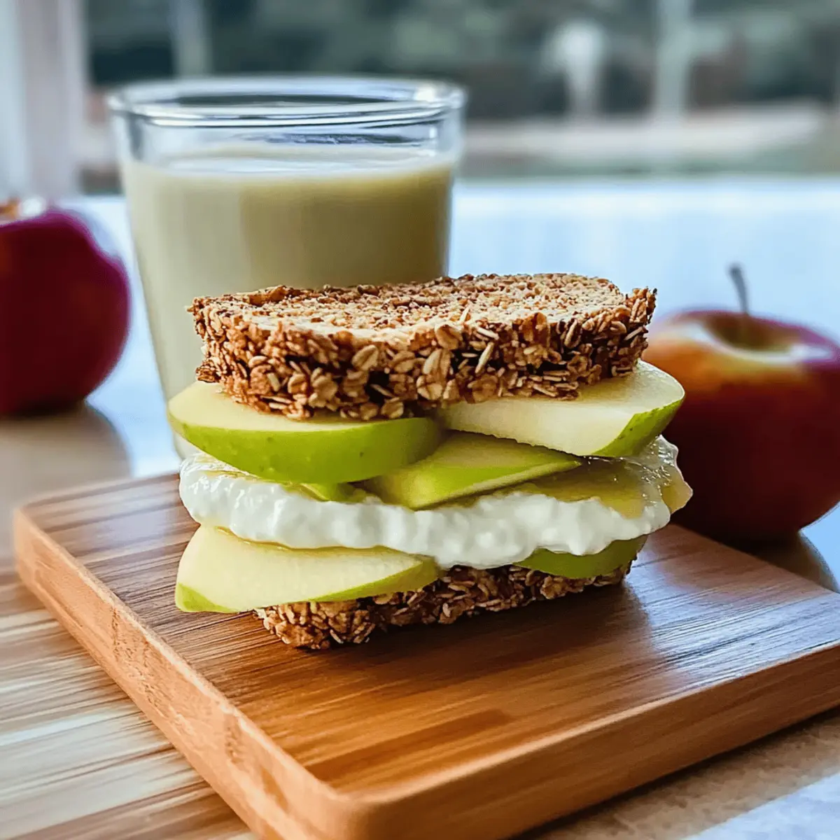 Slice the completed Crunchy Apple Sandwich in half for easy handling, or serve it whole on a plate. This delightful snack is best enjoyed fresh, allowing you to savor the crunchiness of the apples and the creaminess of the yogurt. Gather around the table and enjoy this nutritious treat with family or friends!