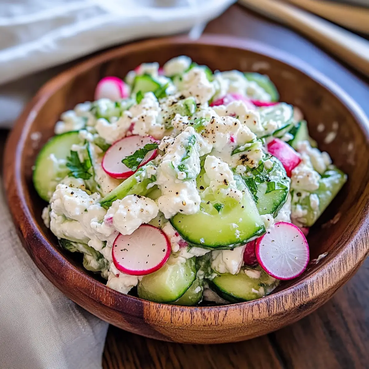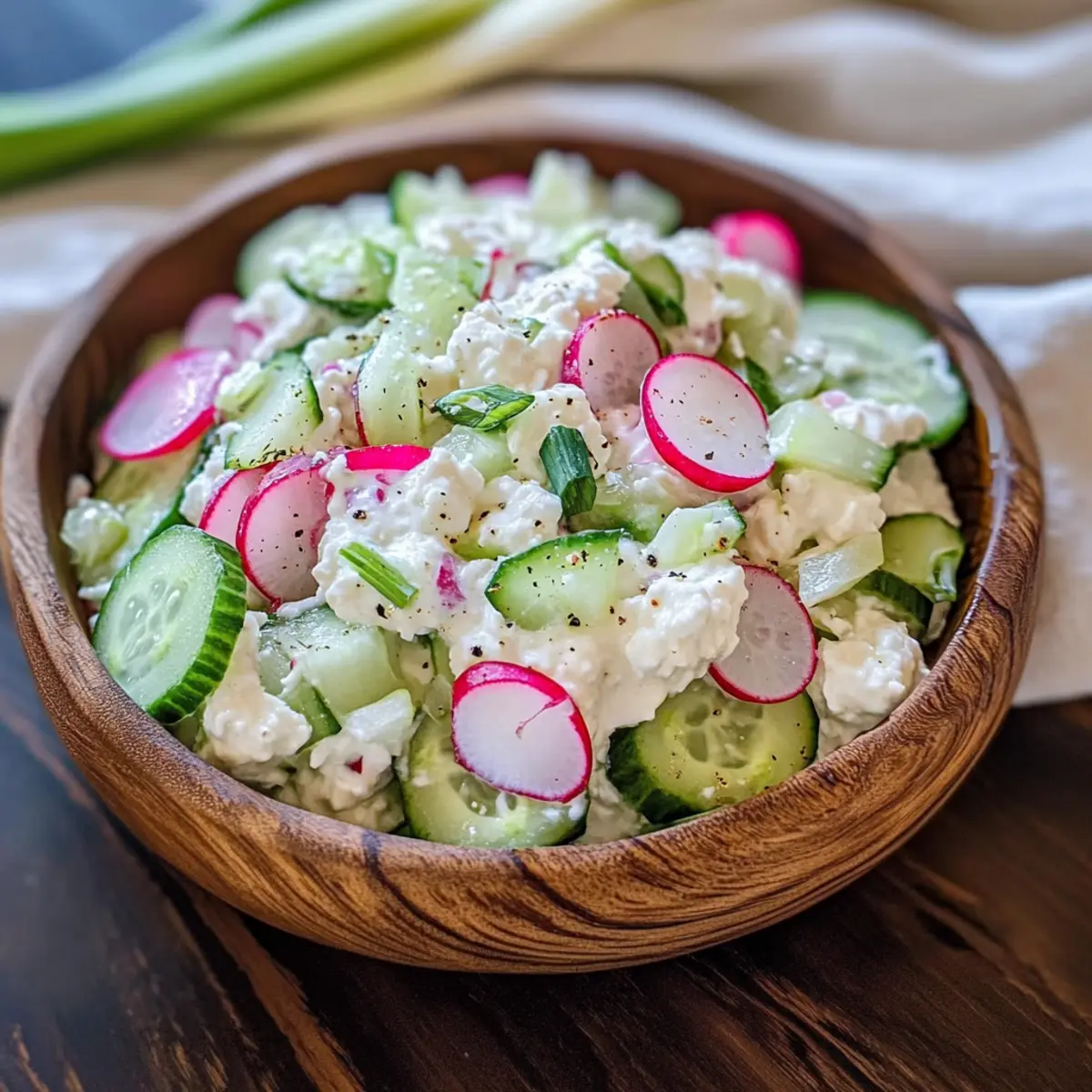 The first rays of summer sun peek through the window, and my cravings shift toward vibrant, refreshing dishes. That’s when I whip up a Creamy Cucumber-Radish Salad—a staple from Ukrainian cuisine that’s perfect for those sunny afternoons. This delicious salad not only boasts a quick prep time but also gives you a healthy, vegetarian option full of crisp cucumbers and peppery radishes. What I love most is how creamy cottage cheese binds everything together, creating a delightful balance that keeps me coming back for seconds. Plus, it’s easily customizable with a tangy feta or a handful of juicy tomatoes. Curious about how this fresh and colorful dish can elevate your summer meals? Let’s dive into the recipe! Why is this Cucumber-Radish Salad a Must-Try? Simplicity at its finest: This salad comes together in just minutes, making it ideal for busy days when you crave something fresh and healthy. Vibrant flavors: The cool cucumbers and crunchy radishes create a delightful flavor explosion that brightens any meal. Customizable creations: With options like swapping cottage cheese for feta or adding juicy tomatoes, you can easily make this salad your own. Crowd-pleaser potential: Whether at a summer barbecue or a family gathering, this salad is sure to impress guests and become a go-to favorite. For additional side options, consider serving it alongside a Chicken Caesar Salad or a refreshing Cucumber Caprese Salad to complement your delicious meal! Cucumber-Radish Salad Ingredients For the Salad Cucumbers – These provide a refreshing base; use small varieties like English or Persian for the best crunch. Radishes – Their peppery flavor adds a lovely bite and crunch to your salad. Scallions – They contribute a mild onion taste; if you want a fresh twist, substitute with dill or parsley. Cottage Cheese – Offers creaminess and protein; for a tangier option, try feta cheese instead. Sea Salt – Enhances the overall flavor; adjust to your taste preference. Black Pepper – Adds a subtle heat and depth to the dish. Optional Add-Ins Tomatoes – Add juicy tomatoes for extra flavor; ensure they aren’t overly ripe for the best texture. Fresh Herbs – Enhance the flavor with fresh herbs like dill or parsley for a fragrant lift. This Cucumber-Radish Salad is not just a recipe; it’s a delicious creation that can make your summer meals pop! Step‑by‑Step Instructions for Creamy Cucumber-Radish Salad Step 1: Prepare the Cucumbers Begin by selecting fresh, crunchy cucumbers, ideally small varieties like English or Persian. Rinse them under cold water, then peel away the skin if it’s hard or waxy. Slice each cucumber in half lengthwise, scoop out any large seeds, and cut them into bite-sized pieces. Set these vibrant pieces aside in a medium bowl, ready to shine in your cucumber-radish salad. Step 2: Slice the Radishes Next, take your radishes and wash them thoroughly under cold running water. Trim off the greens and cut them into thin slices, about 1/8 inch thick, to showcase their crisp texture and peppery flavor. Aim for uniform pieces to ensure even mixing and presentation. Add the sliced radishes to the bowl with cucumbers, creating a colorful mix for your refreshing salad. Step 3: Chop the Scallions With your cucumbers and radishes in the bowl, grab some fresh scallions. Rinse them, then slice the white and light green parts into thin rounds, about 1/4 inch thick. If you’re feeling adventurous, consider substituting fresh dill or parsley for an aromatic twist. Add the chopped scallions directly into the bowl, enhancing the flavor dimensions of your cucumber-radish salad. Step 4: Combine Ingredients Now it’s time to bring everything together! In the same medium bowl, add creamy cottage cheese to the cucumber, radish, and scallion mixture. Season with a pinch of sea salt and a dash of black pepper, mixing gently with a large spoon or spatula. The cottage cheese will create a luscious dressing that clings beautifully to the crisp vegetables, uniting all the flavors in your salad. Step 5: Serve Immediately For the best taste and texture, serve your creamy cucumber-radish salad immediately after mixing. Spoon generous portions into serving bowls and enjoy the vibrant colors and textures. The fresh crunch of cucumbers and the peppery bite of radishes, combined with the creamy dressing, will take center stage. If desired, keep any leftovers in the fridge for up to six hours, but it’s best enjoyed fresh! Expert Tips for Cucumber-Radish Salad Fresh Ingredients: Use the freshest cucumbers and radishes for maximum crunch. Overripe veggies can make your cucumber-radish salad soggy. Pre-salting: Salt the cucumbers and radishes before mixing to draw out excess moisture. This prevents your salad from becoming watery. Serving Suggestions: Serve immediately for the best flavor and texture. The salad is best enjoyed fresh, ideally within a couple of hours. Customize Wisely: Experiment with add-ins like tomatoes or fresh herbs, but choose varieties that complement the crispness of cucumbers while avoiding overly ripe ones. Cottage Cheese Choices: While cottage cheese provides great creaminess, a mild feta can elevate the flavor. Opt for full-fat varieties for a richer taste. Make-ahead Tips: If preparing in advance, keep the cottage cheese separate until serving to maintain the ideal texture in your cucumber-radish salad. Cucumber-Radish Salad Variations Feel free to explore these delightful twists on the classic cucumber-radish salad to suit your taste buds! Feta Twist: Substitute cottage cheese with feta for a pleasing tang that adds character to your dish. Its crumbly texture works beautifully with the crunchy salad ingredients. Tomato Elegance: Incorporate fresh tomatoes to amplify the flavor profile. The juicy sweetness of ripe tomatoes complements the peppery radishes beautifully. Greek Yogurt Creaminess: Replace cottage cheese with Greek yogurt for a creamier, protein-packed alterna